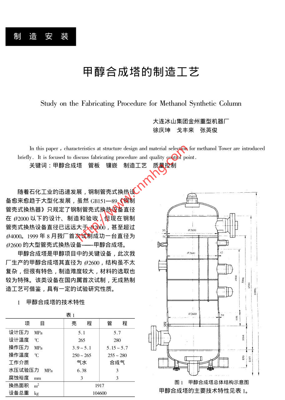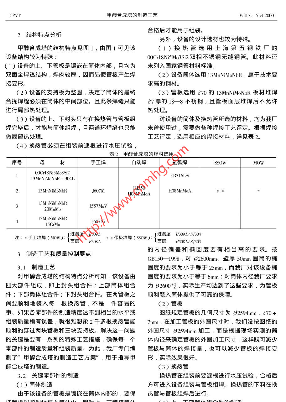 制造安裝甲醇合成塔的制造工藝Study on the Fabricating Procedure for Methanol Synthetic Column大連冰山集團(tuán)金州重型機(jī)器廠徐慶坤戈豐來 張英俊In this paper,characteristics at structure design and material selection for methanol Tower are introducedbrielly. It is focused to discuss fabricating procedure and quality control point .關(guān)鍵詞:甲醇合成塔管板鑲嵌制造工藝 質(zhì)量控制隨著石化工業(yè)的迅速發(fā)展,鋼制管殼式換熱設(shè)備愈來愈趨于大型化發(fā)展,雖然GB151- -89《鋼制管殼式換熱器》只規(guī)定了鋼制管殼式換熱設(shè)備直徑在02000以下的設(shè)計(jì)、制造和驗(yàn)收,但現(xiàn)在鋼制管殼式換熱設(shè)備直徑已遠(yuǎn)遠(yuǎn)大于02000 ,甚至超過0260004000。1999 年8月我廠首次試制成功- -臺直徑為02600的大型管殼式換熱設(shè)備-一甲醇合 成塔。甲醇合成塔是甲醇項(xiàng)目中的關(guān)鍵設(shè)備,此次我016廠生產(chǎn)的甲醇合成塔其直徑為02600,結(jié)構(gòu)雖不太復(fù)雜,但很有特色,制造難度較大,材料的選取也較為特殊。該類設(shè)備在國內(nèi)屬首次試制,無成熟制奏。造工藝可借鑒,具有一定 的試驗(yàn)研究性質(zhì)。1甲醇合成塔的技術(shù)特性表1目殼程管設(shè)計(jì)壓力MPa5.15.7設(shè)計(jì)溫度C265280操作壓力MPa3.9~5.15.15~5.71-+操作溫度C250 ~ 265255 ~ 280工作介質(zhì)氣水合成氣水壓試驗(yàn)壓力MPa6.38腐蝕裕度mm3圖1甲醇合成 塔總體結(jié)構(gòu)示意圖換熱面積m21917設(shè)備總重kg104600甲醇合成塔的主要技術(shù)特性見表1。37.CPVT甲醇合成塔的制造工藝Voll7. No3 2000合格后才能用于組裝。2結(jié)構(gòu)特點(diǎn)分析另外,設(shè)備的設(shè)計(jì)選材也較為特殊。甲醇合成塔的結(jié)構(gòu)特點(diǎn)見圖1,由圖1可見該(1)換熱管選用上海第五鋼鐵廠的設(shè)備結(jié)構(gòu)較為特殊:00Crl8Ni5Mo3Si2雙相不銹鋼無縫鋼管。此材料還(1)設(shè)備的上、下管板是鑲嵌在筒體內(nèi)部,且均為未列入國家鋼管材料標(biāo)準(zhǔn)。雙面全焊透結(jié)構(gòu), 焊肉較厚,因而易使管板產(chǎn)生焊(2)設(shè)備筒體選用13MnNiMoNbR ,屬于技術(shù)要接變形。求高的鋼材。(2)設(shè)備的支持板為整圓,決定了筒體的最終(3)管板選用870的13MnNiMoNbR板材堆焊合攏焊縫必須在筒體的中間部位。且此條焊縫只能δ7厚的18--8不銹鋼,且管板面層堆焊后不允許:進(jìn)行局部熱處理。熱處理。(3)設(shè)備的上、下封頭只有在換熱管與管板組對設(shè)備的筒體及換熱管所選的材料,均為我廠焊完畢后,才能與筒體組焊,且兩道環(huán)焊縫也只能未曾使用過,需要做各種焊接工藝評定。根據(jù)焊接做局部熱處理。工藝評定,選用相應(yīng)的焊接材料,詳見表2。(4)換熱管必須在組裝前逐根進(jìn)行水壓試驗(yàn),表2甲醇合成塔的焊材選用序號母手工焊自動焊氬弧焊SSowMOW100Cr18Ni5Mo3Si2ER316LSi13MnNiMoNbR + 304LHJ35013MnNiMoNbRJ607MH08MnMoA¥¥*3J557MoV20MnMo4J607Ni15CrMo注: *手工堆焊( MOw):f過渡層E309L* *帶極堆焊( ssow):s過渡層H309L/SJ/304l面層E308LH308L/S.J303的內(nèi)徑偏差和橢圓度要有相當(dāng)高的要求。按3制造工藝和質(zhì)量控制要點(diǎn).GB150- -1998 ,對02600mm、 壁厚50mm圓筒的橢3.1制造工藝圓度的要求為小于等于25mm,而我廠對該設(shè)備橢對甲醇合成塔的結(jié)構(gòu)特點(diǎn)分析可知,該設(shè)備由圓度的要求為小于等于6mm;對筒體內(nèi)徑我廠要求四大部件組成,即上封頭組合件;上部筒體組合為02600+ ,實(shí)際生產(chǎn)均達(dá)到了這些要求,為管板件;下部筒體組合件;下封頭組合件。在兩管板之順利裝入筒體提供了可靠的保障。間要順利地裝入每一根換熱管,不是一件容易的(2)管板事。如果各零部件的制造精度達(dá)不到相當(dāng)?shù)乃交驁D紙規(guī)定管板的幾何尺寸為02594mm, δ70+組裝質(zhì)量稍有誤差,就很難想象2千多根換熱管能7mm ,在加工管板的外圓尺寸時(shí),我們沒按圖紙的順利的穿過兩塊管板和三塊支持板。解決這一問題外圓尺寸02594mm加工,而是根據(jù)現(xiàn)場實(shí)測的筒的關(guān)鍵是要有-系列的特殊工藝措施,確保每一個(gè)體內(nèi)徑來確定管板的外圓加工尺寸,這樣既可減少零部件的制造質(zhì)量和組裝質(zhì)量。為此,我廠專門編管板與筒體的焊接量,也可以減少管板的焊接變制了”甲醇合成塔的制造工藝方案”,用于指導(dǎo)甲形,實(shí)際效果很好。醇合成塔的制造。(3)換熱管3.2關(guān)鍵零部件的制造換熱管在組裝前要逐根進(jìn)行水壓試驗(yàn),合格后( 1)筒體制造方可進(jìn)入設(shè)備組裝與管板組焊。換熱管的下料在換由于該設(shè)備的管板是鑲嵌在筒體內(nèi)部的,要保熱管與管板組焊后進(jìn)行。證管板能順利地裝入筒體內(nèi),則對上、下 管箱筒體(4)上、下部筒體組合件的制造38.