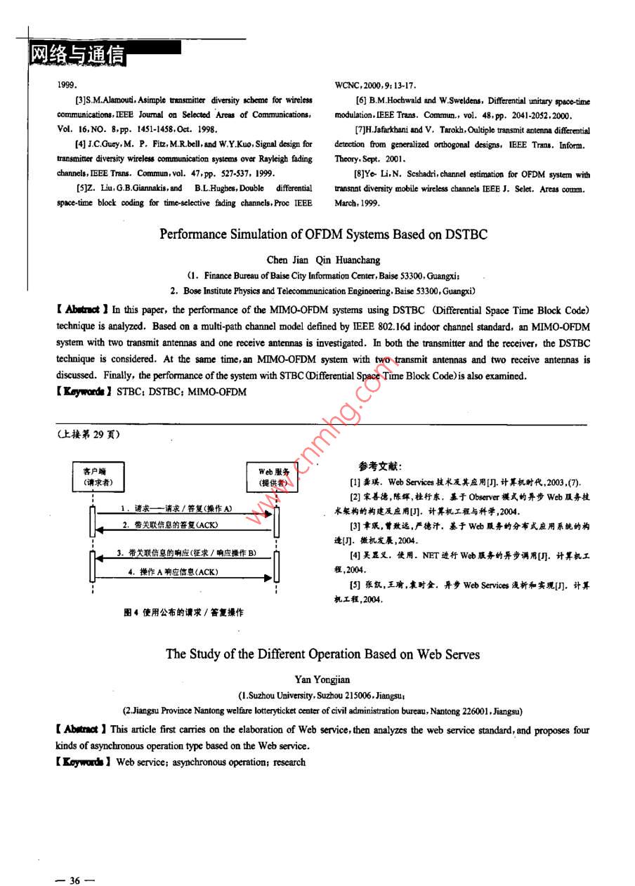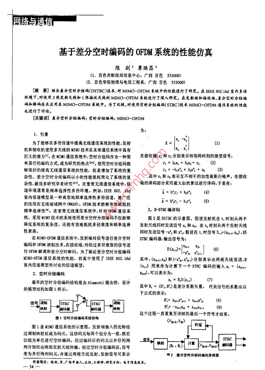 網(wǎng)絡與通信基于差分空時編碼的0FDM系統(tǒng)的性能仿真陳劍1覃煥昌2(1,百色市財政局信息中心,廣西百色533000(2,百色學院物理與電信工程系,廣西百色53300[摘要]結合羞分空時分組碼( DSTBC)技術對MMO-OFDM系統(tǒng)中的性能進行了研究。在IE802.16d室內(nèi)多徑環(huán)境下,對使用2根發(fā)射天線和1根接收天線的MIMo-OFDM系統(tǒng)進行了深入研究。在發(fā)射端和接收端,差分空時分組編碼和解嗎技術應用在MIMO-OFDM系魷中。為了比較,對使用空時分紐編碼(STBC)技術 MIMO-OFDM通信系統(tǒng)的性能也進行了討論[關鍵詞]差分空時分組編碼;空時分組編碼;MMO-OFDM引言為了能夠在多徑信道中提高無線通信系統(tǒng)的性能,發(fā)射機和接收機使用多天線的MM0技術在未來通信系統(tǒng)中具有巨大的潛力叫。在M0通信系統(tǒng)中,空時分組碼作為一種簡在接收端,r1和r2分別表示相鄰兩時刻的接受信號:單易行的編碼方式,成為研究的熱點叫,使用空時分組碼能r夠很好的提高無線通信系統(tǒng)的性能,但是增加了系統(tǒng)的復r2x1+n2雜性。差分空時分組編碼以小的性能損耗簡化了系統(tǒng)的復其中n1和n2表示互不相干的加性高斯白噪聲。在接收雜性被很多研究學者研究刀。在寬帶無線通信系統(tǒng)中信端的譯碼部分采用最大似然算法進行譯碼,于是有道環(huán)境通常是頻率選擇性多徑環(huán)境。例如,IEE802.16dx=h"r1+h2r’2室內(nèi)信道模型是一種典型地頻率選擇性多徑信道,被廣泛的應用在無線城域網(wǎng)中wMAN。OFDM技術能夠有效地抵抗頻率選擇性。在寬帶無線通信系統(tǒng)中,針對OFDM通信系3. D-STBC編譯碼統(tǒng),采用MIM0技術的系統(tǒng)使用差分空時分組編碼不僅能夠圖2是 DSTBC的示意圖。假設發(fā)射機在t1時刻從兩個降低系統(tǒng)的復雜度,還能有效地抵抗多徑衰落和頻率選擇發(fā)射天線同時發(fā)送信號x1和x,在t2時刻從兩個發(fā)射天線性衰落同時發(fā)送信號x2和x假設在t時信號X(xm,x2),經(jīng)在 MIMO-OFDM通信系統(tǒng)中發(fā)射端對信號進行差分空時STBC編碼器,輸出信號為:編碼和OFM調(diào)制技術在接收端,對經(jīng)過多徑衰落的信號進行oFM解調(diào)和差分空時解碼。為了驗證差分空時分組編碼D(x-d)At x?MMOωFDM通信系統(tǒng)的性能,仿真中使用了IEE802.16d其中,(xa,x和(x2,x2)分別表示由兩根天線發(fā)送,D室內(nèi)信道模型所討論的信道模型(x+)用來作為計算下一個STBC編碼的輸入x1=(x2.空時分組編碼x22),可以表示為:x =RD(xeD)最早的空時分組編碼結構是由 Alamouti提出的,設計其中R=(RR是差分系數(shù)矢量。代表信號的系數(shù)由以的模型結構如圖1所示下公式的表示信號調(diào)制RE" Xx xx?x2t這個過程一直重復至該幀的最后一個符號才結束。圖1空時分組編碼系統(tǒng)結構圖1是MM0通信系統(tǒng)的示意圖。發(fā)射端輸入的比特經(jīng)時延過調(diào)制映射后成為碼元。這些碼元每兩個劃分為一組然后以組為單位進行空時編碼。經(jīng)過編碼后的碼元以并行的兩列分別經(jīng)由兩部發(fā)射天線傳輸。經(jīng)過空時分組編碼后,信號編碼器變?yōu)椴⑿袃闪写a元,并通過兩根天線發(fā)射,發(fā)射信號可表示田2差分空時分組碼編碼原理圖作者簡介:陳劍,男,廣西平南人,主任,工翟師研究方向:電子信惠技術一網(wǎng)絡與通信圖5和圖6顯示了 DSTBC方案的仿真結果。為了便于比判決統(tǒng)計最大似較,對使用STBC方案也進行了仿真。在DTBC系統(tǒng)中,圖中然譯碼的“2x1 DSTBC表示在仿真過程中使用了2根發(fā)射天線和1根接收天線?!?x2 DSTBC”表示在仿真過程中使用了2根發(fā)圖3差分空時分組碼譯碼原理圖射天線和2根接收天線。從圖5中可以看出, DSTBC方案與DSTBC方案比較,雖然前者的系統(tǒng)性能比后者的性能差3表示差分空時譯碼方框圖假設接收端使用一個天些,但前者在解碼時不需要進行信道估計這能夠減少接收線,表示在時間t時接受到的信號.假定2-1,2t,2t1和機的復雜度在圖6中在發(fā)射機只使用2根發(fā)射天線,同時2+接收信號分別表示為rara,r2;ray因此接收機的在接收機使用2根接收天線其結果與圖5的結果類似,因判決統(tǒng)計信號為此,圖6也說明了在OM系統(tǒng)中采用差分空時分組編碼能R:=(r2r2)·(r,r2ay)(10)夠降低系統(tǒng)的復雜性R,=(rar2)(r2r2)(1機排排!!因此,可以得到!!!!!!gR,=(h+n(R,R)+2)(12)其中h2是從第i個天線到接收天線的信道衰減系數(shù),n:andn2表示噪聲"里4。系統(tǒng)模型IFFT&CP去導頻圖5DsTB和STBc的性能仿真圖(2根發(fā)射天統(tǒng)1根接收天線IFFT&C圖4 DSTBC蝙碼M》QF叫系統(tǒng)型里輔3:圖4是一個由M根發(fā)射天線M根接收天線組成的MIMO→F模型。在發(fā)射端,一串二進制數(shù)據(jù)流在經(jīng)過一個DSTBC編碼器后轉(zhuǎn)化成平行子信號流。然后對每個子信號進行串轉(zhuǎn)并變換,并進行傅立葉逆變換和加入循環(huán)前綴a19::4gCP)。之后,經(jīng)過0FDM調(diào)制的信號被發(fā)送到多徑信道。在接收端接收信號去除循環(huán)前綴(P)和FFT運算,并進行解碼于是接收信號可以寫成r(k)=(k)s(k)+n1≤k≤K(13)其中s(k)=[s(k),…,s(k)],。"(k)表示第k個子載波符圖6DsB和sTBC的性能仿真圖(2櫃發(fā)射天線2根接收天線號在第畫根發(fā)射天線發(fā)送的信號,H(k)表示第k個子載波6.結論信道。r(k)=[r1(k),…,rx()],rx(k)表示第k個子載波在第嗎根接收天線接收到信號本文主要論述了基