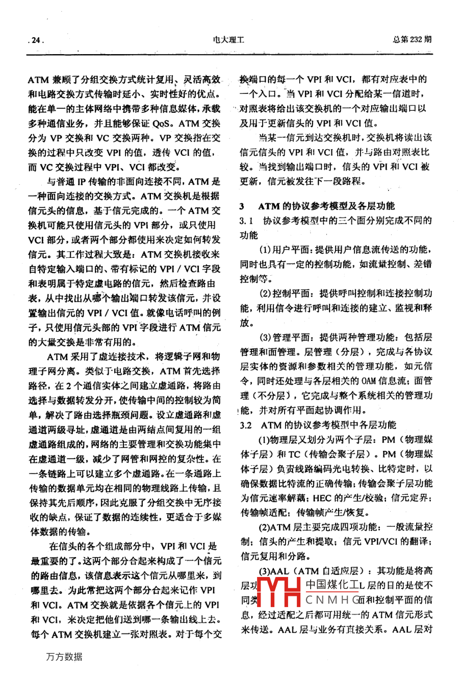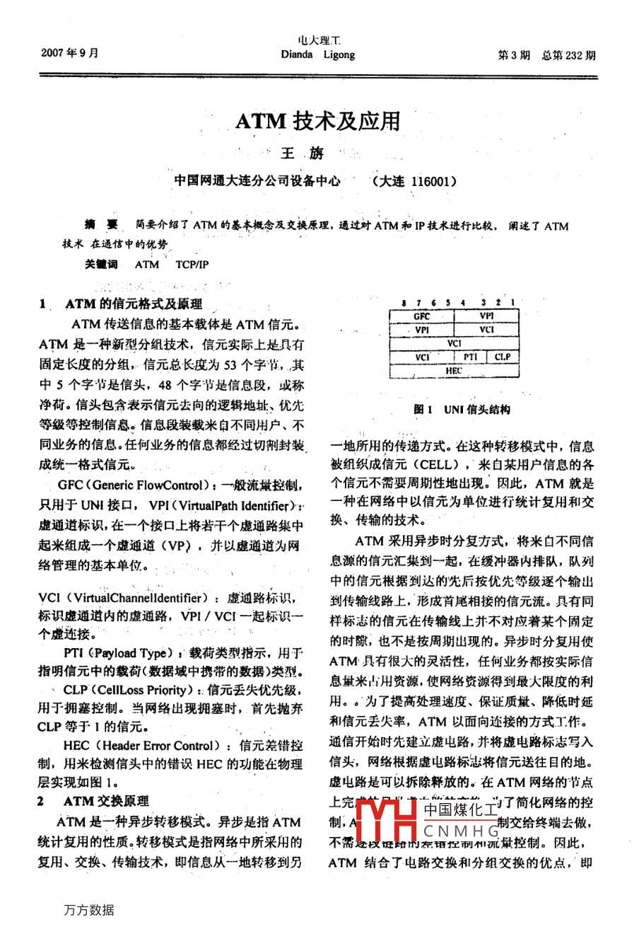 電大理工2007年9月Dianda Ligong第3期總第232期ATM技術(shù)及應(yīng)用王旃中國網(wǎng)通大連分公司設(shè)備中心(大連116001)瘸嬃。簡要介紹了ATM的基本概念及交換原理,通過對ATM和P技術(shù)進(jìn)行比較,闡述了ATM技術(shù)在通信中的優(yōu)勢關(guān)鍵詞 ATM TCP/P1.ATM的信元格式及原理ATM傳送信息的基本載體是ATM信元。VCIATM是一種新型分組技術(shù),信元實際上是具有固定長度的分組,信元總長度為53個字節(jié),其中5個字節(jié)是信頭,48個字節(jié)是信息段,或稱凈荷。信頭包含表示信元去向的邏輯地址、優(yōu)先圖1UNI信頭結(jié)構(gòu)等級等控制信息。信息段裝載來自不同用戶、不同業(yè)務(wù)的信息。任何業(yè)務(wù)的信息都經(jīng)過切封數(shù).被組織成信元(CEL),來自某用戶信息的各成統(tǒng)一格式信GFC( Generic Flow Contro):一般流量控制,個信元不需要周期性地出現(xiàn)。因此,ATM就是只用于UN接口,vP( VirtualPath Identifie:-種在網(wǎng)絡(luò)中以信元為單位進(jìn)行統(tǒng)計復(fù)用和交虛通道標(biāo)識在一個接口上將若干個虛通路集中換、傳輸?shù)募夹g(shù)。起來組成一個虛通道(vP),并以虛通道為網(wǎng)ATM采用異步時分復(fù)方式,將來自不同信絡(luò)管理的基本單位。息源的信元匯集到一起,在緩沖器內(nèi)排隊,隊列中的信元根據(jù)到達(dá)的先后按優(yōu)先等級逐個輸出vcl( VirtualChannelldentifier):虛通路標(biāo)識到傳輸線路上,形成首尾相接的信元流。具有同標(biāo)識虛通道內(nèi)的虛通路,VP/vc一起標(biāo)識一樣標(biāo)志的信元在傳輸線上并不對應(yīng)著某個固定個虛連接。PTI( Payload Type);載荷類型指示,用于的時隙,也不是按周期出現(xiàn)的。異步時分復(fù)用使ATM具有很大的靈活性,任何業(yè)務(wù)都按實際信指明信元中的載荷(數(shù)據(jù)域中攜帶的數(shù)據(jù))類型。cLP( CelILoss Priority):信元丟失優(yōu)先級息量來占用資源,使網(wǎng)絡(luò)資源得到最大限度的利用于擁塞控制。當(dāng)網(wǎng)絡(luò)出現(xiàn)擁塞時,首先拋棄用。。為了提高處理速度、保證質(zhì)量、降低時延CLP等于1的信元。和信元丟失率,ATM以面向連接的方式工作HEC( Header error control):信元差錯控通信開始時先建立虛電路,并將虛電路標(biāo)志寫入制,用來檢測信頭中的錯誤HEC的功能在物理信頭,網(wǎng)絡(luò)根據(jù)虛電路標(biāo)志將信元送往日的地。層實現(xiàn)如圖1虛電路是可以拆除釋放的。在ATM網(wǎng)絡(luò)的節(jié)點ATM交換原理上完中國煤化工了簡化網(wǎng)絡(luò)的控ATM是一種異步轉(zhuǎn)移模式。異步是指ATM制,CNMH一制交給終端去做統(tǒng)計復(fù)用的性質(zhì)轉(zhuǎn)移模式是指網(wǎng)絡(luò)中所釆用的不需是以硬的控麗沉量控制。因此,復(fù)用、交換、傳輸技術(shù),即信息從一地轉(zhuǎn)移到另ATM結(jié)合了電路交換和分組交換的優(yōu)點,即24.電大理工總第232期ATM兼顧了分組交換方式統(tǒng)計復(fù)用、靈活高效換端口的每一個PI和vCI,都有對應(yīng)表中的和電路交換方式傳輸時延小、實時性好的優(yōu)點。個入口。當(dāng)VPI和VCI分配給某一信道時,能在單一的主體網(wǎng)絡(luò)中攜帶多種信息媒體,承載對照表將給出該交換機的一個對應(yīng)輸出端口以多種通信業(yè)務(wù),并且能夠保證QoS。ATM交換及用于更新信頭的PI和vcI值。分為VP交換和VC交換兩種。ⅤP交換指在交當(dāng)某一信元到達(dá)交換機時,交換機將讀出該換的過程中只改變VPI的值,透傳VCI的值,信元信頭的P和vCI值,并與路由對照表比而C交換過程中ⅤPI、ⅤcI都改變。較。當(dāng)找到輸出端口時,信頭的VPI和VCI被與普通P傳輸?shù)姆敲嫦蜻B接不同,ATM是更新,信元被發(fā)往下一段路程。種面向連接的交換方式。ATM交換機是根據(jù)信元頭的信息,基于信元完成的。一個ATM交3ATM的協(xié)議參考模型及各層功能換機可能只使用信元頭的VPI部分,或只使用3.1協(xié)議參考模型中的三個面分別完成不同的v部分,或者兩個部分都使用來決定如何轉(zhuǎn)發(fā)功能信元。其工作過程大致是:ATM交換機接收來(1)用戶平面:提供用戶信息流傳送的功能自特定輸入端口的、帶有標(biāo)記的ⅤPI/VCl字段同時也具有一定的控制功能,如流量控制、差錯和表明屬于特定虛電路的信元,然后檢查路由控制等。表,從中找出從哪個輸出端口轉(zhuǎn)發(fā)該信元,并設(shè)(2)控制平面:提供呼叫控制和連接控制功置輸出信元的vPI/vc值。就像電話呼叫的例能,利用信令進(jìn)行呼叫和連接的建立、監(jiān)視和釋子,只使用信元頭部的ⅤP字段進(jìn)行ATM信元放。的大量交換是非常有用的。(3)管理平面:提供兩種管理功能:包括層ATM采用了虛連接技術(shù),將邏輯子網(wǎng)和物管理和面管理。層管理(分層),完成與各協(xié)議理子網(wǎng)分離。類似于電路交換,ATM首先選擇層實體的資源和參數(shù)相關(guān)的管理功能,如元信路徑,在2個通信實體之間建立虛通路,將路由令,同時還處理與各層相關(guān)的OM信息流;面管選擇與數(shù)據(jù)轉(zhuǎn)發(fā)分開,使傳輸中間的控制較為簡理(不分層),它完成與整個系統(tǒng)相關(guān)的管理功單,解決了路由選擇瓶頸問題。設(shè)立虛通路利虛能,并對所有平面起協(xié)調(diào)作用。通道兩級尋址虛通道是由兩結(jié)點間復(fù)用的一組32ATM的協(xié)