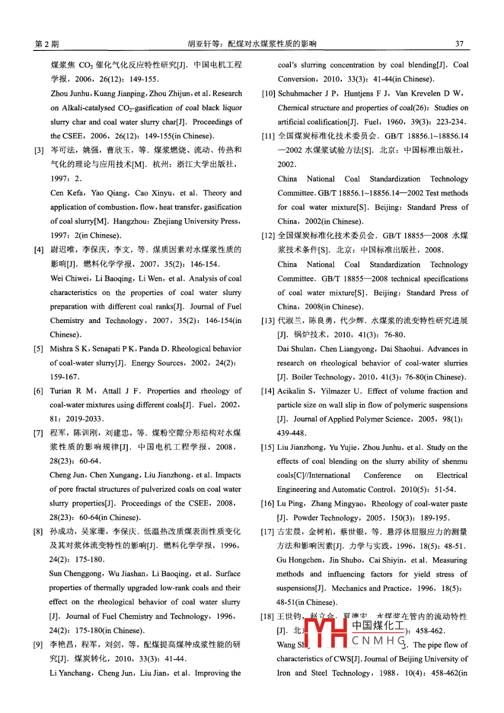 第32卷第2期中國(guó)電機(jī)工程學(xué)報(bào)Vol.32No.2Jan.15,20122012年1月15日Proceedings of the CSEEC2012 Chin. Soc. for Elec Eng. 31文章編號(hào):0258-8013(20102003108中圖分類號(hào):TQ530文獻(xiàn)標(biāo)志碼:A學(xué)科分類號(hào):47020配煤對(duì)水煤漿性質(zhì)的影響胡亞軒,劉建忠,王睿坤,虞育杰,周俊虎,岑可法能源清潔利用國(guó)家重點(diǎn)實(shí)驗(yàn)室(浙江大學(xué)),浙江省杭州市310027)Effects of Blending Coals on the Behavior of Coal Water SlurryHU Yaxuan, LIU Jianzhong, WANG Ruikun, Yu Yujie, ZHOU Junhu, CEN KefaState Key Laboratory of Clean Energy Utilization(Zhejiang University), Hangzhou 310027, Zhejiang Province, ChinaABSTRACT: Four different coals, Shigang, Xiaotun, Yanzhou,煤分別相配,以及配比的不同,對(duì)水煤漿的流變性及穩(wěn)定性and Huangling coals, were blended with each other in different影響不同;配煤制漿對(duì)漿體的成漿性影響具有明顯的非線性proportions, and the effect of blending coals on the slurry特點(diǎn),實(shí)驗(yàn)中配煤制漿的實(shí)際成漿濃度和線性加權(quán)平均得到ability, rheology and stability of coal water slurry(cWS)的最大成漿濃度間最大相差1.82個(gè)百分點(diǎn)。穩(wěn)定性試驗(yàn)表were studied. The slurry ability, rheology and stability of明,在正常的水煤漿濃度下,無(wú)論是單煤還是配煤制取的水Cws prepared by the single coal were also researche煤漿,20天后析水率都比較合理,在15%以下。不同的煤Results show that coals with lower o/c ratio have better種配煤制漿后對(duì)穩(wěn)定性有不同的影響slurry ability. The coal water slurries behave as the properties關(guān)鍵詞:水煤漿;最大成漿濃度:流變性:穩(wěn)定性;非線性of non-Newtonian fluids over certain range of concentrationand the shear thinning behavior is stronger with increasing 0 IEsolid concentration. Blending coals can influent the rheology水煤漿是一種新型的煤基代油清潔燃料,在and stability of CwS. However, blended with the same coaldifferent coal type and blending ratio have different effects or煤的氣化等潔凈煤技術(shù)上具有重要應(yīng)用2。它是約the rheology and stability. In addition, the effects of coal60%70%的煤粉和30%40%的水及少量添加劑組成的懸浮分散體系,具有低污染、易泵送、燃燒效concentration of blending coal water slurry is not equal to率高等優(yōu)點(diǎn)。研究表明煤質(zhì)因素對(duì)水煤漿的性質(zhì)weighted average value of indiⅳ vidual coal, with the maximum有很大影響,主要包括煤的碳質(zhì)量分?jǐn)?shù)、空氣平衡deviation reaching1.82 percentage points. Stability水分、可磨性指數(shù)、灰分質(zhì)量分?jǐn)?shù)、可溶礦物離子experiment shows that, water separation ratio after 20 days煤的比表面積、空隙結(jié)構(gòu)、煤表面的電位性質(zhì)、絲below 15% for either the single coal or the blending coal質(zhì)組分的質(zhì)量分?jǐn)?shù)及煤灰成分分析中SiO2的質(zhì)量water slurry. and blending different coals has different effectson the stability.分?jǐn)?shù)等47。因此水煤漿的制備對(duì)煤種的選擇有一定的要求,這也成為水煤漿技術(shù)應(yīng)用與推廣過程中的KEY WORDS: coal water slurry (CWS); maximum solid瓶頸,如何擴(kuò)大制漿用的煤種范圍,特別是采用難concentration; rheological characteristics; stability; non-linear制漿的煤種制得高濃度、低黏度、流動(dòng)性好的水煤摘要:通過對(duì)石港、小屯、兗州、黃陵4種煤進(jìn)行單煤制漿漿一直是人們關(guān)注的問題。配煤則是一種能改善及不同比例2種煤的配煤制漿實(shí)驗(yàn),研究配煤制漿對(duì)水煤漿難成漿煤的成漿性能、擴(kuò)大制漿煤種的簡(jiǎn)易而又經(jīng)的成漿性、流變性及穩(wěn)定性的影響。單煤的成漿性研究表明不同煤種成漿濃度有差異,氧碳比低的煤種成漿性較好,最濟(jì)的方法門。本文選取變質(zhì)程度不同的4種煤,按大成漿濃度較高:水煤漿在一定濃度范圍內(nèi)具有剪切變稀的照不同比例配比制漿,研究2種煤相配制得的水煤非牛頓流體特性,且濃度越高剪切變稀特性越明顯。配煤制漿的成漿性、流變性和穩(wěn)定性,從中獲得配煤制漿漿中,由于煤種間的相互作用效果不同,同一種煤與不同的對(duì)水煤漿性中國(guó)煤化工落金項(xiàng)日國(guó)家重點(diǎn)基礎(chǔ)研究發(fā)展計(jì)劃項(xiàng)日2項(xiàng)目X1實(shí)驗(yàn)CNMHG227001)。The National Basic Research Program of China (973 Program)1.1試驗(yàn)樣品及制備(2010CB227001)從表1中看到,各種煤的揮發(fā)分含量及氧碳比中國(guó)電機(jī)工程學(xué)報(bào)第32卷表14種試驗(yàn)用煤的煤質(zhì)分析2結(jié)果與討論Tab 1 Ultimate and proximate analysis offour coals for experiment2.1單煤成漿特性圖1為4種不同變質(zhì)程度的煤制取水煤漿的黏工業(yè)分析%發(fā)熱量元素分析%煤種度一濃度關(guān)系曲線。由圖1可見,4種煤的成漿規(guī)律一致,制取的水煤漿隨著濃度的增加,黏度增大。石港1.2731.4290358292250757612921.002.263.53其中,在相同的濃度下,變質(zhì)程度相對(duì)較低的兩種小屯1.4428.3911.1459032390661433021.260.344.11煤,黃陵煤和兗州煤的水煤漿黏度較髙。一般要求究州1.661423312852832827169584461.000.758.32黃陵34829.5723.0243.932247154883.530.850.47722水煤漿的黏度小于1200mPa:s2,而工業(yè)應(yīng)用的水不同。石港煤和小屯煤屬于煤階較高的無(wú)煙煤和貧煤漿黏度通常為1000mPas。將表觀黏度為煤,兗州和黃陵煤則是煤階較低的煙