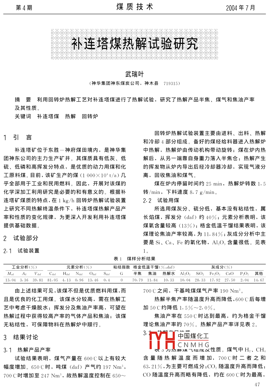第4期煤質(zhì)技術(shù)2004年7月補連塔煤熱解試驗研究武瑞葉(神華集團神東煤炭公司,神木縣719315摘要利用回轉(zhuǎn)爐熱解工藝對補連塔煤進(jìn)行了熱解試驗,研究了熱解產(chǎn)品半焦、煤氣和焦油產(chǎn)率及其性質(zhì)。關(guān)鍵詞補連塔煤熱解回轉(zhuǎn)爐引言回轉(zhuǎn)爐熱解試驗裝置主要由進(jìn)料、出料、熱解和冷卻4部分組成。備好的煤經(jīng)給料器進(jìn)入熱解爐補連塔礦位于東勝一神府煤田境內(nèi),是神華集中熱解,熱解爐由傳動機構(gòu)帶動旋轉(zhuǎn);煤在爐內(nèi)熱團神東公司的主力生產(chǎn)礦井。其煤質(zhì)具有低灰、低解后,從另一端靠自身重力落入半焦倉;熱解產(chǎn)生硫、低磷和高揮發(fā)分特點,是優(yōu)質(zhì)的動力用煤和化的揮發(fā)物從爐內(nèi)導(dǎo)出后經(jīng)冷卻器冷卻,實現(xiàn)氣液分工原料煤。目前,該礦生產(chǎn)的煤(1000×104t/a)幾離,回收焦油和煤氣乎全部用于工業(yè)和民用燃料。因此,開展對該煤的煤在爐內(nèi)停留時間約25min,熱解爐轉(zhuǎn)數(shù)1.5化學(xué)深加工利用研究是必要的和有意義的。根據(jù)補轉(zhuǎn)/min,下料速度8.7g/min連塔礦煤質(zhì)的特點,在1kg/h回轉(zhuǎn)爐熱解試驗裝置2.2試驗用煤上研究不同熱解終溫條件下,補連塔煤熱解產(chǎn)品產(chǎn)所選用煤灰分、硫分低,基本沒有粘結(jié)性,屬率和性質(zhì)的變化規(guī)律,為更深入開發(fā)利用補連塔煤長焰煤,揮發(fā)分(daf)約40%;元素分析表明,該提供基礎(chǔ)數(shù)據(jù)。煤氧含量較高(13%);格金低溫干餾結(jié)果表明,該2試驗部分煤理論焦油產(chǎn)率較高,為11.84%;灰成分分析中主要是Si、Ca、Fe的氧化物,Al2O3含量很低。見表2.1試驗裝置表1煤樣分析結(jié)果工業(yè)分析(%)元素分析(%)粘結(jié)指數(shù)格金低溫干餾(%,daf灰成分(%)Cdat haaf naf Oca Staf半焦焦油熱解水A2O3SiO2Fe2O3CaOP2O5其f13.043.3639.8181.054.130.9613.460.4070.7911.8410.3310.0428.3317.9227.502.0414.67由上述結(jié)果可見,該煤不但是優(yōu)質(zhì)燃料用煤,而700C之間,干基噸煤煤氣產(chǎn)率190Nm3。且是優(yōu)良的化工用煤。該煤水分較高,需在熱解工熱解半焦產(chǎn)率隨溫度升高而降低,600℃后每增藝中考慮干燥脫水;揮發(fā)分及焦油產(chǎn)率高,可望在加50C約降低1.5%~2.0%。熱解過程中獲得較高產(chǎn)率的氣體產(chǎn)品和焦油;該煤焦油產(chǎn)率在550C時達(dá)到最高,約為格金干餾無粘結(jié)性,可保障物料在熱解爐中順行。理論焦油產(chǎn)率的70%。熱解產(chǎn)品產(chǎn)率詳見表23結(jié)果討論中國煤化工CNMHG3.1熱解產(chǎn)品產(chǎn)率。為熱胖氣出成以性質(zhì)。煤氣中H2、CH試驗結(jié)果表明,煤氣產(chǎn)量在600C以上有較大含量隨熱解溫度而增加,700C時二者之和幅度增加。650℃時,噸煤(daf)產(chǎn)氣約197Nm3,63.21%,為主要可燃成分;CO2隨溫度升高而降低;700C時增加至247Nm3,故熱解溫度控制在650~CO隨溫度升高而略有降低,約在600C時為最高第4期煤質(zhì)技術(shù)2004年7月表2熱解產(chǎn)品產(chǎn)率700C下含量為11%左右;C2~C4含量隨溫度升高熱解溫度半焦焦油煤氣熱解水損失稍有減少。(C)(wt%)(wt%)(Wt%)(Nm3/t)(wt%)(wt%)煤氣中CO含量較低,650C時為9.59%,明顯50074.155.619.95069,101.1955069.617.7310.4097.3610.911.35低于民用煤氣規(guī)定的CO含量指標(biāo),與其它氣化工8.587.5013.96133.8藝煤氣相比,該煤氣更適宜作民用煤氣。066.076.1904197.287.341.3665.496.3120.35247.506.980.8該煤氣熱值遠(yuǎn)大于兩段爐或其它氣化煤氣,大注:所有產(chǎn)率為干燥無灰基約在19~25MJ/Nm3;700C時為24.26MJ/Nr表3煤氣組成及性質(zhì)熱解溫度組成(V%)密度低位發(fā)熱量CHekcal/nm2.1915.815.0329.6411.7410.1112,389.1024.00531422,1565023.913.637.570.95466819.4612,194.15582124,26大于一般民用煤氣熱值15.0MJ∧Nm3的標(biāo)準(zhǔn),是理值;蒽含量太低,不值得單獨提取。因此,含有蒽想的中熱值民用煤氣的300~360C餾分很適于作燃料油使用(2)半焦表5焦油分析半焦產(chǎn)率占原料煤(干基)60%以上,是主要比重(D420)產(chǎn)品。其分析結(jié)果見表4。該煤熱解后,半焦揮發(fā)分灰分(wt%)0.44水分(wt%)較低(與褐煤比)。當(dāng)溫度在600~700C時,半焦揮發(fā)分可降至8%以下。由于試驗用煤低硫低灰,故半粘度(60C,mPa.s焦產(chǎn)品灰、硫含量也很低,固定碳含量較高。說明元索分析Cdn降低煤灰分是提高半焦質(zhì)量的主要手段之一;CO反應(yīng)性和鍛燒比電阻值均表明,該半焦具有較高的8.79化學(xué)反應(yīng)性和電阻率,很適宜作為炭質(zhì)還原劑,也蒸餾餾分(wt%無水焦油)IBP~170C170~210C12.23可作為無煙燃料、高爐噴吹料和氣化原料等。表4半焦主要性質(zhì)分析00~360C13.46熱解工業(yè)分析(%)固定碳全硫950C鍛燒(O2反應(yīng)性FCad Sd比電阻1100C)各餾分酸性物的含量(wt%)IBP~170Cda(%)(%)(mm2/m)(a%)170~210C6.315001.454.1016.9878.470.36210~130C38,91230~300C5500.844.3514.5781.030.4788.1>360C6001.004.0512.2384.290.336500.994.108.6886.710.3089<360C餾分分析(wt%)飽和烴(族組成分析)環(huán)芳烴000.744.216.6488.770.314153.589,7環(huán)芳烴16.38(3)焦油三環(huán)芳烴多環(huán)及極性物從表可見,焦油粘度較高,約1500mPa.s,無萘含量7,56水焦油的蒸餾數(shù)據(jù)表明,焦油<360C的可餾出物略蒽含量低,為43.47%;該煤熱解焦油中酚含量很高,小于300C餾分中總酚含量達(dá)32.7%。這和一般的低溫中國煤化工30(留分,經(jīng)精僧提后焦油含量相近。如此高的酚