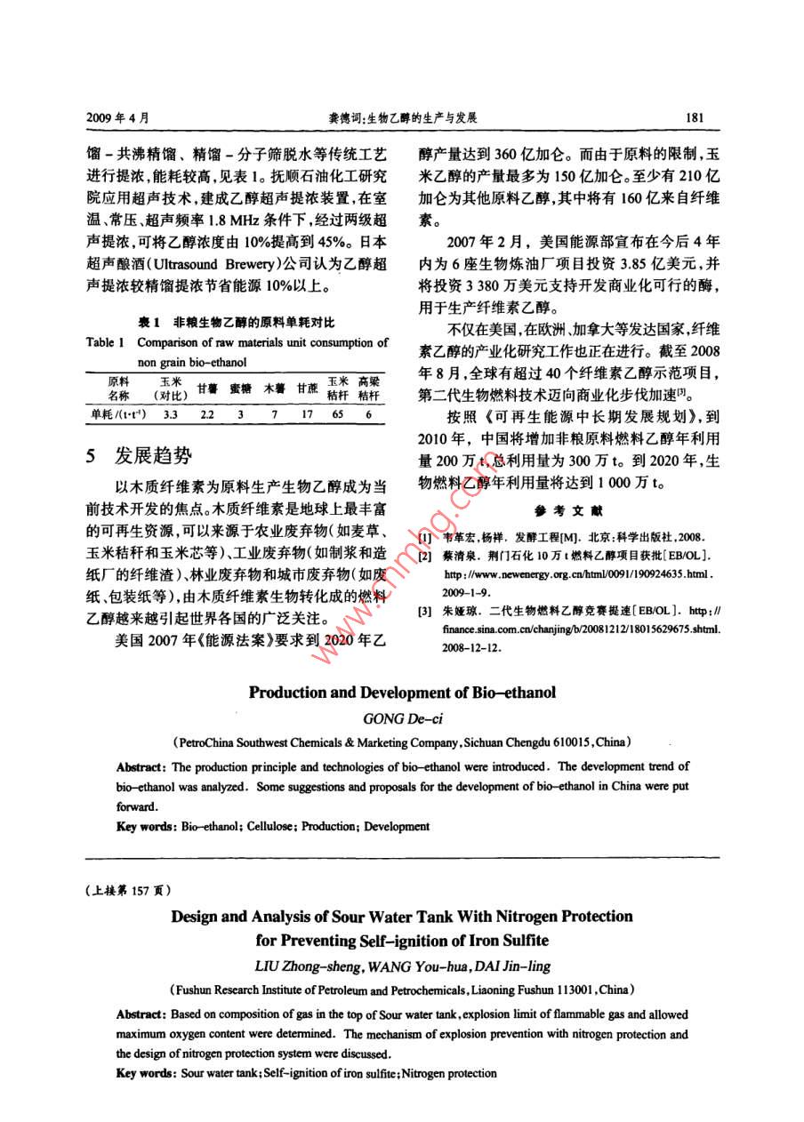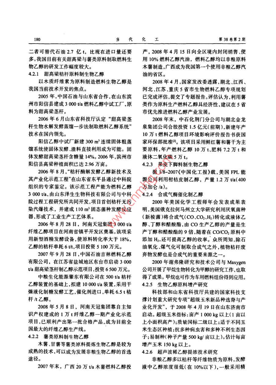 008卷第2期第Vo1.32009年4月 Contemporary chemica工138 Chemical Industry April, 2009生物乙醇的生產(chǎn)與發(fā)展龔德詞(中油化工與銷售西南公司,四川成都610015)摘要:敘述了生物乙醇的生產(chǎn)原理和工藝技術(shù),對生物乙醇發(fā)展趨勢進(jìn)行了分析探討,并對我國發(fā)展生物乙醇提出了合理化建議。關(guān)鍵詞:生物乙醇;纖維素;生產(chǎn);發(fā)展中圖分類號:223.12文獻(xiàn)標(biāo)識碼:A文章編號:16706020902-0178-04燃料乙醇制造多以糧食等農(nóng)作物為原料,屬(3)纖維質(zhì)原料,如樹枝、木屑、工廠纖維質(zhì)下腳于可再生能源,具有可持續(xù)發(fā)展的意義;汽油內(nèi)料等。增加乙醇組份,使其含氧量、辛烷值提高,燃燒更加完全,汽車尾氣中CO和C一H化物排放量分2生物乙醇制造原理別降低30.8%和13.4%,其燃燒排放的CO2和生21水解(糖化)物源生長消耗的CO2幾乎等量,具有改善環(huán)境2.1.1淀粉原料水解質(zhì)量的意義;燃料乙醇可替代部分石油能源,減淀粉分子。淀粉由葡萄糖基團(tuán)聚合而成的,輕了國內(nèi)石油安全的壓力,對我國經(jīng)濟(jì)發(fā)展具有是多糖中最易水解的一種天然淀粉含有直鏈與戰(zhàn)略意義。支鏈兩種淀粉結(jié)構(gòu),不同原料中直鏈結(jié)構(gòu)淀粉的2004年2月10日,國家發(fā)改委、公安部、財質(zhì)量分?jǐn)?shù)分別為:玉米21%~39%、小麥40%、土政部、商務(wù)部、稅務(wù)總局、環(huán)境保護(hù)總局、工商行豆25%政管理總局、質(zhì)量監(jiān)督檢驗檢疫總局等八部委決淀粉糊化與液化。淀粉在水中加熱、溶脹,定將使用車用乙醇汽油試點范圍擴(kuò)大到吉林、黑60~80℃時破裂,開始糊化成a-淀粉,再加熱龍江、河南、安徽、遼寧五省全境及湖北、山東、河使支鏈淀粉溶解,成流動性醪液,即完成了淀粉北等省的部分城市,拉開了我國大量合規(guī)使用乙液化不同淀粉原料完全液化溫度為:土豆醇汽油的序幕。132℃、小麥136~141℃、玉米146~151℃。2008年4月15日,廣西僮族自治區(qū)在全境淀粉水解(糖化)在已經(jīng)完成液化的淀粉醪內(nèi)封閉銷售、使用非糧(木薯)乙醇汽油,成為我液中加入酶制劑或糖化曲,使淀粉全部轉(zhuǎn)化為葡國首個推廣使用非糧原料乙醇汽油的省區(qū)。萄糖。2.1.2纖維質(zhì)原料水解1生物乙醇的原料纖維素、半纖維素、木質(zhì)素纖維素是由葡萄制造生物乙醇的原料主要有3類:(1)淀粉糖B-1,4糖苷鍵連接而成的聚合物,是結(jié)構(gòu)上原料,是制造生物乙醇的主要原料,約占各種生無分枝、性質(zhì)穩(wěn)定的多糖,它是構(gòu)成植物細(xì)胞壁物原料的80%,如玉米(占35%)、薯類(占45)的主要成份。各種纖維質(zhì)原料中的纖維素質(zhì)量分等;(2)糖類原料,如蜜糖蔗糖、甜菜、甜高梁等;數(shù)為:稻麥秸桿40%~50%、木材40%~50%、玉收稿日期:2009-03-1作者簡介:龔德詞(1964)女,湖北沙市人,工程師,1984年畢業(yè)于承德石油化工專科學(xué)校1998年畢業(yè)于東北財經(jīng)大學(xué)。電話:028-865205032009年4月德詞:生物乙醇的生產(chǎn)與發(fā)展179米芯53%。半纖維素、木質(zhì)素與纖維素一起伴生催化劑酵母于植物細(xì)胞壁中。半纖維素是一種易水解的多↓↓糖。木質(zhì)素是具有苯基丙烷結(jié)構(gòu)單元,并通過碳纖維原料→預(yù)處理→水解→發(fā)酵→蒸餾→產(chǎn)品一碳鏈接而成三維結(jié)構(gòu)的高聚物,其性質(zhì)穩(wěn)定、4生物乙醇的發(fā)展較難水解。纖維素水解??捎盟崴?例如美國BP公根據(jù)統(tǒng)計,2007年全球生物乙醇產(chǎn)量已達(dá)4司的稀酸水解)與酶水解(例如加拿大 logen500萬t,預(yù)計2020年前后將發(fā)展到2億t相當(dāng)司的酶消解生物法)2種方法對纖維素進(jìn)行水于現(xiàn)在世界石油生產(chǎn)量的5%我國已有吉林燃解。纖維素的酸水解,以硫酸、鹽酸、氫氟酸等強(qiáng)料乙醇有限責(zé)任公司河南天冠集團(tuán)、安徽豐原酸為催化劑其反應(yīng)過程為:生物化學(xué)股份有限公司黑龍江華潤酒精有限公 (C.H.)+nH20-nCHi2O6司4家燃料生物乙醇生產(chǎn)企業(yè),基礎(chǔ)產(chǎn)能132萬纖維素的酶水解以纖維素酶為催化劑,其由ta。根據(jù)國家“可再生能源中長期發(fā)展規(guī)劃”我C1和C組成。纖維素先被C降解為低分子化合國非糧燃料生物乙醇產(chǎn)量在2010年將達(dá)200萬物,再由C的幾種酶作用成為纖維二糖,最后再ta,在2020年將達(dá)1000萬ta由β-葡萄糖苷酶水解為葡萄糖。4.1糧制生物乙醇由于纖維素性質(zhì)穩(wěn)定,酸或酶水解速率,糖我國已建成的四家燃料生物乙醇企業(yè)主要得率低利用難度較大。以玉米為原料,其玉米耗量占全國玉米總產(chǎn)量2.2乙醇發(fā)酵2.43%(2006年數(shù)據(jù),玉米產(chǎn)量1.47億a,生物乙醇發(fā)酵是在酵母菌存在下發(fā)生的。乙醇發(fā)乙醇玉米單耗3.5tt,乙醇產(chǎn)量102萬ta,則酵是厭氧母菌在厭氧條件下發(fā)酵己糖形成乙醇,3.5×102/147002.43%)美國燃料生物乙醇玉反應(yīng)過程由大量酶催化來完成。其反應(yīng)過程分為米耗量占玉米總產(chǎn)量6%兩個階段:近年我國玉米價格走高,20062007年黑第1階段——糖經(jīng)糖酵解(EMP途徑)分解龍江玉米價格由1300元t增至1540元t同為丙酮酸(EMP途徑也可由其它方式完成);期吉林玉米價格由1270元/t增至1460元/t第2階段——在無氧條件下,丙酮酸由脫羧美國是世界玉米出口大國2006年期貨玉