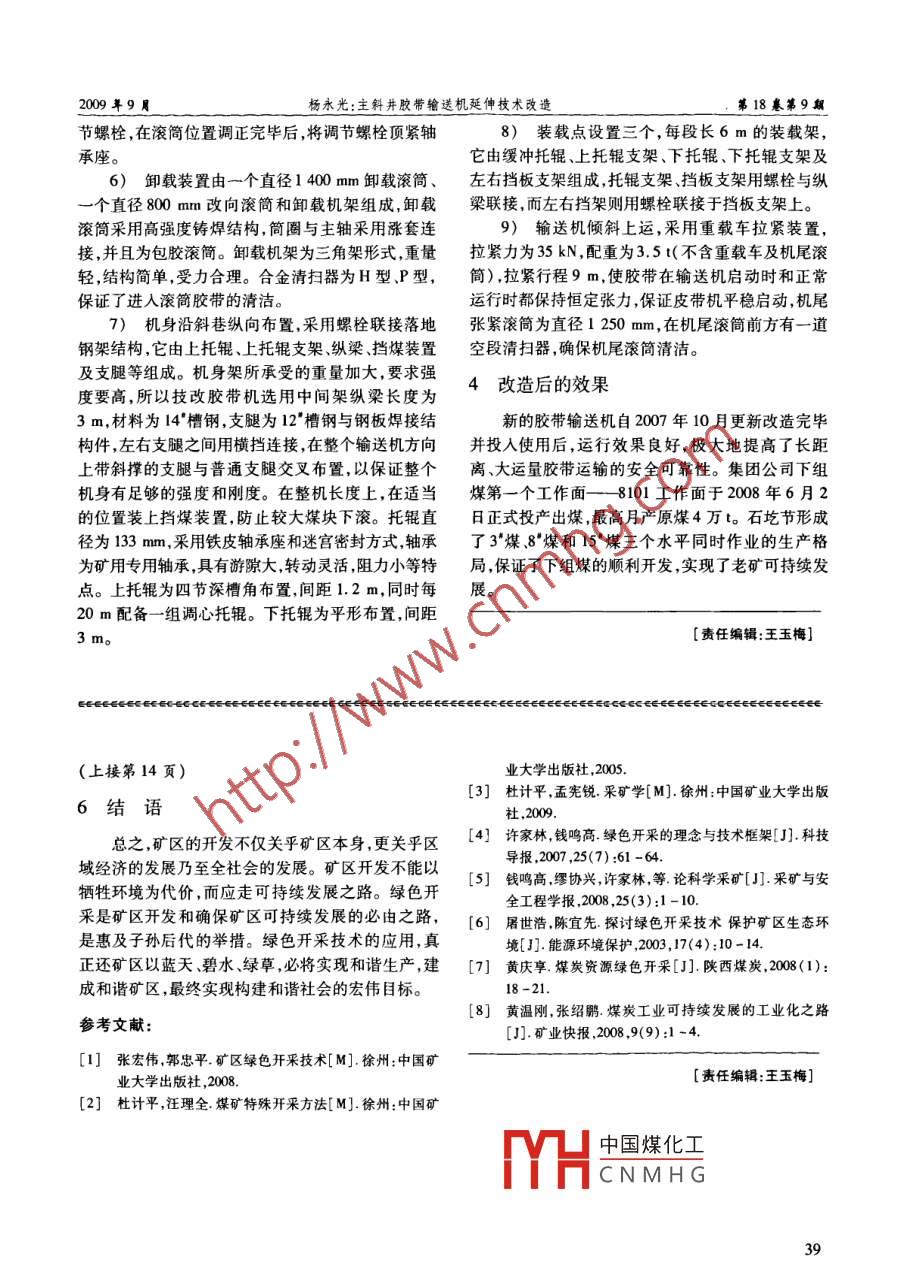 總第119期.doi; 10.3969/j. isn. 1005 - 2798.2009.09.005煤炭資源的綠色開采朱海賓(新疆大學(xué),新疆烏魯木齊830046)摘要:通過分析煤炭在我國能源結(jié)構(gòu)中的重要地位及其開采對環(huán)境的影響,闡述了礦業(yè)可持續(xù)發(fā)展和煤炭資源綠色開采的必要性,總結(jié)了綠色開采的內(nèi)涵及當(dāng)前存在的綠色開采技術(shù),從而論述了實(shí)施煤炭資源綠色開采的意義。關(guān)鍵詞:煤炭;綠色開采;生態(tài)環(huán)境;可持續(xù)發(fā)展;綠色開采技術(shù)體系中圖分類號:TD821文獻(xiàn)標(biāo)識碼:A文章編號:1005- 2798(2009)09- 0012- 03Green Mining of Coal ResourceZHU Hai -bin(Xinjiang University , Urumqi 830046 ,China)Abstract:Through analyzing the important stalus of coal resource in resource structure of China and the infuence of coal mining to theenvironment, this thesis summarized the connotation of green mining and its current technical system. At the same time, the author ofthis thesis expounded the necessity of the green techniques as well as the sustainable development in coal mining. Thus the summarycan be concluded that the green mining is of great importance to the development of the regional economy, even to the whole society.Keywords :coal ;green mining; entironment ;sustainable development;technical system of green mining我國“十一-五”規(guī)劃要求能源行業(yè)“堅持節(jié)約優(yōu)積、大幅度下降,地表植被千枯,自然景觀遭到破壞,先,立足國內(nèi),煤為基礎(chǔ),多元發(fā)展,構(gòu)建穩(wěn)定、經(jīng)濟(jì)、農(nóng)業(yè)產(chǎn)量下降。另一方面,煤炭開采過程中產(chǎn)生的清潔的能源結(jié)構(gòu)體系”。在我國一-次能源結(jié)構(gòu)中,煤礦井水、洗煤水以及矸石淋溶水等廢污水,含有大量炭近幾年一直占70%左右,并將長期作為我國的主的硫化物.重金屬離子等有害物質(zhì),嚴(yán)重污染了周圍要能源。眾所周知,制約我國經(jīng)濟(jì)發(fā)展的突出瓶頸水環(huán)境。是能源,而能源中能比較主動解決的是煤炭(油氣在2) 破壞土地資源。煤炭開采對土地資源能造國外大量開發(fā)帶來的是能源安全問題)。因此,煤炭成嚴(yán)重破壞,井工開采以地表塌陷和矸石山壓占為工業(yè)能否健康發(fā)展是事關(guān)我國能源安全與經(jīng)濟(jì)可持主,露天開采則以直接挖損和外排土場壓占為主。據(jù)續(xù)發(fā)展的重大問題。統(tǒng)計,目前,我國因煤炭開采引起的地表塌陷面積達(dá)55萬hm2 ,平均開采萬噸煤的地表沉陷達(dá)0.19 hm';1煤礦開采對環(huán)境的影響而我國大中型煤礦已有矸石山近2000座,矸石堆放多年來,為保證國民經(jīng)濟(jì)高速發(fā)展,我國的煤炭量達(dá)40億t,占地面積3.4萬hm2。.一直是在超能力生產(chǎn),原煤產(chǎn)量從1996年的13.6億t3)污染大氣環(huán)境。 我國煤礦每年排入大氣中上漲到2008年的28.1億t,年產(chǎn)量增長了一倍多。的瓦斯達(dá) 120億m' ,瓦斯的主要成分是CH,其產(chǎn)生煤炭開采在為社會建設(shè)和消費(fèi)提供能源的同時,也的溫室效應(yīng)是CO2的21倍;每年排入大氣中的粉對生態(tài)環(huán)境造成了極大的破壞。采礦活動對礦區(qū)環(huán)塵約47萬1,這不僅對礦區(qū)環(huán)境造成了嚴(yán)重污染,而境的破壞主要體現(xiàn)在以下三個方面:且引發(fā)塵肺病患者達(dá)幾十萬人。此外,煤礦矸石自.1)破壞和污染水資源。 一方面,在煤炭開采燃產(chǎn)生大量s0. C0簍右毒氣體,是大氣環(huán)境的另過程中,人為疏干排水以及采動影響形成的導(dǎo)水裂一個中國煤化工p我國國有煤礦中隙帶對煤系含水層的自然疏干,導(dǎo)致地下水位大面長期MYHCNMHG礦區(qū)和周邊地區(qū)收稿日期:2009 04-17作者簡介:朱海賓( 1984 - ),男,山東菏澤人,碩士研究生,研究方向?yàn)榈V床與區(qū)域成礦學(xué)。122009年9月朱海賓:煤炭資源的綠色開采第18卷葦9期的大氣環(huán)境。簡言之,煤炭資源綠色開采的內(nèi)涵是努力遵循循環(huán)經(jīng)濟(jì)中的綠色工業(yè)原則,形成一-種與環(huán)境協(xié)調(diào)2可 持續(xù)發(fā)展與綠色開采-致的“低開采、低排放、高利用”的開采技術(shù)。在國際社會上,礦業(yè)開采造成的環(huán)境和生態(tài)問4綠色開采的技術(shù)體系題一直受到廣泛關(guān)注。1963年,“羅馬俱樂部”的報告就曾告誡世人,“世界的資源將無法應(yīng)對人類的消煤礦綠色開采是從廣義資源的角度來對待煤、瓦費(fèi)”。世界上礦業(yè)發(fā)達(dá)的國家,如:美國、澳大利亞、斯、水等一切可以利用的各種資源,其主旨是將煤礦德國等也早在20世紀(jì)70年代就開展了礦山環(huán)境保開采活動對自然環(huán)境和生態(tài)的破壞降到最低限度,防護(hù)和治理。礦產(chǎn)資源開發(fā)和環(huán)境保護(hù)- -體化已成為止或盡可能減輕因煤炭開采對環(huán)境和其他資源的不當(dāng)前國際礦業(yè)發(fā)展的一個重要趨勢。利影響。煤礦綠色開采技術(shù)體系簡要表達(dá),見圖1。而在我國,目前,煤炭開采的“高開采、高排放、綠色開采技術(shù)低利用”現(xiàn)象還很嚴(yán)重,因此,提高資源利用率,減少開采對環(huán)境的破壞,實(shí)現(xiàn)煤炭工業(yè)的可持續(xù)發(fā)展和巖層移動體系煤礦開采技術(shù)生態(tài)治理與恢復(fù)技術(shù)礦產(chǎn)資源的代際開發(fā)是擺在我們面前的重要課題。.我國有必要形成煤炭資源開采與環(huá