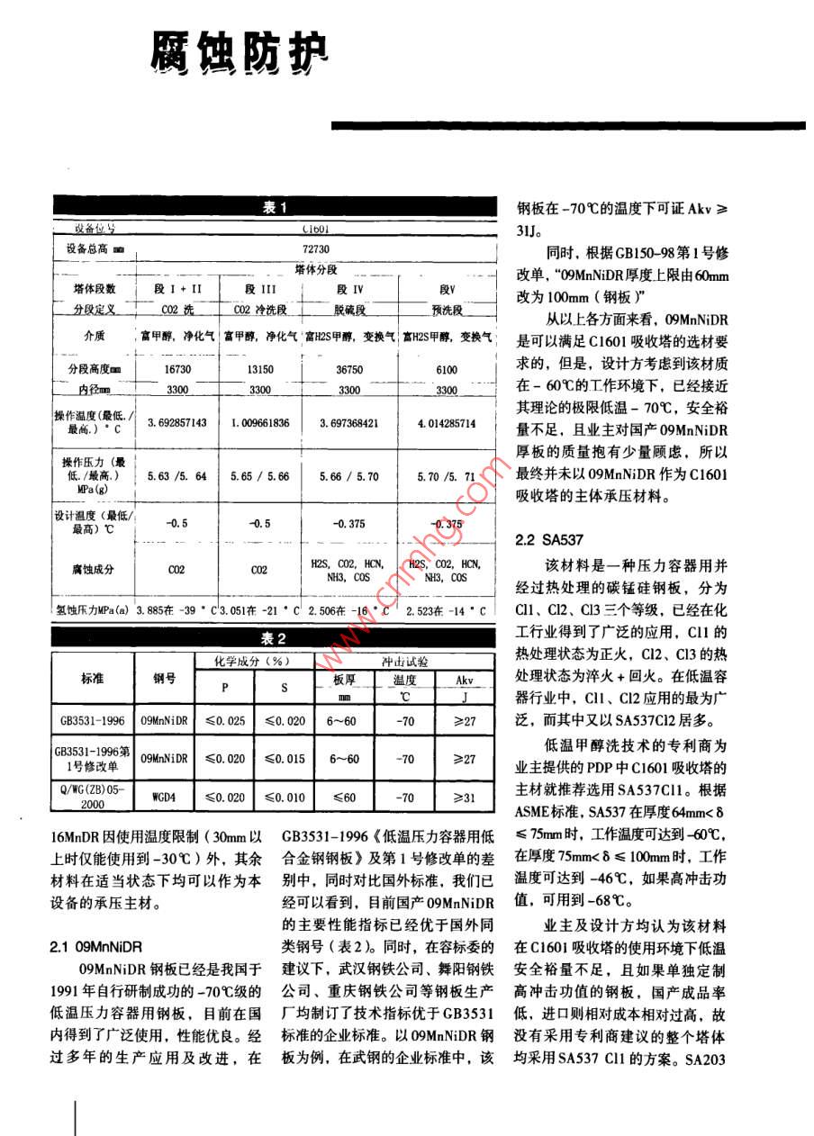 C1601低溫甲醇洗吸收塔的材料選擇