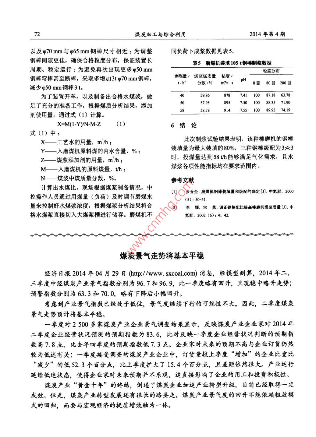 煤炭加工與綜合利用COAL PROCESSING COMPREHENSIVE UTILIZATIONNo.4,2014水煤漿棒磨機(jī)的鋼棒裝填量及成漿性研究試驗(yàn)李鋒軍(中國(guó)石化長(zhǎng)城能源化工(寧夏)有限公司,寧夏寧東750411)摘要:棒磨機(jī)的鋼棒裝填量和鋼棒的級(jí)配直接影響水煤漿的粒度分布,而粒度分布又是影響水煤漿粘度的重要因素之一,通過水煤漿成漿性試驗(yàn)摸索棒磨機(jī)的鋼棒裝填量及級(jí)配,從而生產(chǎn)出濃度、粘度、粒度分布合格的水煤漿。關(guān)鍵詞:棒磨機(jī);裝填量;級(jí)配;粒度分布中圖分類號(hào):TQ545文獻(xiàn)標(biāo)識(shí)碼:A文章編號(hào):10058397(2014)040070-03國(guó)電中國(guó)石化寧夏能源化工有限公司甲醇運(yùn)發(fā)分高、發(fā)熱量高、可磨指數(shù)高、化學(xué)活性好、行部設(shè)計(jì)生產(chǎn)能力為50萬(wàn)ta甲醇、10萬(wàn)taCO成漿性好的特點(diǎn)(行業(yè)內(nèi)稱之謂二低、三高、二和12萬(wàn)taH2的大型化工企業(yè),氣化采用的是德好的煤)。寧夏能源化工有限公司使用的原料煤士古水煤漿加壓氣化技術(shù)。以煤為原料,經(jīng)濕式為寧東羊場(chǎng)灣煤礦運(yùn)來的原料煤,分為沫煤和粒棒磨機(jī)制漿,制備出合格的水煤漿,送至煤漿槽煤。沫煤灰含量較高,最髙達(dá)23.66%;粒煤的內(nèi)貯存,煤漿經(jīng)高壓煤漿泵加壓至8.0MPa后送灰含量較低,一般均小于10%。為滿足氣化原料至氣化爐,與空分裝置送來的83MPa氧氣經(jīng)工煤的要求,公司將沫煤和粒煤按一定的配比混合藝燒嘴霧化、混合后進(jìn)入氣化爐,發(fā)生部分氧化使用(即沫煤/粒煤質(zhì)量比=1:5),混合樣的分析還原反應(yīng),生成以CO和H2為有效成分的水煤氣,結(jié)果見表1。為甲醇合成和一氧化碳提純提供原料氣。該項(xiàng)技表1混合樣煤漿制備原始開車煤樣分析結(jié)果術(shù)要求制出的水煤漿具有較高濃度、流動(dòng)性好、田T已穩(wěn)定性好、好的粒度分布、pH值合適的特性。這水分%1750灰分/%l1.84對(duì)提高氣化效率、降低比氧耗至關(guān)重要。而影響揮發(fā)分%23.9固定碳/%55.水煤漿成漿性主要有:煤質(zhì)、添加劑、煤漿粒度碳質(zhì)量分?jǐn)?shù)%68.32氫質(zhì)量分?jǐn)?shù)/%3.28分布。在原料煤質(zhì)和添加劑穩(wěn)定前提下,粒度分氧質(zhì)量分?jǐn)?shù)%1198氮質(zhì)量分?jǐn)?shù)%布就成為影響成漿性主要因素。硫質(zhì)量分?jǐn)?shù)0.70發(fā)熱量/婦kg62變形溫度/℃煤漿制備設(shè)有3臺(tái)Φ4000mm×6000mm棒可磨指數(shù)軟化溫度/℃1200流動(dòng)溫度/℃磨機(jī),單臺(tái)磨煤機(jī)的正常處理量48th根據(jù)混合煤樣分析數(shù)據(jù),寧東羊場(chǎng)灣煤礦煤1原料煤煤質(zhì)分析屬煙煤,沫煤與粒煤混合樣水分較髙、固定碳含氣化要求原料煤具有灰熔點(diǎn)低、灰分低、揮量較高、發(fā)熱量高、反應(yīng)活性較好、灰熔點(diǎn)較低,可作為水煤漿加壓氣化制合成氣原料用煤。收稿日期:201403-2作者簡(jiǎn)介:李鐸軍(1985),男,陜西靖邊人,2010年畢業(yè)于2棒磨機(jī)規(guī)格天津大學(xué)勁油職業(yè)技術(shù)學(xué)院能源化工系,中國(guó)石化長(zhǎng)城能源化工(寧國(guó)電中國(guó)石化寧夏能源化工有限公司甲醇運(yùn)夏)有限公司甲醇運(yùn)行邳氣化區(qū)域班長(zhǎng)2014年第4期李峰軍:水煤漿棒磨機(jī)的鋼棒裝填量及成漿性研究試驗(yàn)71行部采用的棒磨機(jī)為中信重工機(jī)械股份有限公司在一起時(shí),鋼棒之間縫隙較大,物料在其中的流制造的濕式溢流型棒磨機(jī);內(nèi)襯橡膠襯板。棒磨速較快,研磨時(shí)間變短。同時(shí),物料與磨煤機(jī)筒機(jī)的技術(shù)參數(shù)見表2。體之間接觸面較小,因而會(huì)出現(xiàn)研磨不充分的現(xiàn)表2棒磨機(jī)技術(shù)參數(shù)象。如果在粗棒之間添加細(xì)棒,鋼棒之間的縫隙數(shù)值就會(huì)變小。同時(shí),鋼棒與物料接觸面積會(huì)增大,筒體內(nèi)徑/m4000物料在磨煤機(jī)內(nèi)流速變慢,物料有較多的機(jī)會(huì)與筒體工傳轉(zhuǎn)鋼棒接觸從而使煤漿被研磨更細(xì)2。入口粒度/mm≤10為滿足水煤漿氣化工藝要求的粒度分布,首薦裝棒量/t先要解決的是棒磨機(jī)的鋼棒級(jí)配及裝填量。因此,磨棒直徑規(guī)格/mm在初次制漿時(shí),進(jìn)行了水煤漿成漿性試驗(yàn)(即粒筒體工作長(zhǎng)度/mm度分布與鋼棒級(jí)配及裝填量的工業(yè)試驗(yàn))。筒體有效容積/m369.81鈉棒最大裝填量/t5水煤漿成漿性試驗(yàn)最大處理能力/68.20磨煤機(jī)鋼棒的型號(hào)分別為:q75mm×5800mm、3氣化對(duì)水煤漿要求q65mm×5800mm、q50mm×5800mm。使用的是德士古氣化工藝對(duì)原料要求較高,相應(yīng)地對(duì)寧夏南益化工有限公司的水煤漿添加劑,添加劑的水煤漿的性質(zhì)也有以下五方面的要求,即:較高加入量為干煤質(zhì)量的0.26%,三種鋼棒的添加量依的濃度、較好的流動(dòng)性、較好的穩(wěn)定性、適宜的據(jù)以往的生產(chǎn)經(jīng)驗(yàn)比例為34:3,磨煤機(jī)鋼棒的添加pH值、適宜的粒度分布。其中,粒度分布是影量需根據(jù)水煤漿特性做出調(diào)整。響水煤漿成漿的關(guān)鍵因素。若水煤漿中粗顆粒較根據(jù)寧煤甲醇項(xiàng)目生產(chǎn)情況,借鑒一些生產(chǎn)多,煤漿表觀粘度下降,流動(dòng)性變好,但粒子的方面經(jīng)驗(yàn)(其與本裝置采用添加劑為同一生產
