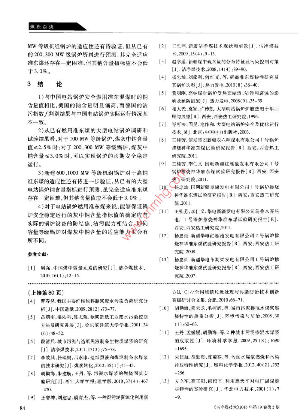 煤炭燃燒兄業(yè)感容吻水的隱燒究尚慶雨423(1.煤炭科學(xué)研究總院節(jié)能工程技術(shù)研究分院,北京10003;2.煤炭資源開采與環(huán)境保護(hù)國家重點實驗室,北京100013;3.國家能源煤炭高效利用與節(jié)能減排技術(shù)裝備重點實驗室,北京100013)摘要:采用熱天平法對工業(yè)廢棄物水煤漿進(jìn)行熱重分析,并與未添加工業(yè)廢棄物制備的水煤漿〔原煤水煤漿)的燃燒性能進(jìn)行比較。結(jié)果表明:工業(yè)廢棄物水煤漿的揮發(fā)分初析溫度、燃點、燃燼溫度均低于原煤水煤漿,燃燼特性指教C均高于原煤水煤漿,說明工業(yè)廢棄物水煤漿具有燃點低、燃燼性能較好的燃燒特性,為大規(guī)模處理工業(yè)廢棄物提供了技術(shù)保證。關(guān)鍵詞:工業(yè)廢棄物;水煤漿;燃燒特性中圖分類號:X793;TD849文獻(xiàn)標(biāo)識碼:A文章編號:1006-6772(2013)02-0078-03Combustion characteristics of coal water mixture preparedfrom industrial wasteSHANG Qing-yu..(l. Energy Conseration and Engineering Technology Research Institute, China Coal Research Institute, Beijing 100013, China2. State Key Laboratory of Coal Mining and Environmental Protection( CCRI), Beijing 100013, China;3. National Energy Technology equipment Laboratory of Coal Utilization and Emission Control(CCR/), Beijing 100013, China)Abstract: The thermal gravimetric analysis of coal water mixture( CWM) prepared from industrial wasle was carrieout with thermal balance method. Compared its combustion characteristics with these of raw coal CWM. Tested thevolatile initial precipitation temperature, ignition temperature, burnout temperature, burnout characteristic exponent(Cb) of these two CWM. The results show that, the first three exponents of industrial waste CWM are lower than thoseof raw coal CWM, while Ch is higher. That means the industrial waste CWM has beller combustion characteristics.Key words: industrial waste; coal water mixture; combustion characteristic隨著中國經(jīng)濟(jì)的迅速發(fā)展,工業(yè)污泥及廢水、位熱值分別為8~10MJ/kg和12~15MJ/kg。為了廢液等工業(yè)廢棄物的產(chǎn)生量急劇增加13,2010年治理工業(yè)廢棄物,結(jié)合水煤漿技術(shù),將其配入煤中全國產(chǎn)生含水80%的濕污泥為3665萬t。而工業(yè)制成工業(yè)廢棄物水煤漿用于鍋爐燃燒,能充分利用廢水方面,僅造紙行業(yè)廢水排放量就占全國工業(yè)廢黑液、污泥中的有機質(zhì)。不僅可以高效處理廢棄水總排放量的18%3。由于工業(yè)廢棄物含水率物,而且可以節(jié)約制漿用煤,是一項既經(jīng)濟(jì)又環(huán)保高、成分復(fù)雜且含有病菌等污染物,不僅難以處置、的技術(shù)。因此,近年來出現(xiàn)了由各種工業(yè)廢棄物制利用,而且污染環(huán)境。但其均含有一定量的有機可備水煤漿的工藝技術(shù)69。燃物且熱值較高,如工業(yè)污泥和造紙廢液的干基高熱分析法是國內(nèi)外研究煤的燃燒特性最常用收稿日期:2012-11-29責(zé)任編輯:宮在芹作者簡介:慶雨(1973—),男,河北石家莊人,高級經(jīng)濟(jì)師,現(xiàn)任煤炭科學(xué)研究忘院節(jié)能工程技術(shù)研究分院院長。引用格式:尚慶雨工業(yè)廢棄物水煤漿的燃燒特性研究[冂潔凈煤技術(shù),2013,19(2):78-80,84.清凈煤摶術(shù)》2013年第19卷第2期煤炭燃燒核心期刊礦業(yè)類核心期刊的方法之一,利用差熱熱天平研究煤的質(zhì)量、熱量表1制漿原料基本性質(zhì)等隨溫度變化的規(guī)律(即燃燒特性曲線),從而確定a/ V,/ S, d/ e J/煤的燃點和燃燼溫度等,最終得到煤樣的燃燒性煤樣%%(M·kgt能-3。為了解工業(yè)廢棄物水煤漿的燃燒特性,對貧瘦煤2.860.9510.7112.880.3430.95以山西貧瘦煤為原料添加污泥、黑液制備的工業(yè)廢深圳污泥69.532.1460.9737.121.0810.34棄物煤漿進(jìn)行燃燒特性實驗研究堿性黑液897210.6238.8547.580.9.961實驗部分以堿性造紙黑液改性城市污泥與貧瘦煤混合1.1水煤漿樣品制備了幾種廢棄物煤漿,并將其用于熱天平的燃燒實驗使用的制漿原料為山西貧癜煤、深圳污特性實驗研究。為便于對比,也對由原料煤制備的泥及河南堿性造紙黑液。表為3種制漿原料的原煤煤漿進(jìn)行了熱天平燃燒特性實驗。表2為熱天基本性質(zhì)。平實驗用廢棄物煤漿的特性分析。表2熱天平實驗用廢棄物煤漿性質(zhì)方案樣品M/A%V得%FC/Qmm/(M·kg1)o(K20)%a(Na20)%貧瘦煤原煤煤漿26.362.472貧瘦煤黑液煤漿33.638.0710.0348.2719.339.703貧瘦煤污泥煤漿1238.4010.149.2142.256.84貧瘦煤污泥煤漿2335.6911.4341.6317.034.337.87注:①添加36%黑液制備的煤漿;②添加25%廢耷物(污泥與黑液配比為8:2)制備的煤漿:③添加30%廢棄物(污泥與黑液配比為5:5)制備的煤漿1.2熱天平實驗裝置和條件采用北京某科學(xué)儀器廠生產(chǎn)的HCT-2型微機2結(jié)果與討論差熱天平,對廢棄物煤漿進(jìn)行熱重分析。該機主要2.1實驗結(jié)果包括4部分:熱重反應(yīng)系統(tǒng)、溫度控制系統(tǒng)、數(shù)據(jù)采圖1為對貧瘦煤煤漿及其添加不同工業(yè)廢棄物集處理系統(tǒng)和可控制氣氛系統(tǒng)。制備的煤漿進(jìn)行熱重分析得到的TG/DTG曲線實驗條件:升溫速率40℃/min,工作氣氛為空氣,對曲線進(jìn)行分析,得到揮發(fā)分初析溫度、燃點、燃燼樣品質(zhì)量(烘干)10mg,樣品細(xì)度0.0737mm以下。溫度和燃燼特性指數(shù)等一些燃燒特征值,見表3。002DTG200.16020040060080010024溫度/℃溫度/℃a)貧瘦煤煤漿b)貧瘦煤黑液煤漿080.04e60DTODTG0.16020040060080020040600800100/2溫度/℃