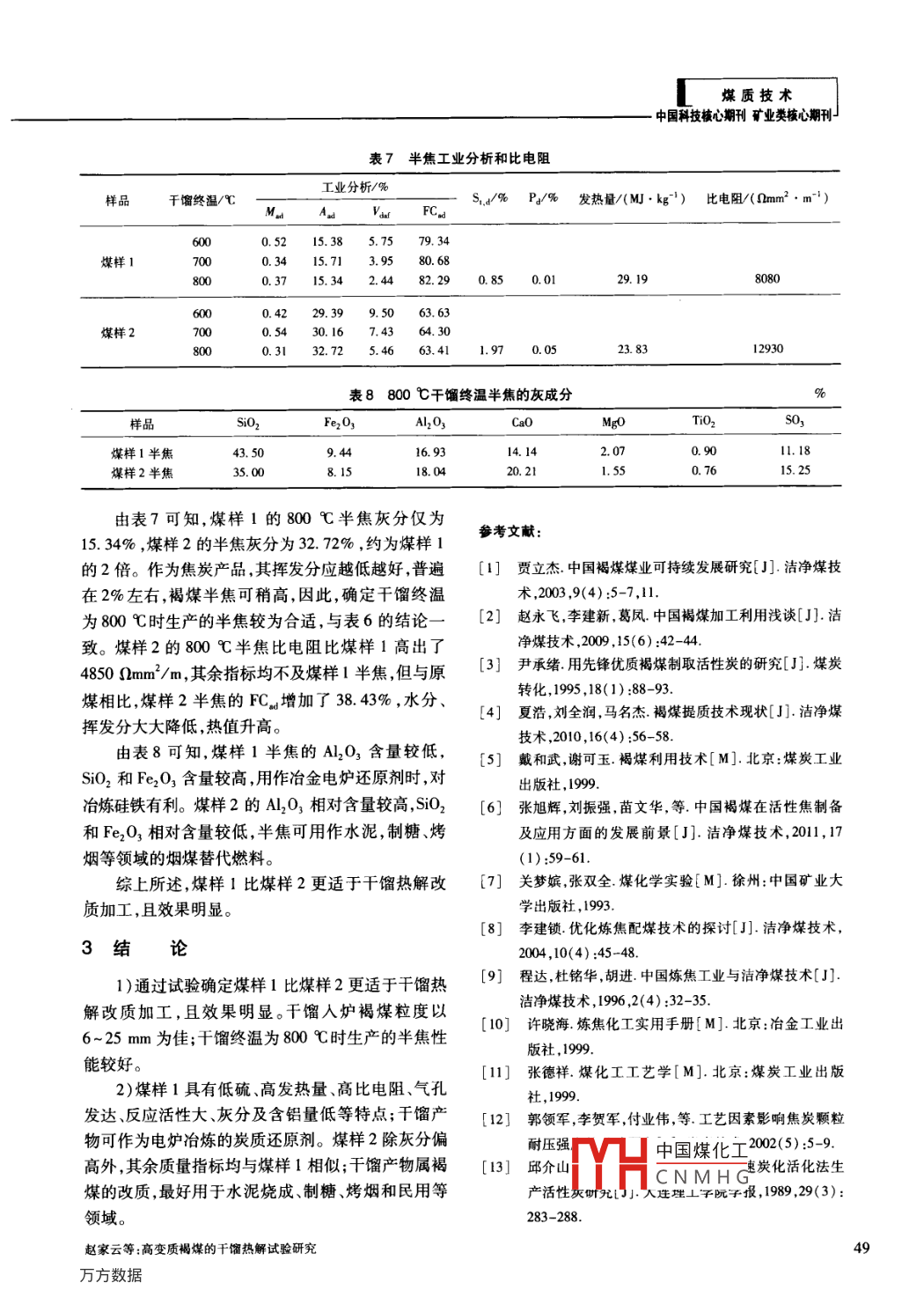 煤質(zhì)技術(shù)高變質(zhì)褐媒的干餾熱解試驗(yàn)研究趙家云,趙躍武(昆明煤炭科學(xué)研究所,云南昆明650041)摘要:分析了云南2種高變質(zhì)褐煤的基本性質(zhì),確定干餾入爐褐煤粒度為6~25mm。采用外熱式干餾工藝,對(duì)試驗(yàn)褐煤進(jìn)行熱解改質(zhì)加工研究。結(jié)果表明:煤樣1和煤樣2半焦、煤氣、焦油和熱解水的平均產(chǎn)率分別為4942%,51.38%;13.20%,15.36%;8.56%,8.10%;24.18%,23.27%。隨干餾終溫的升高,干煤氣產(chǎn)率增加較多,可燃成分CO和CH4降低,H2則反之,2個(gè)煤樣的煤氣熱值基本保持在14~15MJ/m3。干餾終溫為800℃時(shí),生產(chǎn)的半焦性能較好,且煤樣1的熱解性能指標(biāo)明顯優(yōu)于煤樣2。煤樣1具有低硫、高發(fā)熱量、高比電阻、氣孔發(fā)達(dá)、反應(yīng)活性大、灰分及含鋁量低等特點(diǎn),干餾產(chǎn)物可作為電爐冶煉的炭質(zhì)還原劑;煤樣2除灰分偏高外,其余質(zhì)量指標(biāo)均與煤樣1相似,其半焦可用作水泥、制糖、烤煙等領(lǐng)域的煙煤替代燃料。關(guān)鍵詞:高變質(zhì)褐煤;干餾;熱解;半焦;發(fā)熱量中圖分類號(hào):TD849;TQ52文獻(xiàn)標(biāo)識(shí)碼:A文章編號(hào):1006-6772(2013)03-0046-04Semi-coking experiment on high rank ligniteZHAO Jiayun, ZHAO YuewuKunming Institute of Coal Science, Kunming 650041, ChinaAbstract: Through semi-coking experiments, analyse the basic properties of two kinds of high rank lignite fromYunnan Province. Determine the particle size of lignite in distillation zone range from 6mm to 25 mm. Investigate thepyrolysis characteristics of lignite by extemal heating devolatilization. The results show that, for lignite sample l, theproductive rate of semi-coke, tar, gas and thermal-water reach up to 49. 42 percent, 13. 20 percent, 8 56 percent and24. 18 percent For lignite sample I, they are 51 38 percent, 15. 36 percent, 8. 10 percent, 23 27 percent. Thehigher the end devolatilization temperature, the greater the productive rate of dry gas and H2, while the yield of COand CH4 is just the opposite. The calorific value of gas of these two samples generally remain at 14 M]/m to 15 MI/mAt 800C coking temperature, the characteristics of semi-coke are comparatively good. The devolatilization index ofsample I is much better than that of sample I. The results show that, the semi-coke sample I has a series ofadvantages such as high calorific value, specific resistance, reactivity, well-developed porosity and low sulphur, ashcontent and aluminum-bearing, which can be used as carbon reductant for metallurgical electric furnace. The semicoke sample I has similar quality index as the sample I except higher ash content, and can be substituted forbituminite in the field of cement making, sugar refinery, flue-cured tobaccoKey words: high rank lignite devolatilization; pyrolysis; semi-coke; calorific value收稿日期:2012-12-21責(zé)任編輯:白婭娜a YH中國煤化工作者簡(jiǎn)介趙家云(1959—),男,云南昆明人,1986年畢業(yè)于中國礦業(yè)大學(xué)北京研究CNMHG主要從事煤化工研究工作。引用格式:趙家云趙躍武高變質(zhì)褥煤的干餾熱解試驗(yàn)研究[.潔凈煤技術(shù),2013,19(3):46-49潔凈煤技術(shù)》2013年第19卷第3期煤質(zhì)技術(shù)支核心期刊礦業(yè)類核心期刊0引言作為糖廠、水泥廠、烤煙房、民用等領(lǐng)域煙煤、無煙煤的代用品36。高變質(zhì)褐煤是指變質(zhì)程度較高,中國褐煤資源豐富,已探明儲(chǔ)量1303億t,占全水分相對(duì)較低的褐煤,用其生產(chǎn)半焦具有干餾熱效國煤炭?jī)?chǔ)量的13%。云南省褐煤儲(chǔ)量占全省煤率髙、煤料來源廣及價(jià)格低廉等優(yōu)勢(shì),因此,本文選炭?jī)?chǔ)量的77%,且大部分為露天開采3。目前褐煤用云南褐煤進(jìn)行干餾熱解試驗(yàn)研究。的利用途徑主要有發(fā)電、快速熱解、氣化、液化、干餾以及作為原料用于提取腐植酸、褐煤蠟和制作炭1原料煤的基本性質(zhì)質(zhì)吸附劑等4選用云南的2種高變質(zhì)褐煤(分別稱為煤樣1褐煤半焦是褐煤中溫干餾的產(chǎn)物,其活性好、和煤樣2)作為原料煤,煤樣的基本性質(zhì)見表1比電阻高、氣孔發(fā)達(dá),是冶金電爐的優(yōu)質(zhì)用焦,也可表表12種煤樣不同粒級(jí)的水分和灰分煤樣1煤樣2粒級(jí)/mm產(chǎn)率/%M/%Ad/%產(chǎn)率/%M/%A.%14.048.5816.1627.475~1315.6211.536.43合計(jì)00.0010.22100.14.67表22種煤樣工業(yè)分析和元素分析樣品煤樣121.1547.890.84煤樣221.132.92表32種煤樣熱值分析MJ/k3~5℃/min,干餾終溫分別以煤樣中心溫度達(dá)到樣品Qh600,700,800℃為準(zhǔn);入爐煤樣粒度為6~25mm,質(zhì)煤樣119.2720.6l量為750g。煤樣218.1615.9517.11焦油收集采用四段冷卻加棉過濾器,利用濕式由表1可知,隨著煤樣粒度的增加,煤樣1的灰流量計(jì)記錄干餾煤氣量。分明顯降低,煤樣2的灰分先降低后增加。由表22.2試驗(yàn)方法可知,2種煤樣的M1,Ma差別不大,但煤樣1的灰分將合格煤樣放入干餾反應(yīng)器中,通電加熱干餾明顯低于煤樣2,僅是煤樣2的42%。由表3可知,煤樣,按試驗(yàn)設(shè)定的加熱速度,用控溫儀調(diào)節(jié)加熱煤樣1的熱值高于煤樣2,與煤樣的工業(yè)分析結(jié)果電壓。在達(dá)到指定的干餾終溫后,固定給定電壓,相一致。恒溫至所需的干餾時(shí)間煤干餾熱解試驗(yàn)中,灰分將100%殘留在半焦成干餾過程中產(chǎn)生的熱解氣由干餾爐上部導(dǎo)出。品中,從而導(dǎo)致半焦灰分與原煤相比有所增加)。引出的氣體產(chǎn)物在通過空氣冷卻器時(shí),水分和大部因此,為避免半