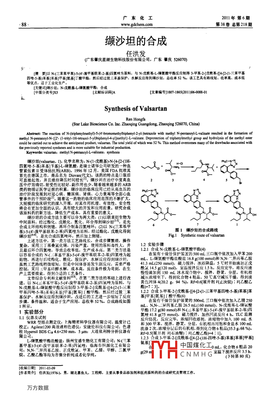 廣東化工2011年第6期..88.www.gdchem.com第38卷總第218期纈沙坦的合成任洪發(fā)(廣東肇慶星湖生物科技股份有限公司,廣東肇慶526070)%猜要]以N(三苯基甲,)-5-(4-澳甲基聯(lián)苯2_基)四氯唑為原料, 與N-戊?;?L~纈氨酸甲酯反應(yīng)制得3-甲基-2-[戊?;?[412-(1三苯甲基四唑-5-基)苯基]苯基]甲基]氨基]丁酸甲酯,然后經(jīng)過脫三萃基保護、水解反應(yīng)得到續(xù)沙坦,總收率52 %。該工藝具有路線短、收率商、成本低等優(yōu)點,適于工業(yè)化生產(chǎn)。[關(guān)鍵詞]纈沙坦: N-戊?;?L纈氨酸甲酯;合成[中圖分類號]X5“[文獻標識碼]A[文章編號1007-18620110 080Synthesis of Valsartan_Ren Hongfa(Star Lake Bioscience Co. Inc. Zhaoqing Guangdong, Zhaoqing 526070, China)Abstract: The reaction of N-(ripbenylmetbyl)-5-(4-bromometbylbiplpayl-2-y-)tetrazole with methyl N-pentanoyl-L-valinate resulted in the formation ofmetbyl N-pentanoyl-N- {[2- (-trity-1H-tetrazol-5.yI)biphenyl-4-yI]mnethy}-L-valinate. Deprotection of triphenylmethyl group and hydrolysis of the methyI estercould be caried out to achieve the anticipated product, valsartan. The total yield of which was 52 %, This method overcomes many of the drawbacks associated withthe previously reported syatheses and is more suitable for industrial production.Keywords: valsartan; metbyl N-pentanoyl-Lvalinate; syntbesis纈沙坦(valartan, 1), 化學(xué)名稱為: N-(1-戊?;?-[4-[2-(1H-PnC-N-N四氨唑_5_基)苯基]乍基]-L-纈氨酸,是瑞士諾華公司研發(fā)的一種血管緊張素II受體拮抗劑(ARB)。1996年12月,美國FDA批準其首先在德國上市,商品名為Diovan(代文)。該藥的特點是口服后可直接起效,并且維持降壓時間較長”]。纈沙坦在治療中度高血壓中療效確切,耐受性比較好,副作用也少。隨著越來越多的ARB類藥物循證醫(yī)學(xué)證據(jù)的積累,纈沙坦的臨床應(yīng)用已經(jīng)從高血壓的治療階段發(fā)展到對冠心病、糖尿病、腎病、心力衰竭等全面心血的臨床應(yīng)管事件的千預(yù)階段隨有這一藥物的臨床應(yīng)用范圍不斷擴大,,大規(guī)模的臨床研究的深入開展,對其作用機理、有效性、安全性將會有更加全面的認識,具有較大的開發(fā)和應(yīng)用前景。研究合成該原料藥的新方法,降低生產(chǎn)成本,具有重要的意義。纈沙坦的合成方法 主要可以分為兩大類: ()以聯(lián)苯衍生物為中間原料,經(jīng)過酯化、戊酰化、氫化、環(huán)合得到纈沙坦51,是先合成主環(huán)結(jié)構(gòu)和側(cè)鏈,再環(huán)合制備四氮唑環(huán): (2)以 N-(三萃基甲基)-5-(4"-溴甲基聯(lián)苯-2-基)四氮唑為原料,經(jīng)過酯化、戊?;玫綀D1纈沙坦的合成路線纈沙地1681,是先合成四氮唑環(huán),然后加上側(cè)鏈。Fig.1 Syntbetic route of valsartan上述方法中,第一類方法工藝路線長,合成步驟繁瑣,操作1.2實驗步驟復(fù)雜,采用三丁基疊氮化錫,污染嚴重,使用的原料毒性大,并1.2.1合成N-戊酰基_L_纈氨酸甲酯(4)且最后環(huán)合四氮唑,導(dǎo)致總收率低,生產(chǎn)成本高。第一類方法是以容易合成的N-( :苯基甲基)-5-(4-澳甲基聯(lián)苯-2-基)四氮唑為起在裝有十燥管保護裝置的500mL三口瓶中依次加入甲苯200始物,再進行后續(xù)酯化、?;摫Wo,水解反應(yīng)得到纈沙坦,mL、L_纈氨酸甲酯鹽酸鹽16.8 g(100 mmol)和N,N- -.異丙基厶胺雖然工藝路線稍微縮短,但是中間體容易發(fā)生副反應(yīng),需要嚴格41.3 mL(250 mmol),磁力攪拌,冰浴降溫,5 C時開始滴加正戊控制,采用中基硅醇水解,成本高,反應(yīng)條件極為苛刻,在生酰氯14.5 g(120 mol),室溫攪拌反應(yīng)1.5 h.反應(yīng)完畢,將反應(yīng)液產(chǎn)上需要摸索,得到合適的工藝條慢沒滴加到150 mL冰水混合物中,攪拌,靜置,分層。有機相文章綜合專利和文獻資料(6-8,在第-.類方法的某礎(chǔ)上進行改減壓濃縮至下,得到化合物4粗品。50 C真空減壓干燥,得到淡以N-(三苯基甲基)-5-(4-溴甲基聯(lián)苯-2黃色固體4(20.2 g. 94 %)。Rf-0.6[展開劑 V(正庚烷): V(乙酸乙進,以N(二本基中基)-5-(4-誤中基聯(lián)本-2-)0貿(mào)峰為原料,N-戊?;?L-纈氨酸甲酯反應(yīng)制得3-甲基-2-[儀酰基1[4-12-(1-三苯1.2.2 合成3-甲基-2-[戊?;?[-[2-(1-三苯甲基四唑_5_基)苯基]苯酯)=7: 3].甲基四唑_5~基)苯基]笨基]甲基]氨期] J酸甲酯,然后經(jīng)過脫二苯基保護、水解反應(yīng)得到纈沙坦。改進后的工藝進一步縮短了反應(yīng)基]甲基]氨]」酸中酯(6)步驟,條件溫和,適合于生產(chǎn)應(yīng)用,總收率52 %。合成路線如圖在在工樓管保護站在裝有干燥管保護裝置的500mL三口瓶中依次加入乙腈2501所示。ml. N,N- 二并丙基乙胺26.5 mL(160 mmol)、N-戊酰某-L纈氨酸甲酯17.2 g(80 mmol)和N(三米基甲基)-5-(4-溴甲基聯(lián)笨-2-基)四1實驗部分氮唑41.8 g(75 mmo),磁力攪拌,加熱回流反應(yīng)4h. TLC監(jiān)測1.1 儀器及試劑WRR型熔點測定儀:上海精密科學(xué)儀器有限公司,溫度計已反應(yīng)情況,反應(yīng)完畢,濃縮網(wǎng)收溶劑,濃縮物中加入100 mL水和300甲苯,攪拌,靜置,分層,有機相再用飽和食鹽水100 mL校正; Agilent1200 高效液相色譜儀:安捷科技有限公洗滌2次,濃縮分層后的有機相,得到化合物6粗品(35.3 g, 68 %)。柱Hypersil BDS CIs 4.6*250 mm, 5 um:大道Rf=0.5[展開劑V石油醚) : V(C酸乙酯)=4: ].L.獺氨酸甲酯熱酸鹽: 揚州寶盛牛物化工有限公司N(三苯1.2.3 合成3-中基-2-[戊酰基-[4-[2-(1H-四唑5-基)苯基]苯基]甲基]基甲基)-5-<(4-溴甲基聯(lián)苯-2-基)四氨唑:臨海市恒源化工有限公氨基]中國煤化工oml,化合物6粗