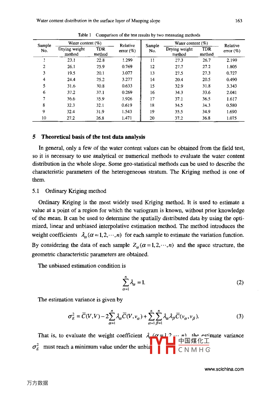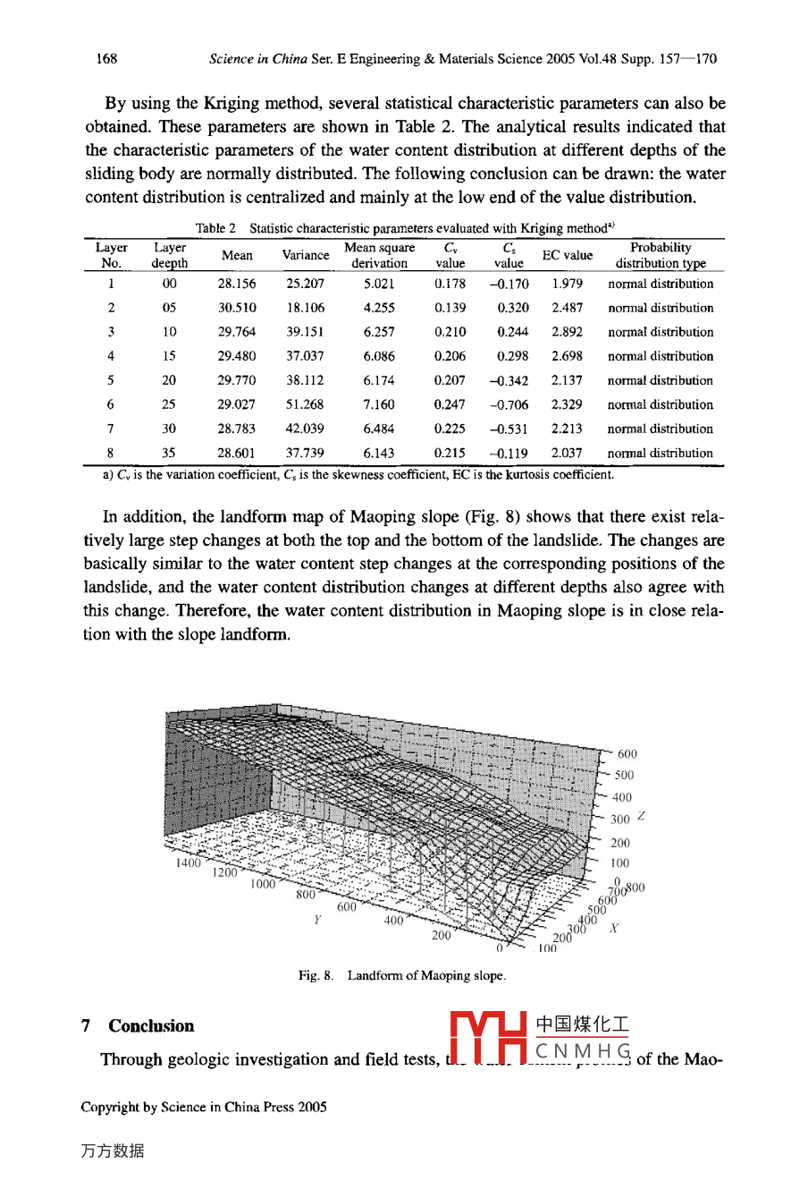 Science in China Ser. E Engineering & Materials Science 2005 Vol.48 Supp. 157- -170157Water content distribution in the surface layerof Maoping slopeLIU Yuewu, CHEN Huixin, LIU Qingquan, GONG Xin, ZHANG Dawei& L LianxiangDivision of Engineering Science, Institute of Mechanics, Chinese Academy of Sciences, Beiing 100080,ChinaCorrespondence should be addressed to Liu Yuewu (email: lywu @ imech.ac.cn)Received July 1, 2004; accepted November 9, 2004Abstract The water content distribution in the surface layer of Maoping slope has beenstudied by testing the water content at 31 control sites. The water content profiles at thesesites have also been determined. The water content distributions at different segmentshave been obtained by using the Kriging method of geostatistics. By comparing the watercontent distributions with the landform of the slope, it was shown that the water content isclosely dependent on the landform of the slope. The water content distribution in thesurface layer provided a fundamental basis for landslide predication and treatment.Keywords: landslide, water content, in situ test, Kriging method, geostatistics.DOI: 10.1360/04zze191 IntroductionPre-determination of the water content distribution of a landslide is necessary for cal-culating the landslide volume weight and judging the position of weak intercalary stratain the landslide. It is significant for further investigation of the landslide mechanism, theprediction of occurrence and the control of landslidest- 31. In recent decades, remarkableadvances in water content testing techniques for individual points and local average havebeen achieved along with considerable progress in automatic measurement techni-ques'[4-91Generally, there are three kinds of water content determination methods: (i)Field point measurement methods: these methods include the direct testing method, dry-ing weighing method, time domain reflectometery method, neutron radiation and otherindirect testing methods. The advantage of the field point measurement method is thatthe results possess relatively high precision. The disadvantage is that either the testingsample is small or much tiresome works needs to be done to define the water content fora relatively large region. (ii) Telemetry methods: these mathnds ran he Hivided into ac-tive and passive microwave measuring techniqu中國煤化工; sensing andradar testing methods. Their advantage is that thYHCNMHGover1-1000.Copyright by Science in China Press 2005158Science in China Ser. E Engineering & Materials Science 2005 Vo1.48 Supp. 157- -170km2. However, only the average water content of the whole region can be determined bythese methods. (ii) Numerical simulation methodst0- 13): these methods are based on thegeological and mechanical parameters of the slope layers. The methods partly depend onthe test results of the above two methods, so they are only an evaluation method and donot belong to the range of field tests. There exists a range (about 0.1一10 km) in whichit is difficult to obtain in situ testing results by the first and second methods mentionedabove. It was indeed within this scope where numerous landslides and other geologicalhazards happened. How to determine the water content in this scope is one of the hottopicsl14- 22 in agnicultural engineering, hydraulic engineering and hydrologic geology. Itis also one of the issues far from being resolved, including how to deduce the watercontent at untested points and the space distribution of water content based on the datafrom the tested points.Maoping slope was selected to assess the field test and to evaluate the method of wa-ter content distribution. Through more than two years of geological investigation andfield tests, 31 test sites were selected to test the water content in the surface layers byusing the drying weight and direct measurement methods. The Kriging geostatisticsmethod and other analytical methods were employed to determine the water content dis-tributions in the surface layer of Maoping slope based on the in situ tests. The watercontent distribution in the intermediate range has been obtained by combining the fieldtests and numerical analysis, and it provides the basic data for the stability analysis ofMaoping landslide.2 General geography and landform of Maoping slopeMaoping slope is located on the left bank of the Qingjiang River, 66 km above theGeheyan hydropower station and 25 km below the Shuibuya hydropower station. Ma-oping slope is the largest ancient landslide in the Geheyan Reservoir region, with alength of about 1600 m, a maximum width of 600 m, a thickness of 8- -86 m and a totalvolume of about 2.350x10' m'. Fig. 1 shows the profile and the geologic sketch of Ma-oping landslide in a birds-eye view. If the sliding body goes down at high speed, theQingjiang River would be jammed, and the normal operation of the two hydropowerstations would be affected. Additionally, Maoping slope is an ancient stack on bedrock,and this kind of slope is widely distributed within. Three Gorges Reservoir region. TheGeheyan Reservoir has been operating for more than ten years and its operational modeis similar to that of the Three Gorges reservoir. Hence, further study of the Maopinglandslide will be valuable for the evaluation and control of landslides in the ThreeGorges reservoir area.The early investigations suggested that Maoping slope is relatively stable but that lo-cal collapse or local sliding may occur in the leading edge near the Qingjiang River afterwater storage. The operation of the Geheyan Res中國煤化工j the maximumwater level was reached in the next year. SinceYHC N M H GMaoping slopeCopyright by Science in China Press 2005Water content distribution in the surface layer of Maoping slope159has been monitored by the Changjiang Water Conservancy Committee.241.The moni-toring data indicated that the surface deformation was very small from 1993 to 1995, butthe deformation velocity subsequently increased. Up to 2001, the m