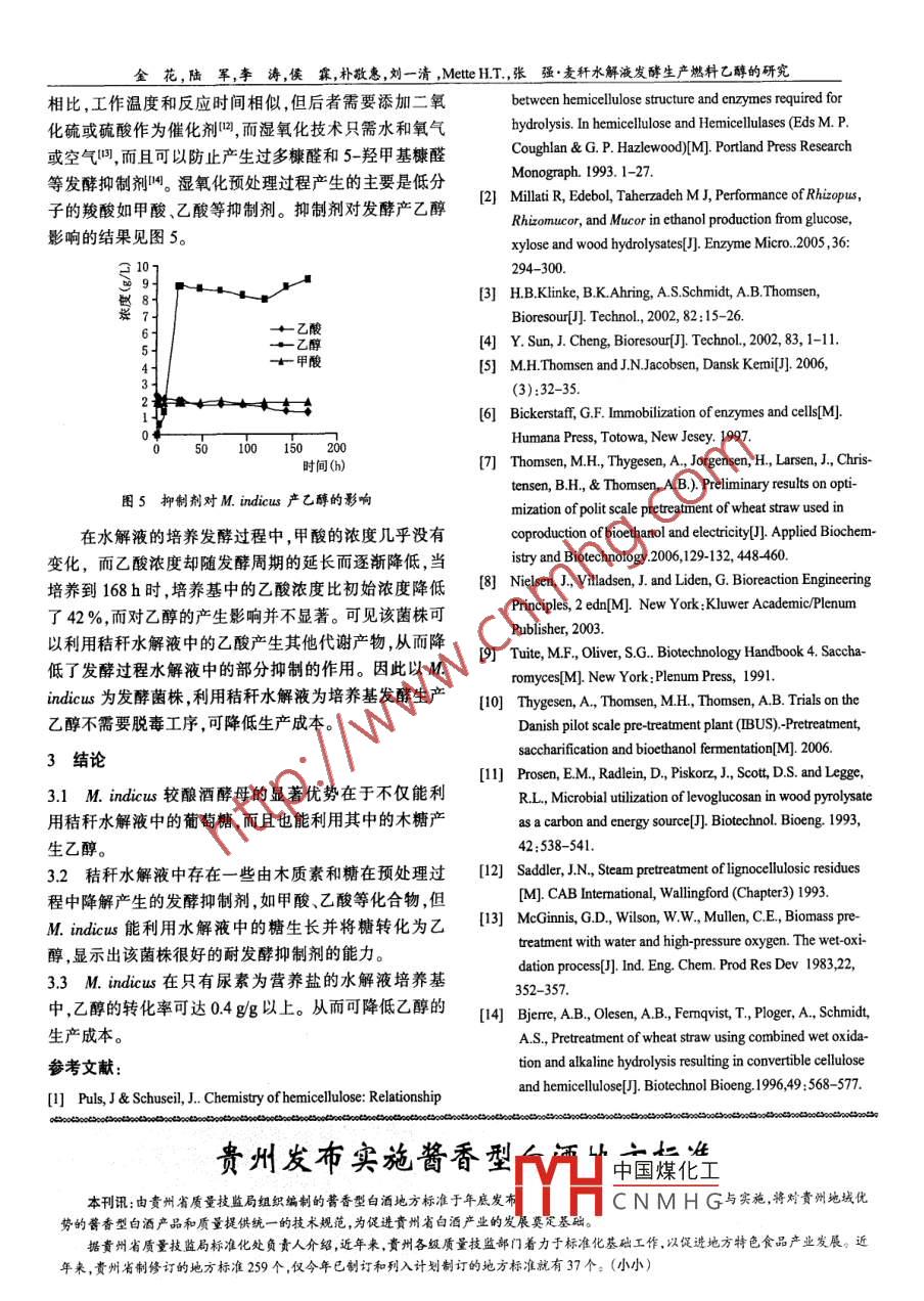 釀酒科技2007年第12期(總第162期)· LIQUOR- MAKING SCIENCE& TECHNOLOGY2007No.12(To.162)麥稈水解液發(fā)酵生產(chǎn)燃料乙醇的研究金花',陸軍,李濤',侯霖',樸敬惠’,劉一清1, Mette h.t.,張強3(1.吉林省輕工業(yè)設(shè)計研究院,吉林長春130021;2. Risoe National Laboratory, Technical University ofDenmark;3長春理工大學(xué)生命科學(xué)技術(shù)學(xué)院,吉林長春130022)摘要:對腐生真菌 Mucor indicus在濕氧化預(yù)處理的小麥秸稈水解液培養(yǎng)基中的生長及發(fā)酵產(chǎn)生酒精的性能進行了研究。結(jié)果表明,在厭氧條件下,乙醇對總糖的轉(zhuǎn)化率和菌體生物量分別達到了037gg和0.12gg;好氧條件下,乙醇對總糖的轉(zhuǎn)化率和菌體生物量分別達到0.33g和024gg;該菌株對水解液中發(fā)酵抑制劑甲酸、乙酸等有較強的耐受能力。關(guān)鍵詞:微生物;腐生真菌 Mucor indicus;小麥秸稈;發(fā)酵;乙醇中圖分類號:Q93-3;TS2622;TS2614文獻標(biāo)識碼:A文章編號:1001-9286(2007)12-0025-03Study on Ethanol Production by Wheat Straw HydrolysateJIN Hua, LU Jun, LI Tao, HOU Lin', PIAO Jing-hui, LIU Yi-qing, Mette H T: 2 and ZHANG Qiang'(1Jilin Province Light Industry Design and Research Institute, Changchun, Jilin 130021; 2. Risoe National Laboratory, Technical Universityof Denmark; 3. Life Science and Technology College of Changchun Science and Technology University, Changchun, Jilin 130022, China)Abstract: The characters including the growth and ethanol-producing performance of zygomycete fungus Mucor indicus inwheat straw hydrolysate were investigated. The results indicated that the ethanol yield and the biomass yield of total con-sumed sugars reached 0.37g/g and 0.12 g/g respectively under anaerobic conditions, whereas 0.33 g/g and 0. 24 g/g underaerobic conditions, and the strain showed better tolerance of the inhibitors such as acetic acid and methyl acid produced inpretreatment processKey words: microbes; zygomycete fungus Mucor indicus; wheat straw; fermentation; ethanol乙醇作為燃料越來越受到人們的關(guān)注。目前生產(chǎn)乙1材料與方法醇的原料主要是含淀粉質(zhì)的糧食及糖類作物,不僅生產(chǎn)1.1菌株成本高,而且長久以糧食作物生產(chǎn)燃料乙醇,必將給人M. indicus菌株由 Culture Collection University of類的糧食安全帶來威脅。因此以地球上豐富的可再生資 Goteborg( Gothenburg, Sweden)提供。源如木材、農(nóng)作物的秸稈等木質(zhì)纖維原料生產(chǎn)燃料乙醇12原料近年來成為世界各國關(guān)注及研究的前沿課題采用濕氧化預(yù)處理的小麥秸稈水解液。木質(zhì)纖維原料含有70%以上的碳水化合物,經(jīng)過13酶制劑預(yù)處理水解即可產(chǎn)生供微生物菌體利用的單糖,經(jīng)微生Cellubrix1.5L(87FPU/mL)由Novo、 nordisk提物發(fā)酵可生產(chǎn)乙醉纖維質(zhì)原料的水解液中不僅有供。纖維素降解產(chǎn)生的大碳糖(主要是葡萄糖),還有半纖維14原料分析素降解產(chǎn)生的五碳糖(主要是木糖)。普通的釀酒酵母原料及預(yù)處理后的固體纖維部分采用強酸水解法s. cerevisiae只能利用葡萄糖產(chǎn)生乙醇,不能利用木糖,測定其中的各碳水化合物的含量;液體部分采用弱酸水因此原料的利用率不高。而腐生真菌M. indicus具有很解法測其中糖的含量。好的代謝葡萄糖和木糖的能力習(xí)。本文主要以小麥秸稈的水解液為原料,對M.indi中國煤化工( FPU/mL)來表示cus菌株生產(chǎn)乙醇的性能進行了研究。CNMHG基金項目:第十四屆中丹政府間科技合作項目( Danida10062-2)。收稿日期:2007-1009作者簡介:金花(1968-),女,碩土,高級工程師,主要從事生物質(zhì)能源的研發(fā)工作,發(fā)表學(xué)術(shù)論文數(shù)篇。25釀酒科技2007年第12期(總第162期)· LIQUOR- MAKING SCIENCE& TECHNOLOGY2007N200162)1.6菌體生物量的測定好氧條件下,培養(yǎng)基中的木糖消耗了99%以上,而在厭發(fā)酵液在4000rmin下離心10min,水洗,再離氧條件下,分別只消耗了純培養(yǎng)基和水解液中19%和心,105℃千燥24h。以單位耗糖產(chǎn)生的菌體生物量來36%的木糖??梢?菌體代謝木糖的過程是好氧過程。純木糖培養(yǎng)基中,乙醇的轉(zhuǎn)化率較低,是由于菌體消耗的17乙醇及殘?zhí)堑臏y定木糖并非全部轉(zhuǎn)化為乙醇,而是產(chǎn)生了木糖醇等中間代采用高效液相色譜(HPLC)法分析謝產(chǎn)物。結(jié)果與分析22不同營養(yǎng)鹽對產(chǎn)乙醇能力的影響以秸稈生產(chǎn)乙醇的過程中,降低乙醇的生產(chǎn)成本至21不同培養(yǎng)基對茵體生物量及乙醇轉(zhuǎn)化率的影響關(guān)重要,而添加過多的營養(yǎng)鹽對菌體的生長及乙醇的產(chǎn)在好氧和厭氧條件下,利用秸稈水解液培養(yǎng)M.in-率有促進作用,但同時會增加乙醇的生產(chǎn)成本。生產(chǎn)乙dcw,同時以純葡萄糖和木糖為培養(yǎng)基作對比,以考察醇過程中,碳源和氮源是兩個重要的影響因素。因此添該菌株在水解液中菌體生物量的積累及乙醇的轉(zhuǎn)化率,加不同的營養(yǎng)鹽濃度及不同的氮源,以觀其對乙醇產(chǎn)生結(jié)果見圖1和圖2。的影響。結(jié)果見圖3和圖4。0.45■葡萄糖如0.40.4811100%25% aUrea日木糖0.35904650%1mos口葡萄糖+木糖水解產(chǎn)物250.20.05合成培養(yǎng)基水解產(chǎn)物0乙醇量培養(yǎng)基圖1厭氧條件下菌體生物量及乙醇轉(zhuǎn)化率圖3厭氧條件下不同營養(yǎng)鹽對產(chǎn)乙醇能力的影0.45■葡萄糖0.51100%025% D Urea≥0.4目木糖■50%no0.35口葡萄糖+木糖0.3國水解產(chǎn)物0.25白N0.200.05合成培養(yǎng)