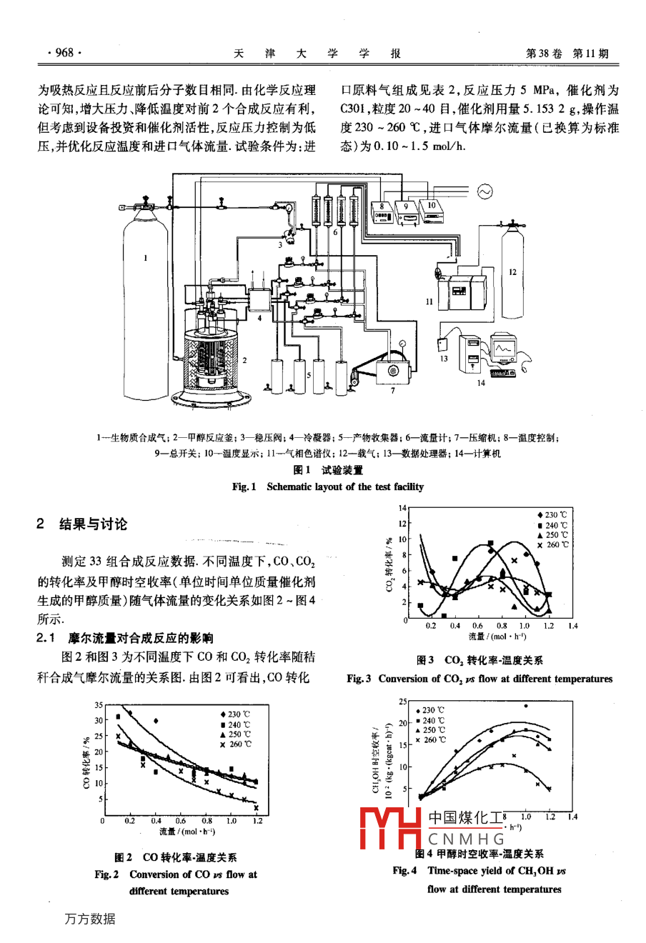 第38卷第11期天津大學(xué)學(xué)報(bào)Vol 38 No lI005年1l月Journal of Tianjin UniversityNov.2005秸稈燃?xì)獯呋铣杉状技夹g(shù)朱靈峰!2,梁庚白,朱金梭3,張百良,劉德華2,雒廷亮3,劉國際(1華北水利水電學(xué)院環(huán)境工程系,鄭州450008;2.清華大學(xué)化工系,北京10004;3.中國石油化工股份有限公司河南油田分公司第二采油廠,南陽473400;4.河南農(nóng)業(yè)大學(xué)機(jī)電工程學(xué)院,鄭州45000;:5.鄭州大學(xué)化工學(xué)院,鄭州450002)摘要:生物質(zhì)能是一種可再生能源,為了實(shí)現(xiàn)秸稈類生物質(zhì)合成燃料甲醇的工業(yè)轉(zhuǎn)化,有效利用生物質(zhì)能,對下吸式固定床氣化爐產(chǎn)生的低熱值玉米秸稈燃?xì)膺M(jìn)行除氧、分解焦油和配氫等純化試驗(yàn),制備岀合威甲醇的優(yōu)質(zhì)秸稈合成氣,在直流流動等溫積分反應(yīng)器中,使用國產(chǎn)C301鋼基催化劑,催化劑粒度為20-40目(0.833m×0.351m),在5MPa反應(yīng)壓力下,對玉米秸稈合成氣進(jìn)行催化合成甲醇試驗(yàn)研究,獲得33套試驗(yàn)數(shù)據(jù).試驗(yàn)結(jié)果表明低熱值秸稈燃?xì)馔ㄟ^適當(dāng)處理,可直接合成甲醇,合成反應(yīng)的造宜溫度為230~250℃,適宜流量為0.8~I.0molh,較佳的甲醇時(shí)空收率為0.24kg/( goat. h)關(guān)鍵詞:玉米秸稈;燃?xì)?合成氣;催化劑;甲酵;合成中圖分類號:S216文獻(xiàn)標(biāo)志碼:A文章編號:0493-2137(2005)11-0966-04Methanol Catalytic Synthesis from Cornstalk GasesZHU Ling-feng., LIANG Geng-bai', ZHU Jin-suo, ZHANG Bai-liangLIU De-hua, LOU Ting-liang, LIU Guo-ji(1. Department of Environmental Engineering, North China Institute of Water Conservancy and Hydroelectric PowerZhengzhou 450008, China; 2. Department of Chemical Engineering, Tsinghua University, Beijing 100084, China; 3. TheNo. 2 Oil Reeovery Company of Henan Oilfield Company, China Petroleum and Chemical Corporation, Nanyang 473400China; 4. School of Mechanical and Electronic Engineering, Henan Agricultural University, Zhengzhou 450002, China; 5Institute of Chemical Technology, Zhengzhou University, Zhengzhou 450002, China)Abstract: Biomass energy is a renewable resource. Experiments on purification technologies for the conversionof cornstalk biomass into the industrial product( synthesis of fuel methanol ) were made to produce cornstalk gaslow heat value)in the down-flow fixed by the gasifier. The experiment focused on the technical procedures fordeoxygenation, catalytic cracking of tar, hydrogenation, etc. Quality straw syngas was produced for methanolsynthesis. The catalysis of methanol synthesis for the production of cornstalk syngas was carried out in a tubularflow integral and isothermal reactor under the pressure of 5 MPa over Cu-based catalyst C301( particle size0.833 mm x0. 351 mm), a catalyst made in China. Thirty-three sets of test data were obtained. The test re-sults showed that the methanol could be synthesized directly from cornstalk gas( low heat value) through propertreatment. The proper operation temperature of the synthetic reaction was 230--250C; the suitable now ofsyngas was 0.8-1.0 mol/h; and the better methanol time-space yield was 0. 24 kg/( kgcat. h)Keywords: cornstalk; fuel gas; syngas; catalyst; methanol; synthesis近年來人們對生物質(zhì)日益增長的可持續(xù)利用的興H中國煤化工21世紀(jì)一種全球最大CNMHG收稿日期:2003-10-22;修回日期:2005-08-05基金項(xiàng)目:河南省教育科技攻關(guān)資助項(xiàng)日(2003150040)作者筒介:朱靈峰(1958-男,博土,教授, zhu yree@ yahoo.eom2005年1l月朱靈峰等:秸稈燃?xì)獯呋铣杉状技夹g(shù)的可再生潔凈能源為了有效地減少化石燃料造成的我國處于空白,為此有必要開展此項(xiàng)研究工作環(huán)境污染,減緩世界能源危機(jī),有必要建立大規(guī)模的現(xiàn)代生物能系統(tǒng)工程秸稈類生物質(zhì)燃?xì)獯呋铣杉状?試驗(yàn)部分研究是現(xiàn)代生物能系統(tǒng)工程之一發(fā)達(dá)國家早在10年就開展技術(shù)攻關(guān)研究1,現(xiàn)已有生物質(zhì)甲醇廠生1.1試驗(yàn)樣品產(chǎn)運(yùn)營我國是一個(gè)農(nóng)業(yè)大國,每年生產(chǎn)約6×103t農(nóng)1.1.1生物質(zhì)原料氣的制備作物秸稈,這些生物質(zhì)僅有少部分用于做飯、取暖試驗(yàn)所用原料為河南新鄭市當(dāng)年新收獲的玉米秸或低效率的電力生產(chǎn),大多數(shù)被廢棄或隨意焚燒,造成稈,秸稈粉碎至3cm左右,經(jīng)XFF-1000型生物質(zhì)氣化嚴(yán)重的資源浪費(fèi)和環(huán)境污染.生物質(zhì)合成甲醇技術(shù)在機(jī)組生產(chǎn)出低熱值牛物質(zhì)原料氣,其組成見表1表1生物質(zhì)氣分析數(shù)據(jù)Tab 1 Analysis data of biomass gas(o)(cO2)(H2)ecH)|eO2)(c2H)|e(C2H)(C2B2)e(2)低熱值焦油/3ng·皿15.8012.5001260140200.00.100505832461.2生物質(zhì)合成氣的制備1.3試驗(yàn)催化劑由于原料氣中含有少量使甲醇合成催化劑失活的選用C301國產(chǎn)銅基催化劑,先將圓柱形催化劑氧氣和焦油,所以試驗(yàn)前必須除去由表1可知,原料研磨成粒度為20~40目的顆粒,烘干,冷卻至室溫稱氣中H2含量太低,不能滿足合成要求的理論碳氡比.重,再將與其等體積同粒度的石英砂混合均勻在催化因此,在實(shí)驗(yàn)室中先將秸稈原料氣進(jìn)行脫氧、除焦、凈反應(yīng)管內(nèi)先裝入一定薄層的石英砂(20~40目),緩慢化和配氫等預(yù)處理焦油分解催化劑采用自行研制的加入催化劑,再依次加入石英砂(20-40目)、瓷環(huán)TR型催化劑,氧氣脫除劑為活性炭和絀銅絲,在623(16-20目)和細(xì)銅絲,并壓實(shí)催化劑的還原條