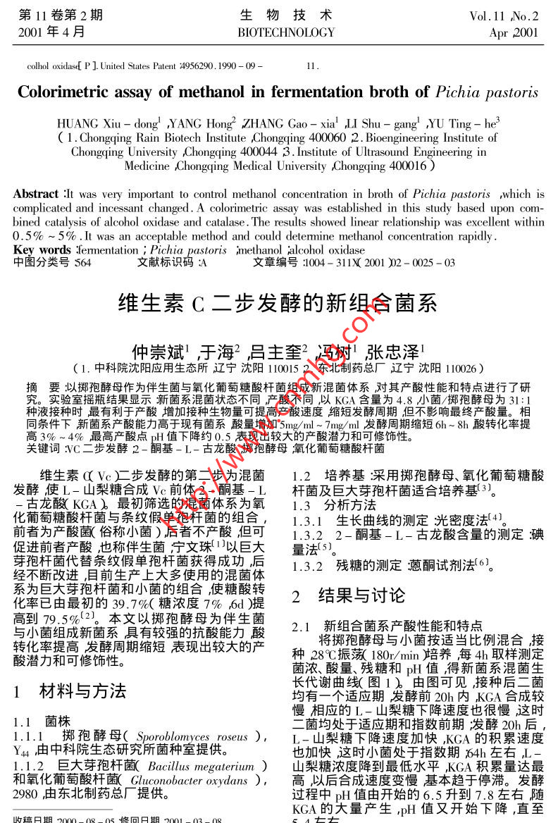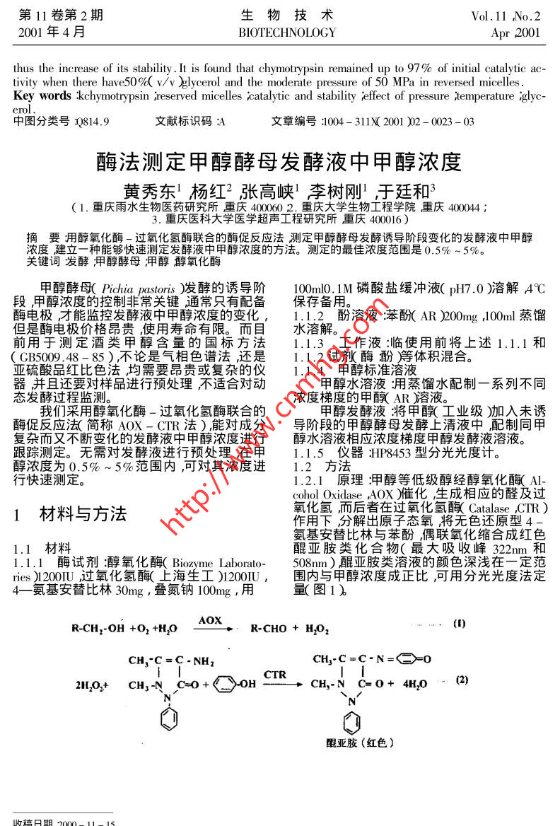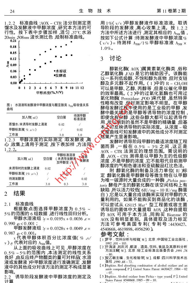 第11卷第2期生物技術Vol.11 ,No.22001年4月BIOTECHNOLOGYApr 2001thus the increase of its stability.It is found that chymotrypsin remained up to 97% of initial catalytic ac-tivity when there have50%( v/v )glycerol and the moderate pressure of 50 MPa in reversed micelles .Key words :kchymotrypsin ,reserved micelles icatalytic and stability iffeet of pressure itemperature iglyc-中圖分類號:Q814.9文獻標識碼:A文章編號:1004-311X 2001 )02 - 0023-03酶法測定甲醇酵母發(fā)酵液中甲醇濃度黃秀東'楊紅2張高峽'李樹剛' ,于廷和3( 1.重慶雨水生物醫(yī)藥研究所重慶4000602.重慶大學生物工程學院重慶400044 ;3.重慶醫(yī)科大學醫(yī)學超聲工程研究所重慶400016)摘要:用醇氧化酶-過氧化氫酶聯(lián)合的酶促反 應法測定甲醇酵母發(fā)酵誘導階段變化的發(fā)酵液中甲醇濃度建立一種能夠快速測定發(fā)酵液中甲醇濃度的方法。測定的最佳濃度范圍是0.5% ~ 5%。關鍵詞發(fā)酵;甲醇酵母;甲醇醇氧化酶甲醇酵母( Pichia pastoris )發(fā)酵的誘導階100ml0. 1M磷酸鹽緩沖液( pH7.0 )溶解4C段甲醇濃度的控制非常關鍵通常只有配備保存?zhèn)溆?。酶電極才能監(jiān)控發(fā)酵液中甲醇濃度的變化,1.1.2 酚溶液:苯酚( AR )200mg ,100ml蒸餾但是酶電極價格昂貴,使用壽命有限。而目水溶解。前用于測定酒類甲醇含量的國標方法1.1.3 工作液:臨使用前將上述1.1.1和( GB5009.48- 85 ),不論是氣相色譜法還是1.1.2試劑(酶酚)等體積混合。亞硫酸品紅比色法均需要昂貴或復雜的儀1.1.4 甲醇標準溶液器并且還要對樣品進行預處理不適合對動甲醇水溶液:用蒸餾水配制一系列不同態(tài)發(fā)酵過程監(jiān)測。濃度梯度的甲醇( AR溶液。我們采用醇氧化酶-過氧化氫酶聯(lián)合的甲醇發(fā)酵液將甲醇(工業(yè)級)加入未誘酶促反應法(簡稱AOX- CTR法) ,能對成分導階段的甲醇酵母發(fā)酵上清液中,配制同甲復雜而又不斷變化的發(fā)酵液中甲醇濃度進行醇水溶液相應濃度梯度甲醇發(fā)酵液溶液。跟蹤測定。無需對發(fā)酵液進行預處理,在甲1.1.5 儀器:HP8453型分光光度計。醇濃度為0.5% ~ 5%范圍內(nèi),可對其濃度進1.2 方法行快速測定。1.2.1 原理:甲醇等低級醇經(jīng)醇氧化酶( AI-cohol Oxidase AOX )催化,生成相應的醛及過1材料與方法氧化氫而后者在過氧化氫酶( Catalase .CTR )作用下,分解出原子態(tài)氧將無色還原型4-氨基安替比林與苯酚,偶聯(lián)氧化縮合成紅色1.1 材料醌亞胺類化合物(最大吸收峰322nm和1.1.1 酶試劑:醇氧化酶( Biozyme Laborato-508nm)_醌亞胺類溶液的顏色深淺在一定范ries )1200IU過氧化氫酶(_上海生工)12001U ,圍內(nèi)與甲醇濃度成正比,可用分光光度法定4一氨基安替比林30mg ,疊氮鈉100mg ,用量(圖1)AOX(1)R-CH2-OH +O; +H20R-CHO + H2OzCH,"C=C . NHzCH3-C=C-N=>=02H202+ CH,-N C=0+0HCTR. CH,-N G=0+ 4H,O (2)醌亞胺(紅色)收稿日期2000-11-15)男副研究員碩士從事生作者簡介黃秀車19-物技術研發(fā)五悄數(shù)據(jù)24生物技術第11卷第2期1.2.2標準曲線:A0X-CTR法分別測定蒸用1%(v/v)甲醇發(fā)酵液作標準溶液。取誘餾水及發(fā)酵液中甲醇濃度,研究本方法的可導階段的發(fā)酵液,離心收集上清。按1.2.2行性。按下表中步驟加樣,混勻,37C水浴方法中所述方法進行測定其相應的Aso值,20min 508nm波長測比色繪制標準曲線。按如下公式計算:待測發(fā)酵液中甲醇濃度%( v/v )=待測樣As08/1%甲醇標準液As08 x0.181.0%。0.150.123討論專0.09醇氧化酶( AOX )屬黃素氧化酶類,俗稱0.06●水溶液乙醇氧化酶,FAD是它的輔助因子。該酶能發(fā)酵液0.03以一系列低級醇、不飽和醇為底物但對支鏈0.00醇及多元醇不起作用。( 1 )中的R - CH2OH0 123456789101112可以是甲醇、乙醇、丙醇等,但是以催化甲醇甲醇濃度(%,VIN)的效率最高。( 2 )中的過氧化氫酶也可用過氧化物酶( Peroxidase ,POD )來代替,雖然特異圖1水溶液和發(fā)醇液中甲醇濃度 與醌亞胺類Asxg吸收值關系性略有改變,但對測定影響不明顯。在甲醇曲線酵母發(fā)酵過程中使用的是工業(yè)級的甲醇發(fā)加入物ml)空白管待測甲醇酵中最關鍵的是甲醇等誘導物的濃度控制,標準溶液即使含有雜醇,這些雜醇大都可以起誘導作用所以測到的雖然不是甲醇的精確量但基蒸餾水/未誘導時發(fā)醇上清液0.02本上可反映誘導物的實際濃度。從濃度-吸甲醇標準液% w/v)光度曲線可知發(fā)酵液中的其他成分不對測定工作液3.0. 1.2.3 甲醇濃度的實際測定:取發(fā)酵液離結果產(chǎn)生顯著影響。心收集上清用于測定按下表加樣,方法同發(fā)酵時誘導階段甲醇的最適濃度隨工程菌而異,一般在0.5%_ ~ 3%之間,這正是1.2.2。AOX-CTR法測定的理想范圍。需說明的甲醇標準溶液待測是,AOX-CTR測得是以甲醇為主的低級醇加入物ml )空白管( 未誘導發(fā)酵液加甲醇至1% )濃度不是甲醇的濃度,它不能取代目前測甲醇濃度的氣相色譜法和亞硫酸品紅比色法。未誘導時的發(fā)酵上清液0.02附醇氧化酶的制備及活力單位( I∪)標甲醇標準液1% w/v) /定醇氧化酶是甲醇酵母等微生物在以甲醇待測發(fā)醇液/為唯一碳源時大量合成的一種酶,Pichia pas-0.3toris.酵母產(chǎn)生的醇氧化酶在該空間結構上有缺陷所以活力較低( 6IU/mg~ 10 IU/mg酶蛋2.結果白),它是以大量合成該酶來實現(xiàn)對甲醇的大量利用的。如果不能購買到商品化的該酶,2.1標準 曲線可以嘗試從GS115 Mut+型工程菌或宿主菌根據(jù)散點圖選擇甲醇濃度為0.5% ~誘導后的菌體中大量提取AOX這種自提取5