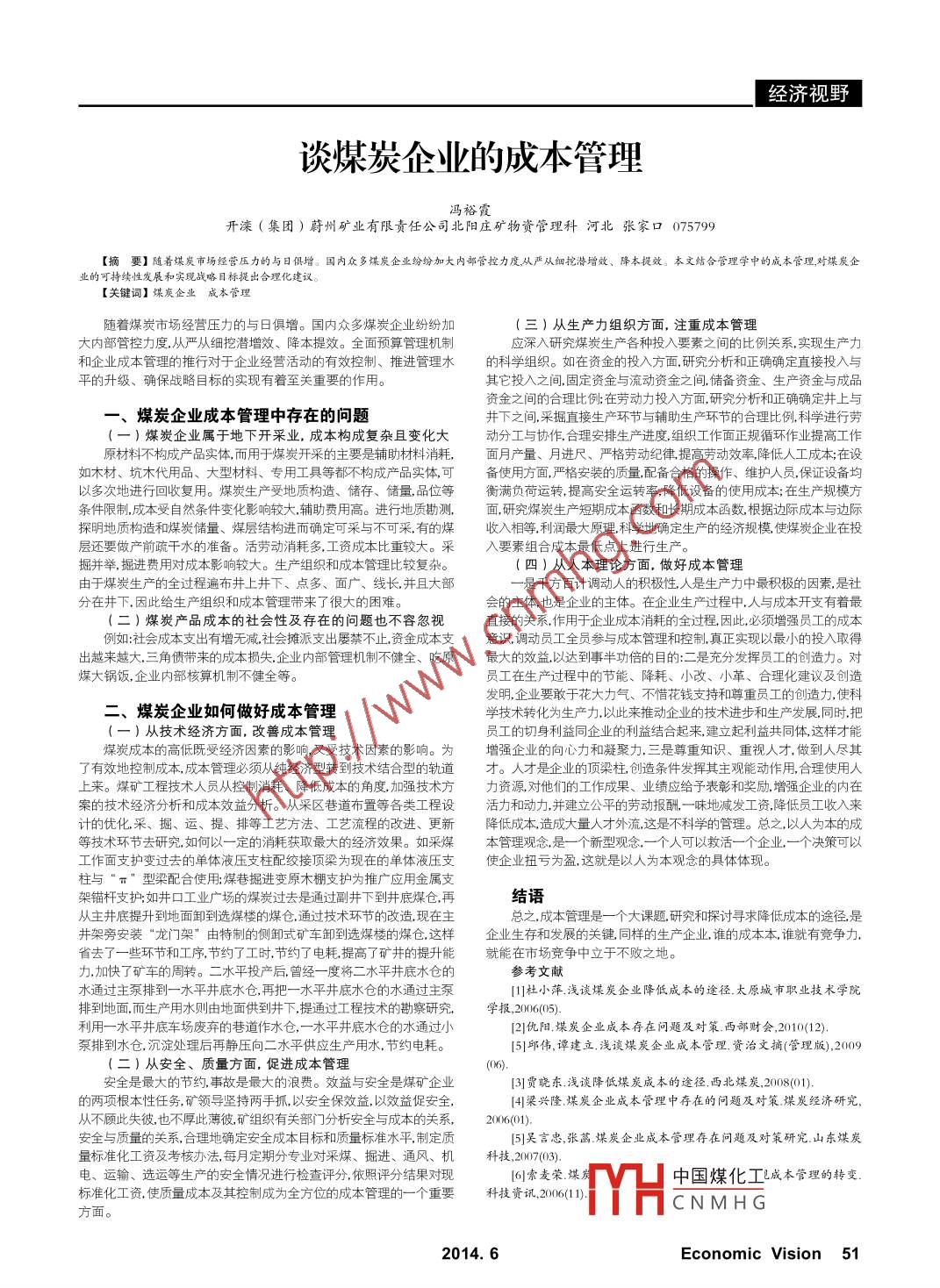 經(jīng)濟(jì)視野談煤炭企業(yè)的成本管理馮裕霞開(kāi)灤(集團(tuán))蔚州礦業(yè)有限責(zé)任公司北陽(yáng)莊礦物資管理科河北張家口075799[摘要] 隨著煤炭市場(chǎng)經(jīng)營(yíng)壓力的與日俱增。國(guó)內(nèi)眾多媒煤炭企業(yè)紛紛加大內(nèi)部管控力度從嚴(yán)從細(xì)挖潛增效、降本提效。本文結(jié)合管理學(xué)中的成本管理對(duì)煤炭企業(yè)的可持續(xù)性發(fā)展和實(shí)現(xiàn)戰(zhàn)略目標(biāo)提出合理化建議。[關(guān)鍵詞]煤炭企業(yè)成本管理隨著煤炭市場(chǎng)經(jīng)營(yíng)壓力的與日俱增。國(guó)內(nèi)眾多煤炭企業(yè)紛紛加.(三)從生產(chǎn)力組織方面,注重成本管理大內(nèi)部管控力度從嚴(yán)從細(xì)挖潛增效、降本提效。全面預(yù)算管理機(jī)制應(yīng)深入研究煤炭生產(chǎn)各種投入要素之間的比例關(guān)系,實(shí)現(xiàn)生產(chǎn)力和企業(yè)成本管理的推行對(duì)于企業(yè)經(jīng)營(yíng)活動(dòng)的有效控制、推進(jìn)管理水的科學(xué)組織。如在資金的投入方面,研究分析和正確確定直接投入與平的升級(jí)、確保戰(zhàn)略目標(biāo)的實(shí)現(xiàn)有著至關(guān)重要的作用。其它投入之間,固定資金與流動(dòng)資金之間,儲(chǔ)備資金、生產(chǎn)資金與成品資金之間的合理比例;在勞動(dòng)力投入方面,研究分析和正確確定井上與一、 煤炭企業(yè)成本管理中存在的問(wèn)題井下之間,采掘直接生產(chǎn)環(huán)節(jié)與輔助生產(chǎn)環(huán)節(jié)的合理比例,科學(xué)進(jìn)行勞(一) 煤炭企業(yè)屬于地下開(kāi)采業(yè),成本構(gòu)成復(fù)雜且變化大動(dòng)分工與協(xié)作。合理安排生產(chǎn)進(jìn)度組織工作面正規(guī)循環(huán)作業(yè)提高工作原材料不構(gòu)成產(chǎn)品實(shí)體,而用于煤炭開(kāi)采的主要是輔助材料消耗,面月產(chǎn)量、月進(jìn)尺、嚴(yán)格勞動(dòng)紀(jì)律,提高勞動(dòng)效率,降低人工成本;在設(shè)如木材、坑木代用品、大型材料、專用工具等都不構(gòu)成產(chǎn)品實(shí)體,可備使用方面,嚴(yán)格安裝的質(zhì)量,配備合格的操作、維護(hù)人員,保證設(shè)備均以多次地進(jìn)行回收復(fù)用。煤炭生產(chǎn)受地質(zhì)構(gòu)造、儲(chǔ)存、儲(chǔ)量,品位等衡 滿負(fù)荷運(yùn)轉(zhuǎn),提高安全運(yùn)轉(zhuǎn)率,降低設(shè)備的使用成本;在生產(chǎn)規(guī)模方條件限制,成本受自然條件變化影響較大輔助費(fèi)用高。進(jìn)行地質(zhì)勘測(cè),面,研究煤炭生產(chǎn)短期成本函數(shù)和長(zhǎng)期成本函數(shù),根據(jù)邊際成本與邊際探明地質(zhì)構(gòu)造和煤炭?jī)?chǔ)量、煤層結(jié)構(gòu)進(jìn)而確定可采與不可采有的煤收入相等,利潤(rùn)最大原理,科學(xué)地確定生產(chǎn)的經(jīng)濟(jì)規(guī)模使煤炭企業(yè)在投層還要做產(chǎn)前疏干水的準(zhǔn)備?;顒趧?dòng)消耗多。工資成本比重較大。采入要素組合成本最低點(diǎn)上進(jìn)行生產(chǎn)。掘并舉,掘進(jìn)費(fèi)用對(duì)成本影響較大。生產(chǎn)組織和成本管理比較復(fù)雜。(四)從人本理論方面,做好成本管理由于煤炭生產(chǎn)的全過(guò)程遍布井上井下、點(diǎn)多、面廣、線長(zhǎng).并且大部一是千方百計(jì)調(diào)動(dòng)人的積極性.人是生產(chǎn)力中最積極的因素,是社分在井下.因此給生產(chǎn)組織和成本管理帶來(lái)了很大的困難。會(huì)的主體.也是企業(yè)的主體。在企業(yè)生產(chǎn)過(guò)程中,人與成本開(kāi)支有著最(二)煤炭產(chǎn)品成本的社會(huì)性及存在的問(wèn)題也不容忽視直接的關(guān)系,作用于企業(yè)成本消耗的全過(guò)程,因此.必須增強(qiáng)員工的成本例如:社會(huì)成本支出有增無(wú)減社會(huì)攤派支出屢禁不止資金成本支意識(shí).調(diào)動(dòng)員工全員參與成本管理和控制.真正實(shí)現(xiàn)以最小的投入取得出越來(lái)越大,三角債帶來(lái)的成本損失,企業(yè)內(nèi)部管理機(jī)制不健全、吃原最大的效 益.以達(dá)到事半功倍的目的:二是充分發(fā)揮員工的創(chuàng)造力。對(duì)煤大鍋飯,企業(yè)內(nèi)部核算機(jī)制不健全等。員工在生產(chǎn)過(guò)程中的節(jié)能、降耗、小改、小革、合理化建議及創(chuàng)造發(fā)明,企業(yè)要敢于花大力氣、不惜花錢支持和尊重員工的創(chuàng)造力,使科二、煤炭企業(yè)如何做好成本管理學(xué)技術(shù)轉(zhuǎn)化為生產(chǎn)力.以此來(lái)推動(dòng)企業(yè)的技術(shù)進(jìn)步和生產(chǎn)發(fā)展,同時(shí),把(一)從技術(shù)經(jīng)濟(jì)方面,改善成本管理員工的切身利益同企業(yè)的利益結(jié)合起來(lái),建立起利益共同體,這樣才能煤炭成本的高低既受經(jīng)濟(jì)因素的影響,又受技術(shù)因素的影響。為增強(qiáng) 企業(yè)的向心力和凝聚力,三是尊重知識(shí)、重視人才,做到人盡其了有效地控制成本,成本管理必須從純經(jīng)濟(jì)型轉(zhuǎn)到技術(shù)結(jié)合型的軌道才。人才是企業(yè)的頂梁柱創(chuàng)造條件發(fā)揮其主觀能動(dòng)作用合理使用人上來(lái)。煤礦工程技術(shù)人員從控制消耗、降低成本的角度加強(qiáng)技術(shù)方力資源,對(duì)他們的工作成果、業(yè)績(jī)應(yīng)給予表彰和獎(jiǎng)勵(lì),增