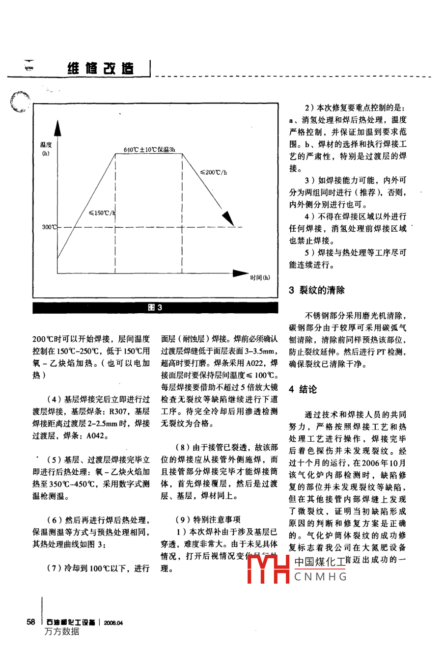 維修改籃氣化卿筒體裂紋的修復(fù)陶志遠張克鋒1王軍2盧攝和2蘇國來2(1山東華魯恒升化工股份有限公司山東德州253024(2山東德州德化裝備工程有限公司山東德州253024)【摘要】對氣化爐筒體裂紋的修復(fù),總結(jié)現(xiàn)場修復(fù)合特種材料的焊接工藝【關(guān)鍵詞】氣化爐裂紋焊接熱處理概述煤漿加壓氣化工藝是大氮肥的核心技術(shù),氣化爐則是氣化裝置的大型氮肥國產(chǎn)化裝置在山東核心設(shè)備,氣化爐的穩(wěn)定運行關(guān)華魯恒升化工股份有限公司建成系到大氮肥的穩(wěn)定運行。我公司并投產(chǎn),標志著我國已經(jīng)具備設(shè)有三臺氣化爐,從200年底開車至計、制造有自主知識產(chǎn)權(quán)的先進2005年約一年的時間,其中一臺氣成套設(shè)備,建設(shè)大型氮肥生產(chǎn)裝化爐液位計接管裂透,由于氣化置的能力,從此我國結(jié)束了大氮爐筒體材質(zhì)比較特殊,維修公司肥裝置全部依靠進口的時代。水以前從未焊接過該種材料。聯(lián)系設(shè)備制作單位,制作單位沒有給予支持,只有依靠自己。在處理前我們根據(jù)類似國產(chǎn)材料的經(jīng)驗針接置A向?qū)ΜF(xiàn)場情況制定了修復(fù)方案和焊克體基層漏點接工藝并咨詢相關(guān)專家,最后成功修復(fù)。裂紋1問題的發(fā)現(xiàn)殼體覆層裂紋氣化爐的主要參數(shù):設(shè)計壓力:69MPa;設(shè)計溫度:1400℃(燃燒室);操作壓力:65MPa;操作溫現(xiàn)場裂紋情況度:1380℃(燃燒室為氣化爐容積中國煤化工數(shù)冷室)m;操CO2、CO、HOCNMHG56迪■化工設(shè)畫|20804維修改造EI XIU GAI ZAOHS、N2;筒體規(guī)格:DN2800×862005年11月氣化爐B爐液位計下接管發(fā)生外漏,當時以為是氣孔或砂眼維修工打了個卡子在外面堵漏溫度待氣化爐運行到使用周期停爐處(℃)理。2005年12月22日該爐停爐常規(guī)檢修,在對泄漏接管內(nèi)部著色350℃-400℃±10℃處理時,發(fā)現(xiàn)該接管內(nèi)端面裂紋有300mm長,并且接管也已裂透。1保溫6小時斷電冷卻弁250℃開始焊接如圖1氣化爐筒體材質(zhì)為10℃/hSA387 GrlIcL2復(fù)合316L,該處接管設(shè)計為316L鍛件,在制作時制作單位用的是15CrMoⅡ,接管內(nèi)端面堆焊316L。從現(xiàn)場焊接質(zhì)量來分析,吋間(h)可能是由于焊接工藝執(zhí)行不利,焊接過渡層時由于基層金屬對過圖2渡層焊縫的稀釋作用使焊縫奧氏體組織中鉻、鎳元素被稀釋,焊縫后容易產(chǎn)生熱裂紋,要求預(yù)熱及行修復(fù)。中形成馬氏體組織;而且由于碳元緩冷,但這對復(fù)層材料的焊接又素的遷移,使奧氏體焊縫中的鉻是不利的。我們的維修公司雖然(1)根據(jù)缺陷情況,用角向磨形成碳化物,同樣惡化了該區(qū)域在當時已經(jīng)取得三類容器的制造光機仔細打磨去除裂紋,按原來的焊縫組織;汽化爐使用介質(zhì)存在資質(zhì),但還從未焊接過該種材料,坡口形狀內(nèi)外打磨到徹底去除缺應(yīng)力腐蝕元素,從各方面分析焊該缺陷的修復(fù)對我們來說相當困陷。并用滲透檢測(PT),直至缺接質(zhì)量差和應(yīng)力腐蝕是導(dǎo)致裂紋難。當裂紋被發(fā)現(xiàn)后,我們根據(jù)陷徹底消除。最后將打磨處修成產(chǎn)生的主要原因。l5CrMR的焊接工藝編制了合適的利于焊接的緩坡狀,使之平滑過焊接及熱處理工藝,同時我們立渡。2修復(fù)方案的制定即聯(lián)系設(shè)備制作單位,尋求技術(shù)支持,制作單位沒有給予我們合2)焊前預(yù)熱:由于當時氣溫氣化爐筒體材質(zhì)為理的建議。然后我們向有類似施較低所以焊前必須進行預(yù)熱,我A387Gr11CL2復(fù)合316L,工經(jīng)驗的兄弟單位鎮(zhèn)海煉化槍安們采用履帶式電加熱器將加熱部SA387 GrlICL2是一種耐熱合金鋼,公司求助,在得到該公司專家的位覆蓋,加熱區(qū)范圍為焊接區(qū)域資料介紹性能與5CmMR相當,焊肯定后,我們立即根據(jù)該工藝進以外至少soom1)預(yù)熱溫度曲線(如圖2):作者簡介2)加熱時測溫?zé)犭娕急仨毰c測溫點金屬可靠接觸,以免測溫陶志遠1995年畢業(yè)于石油大學(xué)化機專業(yè),現(xiàn)任山東華魯恒升化不準確。股份有限公司設(shè)備動力處壓力容器專業(yè)工程師。什H中國煤化工CNMHG部位金屬溫度達到200804石迪■化工設(shè)畫57“維值改籃」2)本次修復(fù)要重點控制的是消氫處理和焊后熱處理,溫度嚴格控制,并保證加溫到要求范溫度圍。b、焊材的選擇和執(zhí)行焊接工640℃±10℃保溫3h藝的嚴肅性,特別是過渡層的焊≤20℃/h接。3)如焊接能力可能,內(nèi)外可分為兩組同時進行(推薦),否則內(nèi)外側(cè)分別進行也可?!?50℃4)不得在焊接區(qū)域以外進行300℃任何焊接,消氫處理前焊接區(qū)域也禁止焊接。5)焊接與熱處理等工序盡可能連續(xù)進行時間(h)3裂紋的清除圖3不銹鋼部分采用磨光機清除,碳鋼部分由于較厚可采用碳弧氣200℃時可以開始焊接,層間溫度面層(耐蝕層)焊接。焊前必須確認刨淸除,清除前同樣預(yù)熱該部位,控制在150℃-250℃,低于150℃用過渡層焊縫低于面層表面3-35mm,防止裂紋延伸。然后進行P檢測氧一乙炔焰加熱。(也可以電加超高時要打磨。焊條采用A02,焊確保裂紋已清除干凈。熱)接面層時要保持層間溫度≤100℃每層焊接要借助不超過5倍放大鏡4結(jié)論(4)基層焊接完后立即進行過檢查無裂紋等缺陷繼續(xù)進行下道渡層焊接,基層焊條:R307,基層工序。待完全冷卻后用滲透