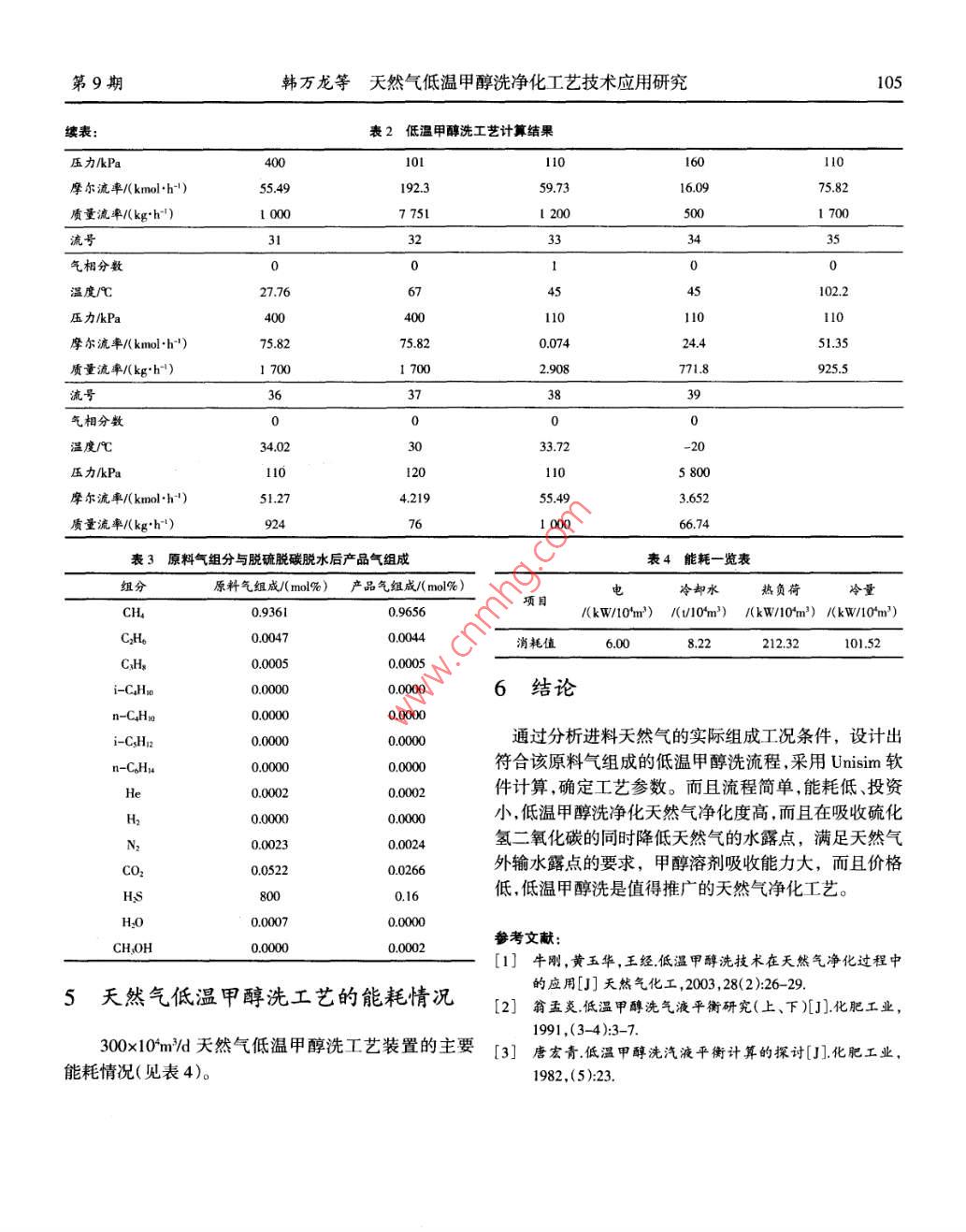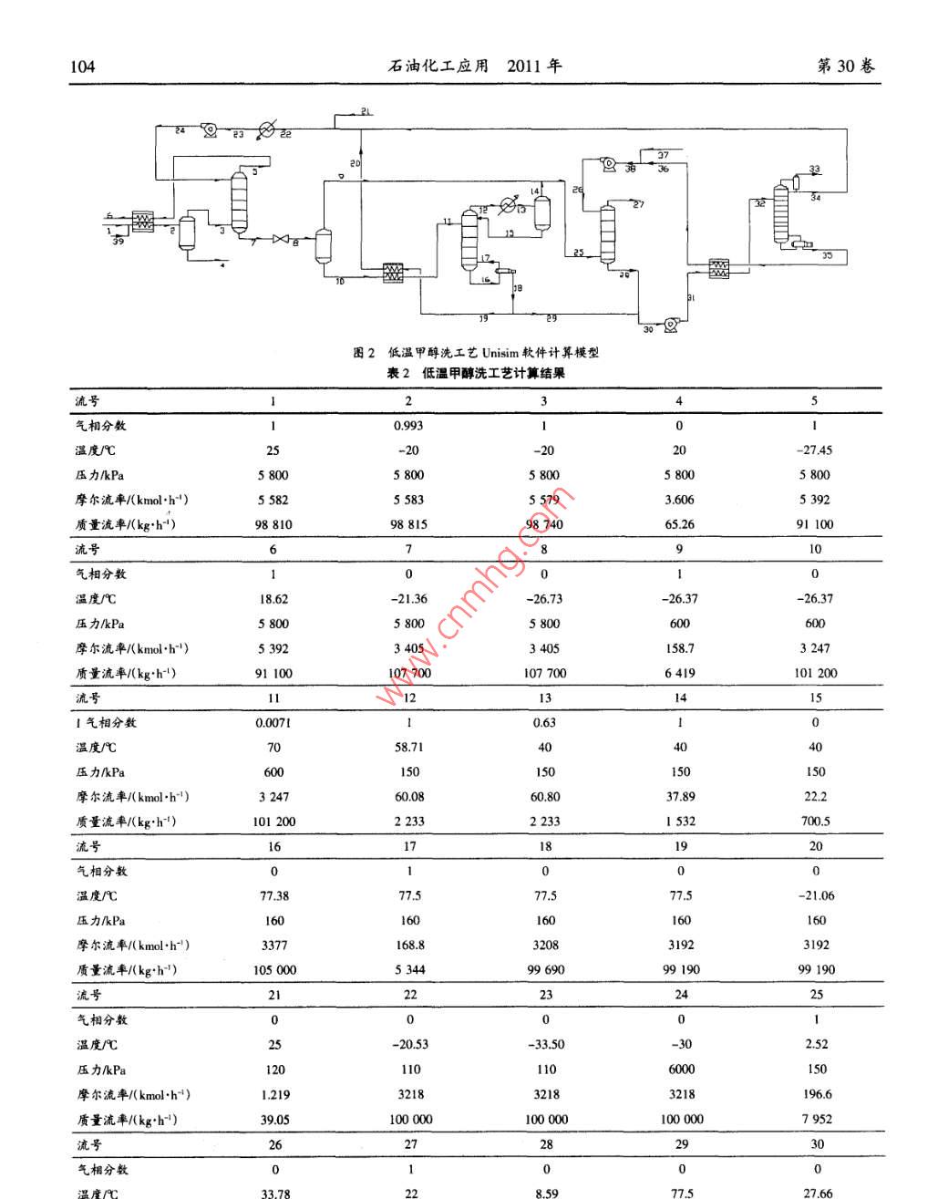 第30卷第9期石油化工應(yīng)Vol 30 No92011年9月PETROCHEMICAL INDUSTRY APPLICATIONSept. 2011天然氣低溫甲醇洗凈化工藝技術(shù)應(yīng)用研究韓萬(wàn)龍',范貴鑫2,李亞萍',王強(qiáng)2(1西安長(zhǎng)慶科技工程有限責(zé)任公司,陜西西安710021遼寧大唐國(guó)際阜新煤制天然氣有限責(zé)任公司,遼寧阜新123000摘要:根據(jù)低溫甲醇洗脫硫、脫碳的工藝在煤制氣凈化領(lǐng)域的應(yīng)用,將低溫甲醇洗工藝應(yīng)用于天然氣凈化工藝硏究,采用Uπisim軟件對(duì)300κlσ恤m天然氣凈化裝置釆用低溫甲醇洗工藝進(jìn)行了計(jì)算,用詳實(shí)的計(jì)算數(shù)據(jù)證明,低溫甲醇洗用于天然氣凈化裝置是可行的。關(guān)鍵詞:低溫甲醇洗;天然氣凈化中圖分類號(hào):TE64文獻(xiàn)標(biāo)識(shí)碼:A文章編號(hào):1673-5285(2011)09-010204天然氣凈化主要是指脫除天然氣中的H2S、CO2等甲醇吸收酸性氣體的氣液平衡關(guān)系符合亨利定酸性氣體和水份。氣體的凈化方法有氣液吸收、氣固相律,吸收劑的吸收容量隨酸性組分分壓的提高而增加,催化轉(zhuǎn)化、固體吸附、分子篩分離、膜分離等。但使用最溶液循環(huán)量與原料氣量及操作條件有關(guān)。操作壓力提廣泛的還是氣液吸收法,這些方法天然氣凈化方法常高,溫度降低,溶液循環(huán)量減少。常需要幾種工藝結(jié)合在一起才能將天然氣中的HS、低溫甲醇洗工藝主要有以下技術(shù)特點(diǎn)CO2和水份分工段的脫除出來(lái),工藝流程較為復(fù)雜,工(1)低溫甲醇洗工藝氣體凈化度高,選擇性好,凈藝設(shè)備較多,控制點(diǎn)較多,投資及運(yùn)行費(fèi)用較高。化氣中總硫可降至小于0.15mg/m3、CO2可被脫至低溫甲醇洗是指在一定的壓力和低溫下,使用甲319mg/m3;(2)甲醇溶劑對(duì)CO2和HS、COS的吸收具醇溶液把氣體中所含的酸性氣體和水份等脫除的工藝有很高的選擇性,使氣體的脫硫和脫碳可在同一個(gè)塔過(guò)程。低溫甲醇洗被廣泛應(yīng)用于國(guó)內(nèi)外合成氨、合成甲內(nèi)分段、選擇性地進(jìn)行;(3)低溫甲醇洗工藝在低溫下醇和其他合成氣的凈化,該方法是一種有效的天然氣操作,溶液再生能耗少,酸性氣體的溶解度在低溫下大凈化方法,目前國(guó)內(nèi)尚無(wú)使用低溫甲醇洗用于天然氣幅度增加,溶劑負(fù)荷提高,從而節(jié)省溶劑循環(huán)量和再生凈化的工業(yè)應(yīng)用。本文通過(guò)對(duì)靖邊氣田第三天然凈化能量的消耗,換熱器和設(shè)備的體積可以減小;而且在低廠的原料氣,使用 Unisim軟件模擬并設(shè)計(jì)出實(shí)際工況溫操作時(shí),溶劑損失量小,投資和生產(chǎn)費(fèi)用均會(huì)下降的工藝流程,凈化天然氣指標(biāo)都達(dá)到了要求。(4)溶劑不氧化、不降解,有很好的化學(xué)和熱穩(wěn)定性,溶劑不起泡;(5)甲醇溶劑廉價(jià)易得,但甲醇有毒.對(duì)操作1低溫甲醇洗工藝原理和技術(shù)特點(diǎn)和維修要求嚴(yán)格。因此,低溫甲醇洗是一種技術(shù)先進(jìn)、經(jīng)濟(jì)合理的氣低溫甲醇洗工藝是由德國(guó)林德公司和魯奇公司開(kāi)體凈化工藝。發(fā)的一種有效的氣體凈化工藝。由于甲醇吸收酸性氣體的過(guò)程沒(méi)有化學(xué)反應(yīng)發(fā)生,因此屬于物理吸收,其吸2天然氣低溫甲醇洗的工藝流程收原理是:以低溫甲醇有機(jī)溶劑為吸收劑,利用CO2、H2S、COS等酸性氣體在低溫甲醇中溶解度大的特性而2.1原料氣的工藝條件除去,吸收后溶液的再生依靠閃蒸、加熱等工藝解吸放流量:300×-10·m/d;出CO2、H2S等氣體。溫度:25℃;壓力:58MPa。收稿日期:2011-06-29作者簡(jiǎn)介:韓萬(wàn)龍,男(1978-)203年畢業(yè)于西安建筑科技大學(xué)化學(xué)工程與工藝專業(yè),工程師,現(xiàn)為西安長(zhǎng)慶科技工程有限第9期韓萬(wàn)龍等天然氣低溫甲醇洗凈化工藝技術(shù)應(yīng)用研究103表1原料氣組分組分讠C4nC4iC,nC,C6HeH2N2CO2HH3合計(jì)組成9361404740.05200030.00400010001000200022955270.0070.06810000然三子圖1低溫甲醇洗原剡流程圖22產(chǎn)品氣的氣質(zhì)要求行傳質(zhì),用水吸收氣體中的甲醇,酸性氣體從甲醇吸收產(chǎn)品氣符合《天然氣》GB17820-199中二類商品塔頂出去,進(jìn)酸氣焚燒系統(tǒng)。甲醇吸收塔(T-103)底氣的氣質(zhì)要求。出來(lái)的液體進(jìn)甲醇精餾塔(T-104)精餾,提高甲醇23低溫甲醇洗的工藝流程設(shè)計(jì)的濃度。低溫甲醇洗工藝流程(見(jiàn)圖1),原料氣壓力為甲醇精餾塔(T-104)頂出來(lái)的精甲醇與貧富甲醇58σ0kPa,溫度25℃注甲醇進(jìn)原料氣凈化氣換熱器換熱器(E-101)出來(lái)的甲醇混合進(jìn)甲醇深冷器(E換熱(E-01)溫度降至-20℃,進(jìn)原料氣分離器(V-102)繼續(xù)循環(huán)使用。甲醇精餾塔(T-104)底出來(lái)的水進(jìn)101)分離出氣體中的水分,進(jìn)吸收塔(T-101)原料氣中甲醇水換熱器(E-105)與進(jìn)料甲醇換熱,換熱后繼續(xù)的二氧化碳、硫化氫氣體經(jīng)過(guò)低溫甲醇的吸收含量降進(jìn)甲醇吸收塔(T-103)循環(huán)使用。低,從吸收塔頂出來(lái)凈化氣,凈化氣溫度-2745℃,然低溫甲醇洗工藝中,天然氣會(huì)溶解少量的甲醇,后進(jìn)原料氣凈化氣換熱器換熱(E-101)與原料氣換熱,凈化氣溫度升高至18℃,凈化氣中二氧化碳硫化需要補(bǔ)充精甲醇。甲醇精餾塔(T-104)也需要補(bǔ)充少量的水,滿足系統(tǒng)循環(huán)中損耗的水。氫、水露點(diǎn)達(d