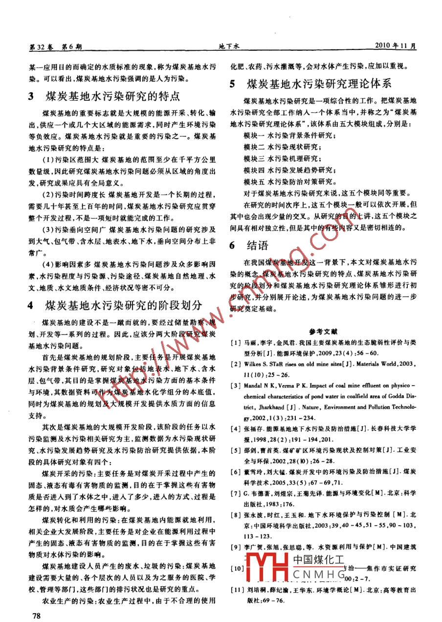 2010年11 月地下水Nov. ,2010第32卷第6期Ground waterVol.32 NO.6煤炭基地水污染研究馮建國',李云峰”,屈卉^ ,張茂省’(1.山東科技大學(xué)地質(zhì)科學(xué)與工程學(xué)院,山東青島266510;2.長安大學(xué)環(huán)境科學(xué)與工程學(xué)院,陜西西安710054;3.西安地質(zhì)礦產(chǎn)研究所,陜西西安710054)[摘要]為提高煤炭的持續(xù)、穩(wěn)定供給能力,我國煤炭基地建設(shè)已經(jīng)啟動。由以往國內(nèi)外煤炭開發(fā)的經(jīng)驗(yàn)可知,煤炭基地的開發(fā)建設(shè)過程中極有可能發(fā)生水污染問題。在充分分析煤炭基地水污染相關(guān)問題的基礎(chǔ)上,本文重點(diǎn)論述了煤炭基地水污染的概念、煤炭基地水污染研究的特點(diǎn)、煤炭基地水污染研究的階段劃分和煤炭基地水污染研究理論體系雛形,為相關(guān)問題的進(jìn)一步研究奠定基礎(chǔ)。[關(guān)鍵詞] 煤炭基地;水污染;階段劃分;理論體系[中圖分類號] X131.2[文獻(xiàn)標(biāo)識碼] A [文章編號] 1004 - 1184(2010)06 - 0076 -03Research on W ater Pollution in the Coal BaseFENG Jian - guo' ,LI Yun - feng ,QU Hui2 ,ZHANG Mao - sheng'(1. College of Geosciences and Technology, SUST, Qingdao266510, Shandong,2. College of environmental scienceand engineering, Chang an University, Xian710054, Shaanxi3. Xian Institute of Geology and Minerals Resources,Xian710054, Shaanxi)Absrtact: To improve sustainably and steadily supplying capacity, the coal base construction has been operated in Chi-na. According to some experience before at home and abroad, during the exploitation and utilization of the coal base construc-tion, it is very possible that the water pollution is existed. The article is based on the relative isue of fully analysis on waterpollution in the coal base and mainly discusses concept and studied characters, section division and the studied theory systemof water pollution in the coal base, laid the studied foundation futhermore.Keywords:The coal base, water pollution, section division and, theoretical system體規(guī)劃,建設(shè)大型煤炭基地,對維護(hù)國家能源安全、滿足經(jīng)濟(jì)1問題的提出社會發(fā)展需要、調(diào)整和優(yōu)化煤炭生產(chǎn)結(jié)構(gòu)、促進(jìn)資源地區(qū)經(jīng)煤炭基地是我國對增強(qiáng)煤炭資源保障能力,在煤炭資源濟(jì)社會發(fā)展,具有十分重要的意義。相對富集的地區(qū),以大型煤埃企業(yè)為主體.綜合開發(fā)煤炭及歷史經(jīng)驗(yàn)表明,在煤炭的開發(fā)和利用過程中會不可避免共生或伴生資源,實(shí)現(xiàn)上下游產(chǎn)業(yè)聯(lián)營和集聚,最終建成煤的出現(xiàn)水污染問題12-6]。對于大型煤炭基地而言,煤炭生產(chǎn)炭調(diào)出、電力供應(yīng)、煤化工和資源綜合利用基地。2006集中、煤炭利用集中,水污染問題更應(yīng)該加以重視。在這樣年,國家發(fā)展改革委員會將位于內(nèi)蒙古和陜西的神東、陜西的背景和前提下.研究煤炭基地水污染問題就顯得尤為迫切陜北陜西和甘肅黃隴(華亭)、山西晉北晉中.晉東、山東魯和重要,具有很強(qiáng)的理論價值和現(xiàn)實(shí)意義。西、安徽兩淮、河北冀中、河南、云貴、蒙東(東北)、寧夏寧東2煤炭基地水污染的概念規(guī)劃建設(shè)為大型煤炭基地。這13個煤炭基地由98個礦區(qū)組成,分布在14個省,總面積287143km',煤炭保有儲量6908水污染問題是一個包含范圍非常廣的問題。由于地下水億t,占全國煤炎儲量的70%。和地表水之間往往存在比較密切的水力聯(lián)系.而煤炭蔫地開2007年11月國家發(fā)展和改革委員會發(fā)布《煤炭產(chǎn)業(yè)政發(fā)有可能造成地下水和地表水的同時污染。分析煤炭基地策》,明確陜北、神東、晉北等5個大型煤炭基地主要負(fù)責(zé)向水污染的概念,可以先從地下水污染的概念人手。華東、華北、東北供給煤炭,并作為“西電東送"北通道電煤基2.1地下水污染地,可適度提高生產(chǎn)和供應(yīng)能力。這是國家對煤礦建設(shè)的總關(guān)于“地下水污染”的涵義,在現(xiàn)有的國內(nèi)外文獻(xiàn)中有多中國煤化工[收稿日期] 2010-08 -02[基金項目]山東科技大學(xué)科學(xué)研究'春蕾計劃'項月,編號“200.MHC N M H G調(diào)查局國土資源大調(diào)查項目"陜北能源基地地下水勘察”("中國地調(diào)局項目編號1212010535207" )貸助。[作者簡介]馮建國(1976- -),男,河北盧龍人,工學(xué)博士,主要從事水文學(xué)及水資源方面的教學(xué)與研究工作。76第32卷第6期地下水2010年11月種多樣的提法,至今還沒有公認(rèn)的定義17-10]。然的影響的確是巨大的,而且是迅速的.逐步加劇的,廢水、有些人認(rèn)為,要對地下水污染下一個切合實(shí)際的定義就.廢氣、廢渣無時無刻不在產(chǎn)生和排放(堆放)。另一方面,自必須涉及到水質(zhì)標(biāo)準(zhǔn)問題。德國教授馬瑟斯( C. Mathess,,然界的一 些現(xiàn)象和地球的活動也會造成-些污染,如地震導(dǎo)1960)提出如下的定義:所謂污染地下水是指地下水由于人通優(yōu)質(zhì)水 含水層和劣質(zhì)水含水層,火山爆發(fā)將地殼中的一些類活動的影響使其溶解的或懸浮的有害成份的濃度超過了有毒有害物質(zhì)帶人水體等,雖然這些事件不是經(jīng)常發(fā)生,但國家或國際規(guī)定的飲用水最大允許濃度。是對于發(fā)生地區(qū)而言,其帶來的危害是非常嚴(yán)重的,甚至是韋德G.指出,因?yàn)樗斜姸嗟挠猛?所以對水污染所下災(z