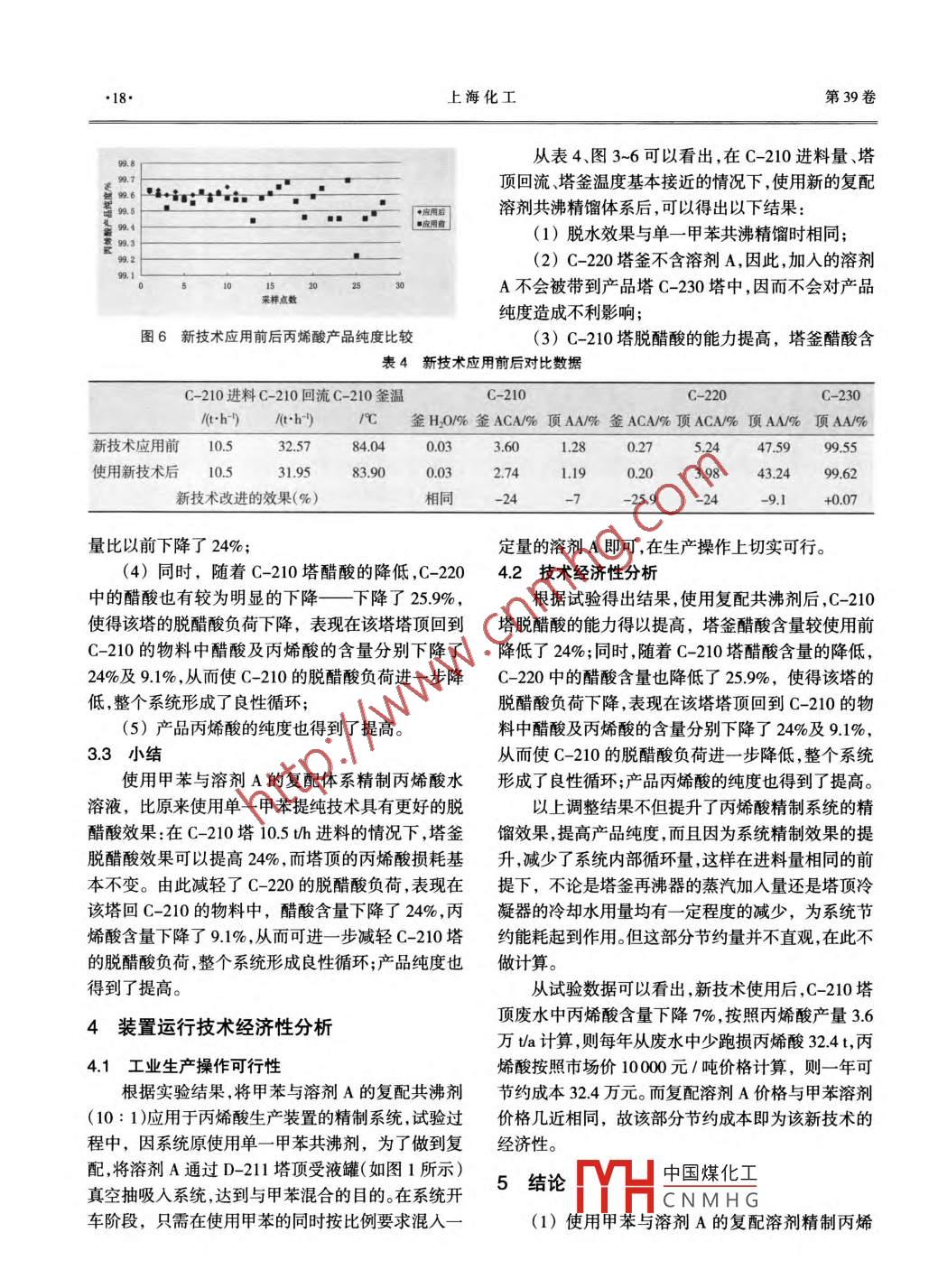 第39卷第7期上?;?014年7月Shanghai Chemical Industry丙烯酸精制系統(tǒng)的優(yōu)化韓煒上海華誼(集團)公司(上海200025)摘要丙烯酸精制是丙烯酸生產(chǎn)中的關鍵步驟。通過實驗找到復配共沸溶劑,在工業(yè)生產(chǎn)裝置上進行試驗,將得到的試驗數(shù)據(jù)與新技術應用前的工況進行比較證實使用復配溶劑用于丙烯酸精制是有效的優(yōu)化了生產(chǎn)過程中丙烯酸精制系統(tǒng)。關鍵詞丙烯酸精餾塔精制中圖分類號TQ225131目前工業(yè)生產(chǎn)中,丙烯酸精制通常采用甲苯為(3)與丙烯酸不形成共沸,兩者容易蒸餾分離。溶劑與水形成均相共沸物,共沸精餾后脫除丙烯酸2模擬實驗粗液中的水分。甲苯與水、醋酸形成共沸物,且甲苯與水可以自行分層,便于甲苯的循環(huán)使用。典型的共首先通過查閱大量國外專利、文獻資料以及各沸脫水法精制丙烯酸水溶液的工藝流程為三塔流類溶劑手冊,從專利權利要求書、專利說明書、溶劑程,如圖1所示。手冊所提及的幾百種共沸劑中選取了可與水及醋酸形成較佳共沸組成的二十幾種共沸劑,這些共沸劑涉及了芳烴、烷烴、鹵代芳烴、鹵代烷烴、酯、酮、醇等七大類。在此基礎上,以脫水率、脫醋酸率為考核依康水萍出據(jù),分別進行了各個溶劑的共沸精餾實驗,并以單甲苯的實驗效果作為對比參照。經(jīng)過一段時間的研究和試驗后,找到了一種共沸劑——A溶劑,它能與水、醋酸形成均相共沸物并且其與甲苯的復配溶劑的脫醋酸效果比單一甲苯C10c-2c30好,同時其物性與甲苯相近,低毒性,對設備腐蝕性圖1丙烯酸精制工藝流程不強。因此,小試實驗主要嘗試用該復配溶劑進行丙烯酸水溶液的脫輕提純考察其實際的脫水、脫醋酸技術研究過程效果以及與丙烯酸分離的難易程度,并在此基礎上以上海華誼丙烯酸有限公司目前使用的甲苯共考察該體系用于工業(yè)化生產(chǎn)的可行性。希望通過該沸脫輕的丙烯酸精制技術為基礎,改進現(xiàn)有的共沸體系在工業(yè)生產(chǎn)裝置上的應用,提高脫水塔的脫醋精餾技術為突破口,研究開發(fā)更高效的、具有自主知酸效果,從而降低脫醋酸塔的脫醋酸負荷,提高整個識產(chǎn)權的丙烯酸精制新技術。本技術研究的理論依系統(tǒng)的脫輕能力據(jù)是共沸精餾,通過向原溶液中加入共沸劑依靠其21實驗流程作用改變原溶液中組分間的相互作用,使關鍵組分實驗流程示意如圖2所示間的相對揮發(fā)度增大,進而使分離由難變易選用的2.2模擬C-210蒸餾實驗共沸劑要求根據(jù)生產(chǎn)裝置工業(yè)化精制丙烯酸的實際情況,(1)與水共沸,易使丙烯酸水溶液脫水;首先模擬C-210塔脫水、脫醋酸的蒸餾實驗——加(2)與醋酸形成共沸,可使丙烯酸與醋酸易于人的溶劑在模擬C-210塔中分別與粗丙烯酸中的分離;水、醋酸形成i日杖料,經(jīng)靜置分中國煤化工CNMHG作者簡介:韓煒男1977年生工程師工程碩士研究方向:化學工程上?;さ?9卷23模擬C-220蒸餾實驗取生產(chǎn)裝置C-20塔釜液,根據(jù)甲苯與溶劑A配比10:1在模擬C-210塔的分離結果,配制成含甲苯13%、溶劑A3%、醋酸23%的溶液,以及含甲8苯16%、醋酸2.3%的溶液,進行模擬C-220的脫醋酸實驗,進料量控制在160gh左右,塔釜/塔頂?shù)那懈畋却蠹s為60:40。實驗結果見表2。表2模擬C-220塔連續(xù)蒸餾數(shù)據(jù)甲苯與A頂溫底溫壓力塔釜液/%塔頂液隔%1213的質(zhì)量比/℃/℃/ kPa H-O ACA TOL A ACA AA單一甲苯708780070.25003059050.3510:1708780.070.100.0206.10522116注:A為溶劑;ACA為醋酸;TOL為甲苯1—物料桶;2——進料計量泵;3—阻聚劑泵;4—冷凝從表2的數(shù)據(jù)可以看出,溶劑A經(jīng)過C-220的器;5—精餾段;6-—冷卻水;7——受液罐;8-分層罐;蒸餾,可以被脫除,因此不會被帶入產(chǎn)品丙烯酸中而9—回流計量泵;10—出料流量計a;11—-出料流量計影響產(chǎn)品純度;塔頂蒸出的物料中,丙烯酸、醋酸的b:12水相接受罐:13—油相接收罐;14—真空泵;含量基本接近;且塔釜的操作條件與單一甲苯作共15——塔釜循環(huán)泵;16—物料桶圖2丙烯酸實驗流程示意圖沸蒸餾時的條件相近,溫度基本在87℃左右。24溶劑與水的分離時間實驗層,形成水相和溶劑相溶劑相經(jīng)過計量又作為塔頂按溶劑:水=6:1配制420g的兩個樣品,其回流;塔釜液經(jīng)計量進入C-220塔進一步脫醋酸。中溶劑分別是純甲苯及甲苯與溶劑A質(zhì)量比為10取丙烯酸粗水溶液從塔中進料,控制進料量在:1的溶劑。分別將兩個樣品充分混合3min后,靜63gh左右,溶劑進料量為105gh左右;塔釜溫度分層,進行溶劑與水的分離時間實驗??刂圃?2-84℃之間塔頂壓力控制在14kPa2分別靜止分層后,兩個樣品均是溶劑在上層,水在下做了單一甲苯、甲苯與溶劑A質(zhì)量比分別為10:1、層。分別對水相和溶劑相進行分析,實驗數(shù)據(jù)見表20:1的共沸蒸餾實驗。實驗結果見表1。3表1模擬C-210塔連續(xù)蒸餾數(shù)據(jù)表3分離實驗數(shù)據(jù)塔頂水甲苯與A頂溫底溫壓力塔釜液‰%的質(zhì)量比/℃/℃kPa相脫水脫醋組成含純甲苯溶液/%含復配溶劑溶液%酸率率/%H,O94.8294.73H2O ACA AA4.63單一甲苯40.3825140.053.60143998944.00水相TOI0:140.582.3140.092.441.4199.8160.9020:139.683140.073.1609999.855023H,O注:A為溶劑;ACA為醋酸;AA為丙烯酸ACA0.15溶劑相91.19從表1的數(shù)據(jù)可以看出,復配溶劑的脫水率與單一甲苯相近;在相似的溫度與壓力以及相近的丙烯酸帶出率情況下,復配溶