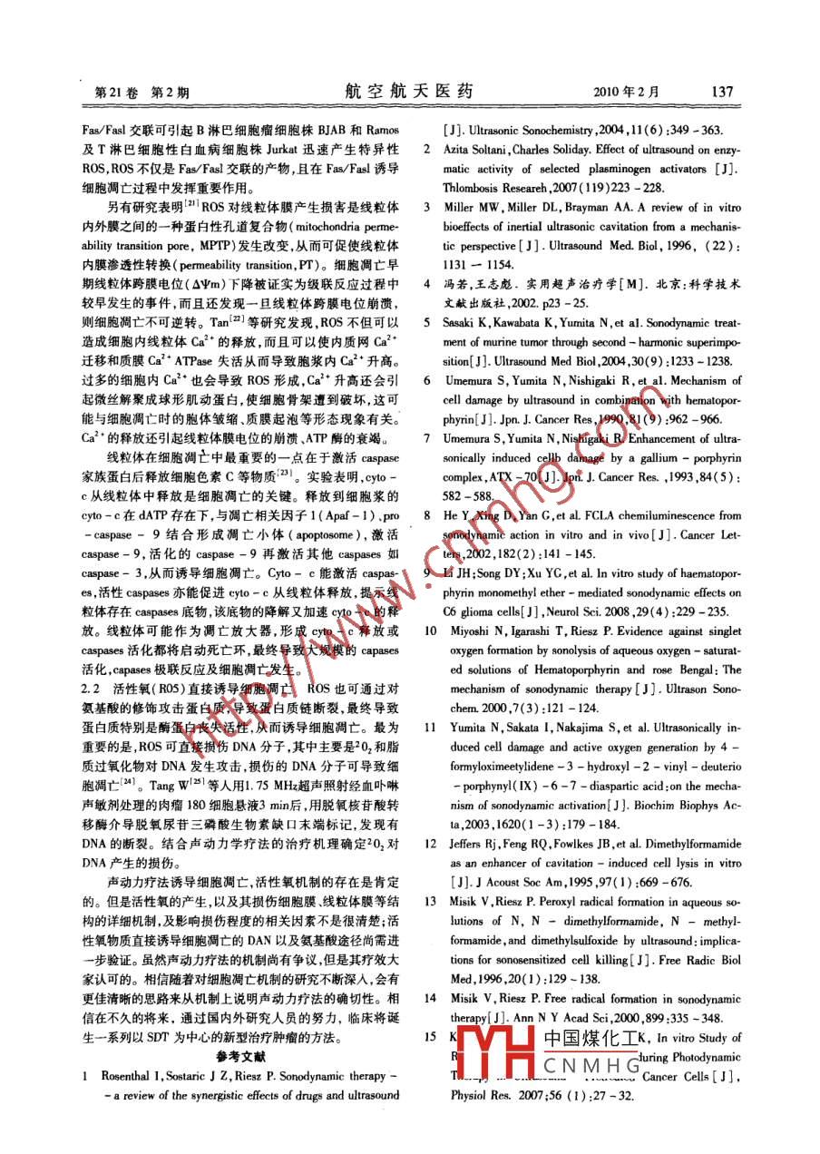 第21卷第2期航空航天醫(yī)藥2010年2月135講座聲動力學(xué)療法機(jī)制的研究陳志強(qiáng)·綜述,岳武審校(哈爾濱醫(yī)科大學(xué)附屬第四醫(yī)學(xué)院神經(jīng)外科,黑龍江哈爾濱150001)A,岳武,男,1963年畢業(yè)于哈爾濱醫(yī)科大學(xué)醫(yī)療系,同年擔(dān)任哈爾濱醫(yī)科大學(xué)第一醫(yī)院神經(jīng)外科醫(yī)生,1991年破格晉升主任醫(yī)師、教授,1992年享受國務(wù)院特殊津貼,1995年晉升博士生導(dǎo)師,聘為哈醫(yī)大學(xué)科帶頭人;現(xiàn)任哈醫(yī)大四院神經(jīng)外科主任醫(yī)師、資深教授、博士生導(dǎo)師及哈醫(yī)大學(xué)科帶頭人。黑龍江省激光醫(yī)學(xué)創(chuàng)始人之一,激光神經(jīng)外科領(lǐng)域創(chuàng)始人,具有一定國際影響的知名專家??蒲蟹矫?激光基礎(chǔ)理論研究和臨床應(yīng)用;激光熒光診斷腦和各部位惡性腫瘤;激光導(dǎo)航顯微外科綜合治療腦和脊髓各種良、惡性腫瘤。190年發(fā)現(xiàn)新的澈光損傷帶一水腫外帶被權(quán)威機(jī)構(gòu)認(rèn)定中國漖光研究發(fā)展30年成就之一,激光光動力療法治療腫瘤居國內(nèi)領(lǐng)先地位。先后承擔(dān)國家自然科學(xué)基金2項,黑龍江省“十五”攻關(guān)課題,市和院??蒲姓n題10余項。獲省政府科技成果獎11項,獲省衛(wèi)生廳、哈醫(yī)大醫(yī)疔新技術(shù)獎21項。發(fā)表國際學(xué)術(shù)論文、國家級、省級論文百余篇。其中收錄到SCI2篇,EI2篇,參著“實(shí)用臨床漖光醫(yī)學(xué)”1部。申請專利1項:舒寧止血海綿研制與開發(fā)。主要成果l.PDT療法治疔神經(jīng)系統(tǒng)惡性腫瘤的應(yīng)用研究。獲黑龍江省科學(xué)技術(shù)進(jìn)步3等獎,(2003);黑龍江省醫(yī)藥衛(wèi)生科技進(jìn)步1等獎,(2003)2.光動力抗腦膠質(zhì)瘤相關(guān)作用機(jī)制研究。獲黑龍江省科學(xué)技術(shù)進(jìn)步3等獎,(2006);黑龍江省醫(yī)藥衛(wèi)生科技進(jìn)步I等獎,(2005)3.缺血性腦血管病的手術(shù)及介入治療。黑龍江省醫(yī)療衛(wèi)生新技術(shù)應(yīng)用2等獎,(2006);獲哈爾濱醫(yī)科大學(xué)醫(yī)疔新技術(shù)成果3等獎(2005)4.導(dǎo)航輔助漖光光動力疔法治療腦膠質(zhì)瘤。獲黑龍江省醫(yī)疔衛(wèi)生新技術(shù)應(yīng)用3等獎,(2006);荻哈爾濱醫(yī)科大學(xué)醫(yī)療新技術(shù)成果2等獎(2005)。教學(xué)方面:從事臨床教學(xué)40余年,發(fā)表多篇教學(xué)論文,已培養(yǎng)出博士研究生10余名,在讀博士5名。現(xiàn)任哈爾濱醫(yī)科大學(xué)教學(xué)督導(dǎo)學(xué)術(shù)團(tuán)體和社會兼職學(xué)術(shù)團(tuán)體及學(xué)術(shù)地位:黑龍江省激光專業(yè)委員會主任委員;中華激光醫(yī)學(xué)會常委,外科學(xué)組組長;中國光學(xué)會醫(yī)學(xué)分科學(xué)會常委;中國激光醫(yī)學(xué)雜志編委、特約審稿人;航空航天醫(yī)藥雜志常務(wù)編委;中華醫(yī)學(xué)研究雜志特邀編委;省和國家自然科學(xué)基金評審人;全國及省、市醫(yī)療事故鑒定專家。社會兼職:民盟哈醫(yī)大一院主任委員,民盟哈醫(yī)大委員會主任委員;政協(xié)黑龍江省聯(lián)誼會常委;黑龍江省政治協(xié)商委員會常務(wù)委員,特約信息顧問。關(guān)鍵詞聲動力學(xué);超聲熱效應(yīng);單線態(tài)氧;活性氧中圖分類號:R454.2文獻(xiàn)標(biāo)識碼:A文章編號:1005-9334(2010)02-0135-04聲動力學(xué)療法( Sonodynamic therapy,DT)由日本學(xué)者機(jī)理是利用超聲的生物熱效應(yīng)來殺傷或抑制腫瘤細(xì)胞2。梅村晉一郎( UmeumraS)等在1989年國際超聲研討會上首認(rèn)為超聲既能聚焦并在聚焦范圍內(nèi)產(chǎn)生能量同時腫瘤組織次提出,是在光動力學(xué)療法的理論與技術(shù)的基礎(chǔ)上人們發(fā)細(xì)胞的異質(zhì)性其吸聲系數(shù)約為正常組織細(xì)胞的兩倍,當(dāng)超展起來。由于超聲選擇性照射病灶和聲敏劑選擇性蓄積聲能量到達(dá)腫瘤組織時,細(xì)胞吸收的能量使腫瘤組織溫度快的雙重選擇作用能特異性地殺傷腫瘤細(xì)胞聲動力學(xué)療法速升高。腫瘤組織血管生長紊亂,血流緩慢,這種局部高熱被認(rèn)為是一種極具應(yīng)用前景的惡性腫瘤治療新手段。不能通過血流向周圍組織擴(kuò)散導(dǎo)致腫瘤組織細(xì)胞增殖和代本文就其近年來相關(guān)機(jī)制研究進(jìn)展做一簡要敘述和探討。謝必須的 PNA RNA及蛋白質(zhì)的合成受阻細(xì)胞膜的通透性1SDT的作用機(jī)制中國煤化工胞死亡。1.1超聲熱效應(yīng)一些學(xué)者認(rèn)為SD療法治腫瘤的部分1.2CNMHG事時各處的聲壓都將發(fā)生嗎列性m評理人負(fù)壓作用下,拉力陳志強(qiáng)哈爾濱醫(yī)科大學(xué)在讀博士。超過液體的內(nèi)聚力液體發(fā)生“斷裂”而產(chǎn)生微小空泡。隨136VoL 21 No. 2Ae MedicineFeb 2010后到來的正聲壓則使空泡破滅,并伴隨高溫、高壓等現(xiàn)象,化的作用下而分解產(chǎn)生了來源于ATX-70的自由基。Jef這就是超聲波的空化作用。空化效應(yīng)是超聲通過激活暴fers等研究了非毒性濃度的DMF、MMF、DMSO對培養(yǎng)露介質(zhì)中己存在的氣體或微氣泡而產(chǎn)生的作用,包括穩(wěn)態(tài)早幼粒細(xì)胞白血病細(xì)胞HL-60的聲動力學(xué)效應(yīng),并將空化(或非崩潰性空化)和瞬態(tài)空化(或崩潰性空化)。這種毒性效應(yīng)歸功于超聲空化產(