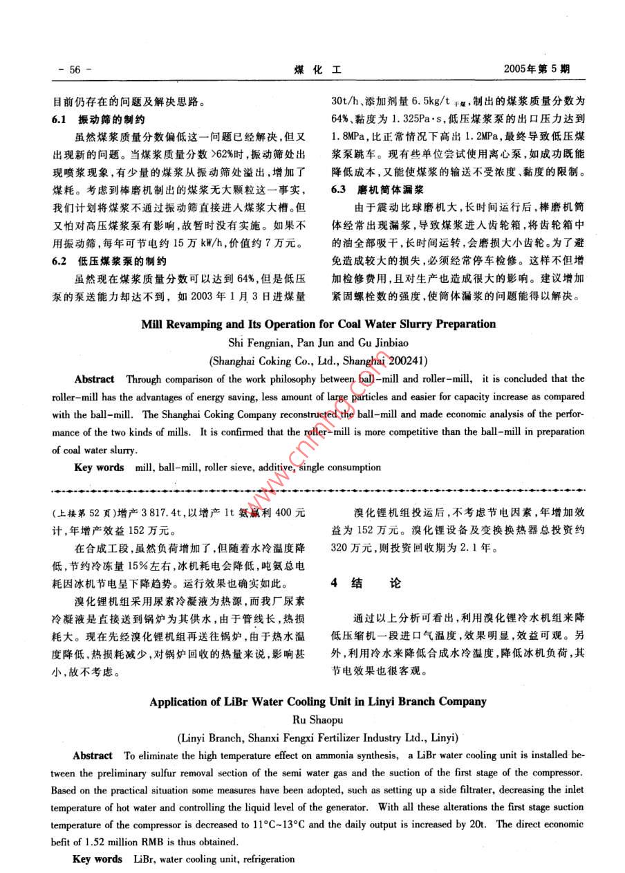 第5期(總第120期)煤化工No5(Total No 120)2005年10月Coal Chemical Industry0ct,2005水煤漿制備中磨機(jī)的改型及運(yùn)行結(jié)果石逢年潘俊顧勁飚(上海焦化有限公司,上海200241)摘要通過(guò)球磨機(jī)和棒磨機(jī)的工作原理比較,得出棒磨機(jī)具有比球磨機(jī)省電、煤漿大顆粒少、負(fù)荷容易提高等優(yōu)點(diǎn)。上海焦化有限公司對(duì)原有球磨機(jī)進(jìn)行了改造,并對(duì)兩種磨機(jī)改造前后的運(yùn)行情況進(jìn)行了技經(jīng)分析,從而證實(shí)了,在水煤漿氣化裝置中,棒磨機(jī)比球磨機(jī)更具有競(jìng)爭(zhēng)性關(guān)鍵詞棒磨機(jī)球磨機(jī)滾筒篩添加劑單耗文章編號(hào):1005-9598(2005)-050053-04中圖分類號(hào):T005文獻(xiàn)標(biāo)識(shí)碼:A棒的沖壓,這樣減少了煤的過(guò)粉碎,煤的粒度分布較引言集中。大顆粒較少,負(fù)荷容易提高上海焦化有限公司新系統(tǒng)采用美國(guó)德士古水煤德士古水1.1.2拋落式運(yùn)動(dòng)狀態(tài)(球磨機(jī)的工作狀態(tài))當(dāng)破碎介質(zhì)在高速運(yùn)動(dòng)時(shí),任何一層介質(zhì)的運(yùn)動(dòng)漿加壓氣化技術(shù),共有四套裝置,現(xiàn)為三開(kāi)一備磨媒軌跡都可以分為:上升時(shí),介質(zhì)從落回點(diǎn)到脫離點(diǎn)是系統(tǒng)為兩臺(tái)球磨機(jī)、一臺(tái)棒磨機(jī)。在實(shí)際運(yùn)行及調(diào)研繞圓形軌跡運(yùn)動(dòng),但從脫離點(diǎn)到落回點(diǎn)則按拋物線軌過(guò)程中,我們發(fā)現(xiàn)棒磨機(jī)具有比球磨機(jī)更省電煤漿跡下落,以后又沿圓形軌跡運(yùn)動(dòng),反復(fù)循環(huán)在拋落式大顆粒少等優(yōu)點(diǎn)。隨著氣化系統(tǒng)負(fù)荷的升高,而磨煤工作狀態(tài)下物料主要靠介質(zhì)群落下時(shí)產(chǎn)生的沖擊力系統(tǒng)球磨機(jī)的負(fù)荷不易提高。為了滿足三臺(tái)氣化爐同而粉碎。由于球磨機(jī)主要靠鋼球的沖擊力和小部分研時(shí)高負(fù)荷運(yùn)行而不改變?cè)瓉?lái)磨煤系統(tǒng)運(yùn)行模式,故決磨,因此,顆粒分布較寬大顆粒較多,負(fù)荷不易提高定將一臺(tái)球磨機(jī)改為棒磨機(jī)。1.1.3離心式運(yùn)動(dòng)狀態(tài)(略)1球、棒磨機(jī)的工作原理及對(duì)比1.2磨機(jī)的臨界轉(zhuǎn)速與工作轉(zhuǎn)速當(dāng)筒體的轉(zhuǎn)速達(dá)到某一數(shù)值,鋼球在筒體內(nèi)沿圓1.1磨機(jī)中破碎介質(zhì)的運(yùn)動(dòng)分析軌跡上升到最高點(diǎn),并開(kāi)始和筒體一起回轉(zhuǎn),而不離在磨機(jī)中,破碎介質(zhì)的運(yùn)動(dòng)狀態(tài)與筒體的轉(zhuǎn)速和開(kāi)筒壁。這時(shí)的轉(zhuǎn)速叫做臨界轉(zhuǎn)速n。我公司磨機(jī)的破碎介質(zhì)與筒體襯板的摩擦系數(shù)有關(guān)。破碎介質(zhì)在筒臨界轉(zhuǎn)速為23.35r/min。根據(jù)計(jì)算,球磨機(jī)的工作轉(zhuǎn)體中的運(yùn)動(dòng)狀態(tài)有三種。速為n=(76%-88%)n而棒磨機(jī)考慮到鋼棒的相互干1.1.1瀉落式運(yùn)動(dòng)狀態(tài)(棒磨機(jī)的工作狀態(tài))擾,其工作轉(zhuǎn)速取n=(65%-70%)n2工作轉(zhuǎn)速降低20%磨機(jī)在低速運(yùn)轉(zhuǎn)時(shí),全部介質(zhì)順筒體旋轉(zhuǎn)方向轉(zhuǎn)左右,其電機(jī)功率隨著降低,較大幅度地降低了電費(fèi)。定的角度,自然形成的各層介質(zhì)基本上按同心圓分自然休止角2磨煤系統(tǒng)簡(jiǎn)介布,并沿同心圓的軌跡升高,當(dāng)介質(zhì)超過(guò)自然休止角后,則像雪崩似地瀉落下來(lái),這樣不斷地反復(fù)循環(huán)。在我公司磨機(jī)是溢流型橡膠襯板水煤漿磨機(jī),它適瀉落式工作狀態(tài)下,物料主要因破碎介質(zhì)相互滑動(dòng)時(shí)用于煤的濕法開(kāi)路粉磨,生產(chǎn)固體質(zhì)量分?jǐn)?shù)>58%的產(chǎn)生壓碎和研磨作用而粉碎。因棒磨機(jī)用棒的全長(zhǎng)來(lái)水煤漿。制出的煤漿作為德土古氣化爐生產(chǎn)煤氣的原壓碎煤,因此在大塊煤沒(méi)有破碎前,細(xì)粒煤很少受到料。煤漿制備的主要工藝流程;煤、水、添加劑混合后進(jìn)入磨機(jī),經(jīng)過(guò)滾筒篩除去大顆粒后進(jìn)人磨機(jī)出料收稿日期:2005-06-21槽,再通過(guò)低壓煤漿泵將煤漿送入煤漿振動(dòng)篩再次除作者簡(jiǎn)介:石逢年(1971-),女,19年畢業(yè)于上海工業(yè)去大顆粒煤漿流入煤漿槽,然后用高壓煤漿泵打人大學(xué)精細(xì)化工專業(yè),工程師,現(xiàn)從事生產(chǎn)管理工作。氣化爐的工藝燒嘴(見(jiàn)圖1)。煤化工2005年第5期添加劑研磨水氣化爐l—磨機(jī)2—滾筒篩3—出料槽4—一低壓煤漿泵5一振動(dòng)篩6—煤漿槽7一高壓煤漿泵圖1制備煤漿的工藝流程示意圖3棒磨機(jī)改造后主要問(wèn)題與解決途徑因素,關(guān)鍵是球磨機(jī)的轉(zhuǎn)速為18.1r/min,線速度為102.4m/min,棒磨機(jī)的轉(zhuǎn)速為14.6r/min,線速度降為根據(jù)理論分析,在滿足氣化要求的情況下,球82.6m/min,過(guò)篩面積減少了19.4%。磨機(jī)滾筒篩采用磨機(jī)改棒磨機(jī)將具有較大的優(yōu)勢(shì),因此我公司對(duì)其不銹鋼板沖孔的篩網(wǎng),孔的方向按徑向布置(見(jiàn)圖進(jìn)行改造并取得了成功,但也存在了一些問(wèn)題。2),孔的寬度32m,開(kāi)孔率42.6%。實(shí)際上球磨機(jī)改31振動(dòng)幅度大為棒磨機(jī)后,水煤漿的流通面積減少了8.3%。開(kāi)始運(yùn)行期間,磨機(jī)極不穩(wě