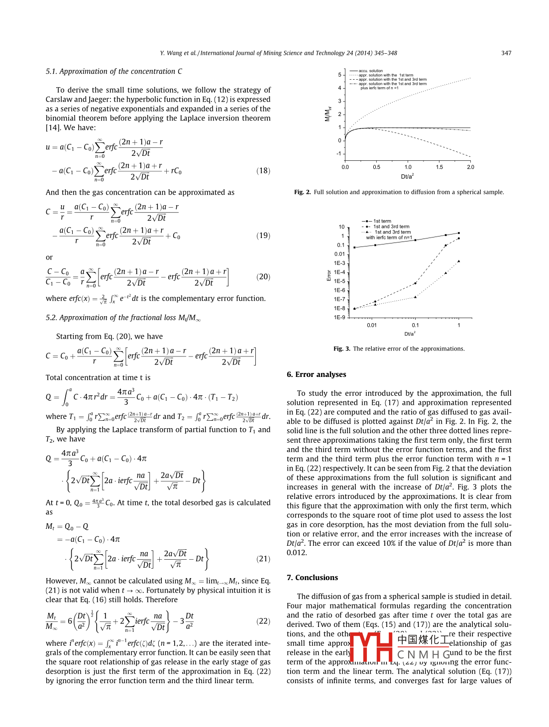 International Journal of Mining Science and Technology 24(2014)345-348Contents lists available at Science DirectInternational Journal of Mining Science and TechnologyELSEVIERurnalhomepagewww.elsevier.com/locate/ijmstA general solution and approximation for the diffusion of gasn a spherical coal sampleWang Yucang Xue Sheng, Xie JunCSIRO Earth Science and Resource Engineering, Kenmore, QLD 4069, AustraliaARTICLE INFOABSTRACTArticle historThe square root relationship of gas release in the early stage of desorption is widely used to provide aReceived 10 October 201imple and fast estimation of the lost gas in coal mines. However, questions arise as to how the relationReceived in revised form 15 November 2013Accepted 8 December 2013ship was theoretically derived, what are the assumptions and applicable conditions and how large theAvailable online 29 April 2014error will be. In this paper the analytical solutions of gas concentration and fractional gas loss for the dif-fusion of gas in a spherical coal sample were given with detailed mathematical derivations based on thediffusion equation. The analytical solutions were approximated in case of small values of time and theCoal contenterror analyses associated with the approximation were also undertaken. The results indicate that thesquare root relationship of gas release is the first term of the approximation, and care must be takenSpherical coal samplein using the square root relationship as a significant error might be introduced with increase in the losGas diffutime and decrease in effective diameter of a spherical coal sampleApproximationo 2014 Published by Elsevier B V on behalf of China University of Mining technologError analysis1 Introductionsignificantly dependent on a number of factors such as samplshape, retrieval time, and physical character of the sample [7, 8Gas content of coal is widely used in gas emission estimation, Crank did present in his book the analytical solutions of diffusionand gas outburst proneness assessment in underground coal min- from cylindrical and spherical samples, but still no mathematicalng [1 The commonly used method for the estimation of the gas derivations were given [ 9]. This raises the questions: how the relacontent is the direct desorption method. This method is based on tionship was theoretically derived? What are the assumptions andobservations of gas release from newly obtained samples, and typ- applicable conditions and how large the error will be? To answerally involves extracting a coal sample, enclosing it in a sealed some of the questions and improve the accuracy of estimation, thiscontainer and measuring the volume of gas released. With the paper gives detailed derivations of a general mathematical solutiondirect method the total gas content of a coal sample is made of for the diffusion of gas in a spherical coal sample and an approxithree parts: lost gas, measurable gas, and residual gas [2-5]. The mation solution. The detailed derivations of a general mathematilost gas(Q1)is the gas desorbed from the sample before it is placed cal solution for the diffusion of gas in a cylindrical coal sample andin the canister. The measurable gas(Q2)is the gas desorbed during an approximation solution have been published by the same grouptransport and in the laboratory. the residual gas( Q3)is the gas still of authors of this paper [10]. These mathematical derivations alsocontained in coal at one atmospheric pressure. While Q2 and Q3 have particular relevance in determining the sorption time and dif-an be directly measured, Q1 has to be estimatedfusion coefficient in our numerical models of coal and gas outThe"lost gas"estimation method was firstly described by Ber- bursts (11, 12tard et al. [6]. It was stated in the paper that early in the desorptionprocess the volume of gas released from coal was proportional tothe square root of time. However no details were given as hethe relationship was theoretically derived except mentioning that 2. Diffusion equation and the initial and boundary conditionsit was based on kinetics of gas desorption from coal. Since then thisGas release from coal is considered to be the process of diffusionsquare root relationship has been widely used as a standard lost in the coal matrix and desorption at surface. The diffusion throughgas estimation method. The relationship has been found to bethe matrix is asoncentration gradient-driven andusually modeledond law of Diffusion [13]. For aCorresponding author. Tel. +61 7 33274531spherical sample中國煤化工ient(D), the gasE-mail address: Yucang. wang@csiro. au(YconcentrationCNMCOordinatehttp://dx.doiorg/10.1016/j.ijmst.2014.03.0102095-2686 2014 Published by Elsevier B V on behalf of China University of Mining TechnologyY, Wang et al/Internal of Mining Science and Technology 24(2014)345-348sphere (r)only then the diffusion equation derived from Ficks Sec- 3. 2. Solution of the fractional lossond Law of Diffusion is given asLet the total gas volume in the sample at time t be Q, we then0≤r>0haver orThe initial and boundary conditions can be expressed as:QC. 4r2 dr0,0≤r0(4) At t-O. the initial total concentration is Qo=4r@ Co. the totalwhere a is the radius of the sphere Co the initial uniform concentra- desorbed gas M until time t istion;and C, the constant concentration at the surface of the sphere. Mr=Qo-QLet u=Cr, Eqs. (1)-(4)becomeDn2T2tat art=0,0lerfc (2n+1ja-r-erfc(2n+1)a.Fig 3. The relative error of the approximationTotal concentration at time t is6. Error analysescC.4丌r2d=4a3C0+a(C1-C0)47(T1-T2)To study the error introduced by the approximation, the fullsolution represented in Eq. (17)and approximation representedwhere T,=Jo rEn-oerfci2npa-dr and T2=Jo rEn-oerfci2njDatrin Eq (22 )are computed and the ratio of gas diffused to gasable to be diffused is plotted against Dt/a' in Fig. 2. In fig. 2, theBy applying the Laplace transform of partial function to T1 and solid line is the full solution and the other three dotted line