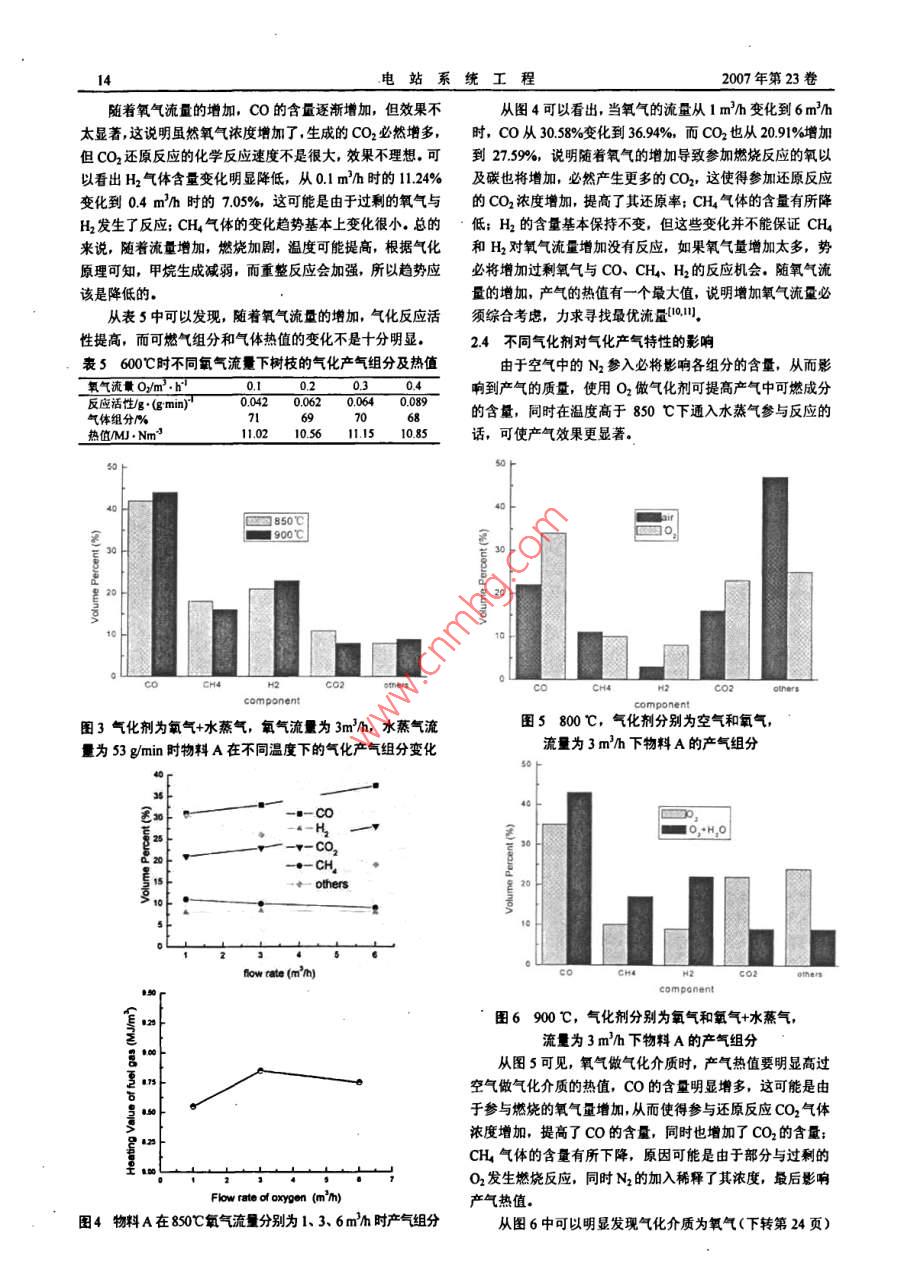 第23卷第6期電站系統(tǒng)工程VolL.23 No.62007年11月Power System Engineering12文章編號: 1005-006X(2007)06-0012-04生物質(zhì)氣化特性的實驗研究*李延吉'李潤東'李愛民’馮磊'姚偉'( 1.沈陽航空工業(yè)學院清潔能源遼寧省重點實驗室,2.大連理工大學動力工程系)摘要: 在小型固定氣化爐和中型氣化爐內(nèi)對典型生物質(zhì)進行氣化實驗,分別采用空氣、氧氣及水蒸氣作為氣化介質(zhì)。實驗分析了物料、氣化溫度、氣化劑及氣化劑流量等影喻因素發(fā)生變化時對氣化產(chǎn)氣特性的影響。研究表明,物料含可燃質(zhì)高時,產(chǎn)氣品位也好:隨著氣化溫度的升高,產(chǎn)氣中可燃氣含量增加;空氣作氣化劑時產(chǎn)氣的熱值低于氧氣作氣化劑時的產(chǎn)氣熱值;氣化劑的流量發(fā)生變化時,氣化產(chǎn)氣成分也相應改變。關鍵詞:生物質(zhì):氣化;產(chǎn)氣特性中圖分類號: TK16文獻標識碼: AExperimental Study on Characteristic of Biomass GasificationLI Yan-ji, LI Run-dong, LI Ai-min, et al.Abstract: Typical biomass gasification in pilot fixed and suffer type gasifier is studied using the air and oxygen andsteam as gasification medium respectively. When the factors, such as the material, gasification temperature, gasificationmedium and the flux of the gasification medium are changed, the infection to the gasifcation charaterstic is analyzed.The experimental results indicate when the flammable component in the material is high, the gas quality is good. Whenthe gasification temperature is increased, the fammable component in the gas is increased. The calorific power is lowerwhen using air as the gasification medium. When the fux of the gasification medium is changed, the gas component ischanged correspondingly.Key words: biomass; gasification; performance of production氣化是在氣化介質(zhì)的參與下,通過部分氧化或還原反應一3將有機原料轉化成為載能氣體的過程,它可以對廢物進行分解破壞,實現(xiàn)快速、顯著減容的同時可以實現(xiàn)資源化利用??缮镔|(zhì)氣化技術作為-項可再生能源利用技術,引起了國內(nèi)外學者的普遍重視。本文實驗基于自行設計的小型固定氣化爐和中型氣化爐(移動床),實驗用物料中混有生物質(zhì)、紙張、廢輪胎、橡膠等多種物料,為了研究與煤混合使用的效11果,也加入部分煤.影響有機固體廢棄物氣化特性的因素眾多,如爐型、氣化溫度、氣化劑、物料以及氣化劑/物料等,圖1生物質(zhì)固定床 氣化實驗系統(tǒng)圖把每種因素做詳細分析是不現(xiàn)實的。本實驗目的就是以不同1.物料2.固定床3.采樣裝置4煙邋5.電控裝置6.流量計7.減壓閥的混合物料在不同的氣化劑、氣化溫度、氣化劑流量條件下8.氧氣瓶9.導線10.熱電偶11.支架對氣化產(chǎn)氣組分的變化進行實驗性研究,從而得到規(guī)律性結論與數(shù)據(jù),可供實際工程應用參考1-5。1實驗實驗采用小型固定床批量實驗(見圖1)和中型規(guī)模移動床連續(xù)式氣化實驗(見圖2).氣體分析儀器使用島津公司生產(chǎn)的GC-14B 氣相色譜1儀。其工作條件為:熱導檢測器(TCD),載氣為熱導率較ie高的He氣,固定相為碳分子篩,流量為20 mU/min,初溫為130C,終溫180C,升溫速率5C/min,橋流為60mA,圖2生物質(zhì)中型移動床連續(xù)氣化實驗 系統(tǒng)裝置圖TCD溫度為180 C,檢測器溫度為180 C.1.風機2.閥門3.臧壓閥4.流量計5.氣化爐6.料斗7.絞龍收稿日期: 200704178.煙邋9.導線10熱電偶 11.集氣袋12.燃燒器13.引|風機李延吉(1974-).男,碩土,講師。沈陽,11003414.煙道15.煙道分析儀16.二次焚燒室17.電控箱18.電子秤*國家自然科學基金資助項目(50606028);遼寧省教育廳計劃項目19蒸汽發(fā)生器20.氧氣瓶(0SL323);學院自選課題(200614Y)第6期李延吉等:生物質(zhì)氣化特性的實驗研究13實驗選用典型有機生物質(zhì)組分,其具體成分分析結果見2.2氣化溫度對氣化特性的影響表1,混合物料組成見表2.氣化反應活性可以定義如下,見式(1);表1部分物料的工 業(yè)分析和元素分析Rma=Wxa(1)My'% V2w% Aw% FCW% Qx/MJ.kg稠殼17.18 38.98 17.38 26 4616.02式中: Rmx-氣化反應活性,g/gmin; Wo一樣 品最初質(zhì)廢紙4.11 22.47 66.39 7.035.29 75.01 2.06 17.6413.91量,g; dW/dt- - 最大質(zhì)量損失率,g/min.干樹枝20.06 63.15 10.09 6.7013.56氣化溫度是一個重要的參數(shù),因為溫度的高低-方面影樹枝7.700 77.62 13.93 0.7508.47響物料的反應速率,同時對一些吸放熱的可逆反應也能起到果皮10.40 69.60 17.20 2.8007.29稻稈28.08 36.05 1054 25 3314.68- -定的控制作用,從而可以改變最終產(chǎn)物的分布。在整個氣20.80 50.52 9.41 19273.76輪胎0.99 62.49 17.44 19.0830.0化反應中,氣化層中的燃燒速度較快,同時干餾速度也比還剪料3898.000.3014244.15原反應的速度要快,所以整個氣化反應的速度瓶頸在還原層表2混合 物料的物料質(zhì)量配比(%)中的反應速度,因此CO2還原成Co的量,主要取決于還原和殼紙居樹葉萬草內(nèi)胎木屑橡膠煤層的化學反應速度。因為反應C+C02-2C0-162 kJ/mol 是物料A的成分12.915.817.524.829.0-一個明顯的吸熱過程,所以升高反應溫度有利于CO2的還物料B的成分9.0058.0 33.0原,有利于制得含CO更多的煤氣;同時溫度的升高,將促物料C的成分6.30413 10.6 41.8進氣化過程中產(chǎn)生的焦油在高溫下發(fā)生裂解反應,生成小分2實驗結果分析子氣體。氣化溫度的升高,會導致物料表面產(chǎn)生更多能量大于氣化反應所需活化能的碳分子,這些碳分子將和氣相的其2.1不同物料的產(chǎn)氣特性它生成物發(fā)生更激烈的碰撞,