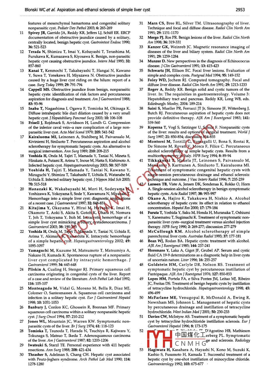 world Journal of Gastroenterology ISSN 1007-9327wjgowjgnet.com92006 The wjG Press. All rights reservedCASE OEORTSuccessful aspiration and ethanol sclerosis of a large,symptomatic, simple liver cyst: Case presentation and reviewof the literatureWojciech C Blonski, Mical S Campbell, Thomas Faust, David C MetzWojciech C Blonski, Division of Gastroenterology, University of literature. World Gastroenterol 2006; 12(18): 2949-2954Pennsylvania, Philadelphia, PA, United States and Department ofGastroenterologyandHepatologyWroclawMedicalUniversityhttp://www.wjgnet079327/12/2949Mical S Campbell, Thomas Faust, David C Metz, Division ofGastroenterology, University of Pennsylvania, Philadelphia, PAUnited StatesCorrespondence to: Dr. David C Metz, 3400 Spruce Street,3 INTRODUCTIONavdin Building, Gastroenterology Division, University of Pennsylvania Health System, Philadelphia, PA 19104,Liver cysts are classified as true or false, depending onUnited States. david metz@uphs. upenn. eduthe presence of an epithelial lining". True cysts includeTelephone:+1-215-6623541lFax:+1-215-3495915congenital cysts(simple cysts and polycystic liver disease)Rece/ved:200503-13 Accepted:2005-07-20parasitic(hydatid) cysts caused by Echinococcus granulosisand multilocularis tapeworms, neoplastic cysts(includingcystadenoma, cystadenocarcinoma, cystic sarcoma,squamous cell carcinoma, and metastatic ovarian,Abstractancreatic. colon, renal and neuroendocrine cancers)Simple liver cysts are congenital with a prevalence of and biliary duct-related cysts(Caroli's disease, bile ductis accurate in distinguishing simple cysts from other caused by spontaneous intrahepatic hemorrhage, post-etiologies, including parasitic, neoplastic, duct-related, traumatic hematoma, or intrahepatic bilomaand traumatic cysts. Symptomatic simple liver cysts areThe pathogenesis of liver cysts is not clear. Simplerare, and the true frequency of symptoms is not known.rer cysts are congenital. They are lined by cuboidalSymptomatic simple liver cysts are predominantly large epithelium and originate from the abnormal development(4 cm), right-sided, and more common in women and of intrahepatic ducts in tera. They are generally stable inolder patlents. the vast majority of simple hepatic cysts size over time, but may slowly enlarge and occasionallyrequire no treatment or follow-up, though large cysts become symptomatic due to mass effect, rupture,4 cm)may be followed initially with serial imaging hemorrhage, or infection. However, an enlarging cystto ensure stability. Attribution of symptoms to a large should prompt consideration of diagnosis other thansimple cyst should be undertaken with caution, after simple cysts. Although simple cysts are generally solitary,alternative diagnoses have been excluded. Aspiration more than one cyst may be present("several solitary ),may be performed to test whether symptoms are due to even in the absence of polycystic liver disease, as is thethe cyst; however, cyst recurrence should be expected, case with the patient described belowLimited experience with both laparoscopic deroofing andWe report herein a case of a patient with a largeaspiration, followed by instillation of a sclerosing agent symptomatic, simple hepatic cyst with resolution ofhas demonstrated promising results for the treatmentof symptomatic cysts. Here, we describe a patient with symptoms immediately after therapy. In addition, wea large, symptomatic, simple liver cyst who experienced present a comprehensive literature review of diagnosis andcomplete resolution of symptoms following cyst drainagetreatment options of symptomatic hepatic cystsand alcohol ablation, and we present a comprehensivereview of the literatureCASE REPORTC 2006 The WJG Press. All rights reserved.A 59-year-old African-American woman was referredrology at the UniversityofKey words: Simple hepatic cyst; Alcohol sclerosis 2 yeal中國煤化工 abdominal pain foraparoscopic deroofingCNMHnt. intermittentssociated with mealsBlonski WC, Campbell MS, Faust T, Metz DC. Successful or bowel movements. Typically, pain would last for one-aspiration and ethanol sclerosis of a large symptomatic, half hour before spontaneously resolving. She had twicesimple liver cyst: Case presentation and review of the presented to the emergency room with abdominal painWwTrw.wignet.com2950ISSN 1007-9327 CN 141219/R World J Gastroenterol May 14, 2006 Volume 12 Number 18Rare compLications of simple liIntracystic haemorrhageInferior vena cava obstructionAdenosquamous carcinomaAdenocarcinomaHepatocellular carinomaCholangiocarcinomaFigure 1 Enhanced abdominal CT scan showing large, simple hepatic cyst.(0.14%-0.17%)4.Morand was discharged without definitive diagnosis. She also patients referred for abdominal ultrasonography, thecomplained of early satiety and occasional nausea without prevalence of simple hepatic cysts has been reportedweight loss.2.5%-4.65%5.6. Liver cysts have been recognizedThe patient was taking daily fiber supplements and had increasingly as the routine use of imaging studieswell controlled with esomeprazole. Hypertension was common in women"and in patients older than 40 yesGegular, daily bowel movements. Reflux symptoms were becomes more widespread. Hepatic cysts may be motreated with metoprolol and amlodipine. Other chronic Symptoms, though quite rare, may be related to themedications were progesterone and estrogen. She denied space-occupying effect of large cysts'and may be morenon-steroidal anti-inflammatory drug usage. Physical common in right-sided cysts Symptoms may includeexamination was unremarkable.abdominal discomfort, chronic right upper quadrant orurinalysis. Screening collonoscop, performed two years reported that among 15 symptomatic patients with solitaryprior to presentation, revealed internal hemorrhoids non-parastic liver cysts, abdominal mass was present inand melanosis. Upon presentation, she underwent 54%, hepatomegaly in 40%, abdominal pain in 33% anddouble contrast upper gastrointes