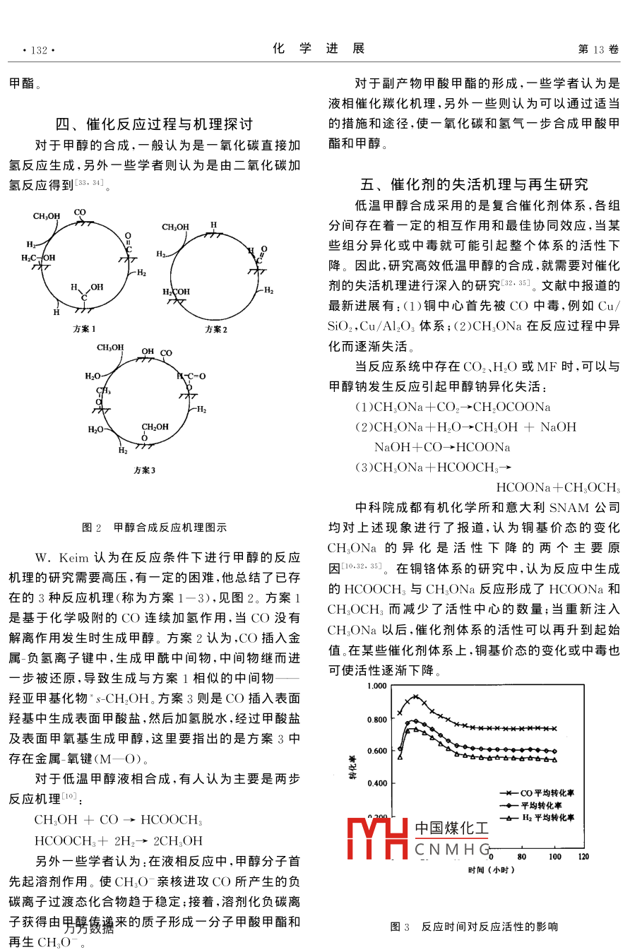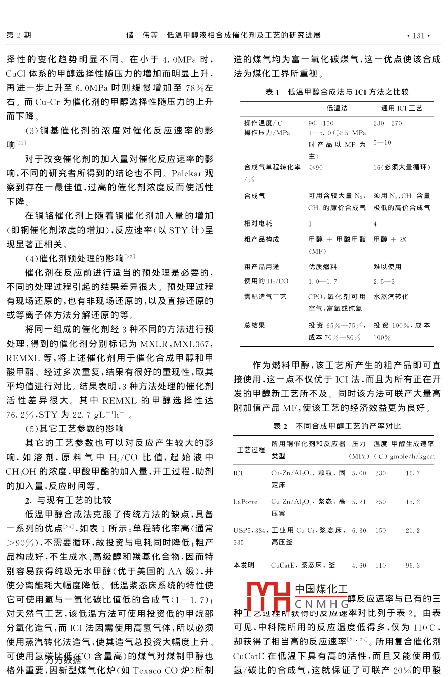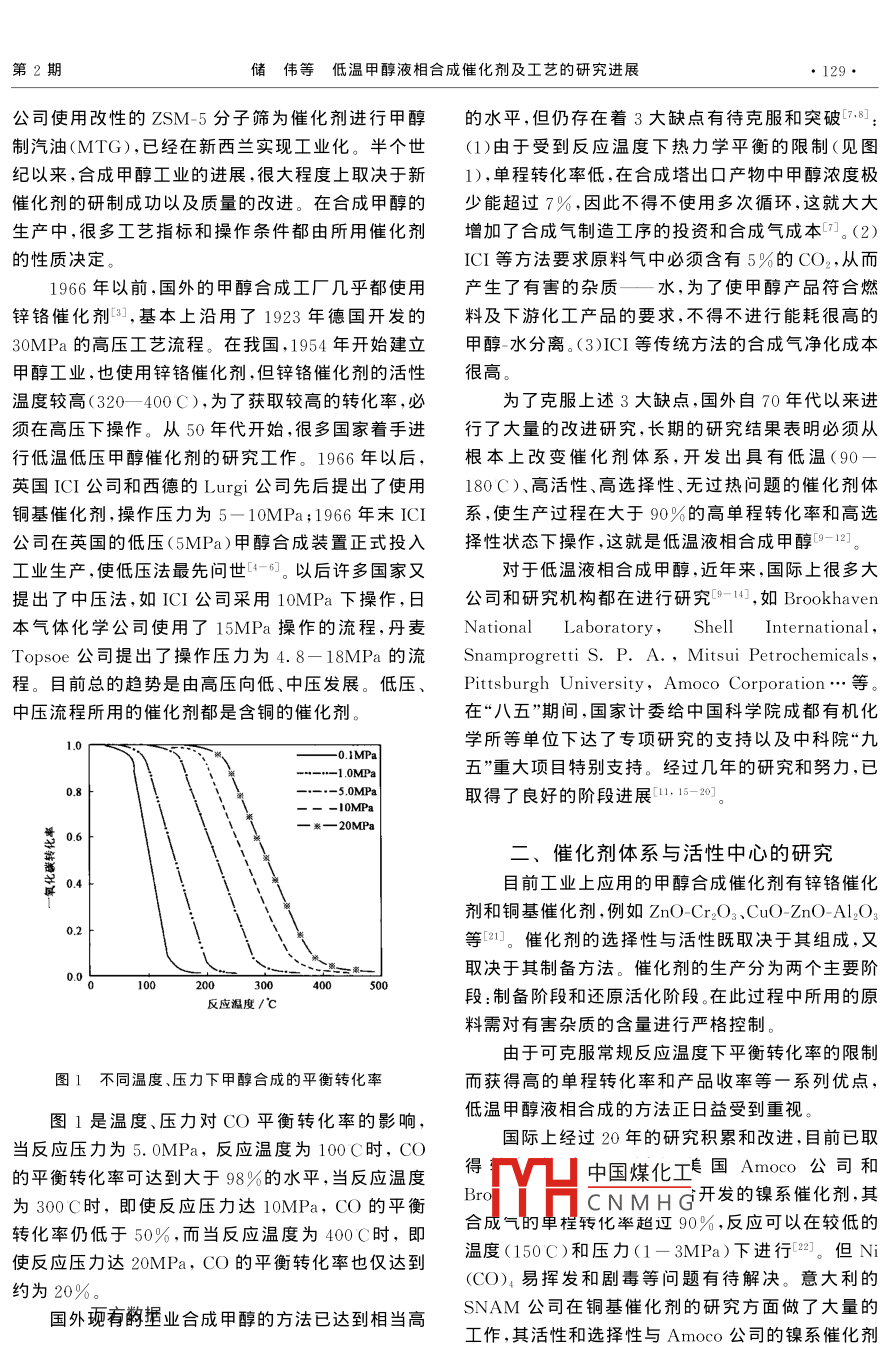 第13卷第2期化學(xué)進(jìn)展2001年3月PROGRESS IN CHEMISTRYIar.,2001低溫甲醇液相合成催化劑及工藝的研究進(jìn)展儲(chǔ)偉吳玉塘羅仕忠(中國(guó)科學(xué)院成都有機(jī)化學(xué)研究所成都610041)包信和林勵(lì)吾(中國(guó)科學(xué)院大連化學(xué)物理研究所大連116023)摘要本文綜述了低溫液相合成甲醇的發(fā)展歷史、研究現(xiàn)狀和目前存在的關(guān)鍵技術(shù)問題。重點(diǎn)討論了催化劑體系和活性中心、催化反應(yīng)過程和工藝、反應(yīng)機(jī)理和失活機(jī)理以及催化劑循環(huán)再生的研究。與傳統(tǒng)的甲醇合成方法比較,液相低溫甲醇直接合成方法具有單程轉(zhuǎn)化率高(90%以上),生產(chǎn)成本低,產(chǎn)品品質(zhì)優(yōu),反應(yīng)條件溫和等優(yōu)點(diǎn)。共引用參考文獻(xiàn)36篇。關(guān)鍵詞甲醇液相合成催化劑反應(yīng)工藝機(jī)理失活再生活性中心中圖分類號(hào):O643.3;TQ51文獻(xiàn)標(biāo)識(shí)碼:A文章編號(hào):1005-281X(2001)02-0128-07Investigation on the Catalysts and reaction process for the methanolSynthesis at lower-Temperature in liquid phaseChu Wei Wu yutang luo shihe(Chengdu Institute of Organic Chemistry, Chinese Academy of Sciences, Chengdu 610041, ChinaBao Xinhe lin liwei( Dalian Institute of Chemical Physics, Chinese Academy of Sciences, Dalian 116023, China)Abstract The history and development of methanol synthesis at lower-temperature in liquid phase(MSLTLP), the research situations, and the present key problems of the technology to be solved areeviewed in this paper. The following topics are especially discussed the catalyst systems, active sitesreaction pathways and processes, reaction mechanism and catalyst deactivation mechanism, the catalyticre-cycle and regeneration. Comparing the traditional techniques for methanol synthesis, there are a fewadvantages for the MSLTLP method the high simple-passmore than 90%), the lowproduction cost, the high grade product quality, the mild and temperate reaction conditions. 36 referencesare citedKey words methanol; liquid phase synthesis; catalyst; reaction process; mechanism; deactivationregeneraactive sites甲醇是碳一化學(xué)中一個(gè)大噸位的化工產(chǎn)品,近引言幾十年來,茸轉(zhuǎn)化利用的發(fā)展勢(shì)頭迅猛。目前世界甲甲醇是一種極其重要的化工原料,又是一種潛醇中國(guó)煤化工手,主要用于生產(chǎn)甲醛在的車用燃料和燃料電池的燃料,因此合成甲醇的申CNMHG、醋酸酐、醋酸甲酯、汽研究和探索,在國(guó)際上一直受到重視2。油添加劑、甲酸甲酯、二甲醚等。此外,美國(guó) MOBIL收稿收修改稿:2000年7月國(guó)家自基金資助項(xiàng)目和科技部“973”重點(diǎn)基礎(chǔ)研究項(xiàng)目第2期儲(chǔ)偉等低溫甲醇液相合成催化劑及工藝的研究進(jìn)展129公司使用改性的ZSM-5分子篩為催化劑進(jìn)行甲醇的水平,但仍存在著3大缺點(diǎn)有待克服和突破,8制汽油(MTG),已經(jīng)在新西蘭實(shí)現(xiàn)工業(yè)化。半個(gè)世(1)由于受到反應(yīng)溫度下熱力學(xué)平衡的限制(見圖紀(jì)以來,合成甲醇工業(yè)的進(jìn)展,很大程度上取決于新1),單程轉(zhuǎn)化率低在合成塔出口產(chǎn)物中甲醇濃度極催化劑的研制成功以及質(zhì)量的改進(jìn)。在合成甲醇的少能超過7%,因此不得不使用多次循環(huán),這就大大生產(chǎn)中,很多工藝指標(biāo)和操作條件都由所用催化劑增加了合成氣制造工序的投資和合成氣成本。(2)的性質(zhì)決定。ICI等方法要求原料氣中必須含有5%的CO2,從而1966年以前,國(guó)外的甲醇合成工廠幾乎都使用產(chǎn)生了有害的雜質(zhì)——水,為了使甲醇產(chǎn)品符合燃鋅鉻催化劑3,基本上沿用了1923年德國(guó)開發(fā)的料及下游化工產(chǎn)品的要求,不得不進(jìn)行能耗很高的3oMPa的高壓工藝流程。在我國(guó),1954年開始建立甲醇水分離。(3)lCI等傳統(tǒng)方法的合成氣凈化成本甲醇工業(yè),也使用鋅鉻催化劑,但鋅鉻催化劑的活性很高。溫度較高(320400C),為了荻取較高的轉(zhuǎn)化率,必為了克服上述3大缺點(diǎn),國(guó)外自70年代以來進(jìn)須在高壓下操作。從50年代開始,很多國(guó)家著手進(jìn)行了大量的改進(jìn)研究,長(zhǎng)期的研究結(jié)果表明必須從行低溫低壓甲醇催化劑的研究工作。1966年以后,根本上改變催化劑體系,開發(fā)出具有低溫(90英國(guó)ICI公司和西德的 Lurgi公司先后提出了使用180C)、高活性、高選擇性、無過熱冋題的催化劑體銅基催化劑,操作壓力為5-10MPa;1966年末ICI系,使生產(chǎn)過程在大于90%的高單程轉(zhuǎn)化率和高選公司在英國(guó)的低壓(5MPa)甲醇合成裝置正式投入擇性狀態(tài)下操作,這就是低溫液相合成甲醇-12工業(yè)生產(chǎn),使低壓法最先問世-6。以后許多國(guó)家又對(duì)于低溫液相合成甲醇,近年來,國(guó)際上很多大提出了中壓法,如ICI公司采用10MPa下操作,日公司和研究機(jī)構(gòu)都在進(jìn)行研究-14,如 Brookhaven本氣體化學(xué)公司使用了15MPa操作的流程,丹麥 National Laboratory, Shell International,Topsoe公司提出了操作壓力為4.8-18MPa的流 namprogretti s.P.A., Mitsui petrochemicals程。目前總的趨勢(shì)是由高壓向低、中壓發(fā)展。低壓、 Pittsburgh University, Amoco Corporation…等。中壓流程所用的催化劑都是含銅的催化劑。在“八五”期間,國(guó)家計(jì)委給中國(guó)科學(xué)院成都有機(jī)化學(xué)所等單位下達(dá)了專項(xiàng)研究的支持以
