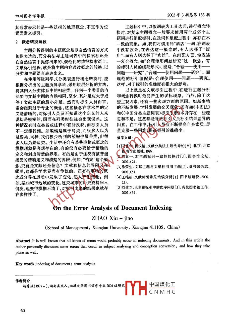 四川圖書館學報2003年3期總第133期文章編號: 1003 - 7136(2003)03 - 0059 - 02標別蜈差分橋趙秀姣(湘潭大學管理學院,湖南湘潭411105)摘要:文獻標引過程中 ,往往會存在這樣或那樣的誤差,文章就標引的主題分析階段和概念轉換階段談談這些誤差的表現(xiàn)和產(chǎn)生原因。關鍵詞:文獻標引;誤差分析中圖分類號:G254.2文獻標識碼:B無論是分類標引還是主題標引,都是從內容出僅能作為標引單元文獻所用,而作為表述文獻分主發(fā)來組織和檢索文獻的方法。在主題分析的基礎上題、主題因素,甚至某-概念的知識單元內涵,都有析出主題概念,再依據(jù)- -定的標引工具進行轉換,這成為標引對象或標引用主題的可能。區(qū)分文獻主題種標引工具就是分類語言和主題語言。作為一種人和文獻標引用主題,才能由對文獻進行標引過渡到為的智力活動,文獻標引工作會因標引人員對文獻對知識進行直接標引的實質性轉變。的分析角度,理解深度及所采用的標引方式的差異其次,忽略隱含主題。所謂隱含主題,是不同于造成標引結果的不同,同時,即使是同-標引人員,原有文獻線性結構所表述的主題因素概念屬性的結在不同的時間里,對同一問題也會有不同的認識。構體,是隱含于線性關系中的非線性關系。這種非下面僅從標引的主題分析階段和概念轉換階段談談線性關系會在表述線性關系時若隱若現(xiàn),似斷非斷這些誤差的表現(xiàn)及產(chǎn)生原因。地呈現(xiàn)出來。標引人員在進行標引時,往往因稍不留神,漏掉了文獻中隱含的主題概念。而這些在顯1主題分析階段見知識、信息中的潛在知識、信息就是最重要的新知主題分析是指根據(jù)文獻標引和檢索的需要,對識新信息的生長點。文獻的內容特征進行分析,提煉主題概念的過程。再次,在分析主題結構,確定標引次序時,存在分類標引和主題標引都是以內容特征為基礎對文獻-些認識上的誤差。劉湘生先生在1981年就提出進行標引和揭示的,需要在弄清文獻主題特征的基將全部主題概括為5個基本的因素,即主體因素、時礎上進行主題概念的轉換。主題分析是主題標引的間因素、通用因素、位置因素、文獻類型因素。我國第一步,也是主題標引的重點所在,其質量如何,在國家標準《文獻敘詞標引規(guī)則》規(guī)定中文圖書分面組標引工作中起決定作用。然而,由于現(xiàn)代科學交叉、配公式為:主體面一通用面一 -位 置面時間滲透、分化、綜合,使得專深學科、交叉學科不斷涌面一文獻類型面 ,這一公式對文獻主題結構中的現(xiàn),文獻內容日益錯綜復雜。而標引工作作為一種面劃分比較簡單、清楚。我們在確定標引次序時,通智能型勞動,受標引人員知識水平的制約,很容易產(chǎn)常采用的就是這樣的-一個標準。但在標引實踐中,生分歧。標引人員對有些主題詞能標引在哪個組面尚存模糊首先,對文獻主題與文獻標引用主題混淆不清。不清的認識。如有些看似表示地理概念的地理名文獻主題是指文獻責任者對文獻“主旨”、“中心內稱,卻是以地域角度為主揭示文獻的,標引人員就不容"或“中心論題”的表述,是對整個文獻內容的概能將它們作為副標題,而應作為主標題。如《湘潭市括、集中表述。隨著文獻數(shù)量急劇增長,文獻知識內空氣質量情況調查》-書,這里的“湘潭市”是作為研容大量交叉重復、離散。文獻標引用主題已經(jīng)不僅對魯中砌大六獻由的下能作作為--個位置因素標僅指文獻主題,而是越來越多地包括文獻中具有情引,TH中國煤化工,文獻中還會有一些報內容的各層次知識單元的主旨或內涵。文獻主題如°CNMHG地理名稱的概念,因收稿日期:2003-01-2259四川圖書館學報2003年3期總第133期其邇常表示的是--些泛指的地理概念,不宜作為位主題標引中,以敘詞表為工具選詞,進行概念轉置因素來標引。換時,對復雜主題概念-般要求使用兩個或多個主題詞進行組配標引,在選詞和組配過程中,亦存在不2概念轉換階段一致的現(xiàn)象。如,我們習慣用到“酒店”- -詞,在詞表主題分析得到的主題概念是以自然語言的方式中沒有收錄,在表達這一概念時,有人選擇了“飯加以表達的,而分類法與主題詞表中的檢索標識是店",而有人則選擇了“賓館”。在組配方面,為表述在自然語言中提煉出來的、規(guī)范化的情報檢索語言。-復合概念,如“合理使用問題研究”這--概念。有文獻標引過程,就是將主題內容通過概念的轉換,以的標引人員的組配形式可能是:“合理一使用一分類和主題語言表達出來。問題-研究"、“合理一- 使用問題一 研究”。而在使用等級列舉式分類表進行概念轉換時,應規(guī)范的標引組配是:合理使用一-問題--- 研究。根據(jù)分析出的主題所屬學科,采用層層分析的方法,這樣,對于標引的準確度有很大的影響。將其歸人分類體系中的相應類。任何-一個類目的內以上就是在文獻標引過程中,在進行主題分析涵要與文獻主題的內涵相同,至少,其外延應大于或和概念轉換時最易產(chǎn)生的誤標現(xiàn)象。當然,除了這等于文獻主題的最小外延。然而對標引人員而言,些主觀因素,還有一些客觀方面的原因。如新事物常會碰到過于專業(yè)的概念,這些概念在學術界的定的不斷發(fā)展、學科發(fā)展的交叉現(xiàn)象,還有如《中圖法》義是清晰的,對標引人員及不知道這個定義的人來和《<