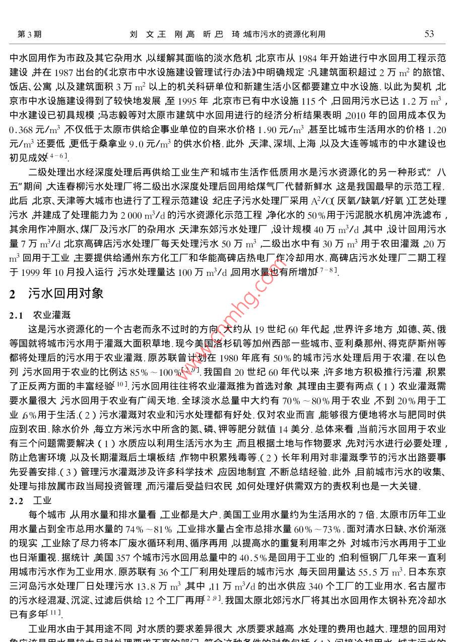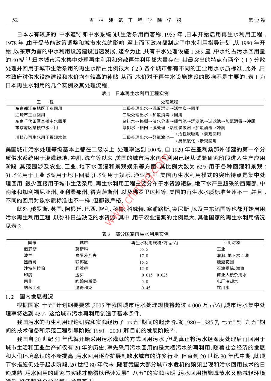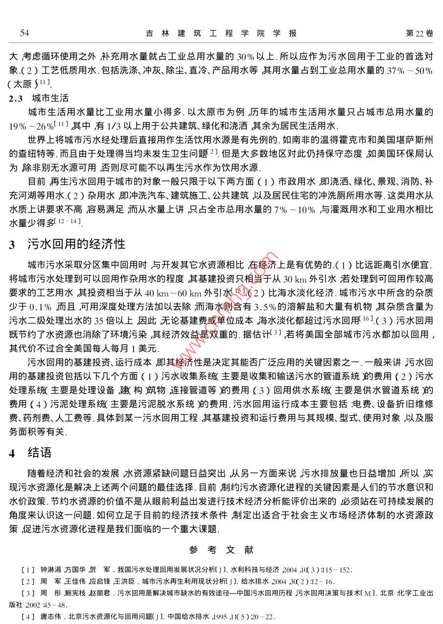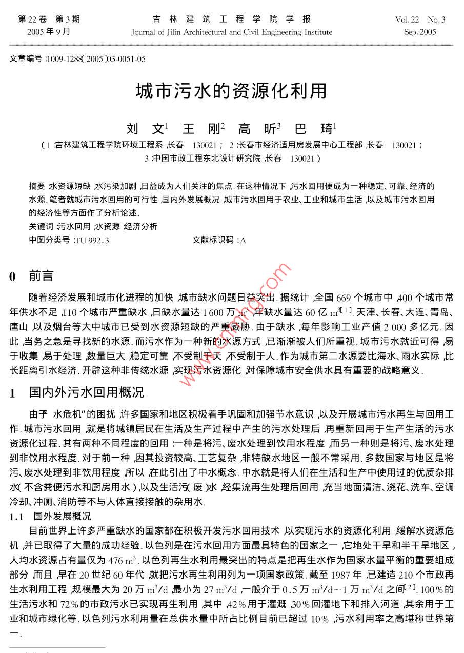 第22卷第3期吉林建筑工程學(xué)院學(xué)報Vol 22 No. 32005年9月Journal of Jilin Architectural and Civil Engineering InstituteSep.2005文章編號:1009-128X2005)30051城市污水的資源化利用劉文1王剛2高昕3巴琦11吉林建筑工程學(xué)院環(huán)境工程系長春13021;2長春市經(jīng)濟(jì)適用房發(fā)展中心工程部長春1300113中國市政工程東北設(shè)計研究院長春130021)摘要水資源短缺水污染加劇日益成為人們關(guān)注的焦點(diǎn).在這種情況下污水回用便成為一種穩(wěn)定、可靠、經(jīng)濟(jì)的水源筆者就城市污水回用的可行性國內(nèi)外發(fā)展概況城市污水回用于農(nóng)業(yè)、工業(yè)和城市生活以及城市污水回用的經(jīng)濟(jì)性等方面作了分析論述關(guān)鍵詞污水回用水資源經(jīng)濟(jì)分析中圖分類號:IU992.3文獻(xiàn)標(biāo)識碼:A0前言隨著經(jīng)濟(jì)發(fā)展和城市化進(jìn)程的加快城市缺水問題日益突岀.據(jù)統(tǒng)計洤全國669個城市中AO0個城市常年供水不足,10個城市嚴(yán)重缺水日缺水量達(dá)1600萬m3年缺水量達(dá)60億m1.天津、長春、大連、青島唐山以及煙臺等大中城市已受到水資源短缺的嚴(yán)重威脅由于缺水每年影響工業(yè)產(chǎn)值2000多億元.因此當(dāng)務(wù)之急是尋找新的水源.而污水作為一種新的水源方式己已漸漸被人們所重視城市污水就近可得易于收集易于處理數(shù)量巨大穩(wěn)定可靠不受制于天不受制于人.作為城市第二水源要比海水、雨水實際比長距離引水經(jīng)濟(jì).開辟這種非傳統(tǒng)水源實現(xiàn)污水資源化對保障城市安全供水具有重要的戰(zhàn)略意義.1國內(nèi)外污水回用概況由乎水危機(jī)"的困擾許多國家和地區(qū)積極著手鞏固和加強(qiáng)節(jié)水意識以及開展城市污水再生與回用工作城市污水回用就是將城鎮(zhèn)居民在生活及生產(chǎn)過程中產(chǎn)生的污水處理后再重新回用于生產(chǎn)生活的污水資源化過程.其有兩種不同程度的回用:種是將污、廢水處理到飲用水程度而另一種則是將污、廢水處理到非飲用水程度對于前一種因其投資較高、工藝復(fù)雜非特缺水地區(qū)一般不常采用.多數(shù)國家與地區(qū)是將污、廢水處理到非飲用程度所以在此引出了中水概念.中水就是將人們在生活和生產(chǎn)中使用過的優(yōu)質(zhì)雜排水不含糞便污水和廚房用水)以及生活孓廢冰經(jīng)集流再生處理后回用充當(dāng)?shù)孛媲鍧?、澆花、洗車、空調(diào)冷卻、沖廁、消防等不與人體直接接觸的雜用水1.1國外發(fā)展概況目前世界上許多嚴(yán)重缺水的國家都在積極開發(fā)污水回用技術(shù)以實現(xiàn)污水的資源化利用緩解水資源危機(jī)并已取得了大量的成功經(jīng)驗以色列是在污水回用方面最具特色的國家之一它地處干旱和半干旱地區(qū)人均水資源占有量僅為476m3.以色列再生水利用最突出的特點(diǎn)是把再生水作為國家水量平衡的重要組成部分而且早在20世紀(jì)60年代就把污水再生利用列為一項國家政策.截至1987年已建造210個市政再生水利用工程規(guī)模最大為20萬m3d最小為27m3/d,般介于0.5萬m3/d-1萬m3d之間21.100%的生活污水和72%的市政污水已實現(xiàn)再生利用其中A2%用于灌溉30%回灌地下和排入河道其余用于工業(yè)和城市綠化等.以色列污水利用量在總供水量中所占比例目前已超過10%污水利用率之高堪稱世界第52吉林建筑工程學(xué)院學(xué)報22日本以有較多的中水道"(即中水系統(tǒng)烘生活雜用而著稱.1955年,日本開始啟用再生水利用工程,1978年由于受節(jié)能政策調(diào)整和城市水荒的影響至上而下政府都制定了中水利用指導(dǎo)計劃從1980年開始以東京為首的中水利用設(shè)施建設(shè)迅速發(fā)展.迄今為止共有中水處理設(shè)施1369座中水約占污水回用量的40%21;日本城市污水集中處理再生利用和分散再生利用都大量存在其最突出的特點(diǎn)有兩個(1)分散處理并回用于城市生活雜用的再生水所占比例很大(2)各個城市都有不同的工業(yè)用水水質(zhì)標(biāo)準(zhǔn).此外日本政府對供水設(shè)施建設(shè)和水價均有較高的補(bǔ)貼從而水價對于再生水設(shè)施建設(shè)的影響不是主要的表1為日本再生水利用的幾個實例及其處理流程表1日本再生水利用工程實例處理流程東京都江東地區(qū)工業(yè)回用二級處理出水→混凝沉淀→活性炭→回用江崎市工業(yè)回用二級處理出水→加氯消毒→回用東京千代田區(qū)某樓中水回用雜排水→格柵→油水分離→亠曝氣池→沉淀池一過濾池→加氯消毒→沖廁東京港區(qū)某樓中水回用雜排水→格網(wǎng)→膜處理→活性炭吸附→加氯消毒→沖廁川崎市再生水用于景觀水體二級處理出水→好氧濾池→活性炭吸附→景觀回用臭氧氧化→景觀回用美國城市污水處理等級基本上都在二級以上處理率達(dá)到100%.自1920年在亞利桑那州修建的第一個分質(zhì)供水系統(tǒng)用于澆灌綠地、沖廁、洗車等以來美國的城市污水再生利用已經(jīng)從試驗研究階段進(jìn)入生產(chǎn)應(yīng)用階段其范圍涉及農(nóng)業(yè)、工業(yè)、地下水回灌和景觀娛樂等方面,其比例大致為6%用于各種回灌和景觀31.5%用于工業(yè)5%用于地下回灌;1.5%用于娛樂、漁業(yè)等2.美國再生水利用模式的突出特點(diǎn)是集中處理回用很少直接用于城市生活