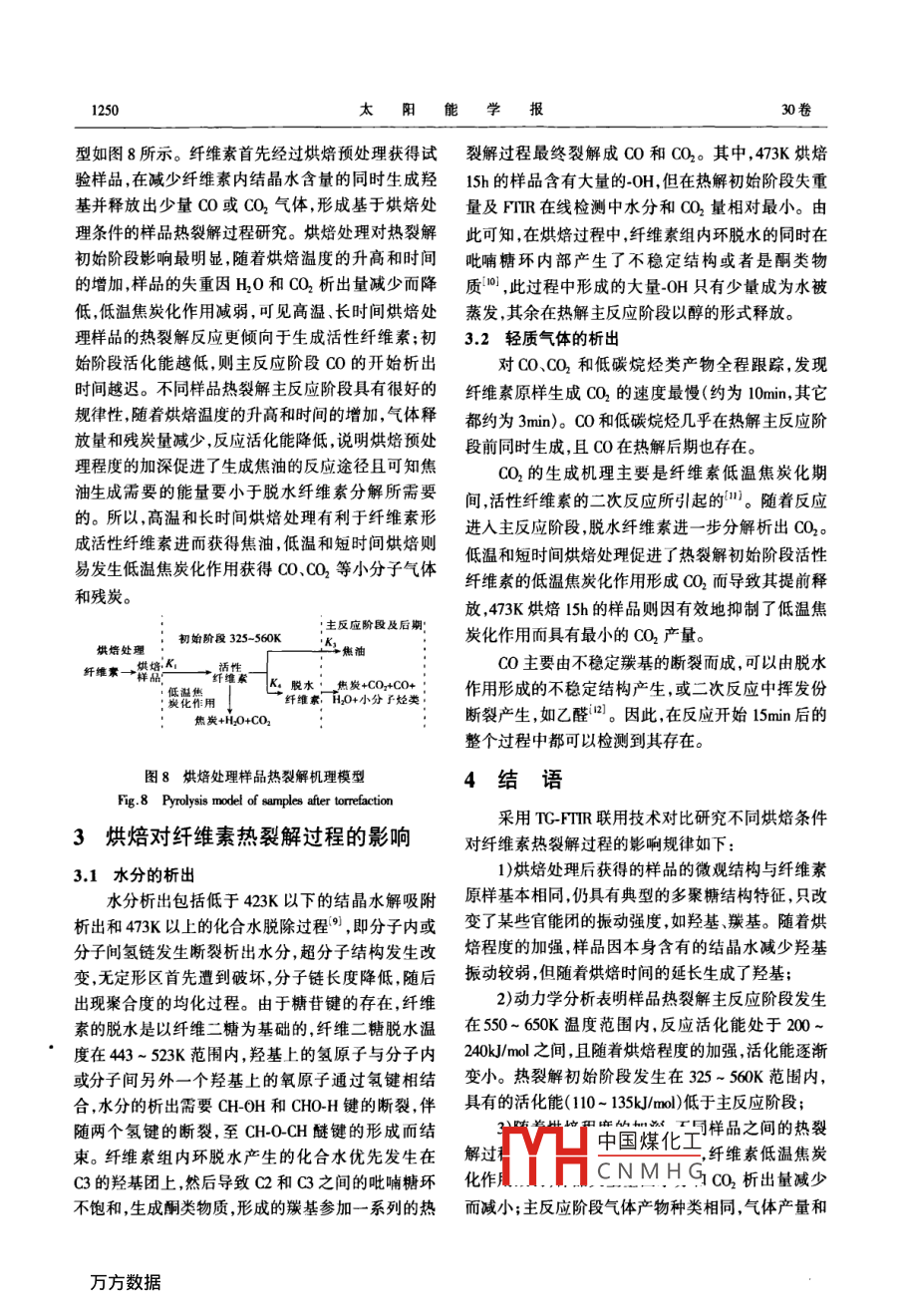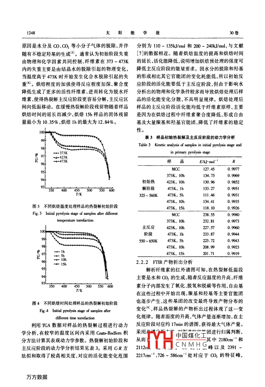 第30卷第9期太陽能學(xué)報(bào)Vol 30, No 900年9月ACTA ENERGIAE SOLARIS SINICA文章編號(hào):02540096(20009124506不同烘焙條件對(duì)纖維素?zé)崃呀鈾C(jī)理的影響研究郭秀娟,王樹榮,劉倩,駱仲泱,岑可法浙江大學(xué)能源清潔利用國家重點(diǎn)實(shí)驗(yàn)室,杭州31007)摘要:通過紅外固體壓片法對(duì)不同烘焙處理的纖維素的微觀結(jié)構(gòu)進(jìn)行分析發(fā)現(xiàn)烘焙處理并沒有改變纖維素基本結(jié)構(gòu)框架,但能改變官能團(tuán)的數(shù)量,如473K下15h處理樣品在消耗結(jié)晶水的同時(shí)生成了羥基使得羥基振動(dòng)明顯增強(qiáng)。利用熱重紅外聯(lián)用技術(shù)研究烘焙處理后纖維素的熱裂解行為結(jié)果表明:不同樣品失重量因水分、CO和CO2等氣體析出強(qiáng)度降低而減少。高溫和長(zhǎng)時(shí)間烘焙利于纖維素經(jīng)過活性纖維素生成焦油,低溫和短時(shí)間烘焙則易發(fā)生低溫焦炭化作用獲得CO、CO2等小分子氣體和殘?zhí)?。關(guān)鍵詞:纖維素;烘焙;活性纖維素;熱裂解;熱重紅外聯(lián)用分析中圖分類號(hào):TK6文獻(xiàn)標(biāo)識(shí)碼:A0引言紅外光譜儀,分辨率4cm1,掃描次數(shù)120次,掃描速度為0.6829cm/s,光欄孔徑34mm。在400生物質(zhì)經(jīng)過熱裂解技術(shù)轉(zhuǎn)化為高品位液體燃料400m-光譜范圍使用汞鎘諦化物檢測(cè)器檢測(cè),為是解決能源問題的有效途徑,而對(duì)熱裂解過程的研了盡可能消除噪音,實(shí)驗(yàn)時(shí)檢測(cè)器用液氮冷卻。樣究是提高液體產(chǎn)物產(chǎn)量和品質(zhì)的關(guān)鍵。纖維素作為品和溴化鉀以1:20的體積比例充分混合研磨成粉生物質(zhì)的三大組分之一,其熱裂解行為直接影響生末壓制成直徑約5m的薄片進(jìn)行紅外分析物質(zhì)整體的熱裂解過程,尤其是活性纖維素的形成TG-FTIR采用的儀器是 Nicolet NetXus670型傅與液體產(chǎn)物產(chǎn)量密切相關(guān)。Anl等認(rèn)為纖維素里葉變換紅外光譜儀和梅特托利多 TGASDTAS8Sle在523~543K的溫度范圍內(nèi)生成活性纖維素,且烘熱重分析儀聯(lián)用系統(tǒng),通過真空密封結(jié)構(gòu)的TGSD焙處理可以提高活性纖維素產(chǎn)量2TA接口、標(biāo)準(zhǔn)的MCT檢測(cè)器完成高靈敏度的檢測(cè),因此本文結(jié)合紅外檢測(cè)技術(shù)和 Coats-Redferm)將TG的定量分析和FTR的定性分析能力結(jié)合,具積分方法的動(dòng)力學(xué)分析開展烘焙處理對(duì)纖維素?zé)崃延袦?zhǔn)確、靈敏、在線檢測(cè)的優(yōu)點(diǎn)。解過程的影響研究,以活性纖維素為中心展開過程解析,為生物質(zhì)能的高品位利用提供更準(zhǔn)確的理論2結(jié)果與討論指導(dǎo)。2.1烘焙處理樣品的微觀結(jié)構(gòu)對(duì)比1實(shí)373K烘焙主要是結(jié)晶水析出,化學(xué)反應(yīng)不明顯烘焙后的樣品仍為白色,無明顯變化。423K烘11物料準(zhǔn)備焙l0h后樣品略微變黃,而473K烘焙時(shí)變化更為明對(duì)微晶纖維素(MCC)進(jìn)行烘焙處理后得到:①顯,僅烘焙lh樣品顏色就變?yōu)槲ⅫS,且隨著烘焙時(shí)相同烘焙時(shí)間(10h),不同烘焙溫度(373、423、473K)間的增加樣品顏色明顯變深,顯示了反應(yīng)程度隨烘的樣品;②相同烘焙溫度(473K),不同烘焙時(shí)間(1、焙溫度的提高和時(shí)間的延長(zhǎng)而逐漸加深。5、10、15h)的樣品。纖維素在烘焙階段發(fā)生了一系列物理和化學(xué)變12儀器及方法化而使其內(nèi)在結(jié)構(gòu)和基團(tuán)有所改變,從而對(duì)最終產(chǎn)紅外固體壓片法采用的是Nexu670傅里葉變換物分中國煤化工的結(jié)晶水含量和元收稿日期:20080417CNMHG基金項(xiàng)目:國家自然科學(xué)基金(50676085:5476057);國家重點(diǎn)基礎(chǔ)研究(93)發(fā)展計(jì)劃(00CB21004)通訊作者:王樹榮(192-),男,博士、教授主要從事生物質(zhì)制取高品位液體燃料方面的研究。 erwang@,咖h,cm9期郭秀娟等:不同烘焙條件對(duì)纖維素?zé)崃呀鈾C(jī)理的影響研究247素組成如表1所示。隨著烘焙時(shí)間的延長(zhǎng)和溫度的多聚糖特性整體結(jié)構(gòu)沒有發(fā)生根本改變,但峰強(qiáng)卻提高,樣品中結(jié)晶水含量明顯減少同時(shí)分子中C和存在差異,隨著烘焙溫度的提高,330cm處的成氫H及C和O比率增加,說明烘焙在促進(jìn)結(jié)晶水釋放鍵的OH振動(dòng)逐漸減弱,對(duì)應(yīng)于其元素分析中結(jié)晶過程可能伴隨有CO0或CO2的析出。結(jié)合樣品的紅水的變化規(guī)律,說明羥基主要來源于樣品中的結(jié)晶外壓片譜圖1和圖2及表2所示的樣品紅外光譜官水;11m處的COH振動(dòng)和1638cm處C=0振能團(tuán)歸屬判斷分析烘焙對(duì)樣品內(nèi)部結(jié)構(gòu)產(chǎn)生的影動(dòng)強(qiáng)度也有所變化。隨著烘焙時(shí)間的延長(zhǎng),變化最為明顯的O-H振動(dòng)增強(qiáng),表明在一定溫度下長(zhǎng)時(shí)間表1元素分析的烘焙處理生成了羥基,且羥基生成量高于因結(jié)晶Table 1 Elemental analysis of samples水蒸發(fā)而減少的羥基量,使得羥基總體含量增加。分子式在低于393K時(shí),結(jié)晶水首先蒸發(fā)出來,隨后在長(zhǎng)時(shí)MCCCH, x O x間或較高溫度下加熱時(shí),纖維素分子發(fā)生斷裂,聚合373K,0h度均化,同時(shí)發(fā)生水解、氧化、脫氫和脫碳等作用形423K,10h5.54成自由基,羰基和羥基等主要官能團(tuán)也逐步產(chǎn)生,形1473K,l0hCHyO,g473K, Ih5CHIz 05.g2成活性纖維