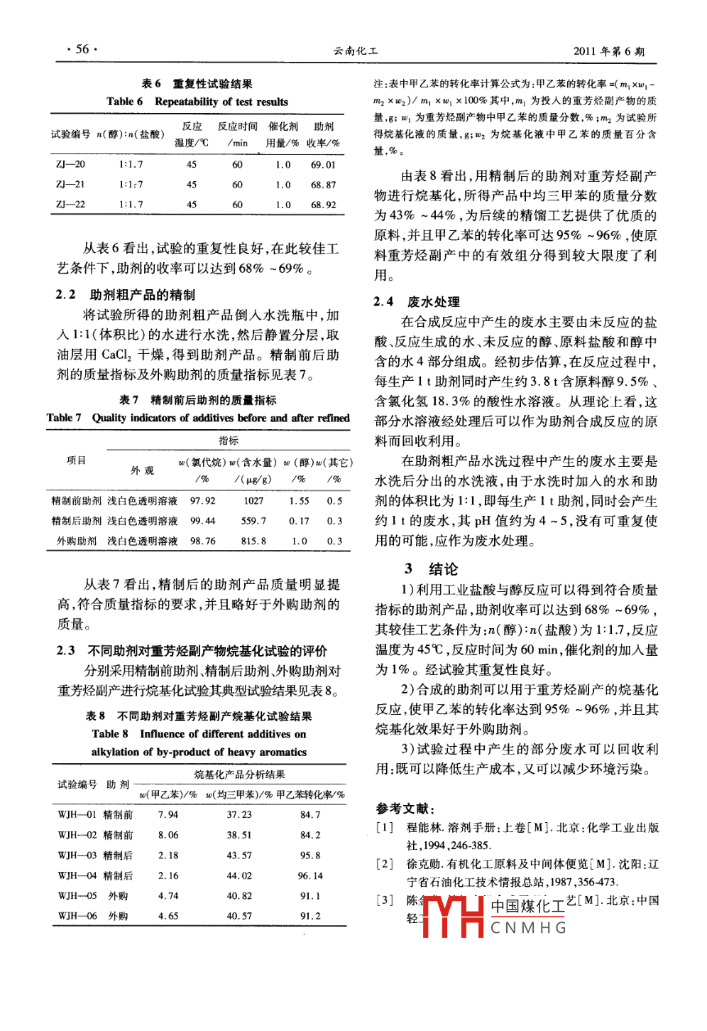 2011年12月云南化工.Dec. 2011第38卷第6期Yunnan Chemical TechnologyVol. 38 ,No.6doi :10.3969/j. issn. 1004-275X. 2011.06. 012氯代烷的合成及應(yīng)用郭蘭芬,高山,王偉(錦州開(kāi)元石化有限責(zé)任公司,遼寧錦州121001 )摘要:通過(guò)試驗(yàn)確定了用鹽酸和醇為原料合成氯代烷的較佳工藝條件,得到了合格的助劑產(chǎn)品,在此工藝條件下,助劑收率可達(dá)到68%-69%。同時(shí)還考察了不同助劑對(duì)重芳烴副產(chǎn)的烷基化反應(yīng)的影響,用合成的精制助劑對(duì)重芳烴副產(chǎn)進(jìn)行烷基化反應(yīng),可使甲乙苯的轉(zhuǎn)化率達(dá)到95% _96%。關(guān)鍵詞:氯代烷;鹽酸;醇中圖分類號(hào): TQ222.2*14文獻(xiàn)標(biāo)識(shí)碼: A文章編號(hào): 1004-275X(2011)06-0054-04氯代烷是一種重要的有機(jī)化工中間體,在醫(yī)品經(jīng)CaCl2干燥后,即得助劑產(chǎn)品甲。藥農(nóng)藥等多方面都有著重要的作用,它是- -種透1.3助劑的質(zhì)量指標(biāo) .明液體,能與乙醇、乙醚相混溶,難溶于水,通常作合格的助劑質(zhì)量指標(biāo)要求見(jiàn)表1。為有機(jī)合成的溶劑”"。據(jù)資料介紹(21 ,氯代烷還表1合格助劑的質(zhì)量指標(biāo)可以作為烷基化反應(yīng)的助劑(也稱烷化劑) ,促使Table 1 Qualified agent of quality indicators烷基化反應(yīng)向試驗(yàn)要求的方向進(jìn)行。本課題的主要目的是找到合成氯代烷的較佳工藝條件,并考外觀w(氯代烷)/% w(水)/(μg/g) w( 醇)/%察它對(duì)重芳烴副產(chǎn)烷基化反應(yīng)的影響,以確定它淺白色透明溶液不小于 99.0%小于800小于0.5是否可以使重芳烴副產(chǎn)中的甲乙苯組分盡可能多2結(jié)果 與討論地轉(zhuǎn)化為重組分,最終得到目的產(chǎn)品。2.1工 藝條件的選擇1實(shí)驗(yàn)部分經(jīng)過(guò)探索試驗(yàn)可知,影響助劑合成試驗(yàn)收率1.1主要設(shè)備與原料的因素有原料配比(醇:鹽酸)、催化劑的用量、反工業(yè)鹽酸(純度為31%),醇(純度為87%~應(yīng)條件(包括反應(yīng)溫度、反應(yīng)時(shí)間)等。另?yè)?jù)資料88% ) ,催化劑ZnCl2(分析純),干燥劑CaCl2(工介紹'3] ,用酸和醇合成氯代烷的反應(yīng)速度較快,可業(yè)級(jí)),重芳烴副產(chǎn):采自重芳烴分離車間。主要以使用ZnCl2等活性較弱的催化劑在常溫下反應(yīng)設(shè)備由三部分組成,分別是助劑合成釜、助劑水洗或在不使用催化劑的條件下也可進(jìn)行反應(yīng),但該罐和助劑干燥釜。反應(yīng)是可逆的,因而對(duì)正反應(yīng)產(chǎn)物的收率有一定影響。如何抑制逆反應(yīng),促使反應(yīng)向正反應(yīng)方向1.2工藝流程首先將定量的工業(yè)鹽酸、催化劑加人到三口瓶進(jìn)行是該合成工藝的關(guān)鍵。中,攪拌一定時(shí)間混合均勻后,加入定量的醇,在攪拌2.1.1不同醇酸比對(duì)收率的影響下充分反應(yīng)。反應(yīng)結(jié)束后倒入分液漏斗中靜置分層,在反應(yīng)溫度為40C,反應(yīng)時(shí)間為60min,催化排除水相。將油相的助劑粗產(chǎn)品倒人到1:1(體積劑的加入量(是指催化劑與加人的工業(yè)鹽的質(zhì)量比)的水洗瓶中,水洗后靜置分層,棄除廢水,油相產(chǎn)比)為1%的條件下,分別取不同的醇酸物質(zhì)的量收稿:2011-09-03接受:2011-10-27作者簡(jiǎn)介:郭蘭芬(1970-),女,遼寧錦州人,工程師,研究方向?yàn)槭突ぎa(chǎn)品的開(kāi)發(fā)工作。中國(guó)煤化工YHCNMHG2011年第6期郭蘭芬等:氯代烷的合成及應(yīng)用.55●比進(jìn)行試驗(yàn),結(jié)果見(jiàn)表2。對(duì)試驗(yàn)結(jié)果的影響,結(jié)果見(jiàn)表4。表2不同醇酸物質(zhì)的量比對(duì)助劑收率的影響表4不同反應(yīng)溫度對(duì)試驗(yàn)結(jié)果的影響Table 2 Effect of different molar ratioTable4 Effect of temperature on the test resultsof alcohol acid on the additive yield反應(yīng)反應(yīng)時(shí)間催化劑助劑試驗(yàn)編號(hào)n(醇):n(鹽酸)試驗(yàn)編號(hào)n(醇)/ n(鹽酸)反應(yīng)反應(yīng)時(shí)間 催化劑助劑溫度/C/min用量/% 收率/%溫度/C /min 用量/% 收率/%ZJ- -111:1.730601.0 57.23ZJ- -121.0 67.11ZJ-011:1.2406(45.41ZJ-021:1.31052. 94Z7--131.068.21ZJ-031:1.5 .60.01ZJ--1469.58ZJ- -04 .6C68.09ZJ- -15.66.32Z--051:1. 968.27ZJ- -061:2.068.19由表4可知,反應(yīng)溫度對(duì)試驗(yàn)結(jié)果影響很大。注:表中助劑收率的計(jì)算公式為:助劑收率=m/(m +m3) x在一定范圍內(nèi),隨著反應(yīng)溫度的升高,助劑的收率100%。其中,m1是反應(yīng)后所得助劑粗產(chǎn)品的質(zhì)量,g;m2是鹽酸也有明顯的提高;但當(dāng)溫度達(dá)到45C后,即使再提的投人量,g;:ms是醇的投人量,go下同。 ,高反應(yīng)溫度,助劑收率也不會(huì)有相應(yīng)的提高,反而由表2可知,隨著醇酸物質(zhì)的量比的增加,助會(huì)降低,不利于試驗(yàn)向正反應(yīng)方向進(jìn)行。所以確劑的收率逐漸增大。但當(dāng)醇酸物質(zhì)的量比增加到定試驗(yàn)的較佳反應(yīng)溫度為45C。1:1.7時(shí),繼續(xù)增大醇酸比,對(duì)助劑的收率影響不2.1.4不同 反應(yīng)時(shí)間對(duì)試驗(yàn)結(jié)果的影響大。所以在其它條件不變的情況下,醇酸物質(zhì)的選擇醇酸物質(zhì)的量比為1: 1.7,催化劑的加入量比為1:1.7較合適。量為1% ,反應(yīng)溫度為459C ,考察不同反應(yīng)時(shí)間為2.1.2催化劑的加入量對(duì)收率 的影響對(duì)試驗(yàn)結(jié)果的影響,結(jié)果見(jiàn)表5。選擇醇酸物質(zhì)的量比為1:1.7