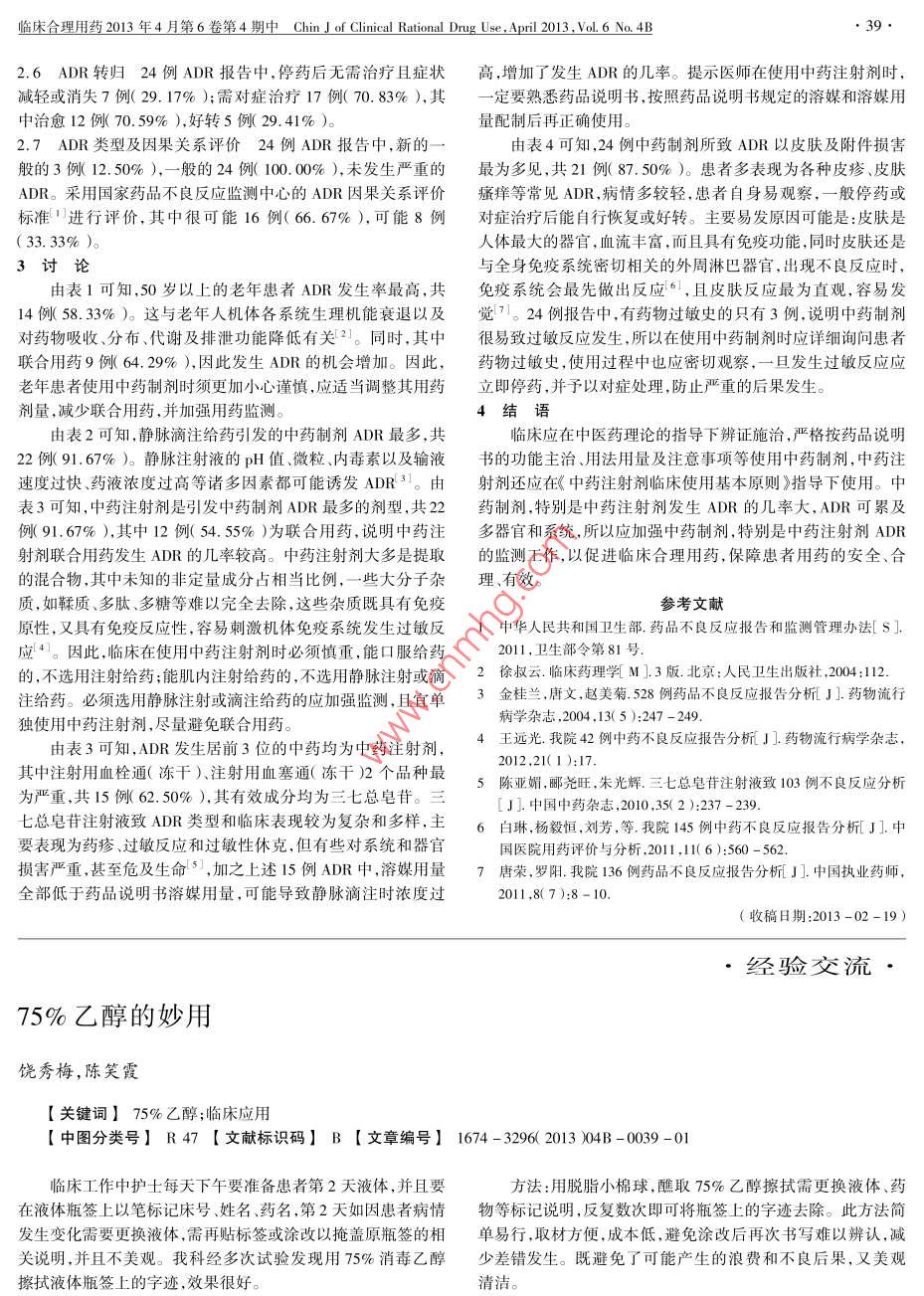 臨床合理用藥2013年4月第6卷第4期中 of Clinical Rational Drug Usepril2013vol.6no.4b392.6ADR轉(zhuǎn)歸24例ADR報告中,停藥后無需治療且癥狀高,增加了發(fā)生ADR的幾率。提示醫(yī)師在使用中藥注射劑時,減輕或消失7例(29.17%);需對癥治療17例(70.83%,其一定要熟悉藥品說明書,按照藥品說明書規(guī)定的溶媒和溶媒用中治愈12例(70.59%),好轉(zhuǎn)5例(29.41%)量配制后再正確使用。2.7ADR類型及因果關(guān)系評價24例ADR報告中,新的一由表4可知,24例中藥制劑所致ADR以皮膚及附件損害般的3例(12.50%),一般的24例(100.00%),未發(fā)生嚴重的最為多見,共21例(87.50%)。患者多表現(xiàn)為各種皮疹、皮膚ADR.采用國家藥品不良反應(yīng)監(jiān)測中心的ADR因果關(guān)系評價瘙癢等常見ADR,病情多較輕,患者自身易觀察,一般停藥或標準進行評價,其中很可能16例(66.67%)可能8例對癥治療后能自行恢復(fù)或好轉(zhuǎn)。主要易發(fā)原因可能是:皮膚是(33.33%)。人體最大的器官,血流豐富,而且具有免疫功能,同時皮膚還是3討論與全身免疫系統(tǒng)密切相關(guān)的外周淋巴器官,出現(xiàn)不良反應(yīng)時,由表1可知,50歲以上的老年患者ADR發(fā)生率最高,共免疫系統(tǒng)會最先做出反應(yīng)6,且皮膚反應(yīng)最為直觀,容易發(fā)14例(58.33%)。這與老年人機體各系統(tǒng)生理機能衰退以及覺7。24例報告中,有藥物過敏史的只有3例,說明中藥制劑對藥物吸收、分布、代謝及排泄功能降低有關(guān)21。同時,其中很易致過敏反應(yīng)發(fā)生,所以在使用中藥制劑時應(yīng)詳細詢問患者聯(lián)合用藥9例(64.29%),因此發(fā)生ADR的機會增加。因此,藥物過敏史,使用過程中也應(yīng)密切觀察,一旦發(fā)生過敏反應(yīng)應(yīng)老年患者使用中藥制劑時須更加小心謹慎,應(yīng)適當調(diào)整其用藥立即停藥,并予以對癥處理,防止嚴重的后果發(fā)生。劑量,減少聯(lián)合用藥,并加強用藥監(jiān)測。4結(jié)語由表2可知,靜脈滴注給藥引發(fā)的中藥制劑ADR最多,共臨床應(yīng)在中醫(yī)藥理論的指導(dǎo)下辨證施治,嚴格按藥品說明22例(91.67%)。靜脈注射液的pH值、微粒、內(nèi)毒素以及輸液書的功能主治、用法用量及注意事項等使用中藥制劑,中藥注速度過快、藥液濃度過高等諸多因素都可能誘發(fā)ADR31。由射劑還應(yīng)在《中藥注射劑臨床使用基本原則》指導(dǎo)下使用。中表3可知,中藥注射劑是引發(fā)中藥制劑ADR最多的劑型,共22藥制劑,特別是中藥注射劑發(fā)生ADR的幾率大,ADR可累及例(91.67%),其中12例(54.55%)為聯(lián)合用藥,說明中藥注多器官和系統(tǒng),所以應(yīng)加強中藥制劑,特別是中藥注射劑ADR射劑聯(lián)合用藥發(fā)生ADR的幾率較高。中藥注射劑大多是提取的監(jiān)測工作,以促進臨床合理用藥,保障患者用藥的安全、合的混合物,其中未知的非定量成分占相當比例,一些大分子雜理、有效。質(zhì),如鞣質(zhì)、多肽、多糖等難以完全去除,這些雜質(zhì)既具有免疫參考文獻原性,又具有免疫反應(yīng)性,容易刺激機體免疫系統(tǒng)發(fā)生過敏反1中華人民共和國衛(wèi)生部藥品不良反應(yīng)報告和監(jiān)測管理辦法[S應(yīng)4。因此,臨床在使用中藥注射劑時必須慎重,能口服給藥2011,衛(wèi)生部令第81號的,不選用注射給藥;能肌內(nèi)注射給藥的,不選用靜脈注射或滴2徐叔云.臨床藥理學(xué)[M].3版.京:人民衛(wèi)生出版社2004:112注給藥。必須選用靜脈注射或滴注給藥的應(yīng)加強監(jiān)測,且宜單3金桂蘭,唐文,趙美菊.528例藥品不良反應(yīng)報告分析[]藥物流行獨使用中藥注射劑,盡量避免聯(lián)合用藥。病學(xué)雜志,2004.13(5):247-249由表3可知,ADR發(fā)生居前3位的中藥均為中藥注射劑4王遠光我院42例中藥不良反應(yīng)報告分析]藥物流行病學(xué)雜志,其中注射用血栓通(凍干)、注射用血塞通(凍干)2個品種最2012,21(1):17.5陳亞媚,酈堯旺,朱光輝三七總皂苷注射液致103例不良反應(yīng)分析為嚴重,共15例(62.50%),其有效成分均為三七總皂苷。三J]中國中藥雜志,2010,35(2):237-239七總皂苷注射液致ADR類型和臨床表現(xiàn)較為復(fù)雜和多樣,主6白琳,楊毅恒,劉芳,等我院145例中藥不良反應(yīng)報告分析[J]中要表現(xiàn)為藥疹、過敏反應(yīng)和過敏性休克,但有些對系統(tǒng)和器官國醫(yī)院用藥評價與析20111(:560-562損害嚴重,甚至危及生命5,加之上述15例AD中,溶媒用量7唐榮,羅陽我院136例藥品不良反應(yīng)報告分析[]中國執(zhí)業(yè)藥師,全部低于藥品說明書溶媒用量,可能導(dǎo)致靜脈滴注時濃度過2011,8(7):8-10.(收稿日期:2013-02-19)經(jīng)驗交流75%乙醇的妙用饒秀梅,陳笑霞【關(guān)鍵詞】75%乙醇;臨床應(yīng)用【中圖分類號】R47【文獻標識碼】B【文章編號】1674-3296(2013)04B-0039-01臨床工作中護士每天下午要準備患者第2天液體,并且要方法:用脫脂小棉球,醮取75%乙醇擦拭需更換液體、藥在液體瓶簽上以筆標記床號、姓名、藥名,第2天如因患者病情物等標記說明,反復(fù)數(shù)次即可將瓶簽上的字跡去除。此方法簡發(fā)生變化需要更換液體,需再貼標簽或涂改以掩蓋原瓶簽的相單易行,取材方便成本低,避免涂改后再次書寫難以辨認,關(guān)說明,并且不美觀。我科經(jīng)多次試驗發(fā)現(xiàn)用75%消毒乙醇少差錯發(fā)生。既避免了可能產(chǎn)生的浪費和不良后果,又美觀擦拭液體