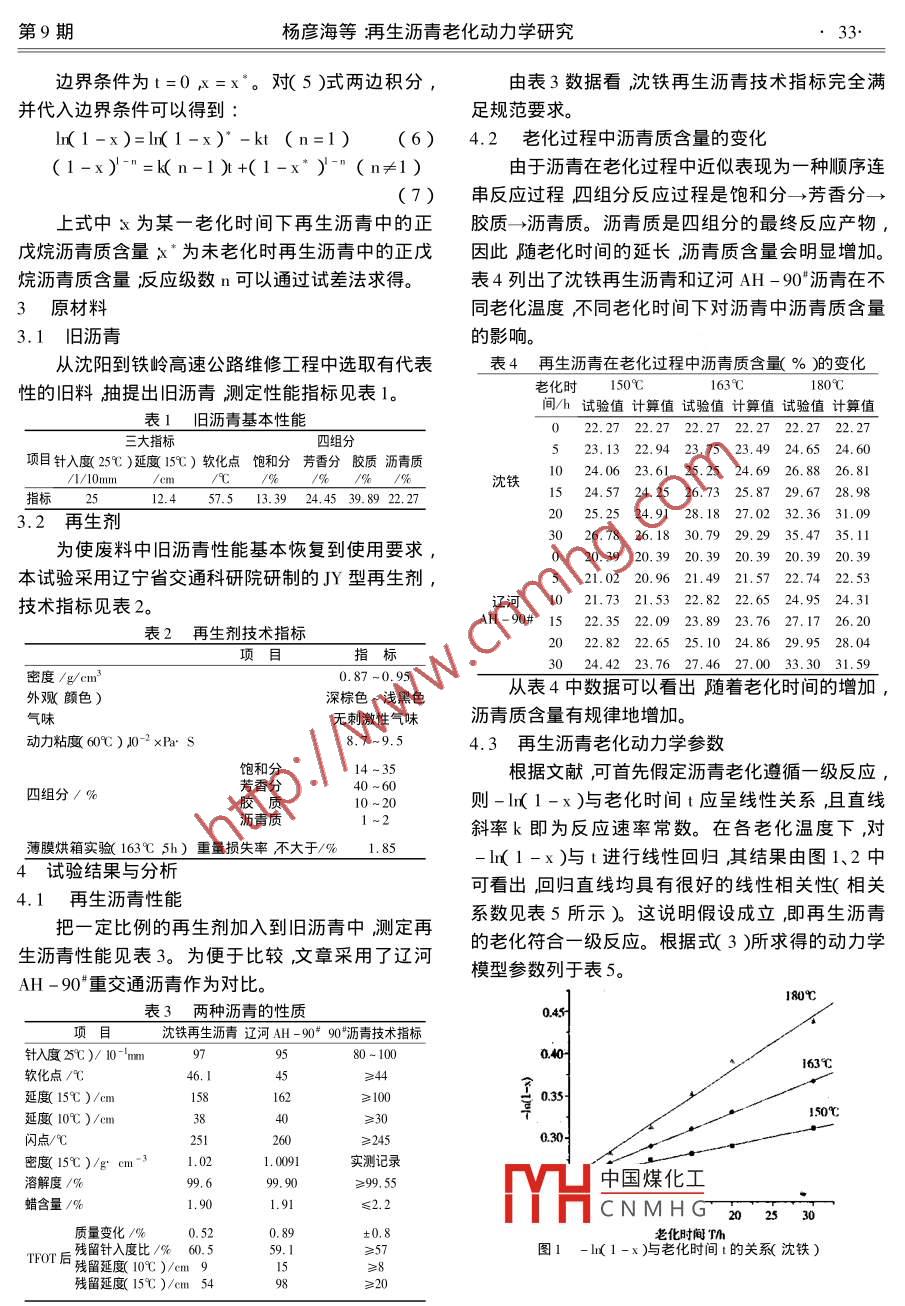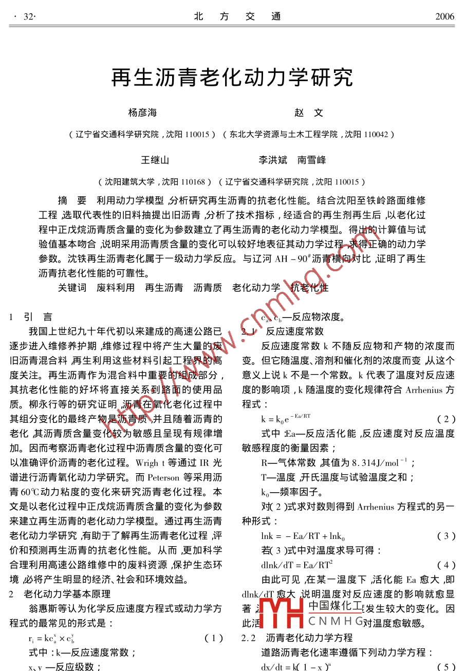32北方交通2006再生瀝青老化動(dòng)力學(xué)研究楊彥海趙文〔遼寧省交通科學(xué)研究院,沈陽(yáng)110015)(東北大學(xué)資源與土木工程學(xué)院,沈陽(yáng)110042)王繼山李洪斌南雪峰〔沈陽(yáng)建筑大學(xué),沈陽(yáng)110168)(遼寧省交通科學(xué)研究院,沈陽(yáng)110015)摘要利用動(dòng)力學(xué)模型分析研究再生瀝青的抗老化性能。結(jié)合沈陽(yáng)至鐵嶺路面維修工程選取代表性的舊料抽提岀舊瀝青分析了技術(shù)指標(biāo),經(jīng)適合的再生劑再生后,以老化過(guò)程中正戊烷瀝青質(zhì)含量的變化為參數(shù)建立了再生瀝青的老化動(dòng)力學(xué)模型。得岀的計(jì)算值與試驗(yàn)值基本吻合說(shuō)明采用瀝青質(zhì)含量的變化可以較好地表征其動(dòng)力學(xué)過(guò)程求得正確的動(dòng)力學(xué)參數(shù)。沈鐵再生瀝青老化屬于一級(jí)動(dòng)力學(xué)反應(yīng)。與遼河AH-90°瀝青橫向?qū)Ρ茸C明了再生瀝青抗老化性能的可靠性。關(guān)鍵詞廢料利用再生瀝青瀝青質(zhì)老化動(dòng)力學(xué)抗老化性引言Cn、C一反應(yīng)物濃度我國(guó)上世紀(jì)九十年代初以來(lái)建成的高速公路已2.1反應(yīng)速度常數(shù)逐步進(jìn)入維修養(yǎng)護(hù)期維修過(guò)程中將產(chǎn)生大量的廢反應(yīng)速度常數(shù)k不隨反應(yīng)物和產(chǎn)物的濃度而舊瀝青混合料再生利用這些材料引起工程界的高變。但它隨溫度、溶劑和催化劑的濃度而變從這個(gè)度關(guān)注。再生瀝青作為混合料中重要的組成部分,意義上說(shuō)k不是一個(gè)常數(shù)。k代表了溫度對(duì)反應(yīng)速其抗老化性能的好壞將直接關(guān)系到路面的使用品度的影響項(xiàng),k隨溫度的變化規(guī)律符合 Arrhenius方質(zhì)。柳永行等的研究證明瀝青在氧化老化過(guò)程中程式其組分變化的最終產(chǎn)物是瀝青質(zhì)并且隨著瀝青的EA/RT老化其瀝青質(zhì)含量變化較為敏感且呈現(xiàn)有規(guī)律增式中Ea—反應(yīng)活化能反應(yīng)速度對(duì)反應(yīng)溫度加。因而考察瀝青老化過(guò)程中瀝青質(zhì)含量的變化可敏感程度的衡量因素以準(zhǔn)確評(píng)價(jià)瀝青的老化過(guò)程。 Wrigh t等通過(guò)I光R—?dú)怏w常數(shù)其值為8.314J/mol-譜進(jìn)行瀝青氧化動(dòng)力學(xué)研究。而 Peterson等采用瀝T—溫度開(kāi)氏溫度與試驗(yàn)溫度之和青60℃動(dòng)力粘度的變化來(lái)研究瀝青老化過(guò)程。本k一頻率因子。文是以老化過(guò)程中正戊烷瀝青質(zhì)含量的變化為參數(shù)對(duì)2)式求對(duì)數(shù)則得到 Arrhenius方程式的另來(lái)建立再生瀝青的老化動(dòng)力學(xué)模型。通過(guò)再生瀝青種形式老化動(dòng)力學(xué)研究有助于了解再生瀝青老化過(guò)程評(píng)Ink =-Ea/RT +Inko(3)價(jià)和預(yù)測(cè)再生瀝青的抗老化性能。從而更加科學(xué)若(3)式中對(duì)溫度求導(dǎo)可得合理利用高速公路維修中的廢料資源,保護(hù)生態(tài)環(huán)dInk/dt= ea/rt境必將產(chǎn)生明顯的經(jīng)濟(jì)、社會(huì)和環(huán)境效益由此可見(jiàn)在某一溫度下活化能Ea愈大,即2老化動(dòng)力學(xué)基本原理lnk/T愈大說(shuō)明溫度對(duì)反應(yīng)速度的影響就愈顯翁惠斯等認(rèn)為化學(xué)反應(yīng)速度方程式或動(dòng)力學(xué)方著中國(guó)煤化工發(fā)生較大的變化。因程式的最常見(jiàn)的形式是此CNMHG對(duì)溫度愈敏感r:=kc×c(1)2.2瀝青老化動(dòng)力學(xué)方程式中:k一反應(yīng)速度常數(shù)道路瀝青老化速率遵循下列動(dòng)力學(xué)方程xy一反應(yīng)級(jí)數(shù)dx/dt=k(1-x第9期楊彥海等再生瀝青老化動(dòng)力學(xué)研究33邊界條件為t=0x=x。對(duì)5)式兩邊積分由表3數(shù)據(jù)看沈鐵再生瀝青技術(shù)指標(biāo)完全滿并代入邊界條件可以得到:足規(guī)范要求(1-x)=ln(1-x)-kt(n=1)(6)4.2老化過(guò)程中瀝青質(zhì)含量的變化(1-x)"=kn-1)+(1-x)”(n≠1)由于瀝青在老化過(guò)程中近似表現(xiàn)為一種順序連(7)串反應(yīng)過(guò)程四組分反應(yīng)過(guò)程是飽和分→芳香分→上式中☆為某一老化時(shí)間下再生瀝青中的正膠質(zhì)→瀝青質(zhì)。瀝青質(zhì)是四組分的最終反應(yīng)產(chǎn)物戊烷瀝青質(zhì)含量☆為未老化時(shí)再生瀝青中的正戊因此隨老化時(shí)間的延長(zhǎng)瀝青質(zhì)含量會(huì)明顯增加。烷瀝青質(zhì)含量反應(yīng)級(jí)數(shù)n可以通過(guò)試差法求得。表4列出了沈鐵再生瀝青和遼河AH-90"瀝青在不3原材料同老化溫度不同老化時(shí)間下對(duì)瀝青中瀝青質(zhì)含量3.1舊瀝青的影響。從沈陽(yáng)到鐵嶺高速公路維修工程中選取有代表表4再生瀝青在老化過(guò)程中瀝青質(zhì)含量%)的變化性的舊料抽提岀舊瀝青測(cè)定性能指標(biāo)見(jiàn)表1,老化時(shí)150℃163℃180℃間/h試驗(yàn)值計(jì)算值試驗(yàn)值計(jì)算值試驗(yàn)值計(jì)算值表1舊瀝青基本性能22.2722.2722.2722.2722.2722.27大指標(biāo)四組分523.1322.9423.7523.4924.6524.60項(xiàng)目針入度25℃)延度5℃)軟化點(diǎn)飽和分芳香分膠質(zhì)瀝青質(zhì)/1/10mm沈鐵024.0623.6125.2524.6926.8826.81指標(biāo)2512.457.513.3924.4539.8922.21524.5724.2526.7325.8729.6728.983.2再生劑2025.2524.9128.1827.0232.3631.09為使廢料中舊瀝青性能基本恢復(fù)到使用要求020.3920.3920.3920.3920.3920.39本試驗(yàn)采用遼寧