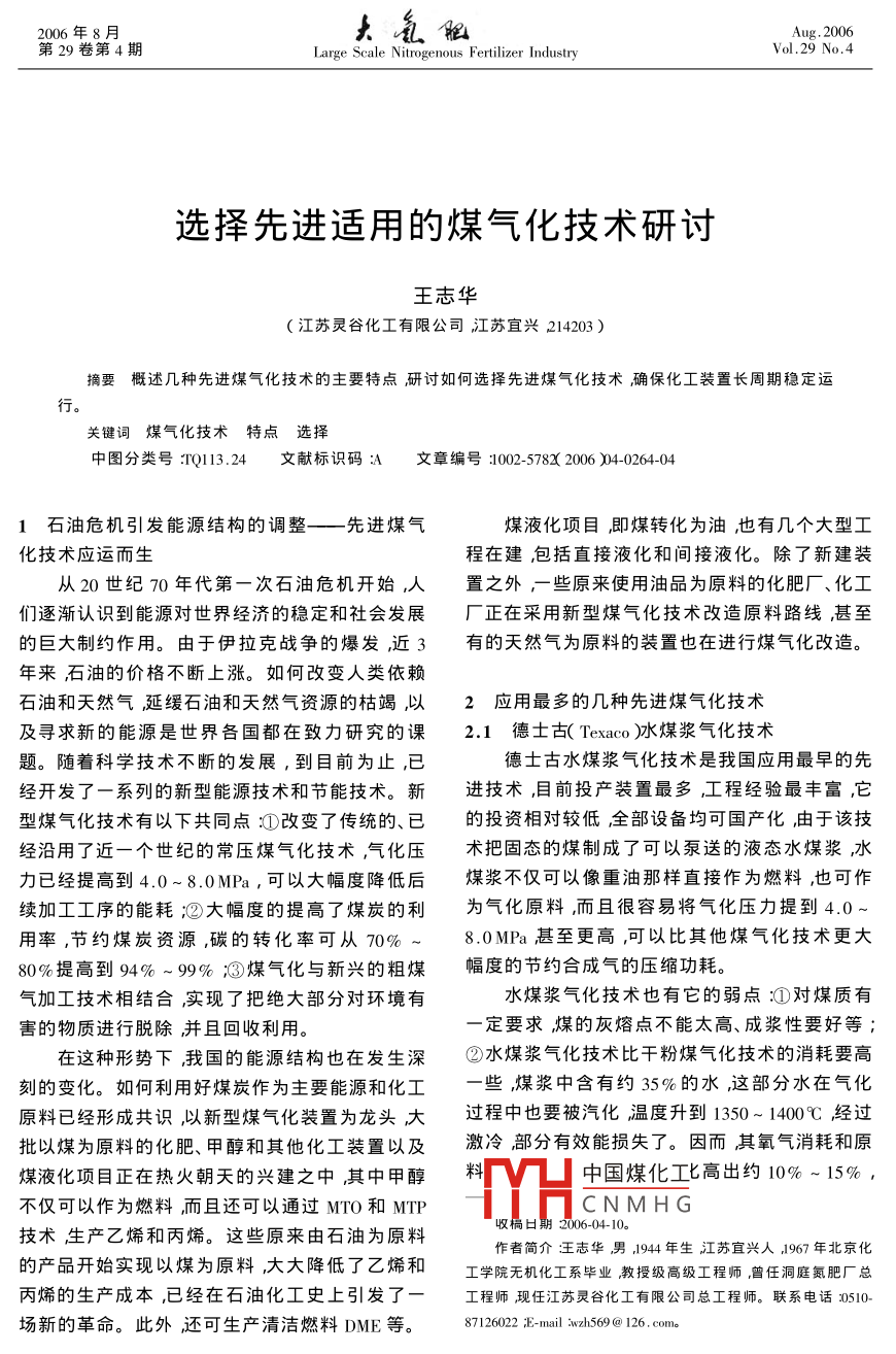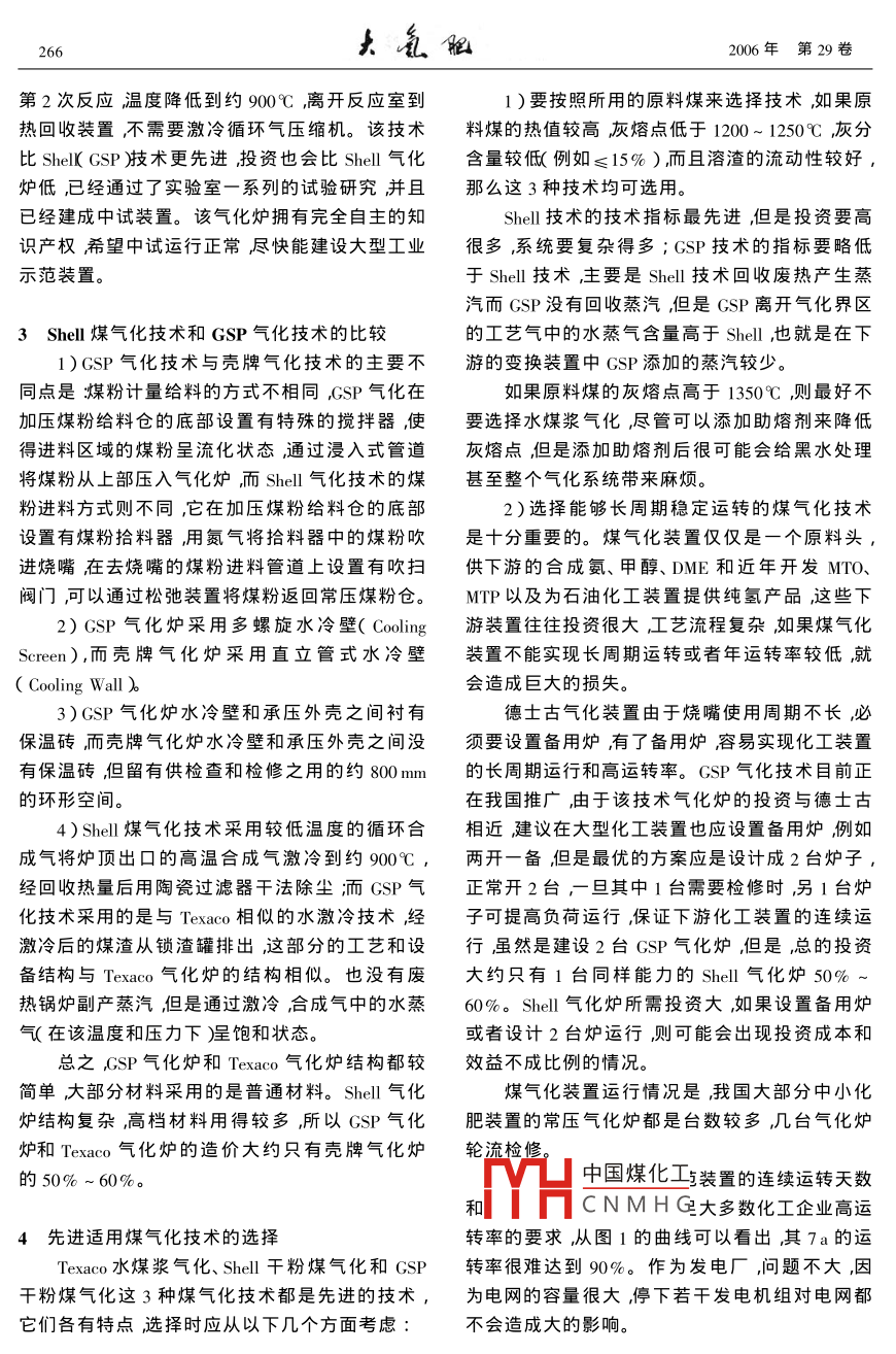 2006年8月Aug.2006第29卷第4期Large Scale Nitrogenous Fertilizer IndustryVol, 29 No, 4選擇先進適用的煤氣化技術(shù)研討王志華江蘇靈谷化工有限公司江蘇宜興214203)摘要概述幾種先進煤氣化技術(shù)的主要特點研討如何選擇先進煤氣化技術(shù),確?;ぱb置長周期穩(wěn)定運仃關(guān)鍵詞煤氣化技術(shù)特點選擇中圖分類號:Q113.24文獻標識碼:文章編號:002-578X2006040264-041石油危機引發(fā)能源結(jié)構(gòu)的調(diào)整——先進煤氣煤液化項目即煤轉(zhuǎn)化為油也有幾個大型工化技術(shù)應運而生程在建包括直接液化和間接液化。除了新建裝從20世紀70年代第一次石油危機開始,人置之外,一些原來使用油品為原料的化肥廠、化工們逐漸認識到能源對世界經(jīng)濟的穩(wěn)定和社會發(fā)展廠正在采用新型煤氣化技術(shù)改造原料路線甚至的巨大制約作用。由于伊拉克戰(zhàn)爭的爆發(fā),近3有的天然氣為原料的裝置也在進行煤氣化改造。年來石油的價格不斷上漲。如何改變?nèi)祟愐蕾囀秃吞烊粴庋泳徥秃吞烊粴赓Y源的枯竭以2應用最多的幾種先進煤氣化技術(shù)及尋求新的能源是世界各國都在致力研究的課2.1德士古( Texaco)水煤漿氣化技術(shù)題。隨著科學技術(shù)不斷的發(fā)展,到目前為止,已德士古水煤漿氣化技術(shù)是我國應用最早的先經(jīng)開發(fā)了一系列的新型能源技術(shù)和節(jié)能技術(shù)。新進技術(shù),目前投產(chǎn)裝置最多工程經(jīng)驗最豐富,它型煤氣化技術(shù)有以下共同點改變了傳統(tǒng)的、已的投資相對較低全部設備均可國產(chǎn)化由于該技經(jīng)沿用了近一個世紀的常壓煤氣化技術(shù)氣化壓術(shù)把固態(tài)的煤制成了可以泵送的液態(tài)水煤漿水力已經(jīng)提高到4.0~8.0MPa,可以大幅度降低后煤漿不僅可以像重油那樣直接作為燃料,也可作續(xù)加工工序的能耗;大幅度的提高了煤炭的利為氣化原料,而且很容易將氣化壓力提到4.0~用率,節(jié)約煤炭資源,碳的轉(zhuǎn)化率可從70%8.0MPa甚至更高,可以比其他煤氣化技術(shù)更大80%提高到94%~99%煤氣化與新興的粗煤幅度的節(jié)約合成氣的壓縮功耗氣加工技術(shù)相結(jié)合實現(xiàn)了把絕大部分對環(huán)境有水煤漿氣化技術(shù)也有它的弱點:①對煤質(zhì)有害的物質(zhì)進行脫除并且回收利用定要求煤的灰熔點不能太高、成漿性要好等在這種形勢下,我國的能源結(jié)構(gòu)也在發(fā)生深②水煤漿氣化技術(shù)比干粉煤氣化技術(shù)的消耗要高刻的變化。如何利用好煤炭作為主要能源和化工些,煤漿中含有約35%的水,這部分水在氣化原料已經(jīng)形成共識以新型煤氣化裝置為龍頭大過程中也要被汽化溫度升到1350~1400℃經(jīng)過批以煤為原料的化肥、甲醇和其他化工裝置以及激冷部分有效能損失了。因而其氧氣消耗和原煤液化項目正在熱火朝天的興建之中,其中甲醇中國煤化工高出約10%~15%不僅可以作為燃料而且還可以通過MTO和MTPCNMHG技術(shù)生產(chǎn)乙烯和丙烯。這些原來由石油為原料嘆稿日期2006-04-10作者簡介汪王志華男1944年生江蘇宜興人1967年北京化的產(chǎn)品開始實現(xiàn)以煤為原料大大降低了乙烯和工學院無機化工系畢業(yè)教授級高級工程師曾任洞庭氮肥廠總丙烯的生產(chǎn)成本,已經(jīng)在石油化工史上引發(fā)了工程師現(xiàn)任江蘇靈谷化工有限公司總工程師。聯(lián)系電話510場新的革命。此外還可生產(chǎn)清潔燃料DME等87126022E-mailwzh569(@126.come第4期王志華,選擇先進適用的煤氣化技術(shù)研討265其有效氣CO+H)只能達到80%左右碳的轉(zhuǎn)化殼之間留有600~800mm的環(huán)形檢修空間因而率只能達到96%左右1,氣化爐為熱壁爐,熱損承壓外殼直徑較大壁厚也較厚造價較高日處失較大懲氣化爐內(nèi)壁襯耐火磚限制了爐溫的提理2000煤的氣化爐外徑約4.6m,重量約6521高并且在運行時容易受到煤漿氣流的沖刷、侵蝕合成氣冷卻器質(zhì)量約420t,陶瓷過濾器外殼的直而損壞維修工作量較大德士古氣化技術(shù)的煤徑達6.8m重量約280t。由此可見,這些設備龐漿燒嘴容易損壞,~2個月就要檢査檢修。由于大運輸較困難。②煤粉輸送給料系統(tǒng)的設計也以上原因,一定程度上限制了水煤漿氣化技術(shù)的很復雜,開工和運行比較困難。③由于上述的復應用。雜和龐大使得氣化裝置投資相對大很多。2.2殼牌( Shell凇粉煤氣化技術(shù)2.3德國未來能源公司粉煤氣化技術(shù)(GSP)殼牌(Shel)粉煤氣化技術(shù)是20世紀90年代德國未來能源公司推出的GsP氣化技術(shù),氣中期開始推廣的,它采用直列管膜式水冷壁化爐的水冷壁( Cooling screen)為多螺旋盤管型〔 Cooling Wal〕在氣化爐的下部成對布置煤粉燒采用頂部設置煤粉噴嘴爐頂?shù)母邷胤雷o設計簡嘴煤粉、氧氣和蒸汽均由燒嘴噴λ爐內(nèi),氣化溫單可靠,GSP氣化爐的水冷壁和壓力外殼之間有度可高達1500~1700℃,氣化爐的水冷壁內(nèi)壁上一層隔熱保溫層水冷壁和壓力外殼之間沒有空凃有10~15mm厚的耐高溫碳化硅涂料,當爐內(nèi)間因而氣化爐的承壓外殼直徑較小造價較低高溫熔渣飛濺到溫度只有250~350℃的水冷壁的運輸容易碳化硅涂層上時迅速凝結(jié)成固態(tài)渣隨著固態(tài)渣GSP氣化爐的反應條件與殼牌爐幾乎一樣。層的增厚熔渣不能再繼續(xù)凝固而順著固態(tài)渣壁在水冷壁的內(nèi)表面上