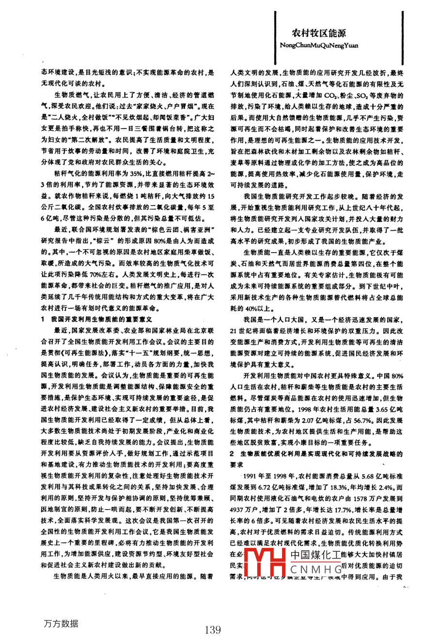 農(nóng)村牧區(qū)能源論生物質(zhì)能技術(shù)應(yīng)用與推廣張碧娜毛艷(遼寧金碧新能源開發(fā)工程有服公司)摘要]本文概邇生物質(zhì)能及其應(yīng)用技術(shù)在我國(guó)能源建設(shè)方面的重要性,根據(jù)我國(guó)農(nóng)村的實(shí)際情況和高品位優(yōu)質(zhì)能源的需求形勢(shì),指出開發(fā)利用生物質(zhì)能及其技術(shù)在我國(guó)尤其是在農(nóng)村地區(qū)實(shí)現(xiàn)可持續(xù)發(fā)展戰(zhàn)略的重要意義,以及在社會(huì)主義新農(nóng)村建設(shè)中的重要作用,提出了未來(lái)發(fā)展生物質(zhì)能技術(shù)的可行性建議。[關(guān)鍵詞]生物質(zhì)能能源氣化技術(shù)然氣以為改善農(nóng)村生態(tài)環(huán)境、促進(jìn)農(nóng)村城市化和現(xiàn)代化進(jìn)程做出我國(guó)是一個(gè)農(nóng)業(yè)大國(guó),擁有豐富的生物質(zhì)資源每年可巨大的貢獻(xiàn)。改革開放以來(lái)我國(guó)農(nóng)村發(fā)生了巨大的變化,農(nóng)利用的農(nóng)作物秸秤的總產(chǎn)量約65億噸,相當(dāng)于39億噸標(biāo)民生活水平不斷提高富裕起來(lái)的農(nóng)民迫切希望改變傳統(tǒng)煙準(zhǔn)煤。目前部分用于飼料和燃料(原始直燒方式)絕大部分熏火燎的炊事方式,早日用上和“城里人”一樣優(yōu)質(zhì)、清潔的未得到合理利用。甚至隨時(shí)隨地焚燒秸秤現(xiàn)象屢禁不止。為商品能源。應(yīng)對(duì)能源短缺、環(huán)境污染、破壞生態(tài)的挑戰(zhàn),國(guó)家把“生物質(zhì)然而我國(guó)有9億農(nóng)村人口,人均資源擁有量較低,完全氣化"列人了“八五”“九五”攻關(guān)項(xiàng)目,并于2005年頒布了依靠液化石油氣和煤炭等常規(guī)能源來(lái)解決農(nóng)村商品用能問(wèn)“可再生能源法”。利用生物質(zhì)氣化集中供氣技術(shù)將秸稈等農(nóng)題是不現(xiàn)實(shí)的而且造成的污染也是環(huán)境難以承受的??梢詷I(yè)廢棄物轉(zhuǎn)變?yōu)闈崈舻目扇細(xì)怏w作為農(nóng)民的炊事和采暖用說(shuō),作為時(shí)代發(fā)展的必然產(chǎn)物,中國(guó)農(nóng)村正在呼喚著一場(chǎng)農(nóng)能既可以利用我國(guó)豐富的生物質(zhì)資源,又極大地提高了廣村能源革命。按照黨中央關(guān)于加快生態(tài)環(huán)境建設(shè),實(shí)現(xiàn)農(nóng)業(yè)大農(nóng)民的生活水平有利于實(shí)現(xiàn)小康社會(huì)的目標(biāo)。同時(shí)也可可持續(xù)發(fā)展戰(zhàn)略的科學(xué)論斷,可以毫不夸張地說(shuō),不注重生法》設(shè)立了資金專賬,嚴(yán)格資金的管理。實(shí)行了項(xiàng)目法人負(fù)跟不上除了不產(chǎn)氣反倒生了一肚子氣。為切實(shí)做到“三分責(zé)制按照基本建設(shè)財(cái)務(wù)管理的規(guī)定對(duì)項(xiàng)目資金實(shí)行專戶、建,七分管”建立長(zhǎng)效服務(wù)機(jī)制使沼氣池能多產(chǎn)氣,少出問(wèn)專人管理、專賬核算。設(shè)備、物料款由項(xiàng)目實(shí)施單位按照招標(biāo)題,提高運(yùn)行質(zhì)量和效益。我們?cè)诟鱾€(gè)項(xiàng)目村委托了專門的采購(gòu)的合同價(jià)款報(bào)賬付款,技工費(fèi)用由項(xiàng)目實(shí)施單位驗(yàn)收后農(nóng)民技術(shù)員開展建后服務(wù),采取上級(jí)投資和農(nóng)戶自籌相結(jié)報(bào)賬付款,從而建立了一套嚴(yán)格的財(cái)務(wù)制度,杜絕了項(xiàng)目款合采取有償服務(wù),使沼氣生產(chǎn)逐步向物業(yè)化管理、市場(chǎng)化運(yùn)被挪用、擠占的現(xiàn)象。行、社會(huì)化服務(wù)的方向轉(zhuǎn)變。此外,旗農(nóng)牧局能源站也派出技25注重多項(xiàng)目結(jié)合,完善軟硬件建設(shè)術(shù)人員巡回開展免費(fèi)服務(wù),切實(shí)把沼氣的后期管理與服務(wù)抓察右前旗在項(xiàng)目的規(guī)劃布局上,堅(jiān)持多項(xiàng)目捆綁實(shí)施。好抓實(shí),為建池戶提高綜合效益發(fā)揮沼氣項(xiàng)目建設(shè)的社會(huì)、明確提出沼氣項(xiàng)目的建設(shè)要與設(shè)施農(nóng)業(yè)、沙源治理項(xiàng)目、暖生態(tài)、經(jīng)濟(jì)綜合效益。棚建設(shè)、退耕還林工程等密切結(jié)合。特別是在選址上,堅(jiān)持要3存在的問(wèn)題及建議有良好的群眾基礎(chǔ)和經(jīng)濟(jì)實(shí)力,要有相對(duì)集中的勞力,具備在項(xiàng)目實(shí)施過(guò)程中,我們也遇到一些難以克服的困難和發(fā)展沼氣產(chǎn)業(yè)的信心,群眾有傳統(tǒng)養(yǎng)畜習(xí)慣,村容村貌整潔問(wèn)題需要上級(jí)給予幫助和支持。等。在軟件建設(shè)上,農(nóng)牧局生態(tài)能源站專門制作了《實(shí)施方(1)確定項(xiàng)目時(shí),對(duì)于實(shí)施項(xiàng)目的村規(guī)定得過(guò)硬,80%的案》(管理制度》《技術(shù)方案》《操作規(guī)程)等相關(guān)軟件;戶用沼普及率過(guò)高。建議在今后批復(fù)時(shí)最小實(shí)施區(qū)域能以縣或鄉(xiāng)、氣申報(bào)表、項(xiàng)目戶合同書用戶檔案全部進(jìn)行分類存檔;每隔鎮(zhèn)為單位下達(dá)指標(biāo)以便我們能靈活掌握主動(dòng),充分調(diào)動(dòng)農(nóng)十五天編發(fā)一期《沼氣工作簡(jiǎn)報(bào)》對(duì)沼氣建設(shè)的進(jìn)展情況進(jìn)戶建池積極性。行總結(jié),并及時(shí)在《生態(tài)家園》網(wǎng)上填報(bào)進(jìn)度。同時(shí)還配