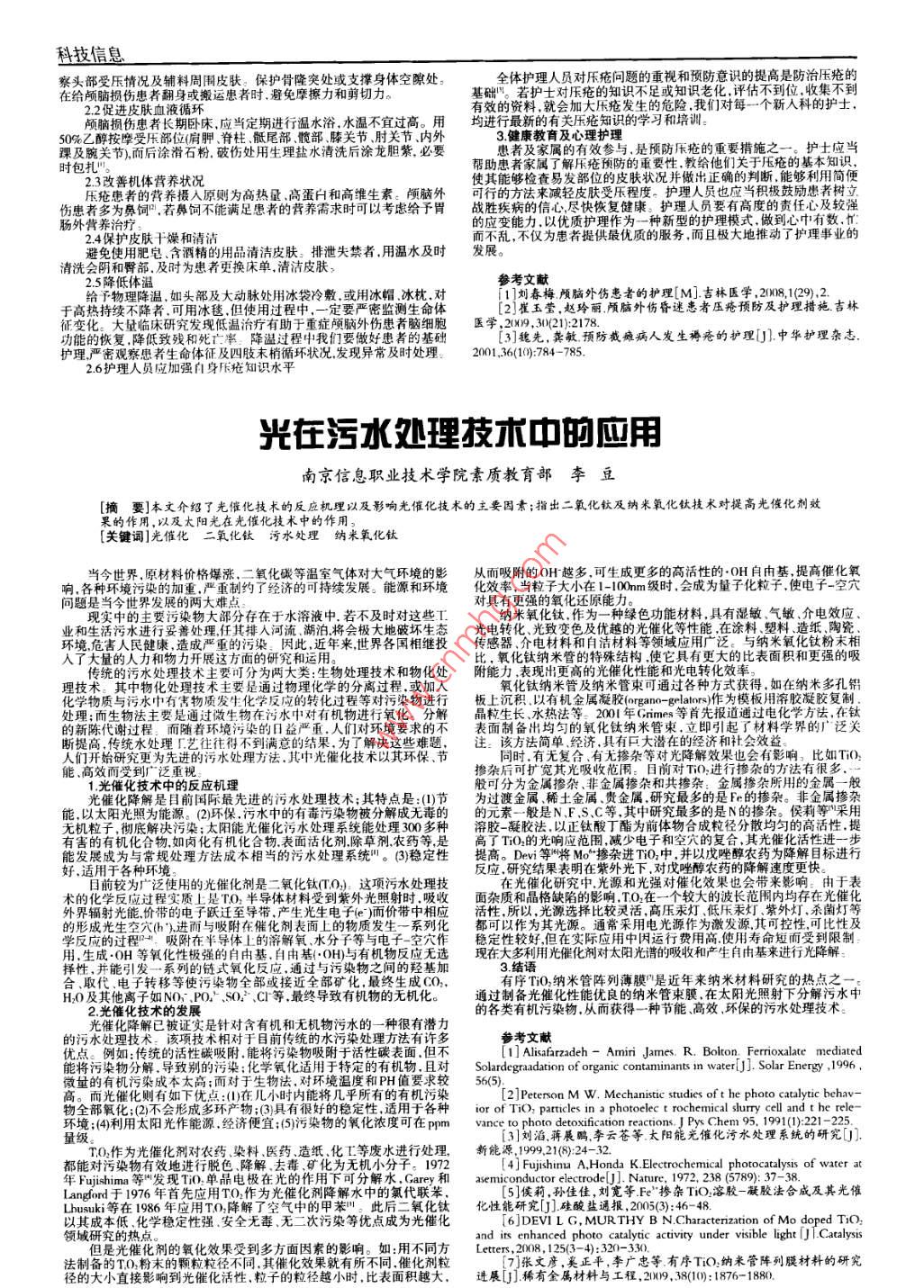科技信息察頭部受壓情況及輔料周?chē)つw。保護(hù)骨隆突處或支撐身體空隙處。全體護(hù)理人員對(duì)壓瘡問(wèn)題的重視和預(yù)防意識(shí)的提高是防治壓瘡的在給顱腦損傷患者翻身或搬運(yùn)患者時(shí)避免摩擦力和剪切力。基礎(chǔ)"。若護(hù)士對(duì)壓瘡的知識(shí)不足或知識(shí)老化,評(píng)估不到位,收集不到22促進(jìn)皮膚血液循環(huán)有效的資料,就會(huì)加大壓瘡發(fā)生的危險(xiǎn),我們對(duì)每一個(gè)新入科的護(hù)士顱腦損傷患者長(zhǎng)期臥床應(yīng)當(dāng)定期進(jìn)行溫水浴,水溫不宜過(guò)高。用均進(jìn)行最新的有關(guān)壓瘡知識(shí)的學(xué)習(xí)和培訓(xùn)%乙醇按摩受壓部位(肩胛、脊柱、骶尾部髖部、膝關(guān)節(jié)肘關(guān)節(jié)、內(nèi)外3健康教育及心理護(hù)理踝及腕關(guān)節(jié),而后涂滑石粉破傷處用生理鹽水清洗后涂龍膽紫必要患者及家屬的有效參與,是預(yù)防壓瘡的重要措施之一。護(hù)土應(yīng)當(dāng)時(shí)包扎"幫助患者家屬了解壓瘡預(yù)防的重要性教給他們關(guān)于壓瘡的基本知識(shí)23改善機(jī)體營(yíng)養(yǎng)狀況使其能夠檢查易發(fā)部位的皮膚狀況并做出正確的判斷能夠利用簡(jiǎn)便壓瘡患者的營(yíng)養(yǎng)攝入原則為高熱量、高蛋白和高維生素。顱腦外可行的方法來(lái)減輕皮膚受壓程度。護(hù)理人員也應(yīng)當(dāng)積極鼓勵(lì)患者樹(shù)立傷患者多為鼻飼若鼻飼不能滿足患者的營(yíng)養(yǎng)需求時(shí)可以考慮給予胃戰(zhàn)勝疾病的信心盡快恢復(fù)健康。護(hù)理人員要有高度的責(zé)任心及較強(qiáng)楊外營(yíng)養(yǎng)治的應(yīng)變能力以優(yōu)質(zhì)護(hù)理作為一種新型的護(hù)理模式,做到心中有數(shù),忙24保護(hù)皮膚十燥和清潔而不亂,不僅為患者提供最優(yōu)質(zhì)的服務(wù),而且極大地推動(dòng)了護(hù)理事業(yè)的避免使用肥皂含酒精的用品清潔皮膚:排泄失禁者用溫水及時(shí)發(fā)展。清洗會(huì)陰和臀部,及時(shí)為患者更換床單,清潔皮膚25降低體溫參考文獻(xiàn)給予物理降溫,如頭部及大動(dòng)脈處用冰袋冷敷或用冰帽冰枕,對(duì)i1]劉春梅顱腦外傷患者的護(hù)理[M吉林醫(yī)學(xué),208,1(29),2于高熱持續(xù)不降者可用冰毯但使用過(guò)程中,一定要嚴(yán)密監(jiān)測(cè)生命體2]崔玉瑩,趙玲麗顱腦外傷昏迷患者壓瘡預(yù)防及護(hù)理措施吉林征變化:大量臨床研究發(fā)現(xiàn)低溫治疔有助于重癥顱腦外傷患者腦細(xì)胞醫(yī)學(xué),29,30121:2178功能的恢復(fù),降低致殘和死亡率:降溫過(guò)程中我們要做好患者的基礎(chǔ)3]魏先,龔敏預(yù)防截癱病人發(fā)生褥瘡的護(hù)理門(mén)J中華護(hù)理雜志護(hù)理嚴(yán)密觀察患者生命體征及四肢末梢循環(huán)狀況發(fā)現(xiàn)異常及時(shí)處理200136(1:784-78526護(hù)理人員應(yīng)加強(qiáng)自身壓瘡知識(shí)水平光在污水逃理技立印的四用南京信息職業(yè)技術(shù)學(xué)院素質(zhì)教育部李豆[摘要]本文介紹了光催化技木的反應(yīng)機(jī)理以及影響光催化技術(shù)的主要因素;指岀二氧化鈦及納米氧化鈦技術(shù)對(duì)提高光催化劑效果的作用,以及太陽(yáng)光在光催化技術(shù)中的作用[關(guān)鍵詞]光催化二氧化鈦污水處理納米氧化鈦當(dāng)今世界,原材料價(jià)格爆漲,二氧化碳等溫室氣體對(duì)大氣環(huán)境的影從而吸附的OH越多,可生成更多的高活性的OH自由基,提高催化氧響,各種環(huán)境污染的加重,嚴(yán)重制約了經(jīng)濟(jì)的可持續(xù)發(fā)展。能源和環(huán)境化效率,當(dāng)粒子大小在1-100m級(jí)時(shí),會(huì)成為量子化粒子使電子空穴問(wèn)題是當(dāng)今世界發(fā)展的兩大難點(diǎn)對(duì)具有更強(qiáng)的氧化還原能力現(xiàn)實(shí)中的主要污染物大部分存在于水溶液中.若不及時(shí)對(duì)這些米氧化鈦,作為一種綠色功能材料,具有濕敏、氣敏介電效應(yīng)業(yè)和生活污水進(jìn)行妥善處理任其排入河流湖泊將會(huì)極大地破壞生態(tài)光電轉(zhuǎn)化、光致變色及優(yōu)越的光涂料、塑料、造紙、陶瓷環(huán)境危害人民健康,造成嚴(yán)重的污染:因此,近年來(lái),世界各國(guó)相繼投傳感器、介電材料和自潔材料入了大量的人力和物力開(kāi)展這方面的研究和運(yùn)用比,氧化鈦納米管的特殊結(jié)構(gòu),使它具有更大的比表面積和更強(qiáng)的吸傳統(tǒng)的污水處理技術(shù)主要可分為兩大類:生物處理技術(shù)和物化處附能力表現(xiàn)出更高的光催化性能和光電轉(zhuǎn)化效率米多孔鋁化學(xué)物質(zhì)與污水中有害物質(zhì)發(fā)生化學(xué)反應(yīng)的轉(zhuǎn)化過(guò)程等對(duì)污染物進(jìn)行板上沉積以有機(jī)金屬凝膠 (organo- gelators)作為模板用凝膠復(fù)制處理;而生物法主要是通過(guò)微生物在污水中對(duì)有機(jī)物進(jìn)行氧化:分解品粒生長(zhǎng)水熱法等:2001年 Grimes等首先報(bào)道通過(guò)電化學(xué)方法,在釷的新陳代謝過(guò)程:而隨著環(huán)境污染的日益嚴(yán)重,人們對(duì)環(huán)境要求的不表面制備出均勻的氧化鈦納米管束,立即引起了材料學(xué)界的廣泛關(guān)斷提高,傳統(tǒng)水處理「人們開(kāi)始研究更為先進(jìn)的污水處理方法,其中光催化技術(shù)