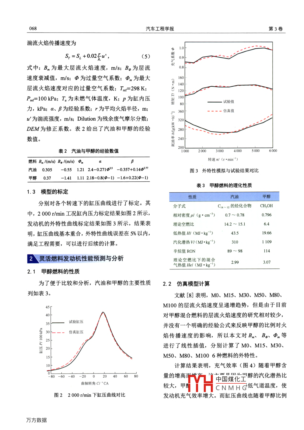 第3卷第1期汽車工程學報Vol 3 No. 12013年1月Chinese Journal of Automotive engineeringJan.2013甲醇靈活燃料發(fā)動機數(shù)值仿真李釗',倪計民',齊洪元,2,嚴治國1,陳明3,張小矛(1.同濟大學汽車學院,上海201804;2.上海汽車集團股份有限公司商用車公司,上海2004383.上海汽車集團股份有限公司乘用車公司,上海201804)摘要:針對某款15L可變進氣凸輪正時( Variable Cam Timing,vCT)甲醇靈活燃料發(fā)動機的前期開發(fā)過程進行了仿真計算。首先進行了原汽油機的模型標定,并考慮到了火焰?zhèn)鞑ニ俣?在不改變原機結構的情況下對靈活燃料發(fā)動機的性能進行了預測。結果表明,隨著甲醇比例的增大,發(fā)動機的動力性逐步提高,比油耗( Brake Specific Fuel Consumption,BSFC)也相應提高,但是熱效率增大。最后,建立了發(fā)動機動力性和經(jīng)濟性的綜合評價體系,對M100燃料的節(jié)氣門全開(woT)工況進行了基于模型的標定優(yōu)化。結果表明,耗油率有顯著下降,熱效率顯著提高,優(yōu)化效果明顯。關鍵詞:靈活燃料;數(shù)值仿真;試驗設計(DoE);優(yōu)化中圖分類號:TK464文獻標識碼:ADO:10.3969/issn.2095-14692013.01.11Numerical Simulation of Methanol Flexible Fuel EngineLi Zhao, Ni Jimin,, Qi Hongyuan, Yan Zhiguo", Chen Ming, Zhang Xiaomao(1. School of Automobile, Tongji University, Shanghai 201804, China2. SAIC Motor CVTC, Shanghai 200438, China; 3. SAIC Motor LLC, Shanghai 201804, China)Abstract: The simulations for a 1.5 L variable cam timing (VcT)methanol flexible fuel engine were carriedout during its pre-development process. Firstly, in consideration of the laminar flame speed and turbulentflame speed, the engine model was calibrated, and engine performance was predicted by a new engine modelwhose fuel was replaced by the methanol flexible fuel. The results show that, with the increasing proportionof methanol, the engine torque would be increased, as well as the brake specific fuel consumption (BSFC)however, the thermal efficiency was also raised. Finally, in consideration of the engine dynamic and economicerformance, a comprehensive evaluation system was established and the model based calibration of m100 wideopen throttle(wot)driving cycle was carried out. As a consequence, the BSFC was decreased obviously andthe thermal efficiency was increased considerablKey words: flexible fuel; numerical simulation; design of examination (DoE);optimization自20世紀70年代以來,由于石油危機以及汽活燃料汽車(FFV),在解決使用中發(fā)現(xiàn)的問題并車污染的日趨嚴重,國外對醇燃料進行了大規(guī)模的對其進行改進的過程中積累了寶貴的經(jīng)驗。研究,并且在不同車輛上取得了不同程度的推廣及我國原國家科委在“七五”期間設立了“M100應用-23。由于考慮到生產(chǎn)甲醇的原料較豐富,價甲醇燃料應用技術”項目,在國產(chǎn)汽車上進行試驗格又比乙醇低,所以主要研究開發(fā)甲醇燃料以及靈研究,然后中國煤化工非放、潤滑、汽CNMHG收稿日期:2012-09-24第1期李釗等:甲醇靈活燃料發(fā)動機數(shù)值仿真067車實際使用等試驗研究;山西云岡汽車集團公司也1.2發(fā)動機建模在車用汽油機的基礎上開發(fā)成功M00發(fā)動機;GT- Power一維仿真模型如圖1所示。西安交通大學和天津大學分別對靈活燃料缸內(nèi)直噴模型包括進氣系統(tǒng)、排氣系統(tǒng)、氣缸、曲柄發(fā)動機和甲醇H燃燒特性與排放進行了研究6。連桿機構等。其中發(fā)動機結構參數(shù)、空燃比、配氣本文針對靈活燃料發(fā)動機的前期開發(fā),使用一相位等直接輸入到模型中,在管內(nèi)流體計算上,用款國產(chǎn)15LVCT發(fā)動機,進行了甲醇靈活燃料發(fā)維非定常流動來代替實際復雜的三維流動,用動機的數(shù)值仿真研究,針對M100燃料的WTo工 Woschni傳熱模型來計算發(fā)動機的傳熱,在燃燒方?jīng)r進行了基于模型的標定,對點火提前角以及過量面,采用湍流火焰?zhèn)鞑ツP涂諝庀禂?shù)進行了優(yōu)化,為靈活燃料發(fā)動機的前期開1.2.1湍流火焰?zhèn)鞑ツP桶l(fā)提供了依據(jù)。湍流火焰?zhèn)鞑ツP涂紤]到了氣缸的尺寸,點火發(fā)動機數(shù)值模型的建立與標定提前角、氣流運動和燃料性質(zhì)。進入火焰前鋒的質(zhì)量卷吸率和燃燒速率可以由以下幾個方程來表示。1.1發(fā)動機基本參數(shù)質(zhì)量卷吸率:發(fā)動機的基本參數(shù)見表1。Ae(S+sn)表11.5LV0T發(fā)動機參數(shù)缸徑B/mm質(zhì)量燃燒速率:沖程S/mm84.8dM,M。-M1最大轉矩TN·m135(5000r/min最大功率P/kW78(6000r/min)并且壓縮比VCT型式進氣排氣雙CT(3)式中:M為未燃混合氣卷吸質(zhì)量,kg;p為未燃混合氣密度,g/cm3;A為火焰前鋒面積,m2;Sr為湍流火焰速度,kg:S2為層流火焰速度,kg;M為燃混合氣質(zhì)量,kg;τ為時間常數(shù),s;λ為 Taylor微尺度,從式(1)~(3)中可知,卷入火焰前鋒的未燃混合氣的速率與湍流火焰速度和層流火焰速度之和成正比,燃燒速率與未燃混合氣質(zhì)量成正比,比例為時間常數(shù)r(s)的倒數(shù),時間常數(shù)為 Taylor微尺度比層流火焰速度。其中,火焰?zhèn)鞑ニ俣葹閷恿骰鹧嫠俣扰c湍流火焰速度之和,且層流火焰?zhèn)鞑ニ俣惹袨橄暺髋c催化器,8YH國化圖115 L VCT GT- power發(fā)動機模型(1-2.06(Dilution)(4)068汽車工程學報第3卷湍流火焰?zhèn)鞑ニ俣葹镾=S4+002v',(5)式中:Bn為最大層流火焰速度,m/s;B為層流速度衰減值,m/s;中為過量空氣系數(shù);φn為最大層流火焰速度對應的過量空氣系數(shù);Tm=298K;Pmr=100kPa;T為未燃氣體溫度,K;p為缸內(nèi)壓試