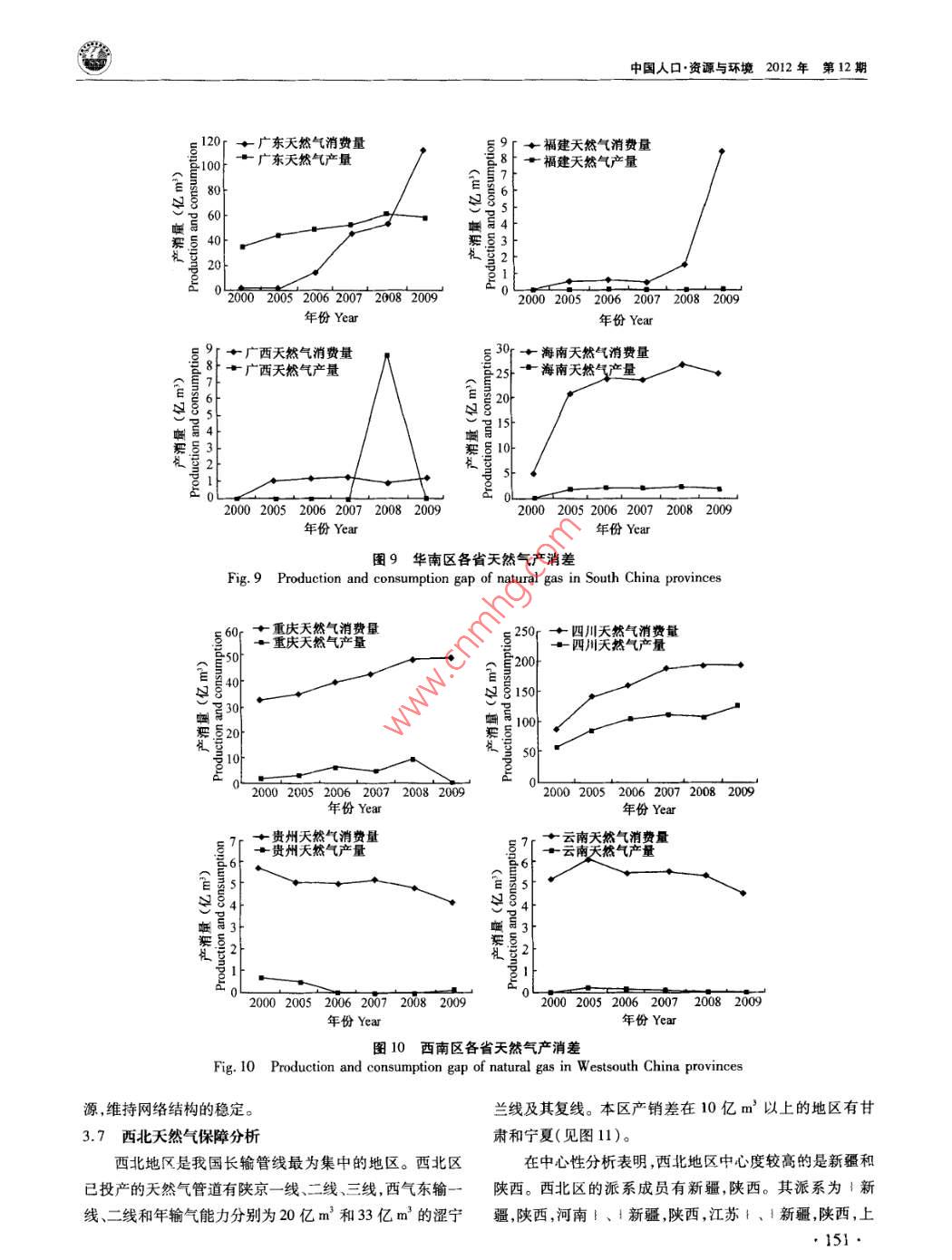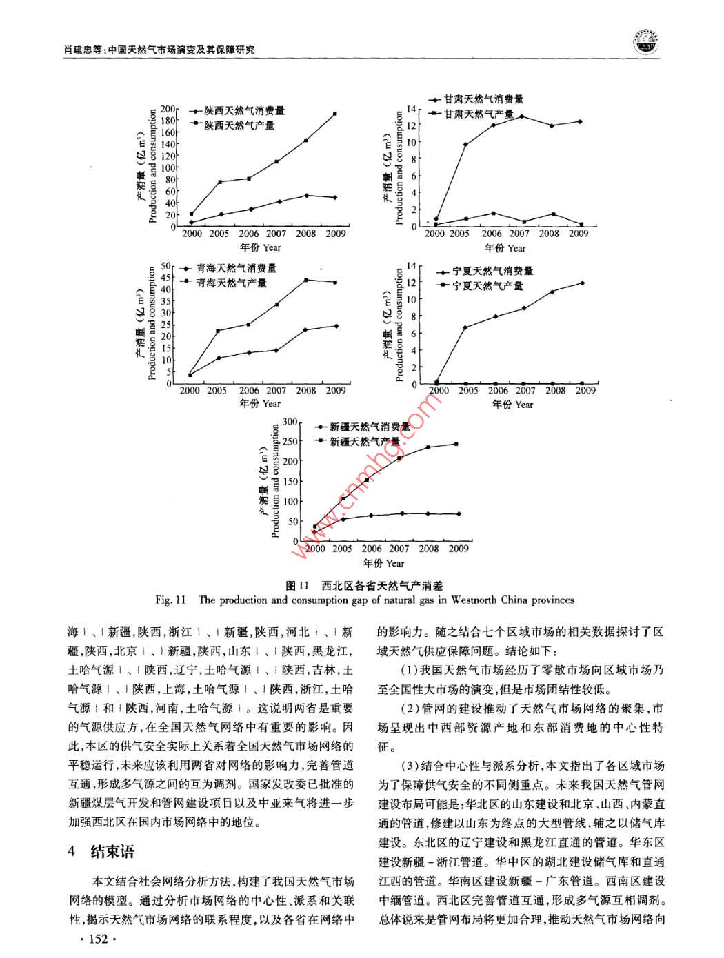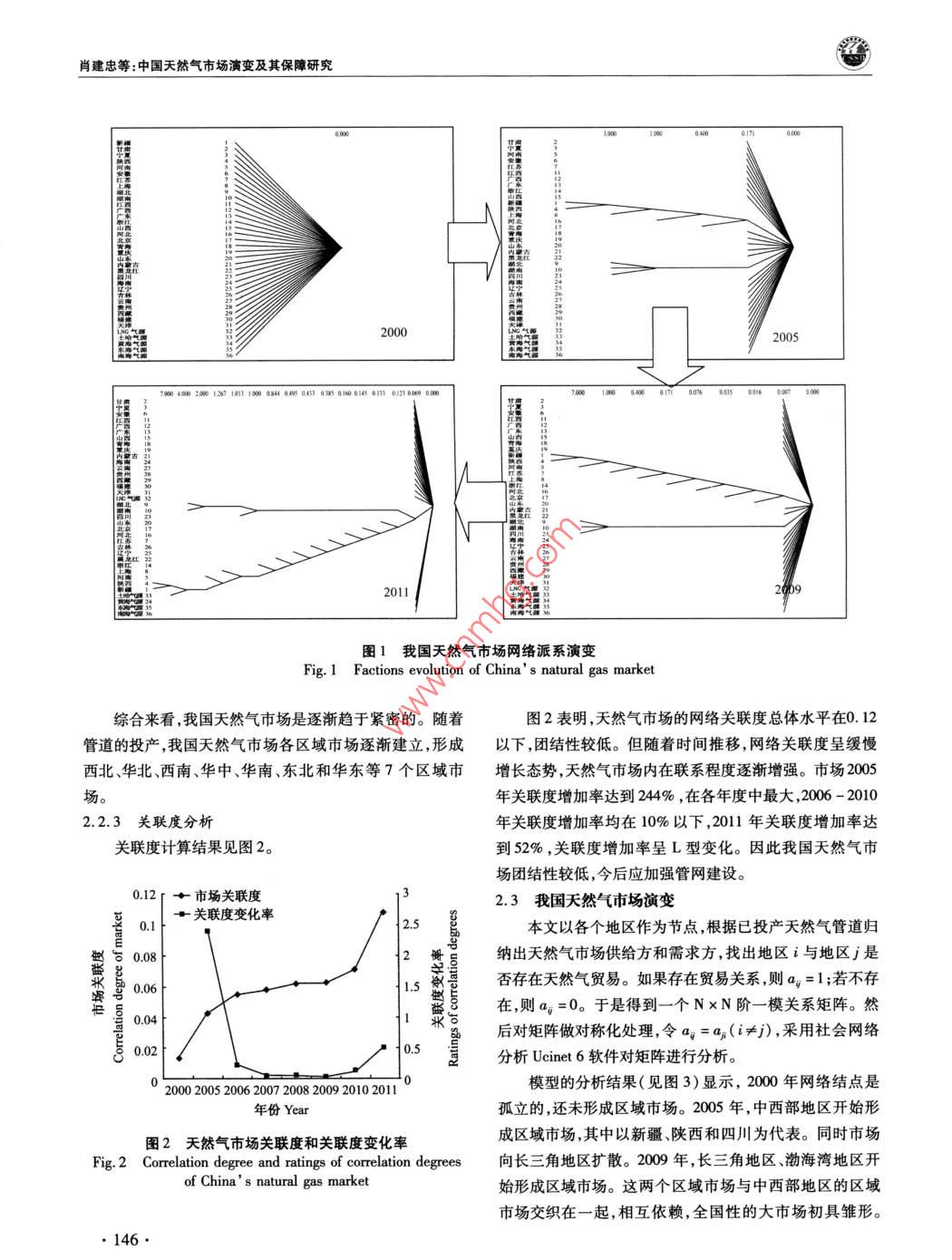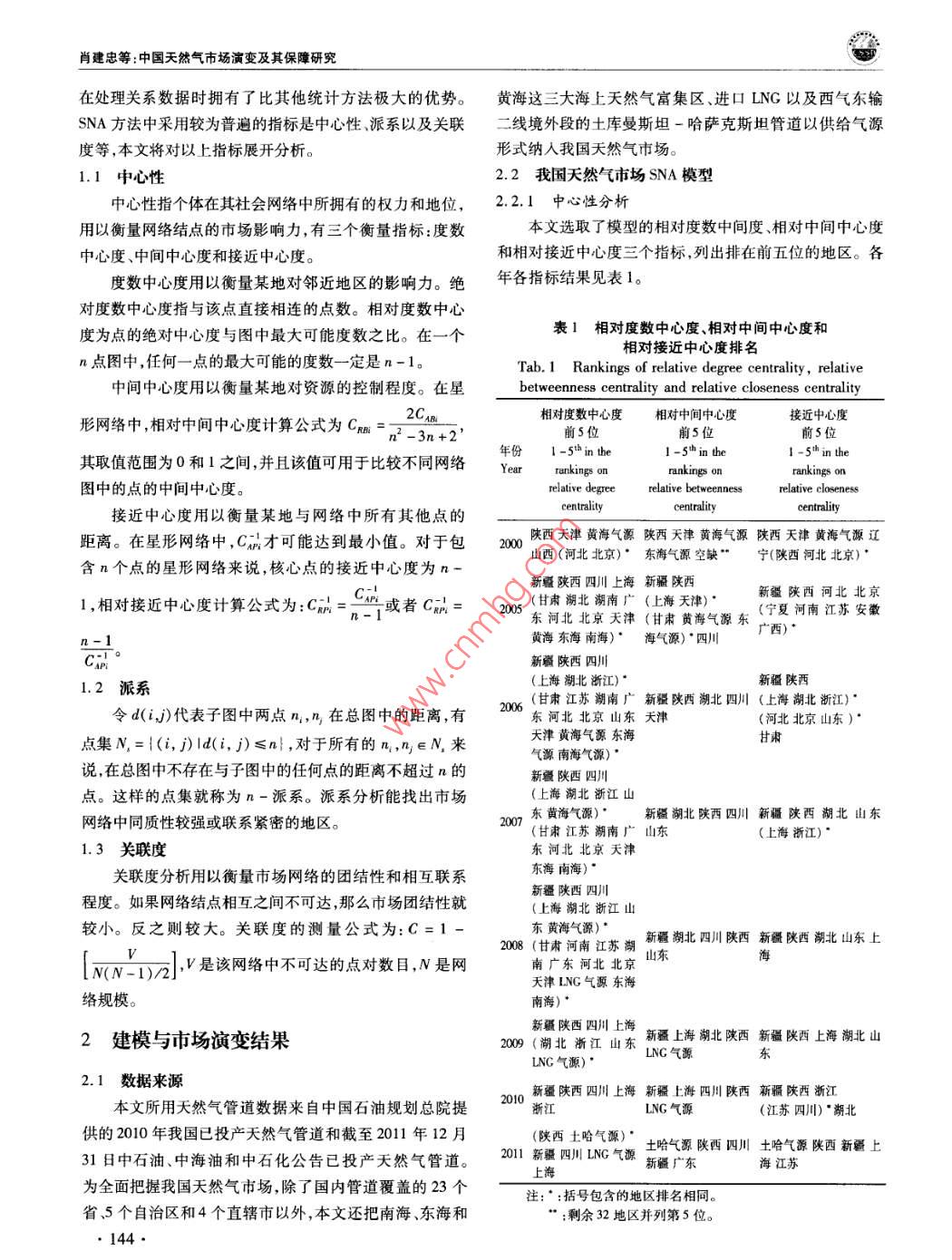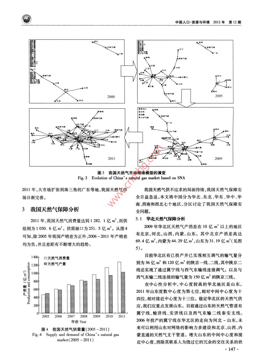 中國人口·資源與環(huán)境2012年第22卷第12期 CHINA POPULATION, RESOURCES AND ENVIRONMENT Vol22N0.122012中國天然氣市場演變及其保障研究肖建忠胡超王小林成金華(中國地質(zhì)大學(xué)經(jīng)濟(jì)管理學(xué)院,湖北武漢430074)摘要隨著我國天然氣市場快速發(fā)展,覆蓋全國的天然氣管網(wǎng)初具雛形。針對天然氣供需缺口問題,文章利用社會網(wǎng)絡(luò)分析方法SNA)分析我國天然氣市場貿(mào)易關(guān)系的經(jīng)驗(yàn)特征和演變規(guī)律。分析結(jié)果表明:管網(wǎng)的建設(shè)推動了天然氣市場網(wǎng)絡(luò)的聚集,市場呈現(xiàn)出中西部資源產(chǎn)地和東部消費(fèi)地的中心性特征。我國天然氣市場經(jīng)歷了零散市場向區(qū)域市場乃至全國性大市場的演變,市場關(guān)聯(lián)度從2000年的0.0127上升至2011年的0.1072。我國應(yīng)著手建設(shè)以下管道,使管網(wǎng)布局更趨合理:華北區(qū)的山東建設(shè)和北京、山西、內(nèi)蒙直通的管道,修建以山東為終點(diǎn)的大型管線,輔之以儲氣庫建設(shè);東北區(qū)的遼寧建設(shè)和黑龍江直通的管道;華東區(qū)建設(shè)新疆-浙江管道;華中區(qū)的湖北建設(shè)儲氣庫和直通江西的管道;華南區(qū)的建設(shè)新疆-廣東管道;西南區(qū)建設(shè)中緬管道;西北區(qū)建設(shè)聯(lián)絡(luò)線完善管道互通。關(guān)鍵詞天然氣管道;市場演變;市場保障;社會網(wǎng)絡(luò)分析中圖分類號TE8文獻(xiàn)標(biāo)識碼A文章編號1002-2104(2012)12-0143-11doi:10.3969/Jisn1002-21042012.12.023管網(wǎng)設(shè)施是市場快速發(fā)展的基礎(chǔ)。近年來我國天然楊建紅劉小麗等梳理了整個天然氣行業(yè)現(xiàn)狀和發(fā)展氣管網(wǎng)發(fā)展迅速,已經(jīng)初步形成以西氣東輸一線、西氣東趨勢;張耀光等研究了我國LNG產(chǎn)業(yè)的發(fā)展;蒲明”等輸二線、川氣東送和陜京線系統(tǒng)等管道為骨干,以蘭銀線、介紹了一些我國天然氣管道上取得的進(jìn)展。所有這些表淮武線、冀寧線為聯(lián)絡(luò)線的國家級天然氣骨干管網(wǎng)。明,綜合考察管網(wǎng)、資源和市場的研究還稍顯薄弱。天然氣商品不同于一般商品,它具有管網(wǎng)依賴性。管本文以2000年以來我國天然氣管網(wǎng)建設(shè)為基礎(chǔ),以網(wǎng)是連接資源與市場的物理紐帶,在一定程度上,天然氣管網(wǎng)輸氣數(shù)據(jù)為對象,采用社會網(wǎng)絡(luò)分析(SNA)方法研究公司管網(wǎng)觸及之處就是市場開拓之時。因此,管網(wǎng)系統(tǒng)是我國天然氣市場的演變過程和供應(yīng)保障,并提出管網(wǎng)鋪設(shè)天然氣從源輸送到用戶的最有效方法,對天然氣市場的研的具體方向。究必須結(jié)合管網(wǎng),綜合分析資源供給、市場消費(fèi)與管道建設(shè)的特征。2000年之前,天然氣市場的研究大都是在做1社會網(wǎng)絡(luò)分析模型資源評價時輔以提及,例如戴金星。2001年湯亞利2社會網(wǎng)絡(luò)分析(SNA)被廣泛地應(yīng)用于社會經(jīng)濟(jì)系統(tǒng)從管道的角度開始研究天然氣市場。2002年西氣東輸項(xiàng)諸如市場、產(chǎn)業(yè)、貿(mào)易關(guān)系等都可以視為一種網(wǎng)絡(luò)。網(wǎng)絡(luò)目開工后,國內(nèi)對天然氣市場的研究開始升溫。如徐永分析能夠從整體上把握市場格局與貿(mào)易關(guān)系的演化,目前昌3對西氣東輸項(xiàng)目的天然氣供應(yīng)保障的研究。2004年已發(fā)展出專門的概念體系和測算工具。社會網(wǎng)絡(luò)分析方隨著西氣東輸項(xiàng)目的投產(chǎn),一批學(xué)者開始從市場供求角度法被證明是一種有效的分析貿(mào)易關(guān)系的工具,例如K分析天然氣市場。張淑英4等研究了我國天然氣的消費(fèi) Bhattacharya和 Fagiolo-12對國際貿(mào)易領(lǐng)域的社會網(wǎng)市場;李華啟5等研究了中西部地區(qū)天然氣的利用問題;絡(luò)研究。社會網(wǎng)絡(luò)分析不需要設(shè)定變量獨(dú)立性假設(shè)。這收稿日期::2012-08-15作者簡介:肖建忠,教授,主要研究方向?yàn)閼?yīng)用經(jīng)濟(jì)學(xué)能源經(jīng)濟(jì)學(xué)通訊作者:胡超,研究生,主要研究方向?yàn)槔碚摻?jīng)濟(jì)學(xué)、能源經(jīng)濟(jì)學(xué)基金項(xiàng)目:博士后基金“天然氣產(chǎn)運(yùn)銷調(diào)峰策略優(yōu)化研究”(編號:2011M501262);教育部人文社科基金“天然氣產(chǎn)運(yùn)銷調(diào)峰信號提取及策略優(yōu)化研究”(編號:11YJC630211);中央高校基金“天然氣產(chǎn)銷運(yùn)行優(yōu)化調(diào)度理論與方法研究”(編號:CUGW090228);中央高?;稹盎诩钕嗳荨狢AS的天然氣企業(yè)上下游利益協(xié)調(diào)機(jī)制研究”(編號:CUGW090202);中央高?;饟u籃計劃“基于CAS激勵相容的天然氣產(chǎn)業(yè)鏈產(chǎn)運(yùn)銷利益協(xié)調(diào)機(jī)制研究”(編號:CUG110415);開放基金“天然氣產(chǎn)運(yùn)銷調(diào)峰策略優(yōu)化研究”(編號:2011B∞014)。肖建忠等:中國天然氣市場演變及其保障研究在處理關(guān)系數(shù)據(jù)時擁有了比其他統(tǒng)計方法極大的優(yōu)勢。黃海這三大海上天然氣富集區(qū)、進(jìn)口LNG以及西氣東輸SNA方法中采用較為普遍的指標(biāo)是中心性、派系以及關(guān)聯(lián)二線境外段的土庫曼斯坦-哈薩克斯坦管道以供給氣源度等,本文將對以上指標(biāo)展開分析。形式納入我國天然