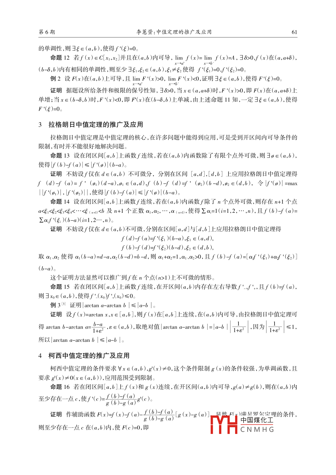 第33卷第6期佛山科學技術(shù)學院學報(自然科學版)Vol 33 No62015年11月Journal of Foshan University( Natural Sciences Edition)Nov.2015文章編號:1008-0171(2015)06-0059-05中值定理的推廣及應用李蕙萱(黎明職業(yè)大學公共教學部,福建泉州362000摘要:主要對數(shù)學分析教材中的費馬定理、羅爾中值定理、拉格朗日中值定理、柯西中值定理和泰勒定理進行了較全面地推廣,并通過舉例說明了這些定理在函數(shù)的單調(diào)性、極值、極限、證明不等式和恒等式等方面的應用。關(guān)鍵詞:費馬定理;羅爾中值定理;拉格朗日中值定理;柯西中值定理;泰勒定理中圖分類號:O172文獻標志碼:A大多數(shù)數(shù)學分析教材凵2中主要介紹了費馬定理、羅爾中值定理、拉格朗日中值定理、柯西中值定理和泰勒定理較強的條件和結(jié)論,以及它們在求函數(shù)極值、判定函數(shù)的單調(diào)性、求不定式極限、證明不等式和恒等式等方面的一些應用,但是某些實際問題,由于不滿足定理中的條件,所以不能直接應用這些定理,因而具有一定的局限性。本文針對這些問題對以上定理進行推廣,如推廣到開區(qū)間、無窮區(qū)間等情形,并通過舉例說明有關(guān)的應用,旨在為解題帶來更大的方便。費馬定理的推廣及應用費馬定理給出了可導函數(shù)在極值點的導數(shù)值為零的理論,因此費馬定理僅適用于可導函數(shù)的情形,具有一定的局限性,下面針對函數(shù)不可導的極值點的導數(shù)值進行推廣,首先引入次微分的概念。定義1凸函數(shù)f:R在點x的次導數(shù),是實數(shù)c使得f(x)-f(x0)≥c(x-x0)。對于所有I內(nèi)的xo,可以證明,在點x的次導數(shù)的集合是一個非空閉區(qū)間[a,b,其中a和b是f在xo處的單側(cè)極限,且滿足a≤b。所有次導數(shù)的集合a,b]稱為函數(shù)f在xo的次微分,記作f(x0)=f'(x0),fF(x0)]。引理1凸函數(shù)的局部極小值一定是整個定義域內(nèi)的最小值命題1設f(x)是定義在(a,b)上的凸函數(shù),則0∈(x0)是x0為函數(shù)f(x)在(a,b)的極小值點的充要條件。證明(充分性)設在(a,b)上的凸函數(shù)f(x)的極小值點是x0,則由引理1知f(x)在(a,b)上的最小值點是x,即Ⅴx∈(a,b),有f(x)≥f(x0)+0(x-x),故0∈0f(xo)。(必要性)設有0∈(x0),從而Ⅴx∈(a,b),有f(x)≥f(x0)+0(x-x0)=(x0),即f(x)在(a,b)上的最小值點是x0,同時也是極小值點推論1當凸函數(shù)f(x)在(a,b)上為可導函數(shù)時,xo是f(x)在(a,b)上的極小值點的充要條件為f(x0)=0例1討論函數(shù)y=|x|,x∈R的極值問題收稿日期:2015-04-09中國煤化工作者簡介:李蕙萱(1974-),女,福建泉州人,黎明職業(yè)大學講師CNMHG佛山科學技術(shù)學院學報(自然科學版)第33卷首先,由絕對值三角不等式的性質(zhì)得t∈(0,1),Hx,y∈R,|tx+(1-1)y|≤tx|+(1-t)y|。即該函數(shù)為凸函數(shù),由定義1知,當x>0時,0f(x)=1;當x=0時,f(0)=[-1,1;當x<0時,af(x)=1故僅當x=0時,0∈礦(x),由命題1得,該函數(shù)極小值點是0且惟一。2羅爾定理的推廣及應用羅爾定理是一個充分而非必要條件,且對涉及的函數(shù)要求為閉區(qū)間,但在實際問題中會碰到開區(qū)間或半開半閉區(qū)間或無限區(qū)間等情形。命題2設在區(qū)間(a,b)上函數(shù)f(x)連續(xù),在區(qū)間(a,b)內(nèi)可導,且limf(x)=limf(x)=A,其中Ax為常數(shù),則彐∈(a,b),使得f"()=0命題3設在區(qū)間[a,b)上函數(shù)f(x)連續(xù),在區(qū)間(a,b)內(nèi)可導,且limf(x)=f(a),則彐∈(a,b使得f"(≥=0命題4設在區(qū)間(a,b]上函數(shù)f(x)連續(xù),在區(qū)間(a,b)內(nèi)可導,且limf(x)=f(b),則彐∈(a,b),使得f"(5≥=0。命題5設在區(qū)間[a,+∞)上函數(shù)f(x)連續(xù),在區(qū)間(a,+∞)內(nèi)可導且imf(x)=f(a),則彐∈(a,∞),使得∫()=0命題6設在區(qū)間(a,+∞)上函數(shù)f(x)連續(xù),在區(qū)間(a,+∞)內(nèi)可導,且limf(x)=limf(x)=A,其中A為有限實數(shù),則彐∈(a,+∞),使得∫'()=0。命題7設在區(qū)間(-∞,a上函數(shù)f(x)連續(xù),在區(qū)間(-∞,a)內(nèi)可導,且limf(x)=f(a),則彐∈(-∞,a),使得f"(=0命題8設在區(qū)間(-∞,a)上函數(shù)f(x)連續(xù),在區(qū)間(-∞,a)內(nèi)可導,且limf(x)=limf(x)=A,其中A為有限實數(shù),則彐∈(-∞,a),使得∫"()=0。命題9設在區(qū)間(-∞,+∞)上函數(shù)∫(x)連續(xù),在區(qū)間(-∞,+∞)內(nèi)可導,且limf(x)=limf(x)A,其中A為有限實數(shù),則彐∈(-∞,+∞),使得f()=0證明若∫(x)是常值函數(shù),結(jié)論顯然成立。下面只討論∫(x)不是常值函數(shù)的情形。在這一情形下,不妨設彐x∈(-∞,+∞),f(x)>A=limf(x)。因為f(x)在(-∞,+∞)上連續(xù),由連續(xù)函數(shù)介值定理的推廣形式可知,丑5∈(-∞,x),2∈(x,+∞),使得f()=f(2)。再由羅爾定理得∈(,52)C(-∞,+∞),使得f"(5)=0。命題10若在區(qū)間(a,b)內(nèi)函數(shù)f(x)可導,且limf(x)=limf(x)=+∞或-∞,則引ξ∈(a,b),使得f"()=0證明不妨設imf(x)=limf(x)=+2,并令M=f(“+)。則36(0<6),使對滿足a