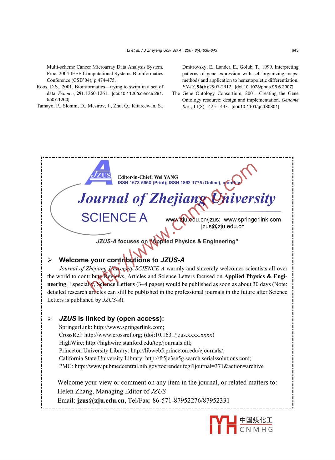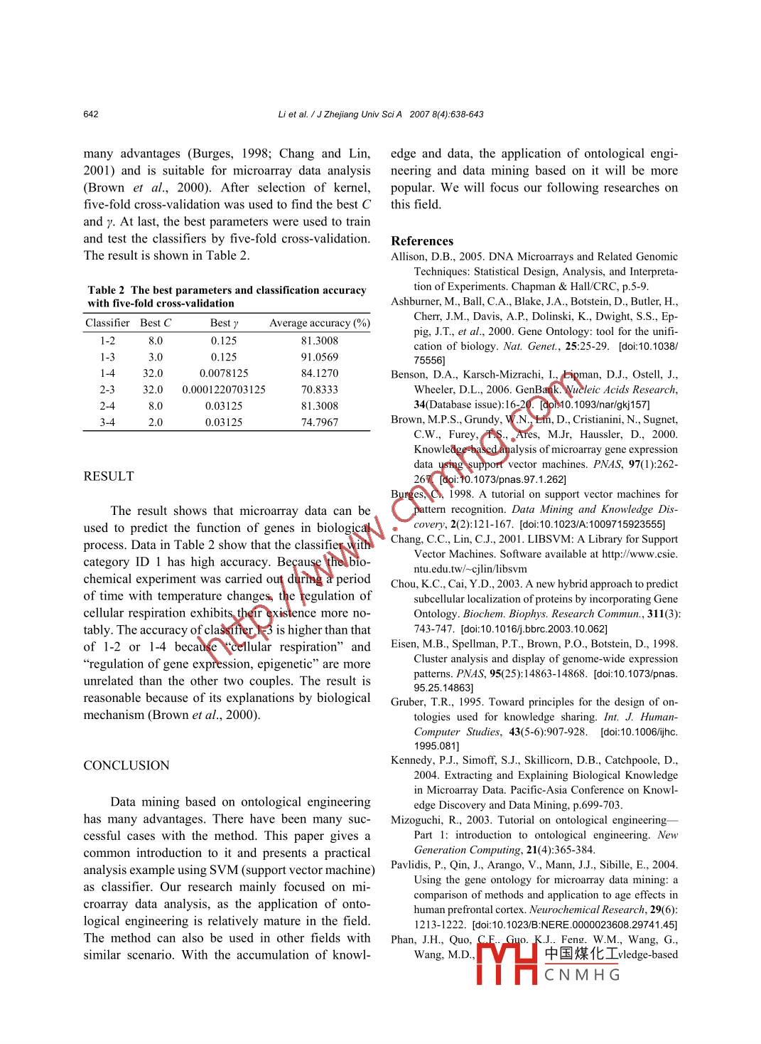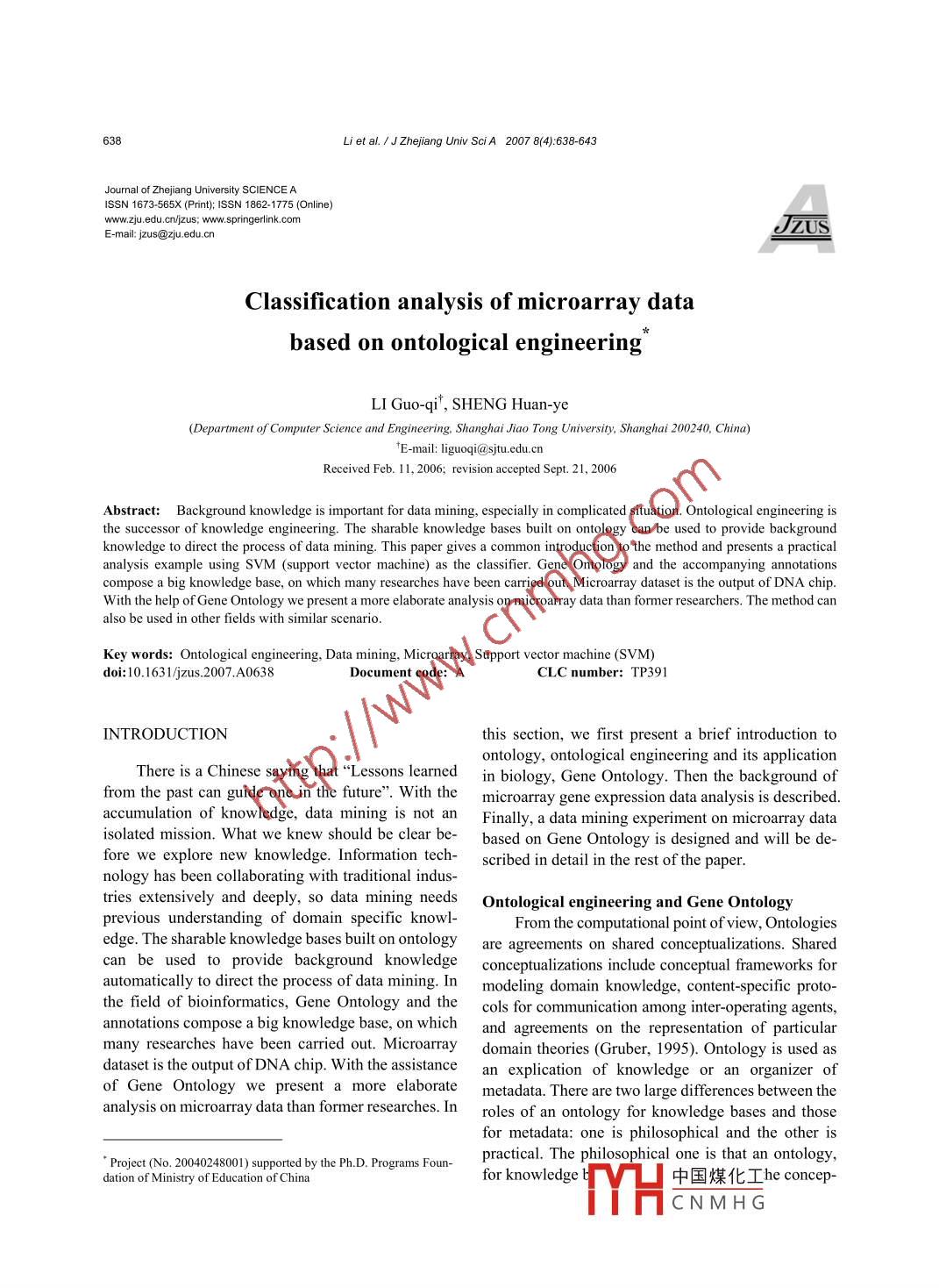 638Liet al./ J Zhejiang Univ SciA 2007 8():638-643Journal of Zhejiang University SCIENCE AISSN 1673 565X (Print); ISSN 1862- 1775 (Online)www.zju.edu.cn/jzus; www.springerlink.comJzusE-mail: jzus@zju.edu.cnClassification analysis of microarray databased on ontological engineeringLI Guo-qi, SHENG Huan-ye(Department of Computer Science and Engineering, Shanghai Jiao Tong University, Shanghai 200240, China)E-mail: liguoqi@sjtu.edu.cnReceived Feb. 11, 2006; revision accepted Sept. 21, 2006Abstract: Background knowledge is important for data mining, especially in complicated situation. Ontological engineering isthe successor of knowledge engineering. The sharable knowledge bases built on ontology can be used to provide backgroundknowledge to direct the process of data mining. This paper gives a common introduction to the method and presents a practicalanalysis example using SVM (support vector machine) as the classifier. Gene Ontology and the accompanying annotationscompose a big knowledge base, on which many researches have been carried out. Microarray dataset is the output of DNA chip.With the help of Gene Ontology we present a more elaborate analysis on microarray data than former researchers. The method canalso be used in other fields with similar scenario.Key words: Ontological engineering, Data mining, Microarray, Support vector machine (SVM)doi: 10.1631/jzus.2007.A0638Document code: ACLC number: TP391INTRODUCTIONthis section, we first present a brief introduction toontology, ontological engineering and its applicationThere is a Chinese saying that“Lessosns learmed in biology, Gene Ontology. Then the background offrom the past can guide one in the future”. With themicroarray gene expression data analysis is described.accumulation of knowledge, data mining is not anFinally, a data mining experiment on microarray dataisolated mission. What we knew should be clear be- based on Gene Ontology is designed and will be de-fore we explore new knowledge. Infrmation tech- scribed in detail in the rest of the paper.nology has been collaborating with traditional indus-tries extensively and deeply, so data mining needsOntological engineering and Gene Ontologyprevious understanding of domain specific knowl-From the computational point of view, Ontologiesedge. The sharable knowledge bases built on ontologyare agreements on shared conceptualizations. Sharedcan be used to provide background knowledgeconceptualizations include conceptual frameworks forautomatically to direct the process of data mining. Inmodeling domain knowledge, content- specific proto-the field of bioinformatics, Gene Ontology and thecols for communication among inter-operating agents,annotations compose a big knowledge base, on which and agreements on the representation of particularmany researches have been carried out. Microarray domain theories (Gruber, 1995). Ontology is used as .dataset is the output of DNA chip. With the asistance an explication of knowledge or an organizer ofof Gene Ontology we present a more elaboratemetadata. There are two large differences between theanalysis on microarray data than former researches. Inroles of an ontology for knowledge bases and thosefor metadata: one is philosophical and the other is" Project (No. 20040248001) supported by the Ph.D. Programs Foun-practical. The philosophical one is that an ontology,dation of Ministry of Education of Chinafor knowledge中國煤化工he concep-YHCNMH G ..Li et al.1J Zhejiang Univ SciA 2007 8():638-643639tualization of the target world; and the practical one, logical researchers.for metadata, is a set of computer-understandableIt seems that ontological engineering in biologyvocabulary (Mizoguchi, 2003). In the first kind of field is more developed than any other, maybe exceptcases, ontology works as a system of fundamental semantic web, because of the characteristics ofconcepts, that is, a protocol specification of any biological research itself. Gene and protein sequenceknowledge base, explicating the conceptualization of databases have voluminous data and continue to morethe target world and providing a solid foundation, on than double in size every year (Roos, 2001; Benson etwhich one can build sharable knowledge bases for al, 2006). Facing the huge number of entities andwider usability than that of a conventional knowledge their relationships, biologists resorted to the advancedbase. And in the other kind of cases, ontology was knowledge management method, ontological engi-used as a tool for data retrieval and exchange between neering, to provide services. So, our example selectedheterogeneous databases.bioinformatics research issue. The method can also beThe Gene Ontology project provides a controlled sound in other fields with similar scenario.vocabulary to describe gene and gene productattributes in any organism (Ashburner et al., 2000). It Introduction of microarray gene expression datawas organized into three categories, or have three and their analysisontologies: biological process, cellular componentWith the rapid development of genome-scaleand molecular function. There are nearly 166k genes sequencing, many genomes have already been known.that have been annotated by Gene Ontology. An An essential and formidable task is to define the roleontology comprises a set of well-defined terms with of each gene and understand how the genome func-well-defined relationships. The structure itself tions as a whole. As we know, in molecular level,reflects the current representation of biological know- DNA is transcribed into messenger ribonucleic acidledge as well as serving as a guide for organizing new or mRNA and then mRNA is translated to produce adata. Data can be annotated to varying levels de- protein. In fact, only a small part of segments in thepending on the amount and completeness of available genome exist in the code for genes. Most of the func-information (Ashburner et al, 2000). The original tional roles of other segments are still unknown. It 