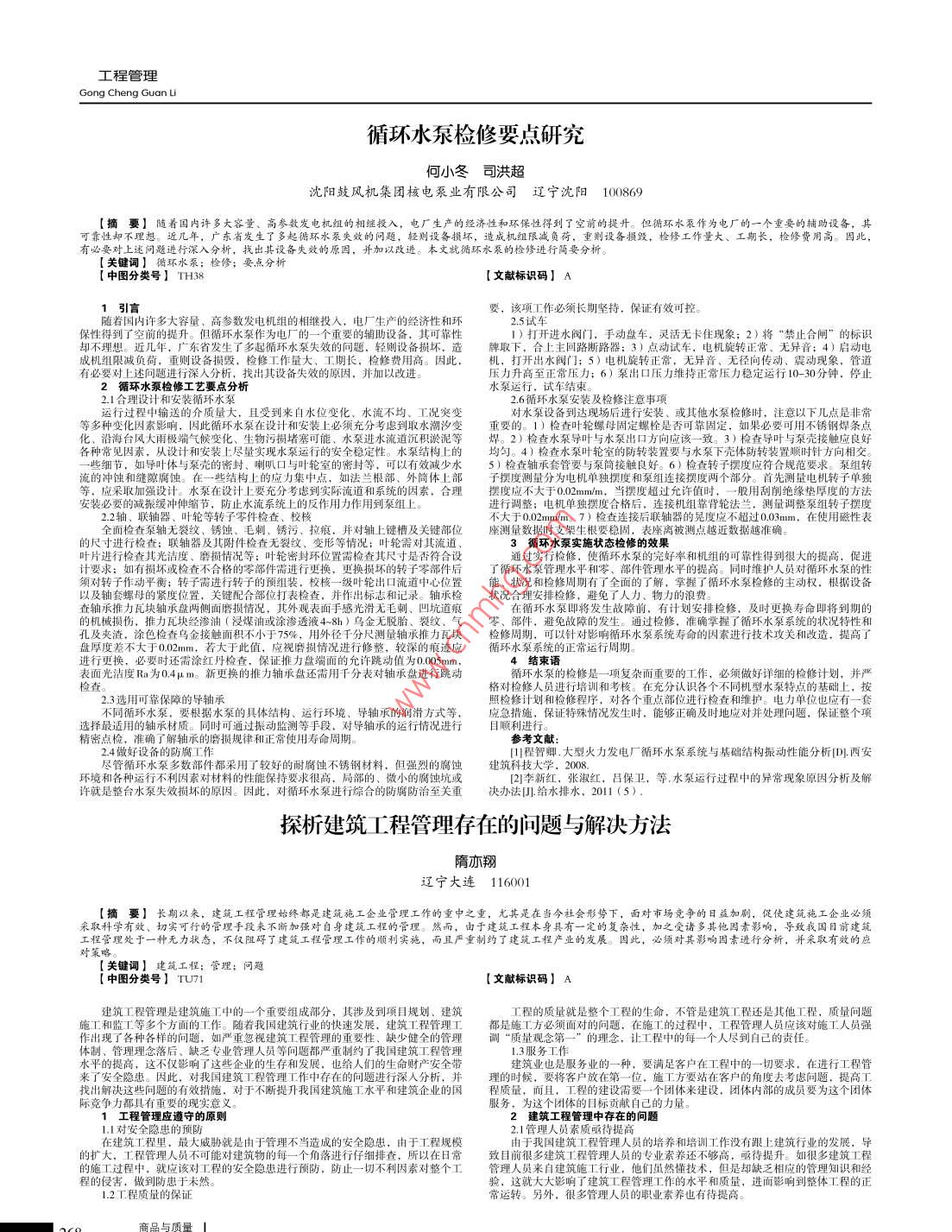 工程管理Gong Cheng guan Li循環(huán)水泵檢修要點研究何小冬司洪超沈陽鼓風(fēng)機集團核電泵業(yè)有限公司遼寧沈陽100869【摘要】隨著國內(nèi)許多大容量、高參數(shù)發(fā)電杌貍的相繼投入,電廠生產(chǎn)的經(jīng)濟性和環(huán)保性得到了空前的提升。但循環(huán)水泵作為電廠的一個重要的輔助設(shè)備,其可靠性卻不理想。近幾年,廣東省發(fā)生了多起循環(huán)水泵失效的問題,輕則設(shè)備損壞,造成機組限減負(fù)荷,重則設(shè)備損毀,檢修工作量大、工期長,檢修費用高有必要對上述問題進行深入分析,找出其設(shè)備失效的原因,并加以改進。本文就循環(huán)水泵的檢修進行簡要分祈【關(guān)鍵詞】循環(huán)水泵;檢修;要點分析【中圖分類號】TH38【文獻標(biāo)識碼】A要,該項工作必須長期堅持,保證有效可控。者國內(nèi)許多大容量、高參數(shù)發(fā)電機組的相繼投入,電2.5試車卻不理想。近幾年,廣東省發(fā)生了多起循環(huán)水泵失效的問題,損壞,造牌取下,合上主回路斷路器;3)點動試車,電機旋轉(zhuǎn)正常、無)啟動電成機組限減負(fù)荷,重則設(shè)備損毀,檢修工作量大、工期長機,打開出水閥門;5)電機旋轉(zhuǎn)正常,無異音、無徑向傳動有必要對上述問題進行深人分析,找出其設(shè)備失效的原因,并壓力升高至正常壓力;6)泵出口壓力維持正常壓力穩(wěn)定運行停止2循環(huán)水泵檢修工藝要點分析水泵運行,試車結(jié)束2.1合理設(shè)計和安裝循環(huán)水泵6循環(huán)水泵安裝及檢修注意事項等多種變化因素影響,因此循環(huán)水泵在設(shè)計和安裝上必須充分考慮到取水潮汐變重要的。1)檢查葉輪螺母固定螺栓是否可靠固定,如果必要可用不銹鋼焊條點各種常見因素,從設(shè)計和安裝上盡量實現(xiàn)水泵運行的安全穩(wěn)定性。水泵結(jié)構(gòu)上的均勻。4)檢查水泵葉輪室的防轉(zhuǎn)裝置要與水泵下殼體防轉(zhuǎn)裝置順時針方向相交些細(xì)節(jié),如導(dǎo)葉體與泵殼的密封、喇叭口與葉輪室的密封等,可以有效減少水5)檢査軸承套管要與泵筒接觸良好。6)檢查轉(zhuǎn)子擺度應(yīng)符合規(guī)范要求。泵組轉(zhuǎn)流的沖蝕和縫隙腐蝕。在一些結(jié)構(gòu)上的應(yīng)力集中點,如法蘭根部、外筒體上部子擺度測量分為電機單獨擺度和泵組連接擺度兩個部分。首先測量電機轉(zhuǎn)子單獨等,應(yīng)采取加強設(shè)計。水泵在設(shè)計上要充分考慮到實際流道和系統(tǒng)的因素,合理擺度應(yīng)不大于002mmm,當(dāng)擺度超過允許值時用刮削絕緣墊厚度的方法安裝必要的減振緩沖伸縮節(jié),防止水流系統(tǒng)上的反作用力作用到泵組上進行調(diào)整;電機單獨擺度合格后,連接機組靠背輪法蘭,測量調(diào)整泵組轉(zhuǎn)子擺度22軸、聯(lián)軸器、葉輪等轉(zhuǎn)子零件檢查、校核不大于002mm/m。7)檢查連接后聯(lián)軸器的晃度應(yīng)不超過0.03mm,在使用磁性表全面檢査泵軸無裂紋、銹蝕、毛刺、銹污、拉痕,并對軸上鍵槽及關(guān)鍵部位座測量數(shù)據(jù)時支架生根要穩(wěn)固,表座離被測點越近數(shù)據(jù)越準(zhǔn)確的尺寸進行檢查;聯(lián)軸器及其附件檢査無裂紋、變形等情況;葉輪需對其流道、3循環(huán)水泵實施狀態(tài)檢修的效果葉片進行檢查其光潔度、磨損情況等;葉輪密封環(huán)位置需檢查其尺寸是否符合設(shè)通過實行檢修,使循環(huán)水泵的完好率和機組的可靠性得到很大的提高,促進計要求;如有損壞或檢查不合格的零部件需進行更換,更換損壞的轉(zhuǎn)子零部件后了循環(huán)水泵管理水平和零、部件管理水平的提高。同時維護人員水泵的性根據(jù)設(shè)備以及軸套螺母的緊度位置,關(guān)鍵配合部位打表檢查,并作出標(biāo)志和記錄。軸承檢狀況合理安排檢修,避免了人力、物力的浪費。査軸承推力瓦塊軸承盤兩側(cè)面磨損情況,其外觀表面手感光滑無毛刺、凹坑道痕在循環(huán)水泵即將發(fā)生故障前,有計劃安排檢修,及時更換壽命即將到期的的機楲損傷,推力瓦塊經(jīng)滲油(浸煤油或涂滲透液4-$h)烏金無脫胎、裂紋、氣零、部件,避免故障的發(fā)生。邐過檢修,準(zhǔn)確掌握了循環(huán)水泵系統(tǒng)的狀況特性和孔及夾渣,涂色檢査鳥金接觸面積不小于75%,用外徑千分尺測量軸承推力瓦塊檢修周期,可以針對影響循環(huán)水泵系統(tǒng)壽命的因素進行技術(shù)攻關(guān)和改造,提高了盤厚度差不大于θ02mm,若大于此值,應(yīng)視黁損情況進行修整,較深的痕跡應(yīng)循環(huán)水泵系統(tǒng)的正常運行周期4結(jié)束語表面光潔度Ra為0.4μm。新更換的推力軸承盤還需用千分表對軸承盤進行跳動循環(huán)水泵的檢修是一項復(fù)雜而重要的工作,必須做好詳細(xì)的檢修計劃,并嚴(yán)格對檢修人員進行培訓(xùn)和考核。在充分認(rèn)識各個不同機型水泵特點的基礎(chǔ)上,按2.3選用可靠保障的導(dǎo)軸承照檢修計劃和檢修程序,對各個重點部位進行檢查和維護。電力單位也應(yīng)有一套不同循環(huán)水泵,要根據(jù)水泵的具體結(jié)構(gòu)、運行環(huán)境、導(dǎo)軸承的潤滑方式等應(yīng)急措施,保證特殊情況發(fā)生時,能夠正確及時地應(yīng)對并處理問題,保證整個項選擇最適用的軸承材質(zhì)。同時可通過振動監(jiān)測等手段,對導(dǎo)