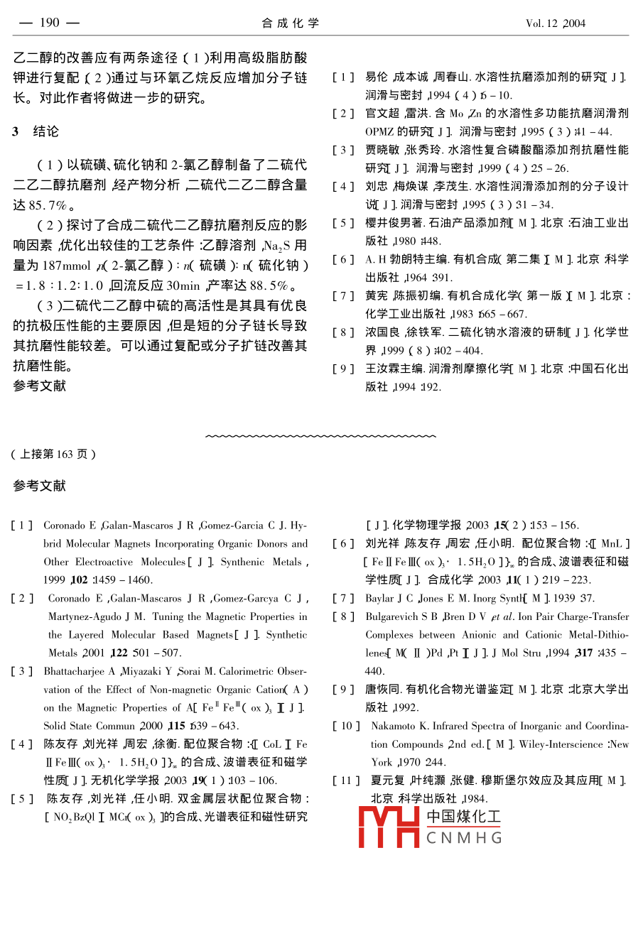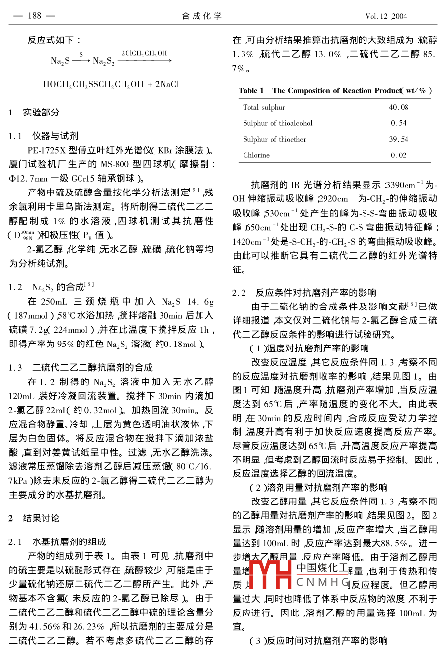 合成化學(xué) Chinese Journal of Synthetic Chemistry187二硫代二乙二醇水基抗饜劑的合成及性能研究王知彩〔安徽工業(yè)大學(xué)化工與環(huán)境學(xué)院安徽馬鞍山243002)摘要:以硫磺、硫化鈉、2-氯乙醇為起始原料合成了二硫代二乙二醇。以乙醇為溶劑,硫化鈉187mmolκ2-氯乙醇):κ硫磺):κ硫化鈉)=1.8:l.2:l.0冋流反應(yīng)30πin,硫代二乙〓釀?其中硫醚硫含量為39.54%)產(chǎn)率達88.5‰%。含二硫代二乙二醇85.7%的水基抗磨劑具有優(yōu)良的極壓性(P=804N)但抗磨性不理想Daomin =0mm關(guān)鍵詞:二硫代二乙二醇;水溶性抗磨劑;合成;潤滑性能中圖分類號:0623.82丌TF624.8文獻標(biāo)識碼:A文章編號:1005-1511(2004)20187404Synthesis and the Lubrication Propertyof Dithio-diglycol aqueous Antiwear agentWANG Zhi-caiSchool of Chemical Engineering and Environment, Anhui Polytechnical University Maanshan 243002, ChinaAbstract: Dithio-diglycol agent has been synthesized by the reaction of sulfur 2-chloroethanol andsodium sulfide. The results demonstrate that the yield of dithio-diglycol in the agent is 88. 5%0 underthe optimism conditions: solvent is ethanol amount of Na, S is 187 mmol, the molar ratio of chlorocarbinol, sulfur and sodium sulfide is 1.8:1.2:1.0, refluxing time is 30min. The disulfurether isstaple and the content of sulphur of sulfurether is 39. 54%0. The lubrication property investigation ofthe agent showed that although its antiwear property is unsatisfactory its load-carrying capacity is very higH( PB=804N)Keywords: Dithio-diglycol i synthesis i lubrication property水基潤滑液由于具有優(yōu)良的經(jīng)濟性、冷卻性和98N)筆者認為除碳鏈太短原因以外,可能更重要安全性且利于節(jié)能和環(huán)保已被廣泛用于抗燃水基的是其中硫的活性不高所致。為了證實此觀點本液壓液和金屬加工處理液中??鼓ヌ砑觿┦撬鶟櫥鹤顬殛P(guān)鍵的成分之一,它決定了水基潤滑液的文合成了二硫代二乙二醇經(jīng)測試其潤滑性能得到潤滑性能。傳統(tǒng)的水基潤滑液采用油溶性抗磨劑了很大的提高PB≥840N經(jīng)表面活性劑分散于水中。存在穩(wěn)定性差、分散性二硫醚的合成方法主要有硫醇與多硫化鈉反不均勻、水質(zhì)影響嚴(yán)重及易腐敗等缺點。近年來水應(yīng)3H2O2氧化硫醇6及二硫化鈉與鹵代烴的親基抗磨劑的研究主要是水溶性抗曆劑的合成與應(yīng)核取代反應(yīng)三種。本文選擇價格相對低廉的2用1-31b通過抗磨劑的分子設(shè)計在其分子中引入氯OH CO2HrNH2,∈CH2CH2O等水溶性基團以及中國煤化工硫磺反應(yīng)的合成路線,SP, CI ,Mo B n等活性元素合成新型水溶性抗磨并考CNMH響及二硫代二乙醇的劑。據(jù)報道1硫代二乙醇的潤滑性能不佳(Pn<潤滑性能收稿日期:200303-21作者簡介:王知彩1968-)男漢族安徽當(dāng)涂人碩士主要從事應(yīng)用化學(xué)的研究E-mailzhicai@ahut.edu.cn188合成化學(xué)Vol.122004反應(yīng)式如下在可由分析結(jié)果推算出抗磨劑的大致組成為流醇2CICH, CH, OH1.3%硫代二乙醇13.0%,二硫代二乙二醇857%。HOCH, CH2 SSCH,CH,OH 2NaCITable 1 The Composition of Reaction Product wt/%)1實驗部分Total sulphur40.08Sulphur of thioalcohol0.541.1儀器與試劑Sulphur of thioetherPE-1725X型傅立葉紅外光譜儀KBr涂膜法)Chlorine0.02廈門試驗機廠生產(chǎn)的MsS-800型四球機(摩擦副Φ12.7mm一級GCr15軸承鋼球抗磨劑的IR光譜分析結(jié)果顯示:3390cm為產(chǎn)物中硫及硫醇含量按化學(xué)分析法測定”殘OH伸縮振動吸收峰2920cm-為-CH,-的伸縮振動余氯利用卡里烏斯法測定。將所制得二硫代二乙二醇配制成1%的水溶液,四球機測試其抗磨性吸收峰530cm處產(chǎn)生的峰為S-S-彎曲振動吸收D)和極壓性(P值)峰50cm處岀現(xiàn)CH2-S-的CS彎曲振動特征峰;1420cm-處是S-CH,的-CHS的彎曲振動吸收峰2-氯乙醇化學(xué)純無水乙醇,硫磺硫化鈉等均由此可以推斷它具有二硫代二乙醇的紅外光譜特為分析純試劑1.2Na2S2的合成82.2反應(yīng)條件對抗磨劑產(chǎn)率的影響在250mL三頸燒瓶中加入Na2S14.6由于二硫化鈉的合成條件及影響文獻81已做(187mmol)58℃水浴加熱攪拌熔融30min后加入詳細報道本文僅對二硫化鈉與2-氯乙醇合成二硫硫磺7.2g224mmol),并在此溫度下攪拌反應(yīng)Ih′代二乙醇反應(yīng)條件的影響進行試驗研究即得產(chǎn)率為95%的紅色Na2S2溶液約0.18mol)b(1)溫度對抗磨劑產(chǎn)率的影響1.3二硫代二乙二醇抗磨劑的合成改變反應(yīng)溫度其它反應(yīng)條件同1.3考察不同在1.2制得的Na、s,溶液中加入無水乙醇的反應(yīng)溫度對抗圈劑收率的影響結(jié)果見圖1。由120mL裝好冷凝回流裝置。攪拌下30min內(nèi)滴加圖1可知隨溫度升高抗磨劑產(chǎn)率增加當(dāng)反應(yīng)溫2氯乙醇22n(約0.32m加熱回流30min。反度達到65℃后產(chǎn)率隨溫度的變化不大。由此表應(yīng)混合物靜置、冷卻,上層為黃色透明油狀液體,下明在30min的反應(yīng)時間內(nèi)合成反應(yīng)受動力學(xué)控層為白色固體。將反應(yīng)混合物在攪拌下滴加濃鹽制溫度升高有利于加快反應(yīng)速度提高反應(yīng)產(chǎn)率。酸直到對姜黃試紙呈中性。過濾無水乙醇洗滌。盡管反應(yīng)溫度達到65℃后升高溫度反應(yīng)產(chǎn)率提高濾液常壓蒸餾除去溶劑乙醇后減壓蒸馓(80℃16.不眀顯但考慮到乙醇回流時反應(yīng)易于控制。因此7kPa)除去未反應(yīng)的2-氯乙醇得二硫代二乙二醇為反應(yīng)溫度選擇乙醇的回流溫度。(2)劑用量對抗磨劑產(chǎn)率的影響主要成分的水