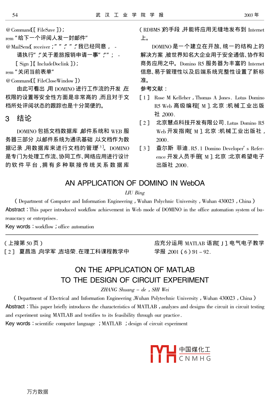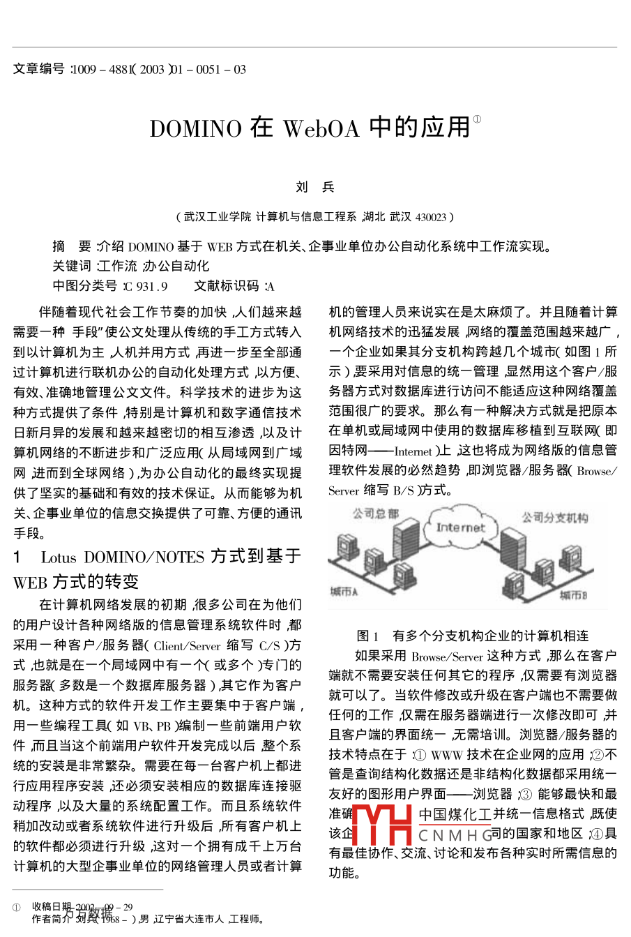 文章編號009-488(2003)1-0051-03DOMINO在 Weboa中的應(yīng)用劉兵(武漢工業(yè)學(xué)院計(jì)算機(jī)與信息工程系湖北武漢43003)摘要介紹 DOMINO基于WEB方式在機(jī)關(guān)、企事業(yè)單位辦公自動(dòng)化系統(tǒng)中工作流實(shí)現(xiàn)。關(guān)鍵詞江作流辦公自動(dòng)化中圖分類號℃931.9文獻(xiàn)標(biāo)識碼:A伴隨著現(xiàn)代社會(huì)工作節(jié)奏的加快人們越來越機(jī)的管理人員來說實(shí)在是太麻煩了。并且隨著計(jì)算需要一種手段"使公文處理從傳統(tǒng)的手工方式轉(zhuǎn)λ機(jī)網(wǎng)絡(luò)技術(shù)的迅猛發(fā)展網(wǎng)絡(luò)的覆蓋范圍越來越廣,到以計(jì)算機(jī)為主人機(jī)并用方式再進(jìn)一步至全部通一個(gè)企業(yè)如果其分支機(jī)構(gòu)跨越幾個(gè)城市(如圖1所過計(jì)算機(jī)進(jìn)行聯(lián)機(jī)辦公的自動(dòng)化處理方式以方便、示)要采用對信息的統(tǒng)一管理顯然用這個(gè)客戶/服有效、準(zhǔn)確地管理公文文件??茖W(xué)技術(shù)的進(jìn)步為這務(wù)器方式對數(shù)據(jù)庫進(jìn)行訪問不能適應(yīng)這種網(wǎng)絡(luò)覆蓋種方式提供了條件特別是計(jì)算機(jī)和數(shù)字通信技術(shù)范圍很廣的要求。那么有一種解決方式就是把原本日新月異的發(fā)展和越來越密切的相互滲透,以及計(jì)在單機(jī)或局域網(wǎng)中使用的數(shù)據(jù)庫移植到互聯(lián)網(wǎng)(即算機(jī)網(wǎng)絡(luò)的不斷進(jìn)步和廣泛應(yīng)用從局域網(wǎng)到廣域因特網(wǎng)— Internet)上這也將成為網(wǎng)絡(luò)版的信息管網(wǎng)進(jìn)而到全球網(wǎng)絡(luò))為辦公自動(dòng)化的最終實(shí)現(xiàn)提理軟件發(fā)展的必然趨勢即瀏覽器/服務(wù)器 browse.供了堅(jiān)實(shí)的基礎(chǔ)和有效的技術(shù)保證。從而能夠?yàn)闄C(jī) Server縮寫B(tài)/S方式。關(guān)、企事業(yè)單位的信息交換提供了可靠、方便的通訊公司總部公司分支機(jī)構(gòu)手段。Internet1 Lotus domino/ NOTES方式到基于WEB方式的轉(zhuǎn)變聯(lián)幣A在計(jì)算機(jī)網(wǎng)絡(luò)發(fā)展的初期很多公司在為他們的用戶設(shè)計(jì)各種網(wǎng)絡(luò)版的信息管理系統(tǒng)軟件時(shí),都采用一種客戶服務(wù)器( Client/server縮寫C/S)方圖1有多個(gè)分支機(jī)構(gòu)企業(yè)的計(jì)算機(jī)相連如果采用 Browse/ Server這種方式那么在客戶式也就是在一個(gè)局域網(wǎng)中有一個(gè)或多個(gè))門的端就不需要安裝任何其它的程序僅需要有瀏覽器服務(wù)器(多數(shù)是一個(gè)數(shù)據(jù)庫服務(wù)器)其它作為客戶機(jī)。這種方式的軟件開發(fā)工作主要集中于客戶端就可以了。當(dāng)軟件修改或升級在客戶端也不需要做用一些編程工具(如VBP蹁編制一些前端用戶軟任何的工作僅需在服務(wù)器端進(jìn)行一次修改即可并件而且當(dāng)這個(gè)前端用戶軟件開發(fā)完成以后整個(gè)系且客戶端的界面統(tǒng)一無需培訓(xùn)。瀏覽器/服務(wù)器的技術(shù)特點(diǎn)在于:WWW技術(shù)在企業(yè)網(wǎng)的應(yīng)用不統(tǒng)的安裝是非常繁雜。需要在每一臺客戶機(jī)上都進(jìn)管是査詢結(jié)構(gòu)化數(shù)據(jù)還是非結(jié)構(gòu)化數(shù)據(jù)都采用統(tǒng)行應(yīng)用程序安裝還必須安裝相應(yīng)的數(shù)據(jù)庫連接驅(qū)友好的圖形用戶界面——瀏覽器③能夠最快和最動(dòng)程序以及大量的系統(tǒng)配置工作。而且系統(tǒng)軟件稍加改動(dòng)或者系統(tǒng)軟件進(jìn)行升級后所有客戶機(jī)上準(zhǔn)確V凵中國煤化工并統(tǒng)一信息格式既使該CNMHG司的國家和地區(qū)恿具的軟件都必須進(jìn)行升級這對一個(gè)擁有成干上萬臺有最佳協(xié)作、交流、討論和發(fā)布各種實(shí)時(shí)所需信息的計(jì)算機(jī)的大型企事業(yè)單位的網(wǎng)絡(luò)管理人員或者計(jì)算功能。①作看界勁s2)男江寧省大連市人江程師武漢工業(yè)學(xué)院學(xué)報(bào)1期Journal of Wuhan Polytechnic Unive53DOMINO本身有一個(gè)很好的客戶端軟件這些域中這些用戶才有權(quán)利看到由此表單所生成NOES,而且很多公司已經(jīng)制作了基于 LOTUS的文檔而其它用戶是無權(quán)看到的超級用戶也不例DOMINO/ NOTES方式功能十分強(qiáng)大且穩(wěn)定性很高處。為了能使工作流自動(dòng)實(shí)現(xiàn)以及使差旅費(fèi)的申請的辦公自動(dòng)化產(chǎn)品但他們現(xiàn)在對其進(jìn)行升級時(shí)都者能夠跟蹤所發(fā)起的申請文檔目前的狀態(tài)則在表已轉(zhuǎn)換到基于Web方式上來1已適應(yīng)用戶對其各單中的同意”和不同意”按鈕中加上一些控制程種信息管理系統(tǒng)軟件統(tǒng)一界面的要求。序。2 DOMINO中工作流的實(shí)現(xiàn)方式例如灬∵同意″按鈕的控制程序如下en設(shè)置文檔為編輯狀態(tài)工作流是指把一個(gè)工作主題分為幾個(gè)部分實(shí)@ Command[ EditDocument;1");現(xiàn)只有上一個(gè)工作部分完成后才能啟動(dòng)下一個(gè)工ren"′把目前評閱人域值送給上一評閱人域值作部分。根據(jù)在應(yīng)用中所定義的處理流程江工作流@ Metfield( Lastapprove" C Current Approve)引擎自動(dòng)地分發(fā)、傳遞和跟蹤文檔。工作流可以協(xié)@ Set field( Lastapprove-1";-調(diào)處理企業(yè)、客戶、合作伙伴、供應(yīng)商之間