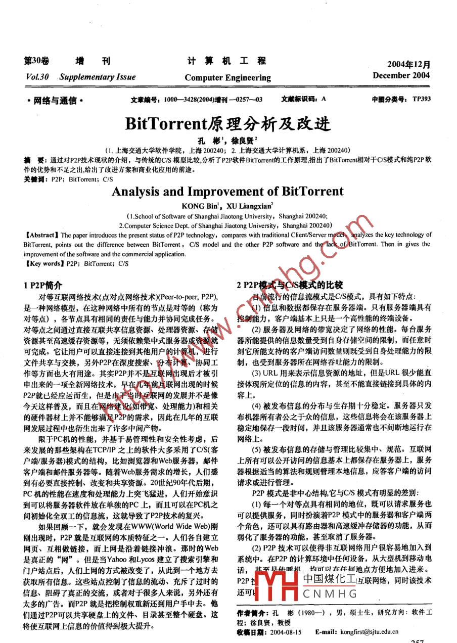 第30卷增刊計算機工程2004年12月VoL30 Supplementary IssueComputer EngineeringDecember 2004●網(wǎng)絡(luò)與通信●文章編號: 1000 -3428(200)增刊- 0257- 03文獻標識碼: A中團分類號: TP393BitTorrent原理分析及改進孔彬',徐良賢'(1.上海交通大學(xué)軟件學(xué)院,上海200240; 2. 上海交通大學(xué)計算機系,上海200240)摘要: 通過對P2P技術(shù)現(xiàn)狀的介紹,與傳統(tǒng)的C/S模型比較,分析了P2P軟件BitTorrent的工作原理,指出了BirToren相對于CIS模式和純P2P軟件的優(yōu)勢和不足之出,給出了改進方案和商業(yè)化應(yīng)用的前途。關(guān)健詞: P2P; BitTorrent; C/SAnalysis and Improvement of BitTorrentKONG Bin', XU Liangxian'(1.School of Software of Shanghai Jiaotong University, Shanghai 200240;2.Computer Science Dept. of Shanghai Jiaotong University, Shanghai 200240)[Abstract ] The paper introduces the present status ofP2P technology, compares with traditinal Client/Server model, analyzes the key technology ofBitTorrent, points out the diference between Bitorrent, CIS model and the other P2P software and the lack of BitTorrent. Then in gives theimprovement of the software and the commercial application.[Key words] P2P; BitTorrent; C/S1 P2P簡介2 P2P模式與CIS模式的比較對等互聯(lián)網(wǎng)絡(luò)技術(shù)(點對點網(wǎng)絡(luò)技術(shù))(Peer-to peer, P2P),目前流行的信息流模式是C/S模式,具有如下特點:是一種網(wǎng)絡(luò)模型,在這種網(wǎng)絡(luò)中所有的節(jié)點是對等的(稱為(1)信息和數(shù)據(jù)都保存在服務(wù)器端。只有服務(wù)器端具有對等點) ,各節(jié)點具有相同的責(zé)任與能力并協(xié)同完成任務(wù)??刂颇芰?,客戶端基本上只是一一個高性能的終端設(shè)備。對等點之間通過直接互聯(lián)共享信息資源、處理器資源、存儲(2)服務(wù)器及網(wǎng)絡(luò)的帶寬決定了網(wǎng)絡(luò)的性能。每臺服務(wù)資源甚至高速緩存資源等,無須依賴集中式服務(wù)器或資源就器所能提供的信息數(shù)量受到自身存儲空間的限制,而任意時可完成。它讓用戶可以直接連接到其他用戶的計算機,進行刻它所能支持的客戶端訪問數(shù)量則既受到自身處理能力的限文件共享與交換,另外P2P在深度搜索、分布計算、協(xié)同工制,也受到服務(wù)器所在網(wǎng)絡(luò)吞吐能力的限制。作等方面也大有用途。其實P2P并不是互聯(lián)網(wǎng)出現(xiàn)后才被引(3)URL用來表示信息資源的地址,但是URL 很少能直申出來的一-項全新網(wǎng)絡(luò)技術(shù),早在幾年前互聯(lián)網(wǎng)出現(xiàn)的時候接體現(xiàn)所定位的信息的內(nèi)容,甚至不能直接鏈接到具體的內(nèi)P2P就已經(jīng)應(yīng)運而生,但是由于當時互聯(lián)網(wǎng)的發(fā)展并不是像容上。今天這樣普及,而且在網(wǎng)絡(luò)建設(shè)(如帶寬、處理能力)和相關(guān)(4)被發(fā)布信息的分布與生存期十分穩(wěn)定。服務(wù)器只發(fā)的硬件器材上并不能夠滿足P2P的需求,因此在幾年的互聯(lián)布機器所有者公之于眾的信息,這些信息將會在該服務(wù)器上網(wǎng)發(fā)展過程中也衍生出來了許多中間產(chǎn)物。穩(wěn)定地保存-一段時間, 并且該服務(wù)器通常也不間斷地運行在限于PC機的性能,并基于易管理性和安全性考慮,后網(wǎng)絡(luò)上。來發(fā)展的那些架構(gòu)在TCPIP之上的軟件大多采用了CIS(客(5)被發(fā)布信息的存儲與管理比較集中、規(guī)范?;ヂ?lián)網(wǎng)戶端/服務(wù)器)模式的結(jié)構(gòu),比如瀏覽器和Web服務(wù)器,郵件上所有可以公開訪問的信息基本上都保存在服務(wù)器上,服務(wù)客戶端和郵件服務(wù)器等。隨著Web服務(wù)需求的增長,人們感器根據(jù)適當?shù)乃惴ê鸵?guī)則管理本地信息,應(yīng)答客戶端的訪問到有必要直接控制、改變和共享資源。20世紀90年代后期,請求或進行管理。PC機的性能在速度和處理能力上突飛猛進,人們開始意識P2P模式是非中心結(jié)構(gòu),它與C/S模式有明顯的差別: .到可以將服務(wù)器軟件放在單獨的PC.上,而且可以在PC機之(1)每一個對等點具有相同的地位,既可以請求服務(wù)也間初始化全雙工的信息流,這就導(dǎo)致了P2P技術(shù)的復(fù)興??梢蕴峁┓?wù),同時扮演著P2P模式中的服務(wù)器和客戶端兩如果回顧一下,就會發(fā)現(xiàn)在WWW(World Wide Web)剛個角色,還可以具有路由器和高速緩沖存儲器的功能,從而剛出現(xiàn)時,P2P就是互聯(lián)網(wǎng)的本質(zhì)特征之一一. 人們各自建立弱化了服務(wù)器的功能,甚至取消了服務(wù)器。網(wǎng)頁、互相做鏈接,而上網(wǎng)是沿著鏈接沖浪。那時的Web(2) P2P技術(shù)可以使得非互聯(lián)網(wǎng)絡(luò)用戶很容易地加入到是真正的“網(wǎng)”。但是當Yahoo和Lycos建立了搜索引擎和系統(tǒng)中。在P2P的計算環(huán)境中任何設(shè)備,從大型機到移動電門戶站點后,人們上網(wǎng)的方式被改變了,從此到一個地方去話,其至縣傳呼機.均可以在懷何地點方便地加入進來。獲取所有信息。這些站點控制了信息的流動、充斥了過時的P2P中國煤化工互聯(lián)網(wǎng)絡(luò),同時該技術(shù)信息、阻礙了真正的交流,或者對于很多人來說,另外還有還可:fYHCNMHG太多的廣告。而P2P就是把控制權(quán)重新還到用戶手中去。他作者簡介:孔彬(1980--),男,碩士生,研究方向:軟件工們通過P2P可以共享硬盤上的文件、目錄甚至整個硬盤。這程;徐良賢,教授將