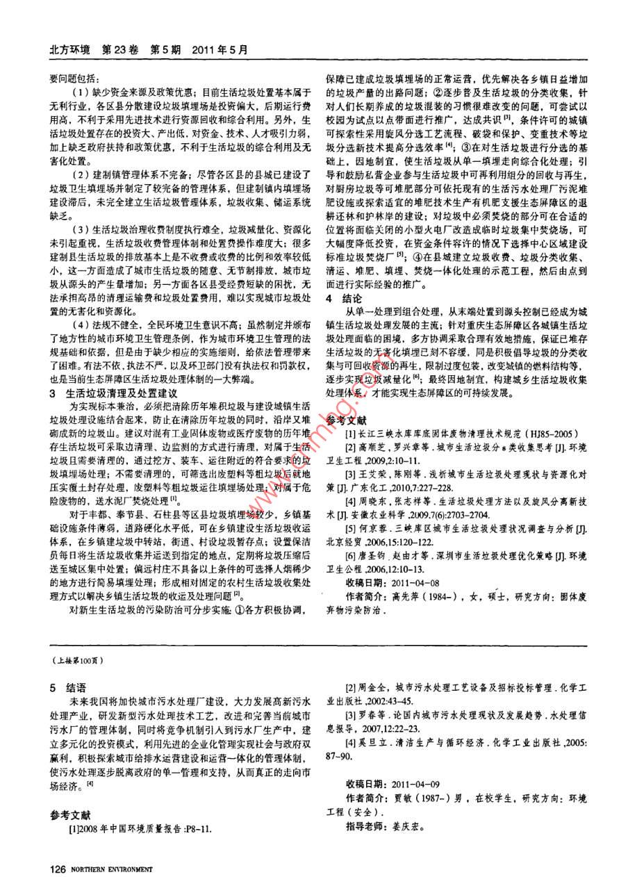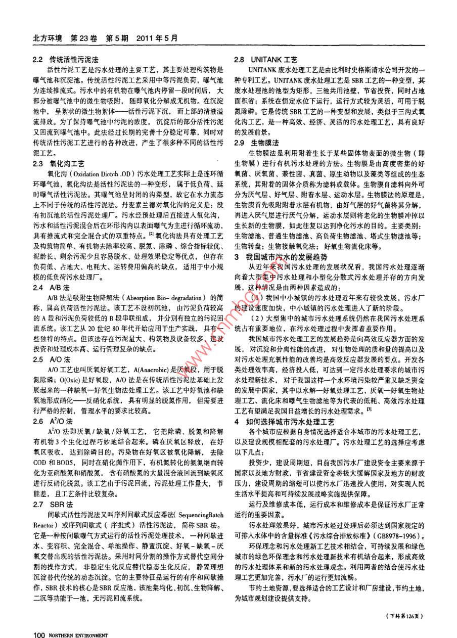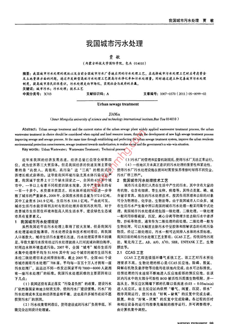 我國城市污水處理賈敏我國城市污水處理賈敏(內蒙古科技大學國際學院,包頭014010)摘要:我國城市污水處理的現狀以及當前全國城市污水廠普遍應用的污水處理工藝,在選擇城市污水處理工藝時應考慮資金及土地資源方面的問題,通過開發(fā)新型高效污水處理工藝提高污水凈化率和污水處理量。同時通過建立和完善城市污水處理制度,提高城市居民環(huán)保意識,污水處理走向市場化,實現社會與政府的共贏。關鍵詞:城市污水;污水處理;技術工藝中圖分類號: X703文獻標識碼: A文章編號: 1007-0370 (2011) 05-0099 -02Urban sewage treatmentJIAMin(Inner Mongolia university of science and technology intemational institute,Bao Tou 014010)Abstact: Urban sewage treatment and the current status of the urban scwage plant widely applied waslewater teatment process, the urbanwastewater trealment in choice should be considered when capial and land reource isues, through the development of new bigh sewage teatment process. At the same time through establishing and perfeting the urban sewage teatrnent sytem, improve the urban residentsenvironmental protection consciousnes, sewage treatment towards marketization, to realize social and the govermmen's a win-win situationKey words: Urban Wastewater; W astewaler Treatment; Technical process近年來我國的經濟發(fā)展迅速,經濟總量已位居全球第四(3 )污水廠的管理和監(jiān)督機制混亂.使得污水廠“無法正常運行。位,成為世界第三大貿易體。但是我國經濟的快速發(fā)展主要依(4)一些地區(qū)并未真正意識到污水處理的重要性和緊迫性,靠的是“高投人,高能耗,高污染"這“三高”的粗放式經使得污水廠 污水處理設施在損壞時需要保養(yǎng)維修時卻得不到資金,濟增長模式獲得的。這導致我國環(huán)境污染尤其水體污染日益嚴污水廠 停工停產。重,我國屬于世界上十三個缺水國家之一,全國的670多個城2我國城市污水處理技術工藝市中,一半以上有著不同程度的缺水現象,其中嚴重缺水的有城市污水是我們人類在生活中產生的污水,其中含有大量的一百一十多個。水資源本就匱乏,而水體環(huán)境的污染進一-步導有機物,也含有細菌,寄生蟲卵,病毒等。其特點是氮、磷、硫致了城市的嚴重缺水。2008年.全國廢水排放總量為572.0億噸,含量非常高。 現在的污水處理技術,按其作用原理和去除的對象其中工業(yè)廢水241.9億噸,生活污水330.1億噸。"由此可見,可分為物理法、化學法、生物法等。由于我國城市人口眾多,城城市生活污水能否得到及時有效的處理并得到再次利用,對于市生活污水產生集中所以我國的城市污水處理-般采用集中式處改善城市生活居住環(huán)境和提高人民生活水平,建設綠色生態(tài)城理,我國城市污水處理系統包括- 級處理,二級處理。一級處理市具有重要意義。一般利用格柵截留,沉淀,離心分離等物理方法去除污水中懸浮1我國城市污水處理現狀物,沙礫等物質,通常作為二級處理的前處理。二級處理: -般為雖然我國近年在污水處理上取得了較大發(fā)展,但是我國污生物處理,可以大幅度去除污水中呈膠體和溶解狀態(tài)的有機污染水處理基礎設施薄弱,污水處理設備和技術相對滯后,而我國物質, 經過二級處理后,污水一般可達到排人水體的水質標準。人口基數大,城市生活污水量增長迅速,污水處理需求得不到滿我國目前的城市污水處理工藝主要有: CCAS 工藝,傳統活性污泥足,導致大量污水沒有經過污水處理就排入江河流域和湖泊海洋,法, 氧化溝工藝,AB, A/O, A'/O, SBR, UNTTANK工藝,生物對周邊水體環(huán)境造成污染。2007 年,全國“城考"城市生活污膜法等。水集中處理率平均為51.95%其中有162個城市的城市生活污水2.1 CCAS工藝未經二級處理切未達到排放標準。截止2005年,全國661個設CCAS工藝即連續(xù)循環(huán)曝氣系統工藝,該工藝對污水預處.市城市擁有污水處理廠708 座,平均每-百五十萬人才擁有-座理要求不高,生物處理的核心是CCAS反應池。除磷、脫氣、污水處理廠,遠遠達不到一些發(fā)達國家平均7000- -8000 人就擁降解 有機物及懸浮物等功能均在該池內完成,出水可達標排放。有一座污水處理廠的標準。我國污水處理困難的主要原因有以經 預處理的污水連續(xù)不斷地進人反應池前部的預反應池,在該下幾點:區(qū)內污水中的大部分可落性BOD被活性污泥微生物吸附,并-(1)我國還沒有真正落實“污染者負擔"的政策,建設污水起從主、 預反應區(qū)隔墻下部的孔眼以低流速(0.03 - 0.0Sm/min)廠依然靠國家和地方財政支持,使的污水廠建設緩慢。污水廠的進入反應區(qū)。在主反應區(qū)內依照“曝氣、閑置,沉淀、排水污水處理成本無法和經濟效益相平衡,這也是許多城市政府不愿程序周期運行,使污水在“好氣一缺氣"的反復中完成去碳、投資污水廠的原因。脫氮,和在“好氧-厭氧"的反復中完成除磷。各過程的歷時(2)污水收集管網滯后,使得建設成的污水廠負荷率低,不和相應設備的運行均按事先編制的程序運行,并可調整程序,能完全達到設計處理量。由計算機集中調控。北方環(huán)境第23卷 第5期2011年5月2.2傳統活性污泥法2.8 UNITANK工藝活性污泥工藝是污水處理的主要工藝,其主要處理構筑物是UNITANK廢水處理工藝是由比利時史格斯清水公司開發(fā)的一曝氣池和沉淀池。傳統活性污泥工藝采用中等污泥負荷,曝氣池種專利工藝。 UNITANK廢水處理工藝是SBR工藝的一種變