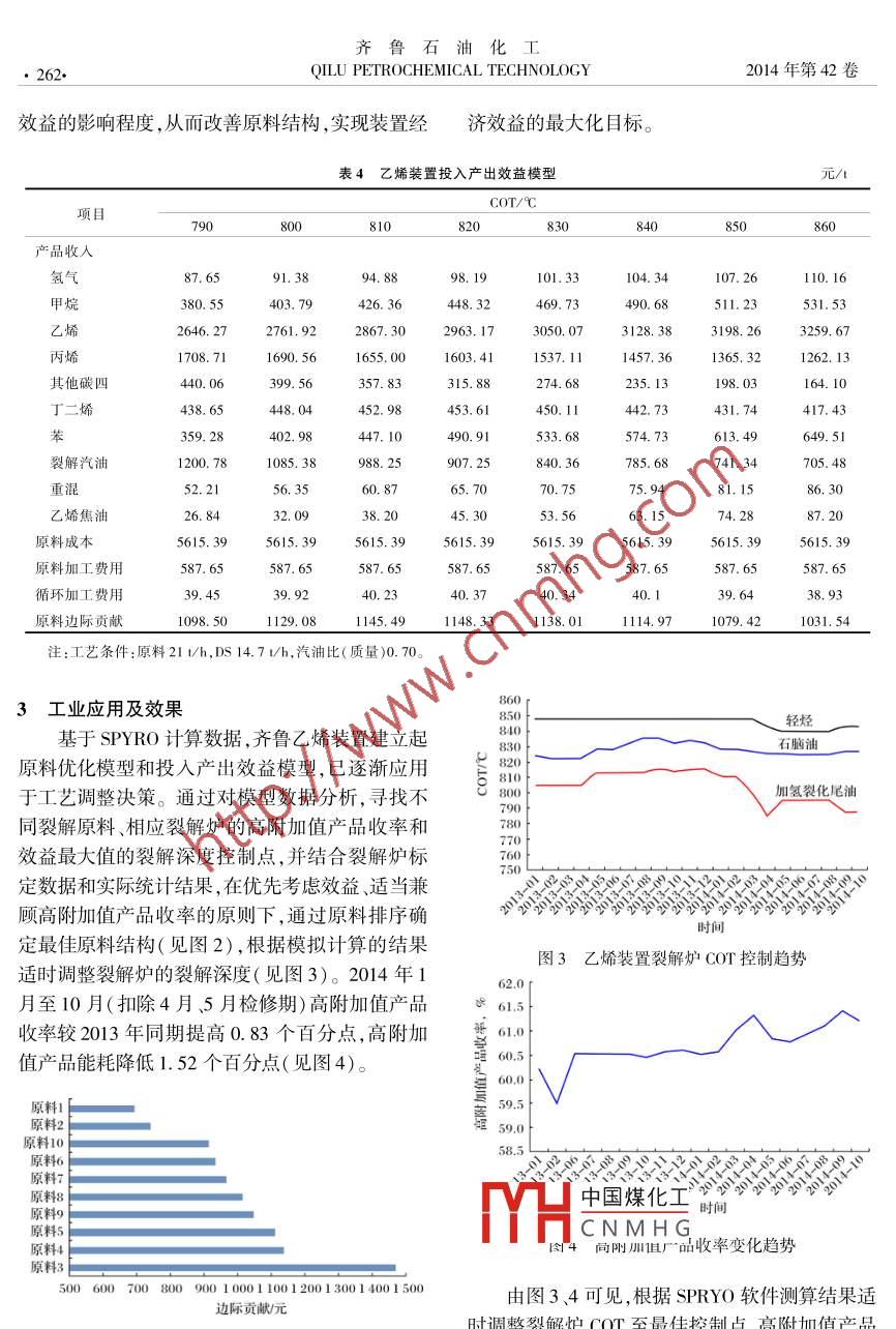 齊魯石油化工,2014,42(4) :259 - 262研究與開發(fā)QILU PETROCHEMICAL TECHNOLOGYSPYRO軟件在乙烯原料優(yōu)化中的應用高輝(中國石化齊魯分公司烯烴廠,山東淄博255411)摘要:將SPYR0軟件與原料和產(chǎn)品價格相結合,通過軟件對齊魯乙烯裝置各種原料的分析數(shù)據(jù)進行模擬計算后得到最終產(chǎn)品分布結果,建立原料優(yōu)化模型;同時結合相應價格體系,建立投入產(chǎn)出效益模型。通過兩套模型的計算對比,確定原料和工藝條件的調(diào)整方向,實現(xiàn)裂解產(chǎn)物價值最大化。關鍵詞:SPYRO乙烯裝置 原料優(yōu)化中圖分類號:TQ221. 2文獻標識碼:B文章編號:1009 - 9859(2014 )04 -0259 -04.為做好乙烯裝置原料優(yōu)化工作,中國石化齊種基本產(chǎn)品中的乙烷、丙烷、乙炔、甲基乙炔進行魯分公司乙烯裝置(簡稱齊魯乙烯裝置)自2013循環(huán)計算,同時扣減乙炔、甲基乙炔通過碳二、碳年下半年起,依據(jù)SPYR0軟件模擬裂解爐運行通三加氫反應器后的氫氣耗用量,分別計算各COT過數(shù)據(jù)計算,建立起乙烯裝置原料優(yōu)化模型,并通條件下裂解產(chǎn)物的最終產(chǎn)品分布情況。表1給出過每周一次的小周期分析及模擬計算,確定了裝COT 790 C條件下的循環(huán)乙烷最終產(chǎn)品分布計算置最佳工藝條件,并為原料優(yōu)化提供了可靠的數(shù)示意。據(jù)支持。表1中,對石腦油在COT 790 C條件下計算的產(chǎn)品中乙烷、乙炔組分進行循環(huán)轉化計算(模原料優(yōu)化模型的建立擬乙烷循環(huán)裂解爐的循環(huán)操作),即把基本產(chǎn)物1.1 基本產(chǎn)品收率的計算中的乙烷、乙炔根據(jù)轉化率進行計算,對于本程沒以石腦油原料為例,根據(jù)某一批次石腦油的有轉化完成的循環(huán)組分再次進行循環(huán)計算,直至PI0NA(正構烷烴Pn,異構烷烴Pi,烯烴0,環(huán)烷所有循環(huán)組分均轉化成最終產(chǎn)品為止。通過六程烴N,芳烴A)分析原始記錄中從碳三至碳十二以的循環(huán)計算,可以基本實現(xiàn)循環(huán)物料全部轉化成上各碳數(shù)的PIONA組成,通過計算得到石腦油原最終產(chǎn)品。丙烷、甲基乙炔的循環(huán)計算類同乙烷,料的32種組成,然后在SPYRO軟件中設定某一單程 裂解產(chǎn)物收率按丙烷的產(chǎn)物收率計算,由于班次裂解爐實際投人量、稀釋蒸汽(DS)用量、原丙烷單程轉化率較高(約89%),只需進行兩程循料溫度、裂解氣壓縮機吸人壓力(COP)等參數(shù)條環(huán)計算即可得到最終產(chǎn)品。件,選取裂解爐出口溫度(COT)從790~860C每1.3 產(chǎn)品結構模型的建立隔10 C作為一個工況條件,通過軟件的計算,可通過SPYR0軟件計算得到單程裂解產(chǎn)物分以得到每種Cor工況條件下134 種裂解產(chǎn)物詳布 ,再加上循環(huán)物料的最終產(chǎn)物分布,就可以得到細組分,再對這134種裂解產(chǎn)物進行分類匯總成石腦油物料的最終產(chǎn)物分布,建立齊魯乙烯裝置27種基本產(chǎn)品分布。這種匯總方式只是得到裂產(chǎn)品結構的模型.見表2。解爐單程裂解后的產(chǎn)物分布,其中包含還需循環(huán)中國煤化工進一-步研究特定的原裂解的乙烷、丙烷、乙炔以及甲基乙炔等組分,并YHC N M H G裂解深度的變化,各產(chǎn)不代表該原料的最終產(chǎn)物收率。收稿日期:2014 -04 -04;修回日期:2014-11-17。1.2最終產(chǎn)品收率的確定作者簡介:高輝(1974一),女,經(jīng)濟師。1994 年畢業(yè)于上海分別對純乙烷、丙烷進行SPYRO模擬計算,交通大學技術經(jīng)濟專業(yè),現(xiàn)在中國石化齊魯分公司烯烴廠從得到循環(huán)乙烷、循環(huán)丙烷的裂解產(chǎn)物收率,將27事統(tǒng)計管理工作。電話:0533 -7522309齊魯石油化工●260+QILU PETROCHEMICAL TECHNOL0GY2014年第42卷品收率的變化趨勢。解深度下收率與基準點收率的比值作為該產(chǎn)品收通過對產(chǎn)品結構模型的深人分析,以COT率變化強度,通過對變化強度的趨勢對比,生成高790 C時高附加值產(chǎn)品各收率為基準點,不同裂附加值產(chǎn)品收率變化強度曲線,見圖1。表1 COT 790 C條件下的循環(huán)乙烷最終產(chǎn)品分布計算結果項目轉化率,%第一程第二程第三程第四程第五程第六程最終產(chǎn)品分布循環(huán)轉化量750. 05224. 7667.3520. 186.051. 81循環(huán)轉化結果H24.4033. 029. 892.970.89.0.270.0847.11CH44.7835.8510. 743. 220.960.290. 0951. 69C2H20.513. 831.150.340.100.030.01C2H454. 71410. 38122. 9736.8511. 043.310.99585. 54C2H。29. 46220. 9366.219. 841.780. 53C3H6 .1.269. 452.830.850.250.0213.48C3Hg0.191.44.0.430.130.040.02. 05C4H。1.5511.603.481.040. 310.0916.55C4Hg0. 191.390.420.120. 041. 99C,H0.302.270.680.200. 06. 023. 24其他2.6519. 905.961.790.540.16.0. 0528. 39表2齊魯乙烯裝置產(chǎn) 品結構模型質(zhì)量分數(shù),%COT/C產(chǎn)品組成790800810820824830840850860氫氣0.910. 951. 021.021.051. 081.111.14甲烷12. 09.12. 8313.5414.2414.2814. 9215.5916. 2416.89乙烯28.6429. 8931. 0332. 0732. 7133.034.6135.28丙烯16. 9816. 8016.4415. 9315.4115.2714. 4813.5712. 54碳四12. 8812. 2211. 4910.729.919.098.287.50丁二烯4.664.764.814. 824.864. 704.594. 43裂解汽油25. 9624.4423. 2522.4921.6721.2020. 8920. 69苯4.465.005. 556.09.6.396.627.137.618.06重混1.441. 551.682.021.952. 102.242.38乙烯焦油0. 961. 361.621.881.912. 262. 653. 11注:工藝條件:原料21 l/h, DS 14. 7l/h,汽油比(質(zhì)量)0.70。250產(chǎn)品價格隨著COT的提高,8000元/t價位的苯200苤收率變化強度升幅最大,而10 000元/t價位的丙烯收率變化強度降幅最大,