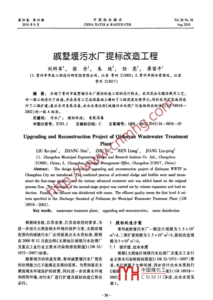 第26卷第16期中國(guó)給水排水Vol. 26 No. 162010年8月CHINA WATER & WASTEWATERAug. 2010戚墅堰污水廠提標(biāo)改造工程劉科軍',張丹',朱迪”,任亮',蔣留平'(1.常州市市政工程設(shè)計(jì)研究院有限公司,江蘇常州213003; 2. 常州市排水管理處,江蘇常州213017)摘要:介紹了常州市戚墅堰污水廠提標(biāo)改造工程的設(shè)計(jì)特點(diǎn)。采用泥法與膜法聯(lián)用工藝,對(duì)一期工程進(jìn)行了改造,并在原有工藝流程基礎(chǔ)上增加了三級(jí)深度處理單元;同時(shí)采用擴(kuò)容減荷進(jìn)行了二期擴(kuò)建;最后采用臭氧消毒,出水水質(zhì)達(dá)到《城鎮(zhèn)污水處理廠污染物排放標(biāo)準(zhǔn)》(GB 18918-2002)的一級(jí)A標(biāo)準(zhǔn)。關(guān)鍵詞:污水廠;提標(biāo)改造; 臭氧消毒中圖分類號(hào): X703.1文獻(xiàn)標(biāo)識(shí)碼: C文章編號(hào): 1000 - 4602(2010)16 -0036 -05Upgrading and Reconstruction Project of Qishuyan Wastewater TreatmentPlantLIU Ke-jun',ZHANG Dan',ZHU Di,REN Liang',JIANG Liu-ping'(1. Changzhou Municipal Engineering Design and Research Institute Co. Ltd. , Changzhou213003, China; 2. Changzhou Drainage Management Office, Changzhou 213017, China)Abstract: The design features of upgrading and reconstruction project of Qishuyan WWTP inChangzhou City are introduced. The combined process of activated sludge and biofilm were used recon-struct the first-stage project, and the tertiary advanced treatment unit was added based on the originalprocess flow. The extension of the second-stage project was carried out by volume expansion and load re-duction. Finally , the efuent was disinfected with ozone. The efluent quality meets the first level A cri-teria specifed in the Discharge Standard of Polluants for Municipal Wastervater Treatment Plant (GB18918 -2002).Key words: wastewater treatment plant; upgrading and reconstruction; ozone disinfction根據(jù)國(guó)務(wù)院江蘇省委、江蘇省政府的要求,為1提標(biāo)改造方案進(jìn)一步加大太湖流域水環(huán)境的保護(hù)力度,太湖流域常州戚墅堰污水廠一期設(shè)計(jì)規(guī)模為2.5x 10*范圍內(nèi)的城鎮(zhèn)污水廠必須提高出水水質(zhì)標(biāo)準(zhǔn),限期m'/d,二期擴(kuò)建規(guī)模為2.5 x 10* m'/d,提標(biāo)改造規(guī).在2008年12月前達(dá)到《太湖地區(qū)城鎮(zhèn)污水處理廠模為5 x 10* m'/d。及重點(diǎn)工業(yè)行業(yè)主要水污染物排放限值》(DB32/1.1 設(shè)計(jì)進(jìn).出水水質(zhì)1072- -2007 )標(biāo)準(zhǔn)。根據(jù)<太湖地區(qū)城鎮(zhèn)污水處理廠及重點(diǎn)工業(yè)行隨著城市的快速發(fā)展,常州戚墅堰污水廠現(xiàn)有業(yè)主要水污染物排放限值>( DB 32/1072- 2007)要的處理能力已不能滿足發(fā)展的需要。為貫徹落實(shí)太求,本區(qū)域?qū)儆谔饔?因此設(shè)計(jì)出水水質(zhì)執(zhí)行湖流域水環(huán)境保護(hù)的政策,同時(shí)進(jìn)- -步改善水環(huán)境《城鋪中國(guó)煤化工唯>(CB 18918-和投資環(huán)境,對(duì)污水廠進(jìn)行擴(kuò)建及提標(biāo)改造已勢(shì)在2002 )YHCNMHG本進(jìn)、出水水質(zhì)見必行。表1?!?6.www. watergasheat. com劉科軍,等:戚墅堰污水廠提標(biāo)改造工程第26卷第16期表1改造工程設(shè)計(jì)進(jìn).出水水質(zhì)1.3.1二級(jí)處理工藝的改造Tab.1 Deign influent and eflueat quality二級(jí)處理工藝的改造,主要是為了提高對(duì)mg.L'BOD3、COD、氮和磷的去除效果,因此改造的重點(diǎn)在項(xiàng)進(jìn)水出水于生化池,主要為減荷增效和增設(shè)填料。①-期生COD400≤50化池增設(shè)填料,實(shí)現(xiàn)泥法與膜法聯(lián)用)。該工藝可_BOD3180≤10在不增加工程建設(shè)用地、對(duì)現(xiàn)有運(yùn)行管理影響有限sS250TN45≤15的條件下,完成污水廠的提標(biāo)改造,實(shí)現(xiàn)出水達(dá)標(biāo)排NH,-N35≤5(8)放。②二期生化池采用減荷增效,增加生化池容積,IP4≤0.5降低負(fù)荷,延長(zhǎng)泥齡和水力停留時(shí)間。當(dāng)生化池進(jìn)從表1可知:水污染物負(fù)荷降低時(shí),能夠有效提高微生物的除污①改造工程對(duì)出水BOD,、TP、NH, -N、SS、效果,使出水各項(xiàng)指標(biāo)進(jìn)- -步降低(4)。 ,COD控制要求較高。1.3.2新建三級(jí)處理工藝②對(duì)TN控制要求非常高,冬天水溫≤12 C新建三級(jí)處理工藝主要是為了去除ss和TP。時(shí)仍要控制在15 mg/L以下。二沉池出水ss一般波動(dòng)較大,很難有良好的保證③對(duì)于BOD,、NH,-N、COD和TN指標(biāo)可以率;而對(duì)TP的去除在二級(jí)處理中主要依靠生化池通過強(qiáng)化二級(jí)處理工藝來進(jìn)一步去除,但對(duì)于ss和的生物效應(yīng),冬季太湖流域水溫一般為10 ~12 C,TP必須采用三級(jí)處理才能實(shí)現(xiàn)穩(wěn)定達(dá)標(biāo)。因?yàn)槌为?dú)的生物效應(yīng)很難保證出水TP達(dá)標(biāo)。規(guī)的生物除磷很難使出水TP達(dá)到0.5 mg/L的限通過技術(shù)經(jīng)濟(jì)的比較分析,決定采用微絮凝/過值",所以必須采用化學(xué)除磷。為不影響現(xiàn)有生物濾工藝(見圖2)。二級(jí)出水經(jīng)提升后,采用管式靜處理I藝的效果,化學(xué)除磷應(yīng)考慮放在三級(jí)處理工態(tài)混合器使水與藥劑混合,然后直接進(jìn)人V型濾藝中。.池,濾池出水經(jīng)臭氧消毒后排放。濾池定期反沖洗,此外,城鎮(zhèn)污水廠二級(jí)處理中的常規(guī)重力沉淀反沖洗出水經(jīng)反沖洗水沉淀池后,上清液回流至提也很難保證Ss的穩(wěn)