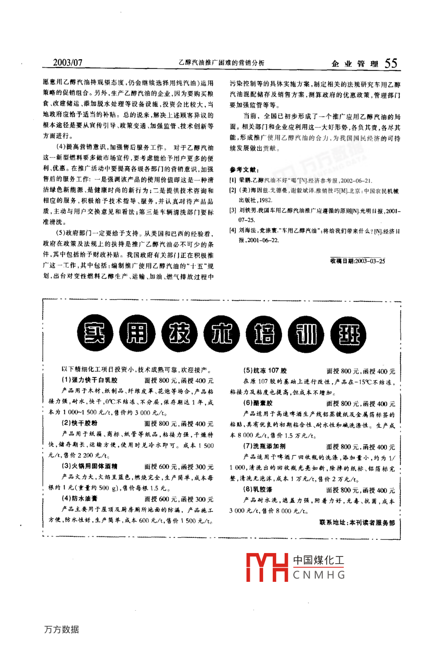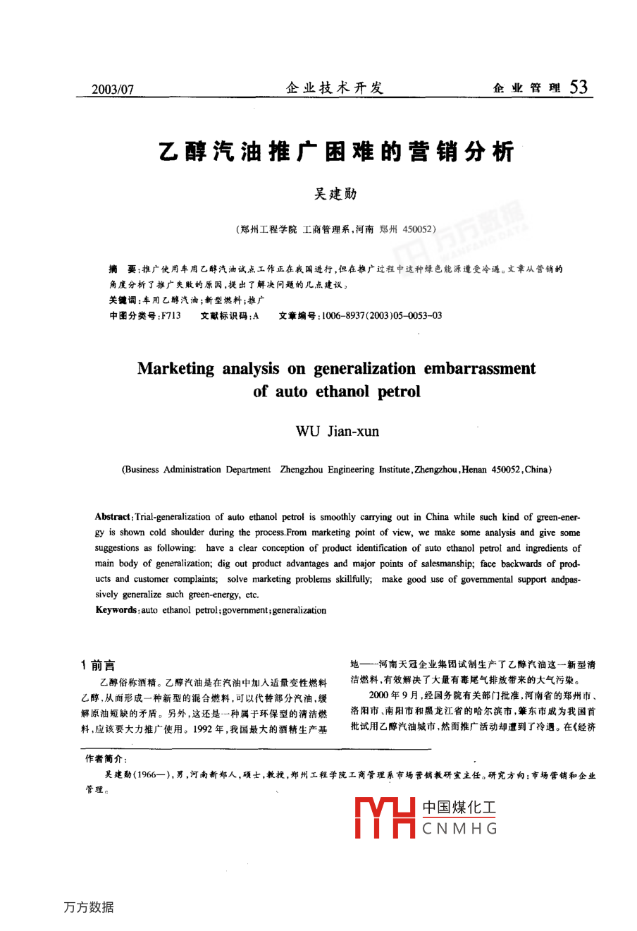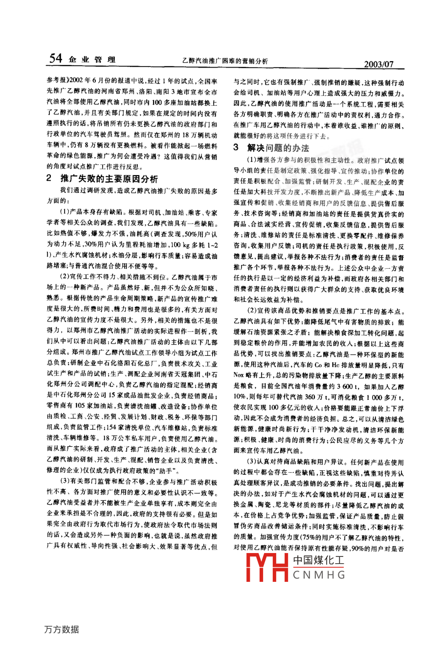 2003/07企業(yè)技術(shù)開發(fā)乙醇汽油推廣困難的營銷分析吳建勛(鄭州工程學(xué)院工商管理系,河南鄭州450052)摘要;推廣使用車用乙醵汽油試點(diǎn)工作正在我國進(jìn)行,但在推廣過程中這種綠色能源遭受冷遇。文幸從營銷的角度分析了推廣失敗的原因,提出了解決問題的幾點(diǎn)建議關(guān)鍵詞:車用乙醇汽油;新型然料;推廣中圖分類號:F73文斌標(biāo)識碼:A文章編號:1006-8937(200305-0053-03Marketing analysis on generalization embarrassmentof auto ethanol petrolWu Jian-xun(Business Administration Department Zhengzhou Engineering Institute, Zhengzhou, Henan 450052, China)Abstract: Trial-generalization of auto ethanol petrol is smoothly carrying out in China while such kind of green-energy is shown cold shoulder during the process From marketing point of view, we make some analysis and give somesuggestions as following: have a clear conception of product identification of auto ethanol petrol and ingredients ofmain body of generalization; dig out product advantages and major points of salesmanship; face backwards of prod-ucts and customer complaints; solve marketing problems skillfully; make good use of governmental support andpasgeneralize such greKeywords: auto ethanol petrol; government: generalization1前言地一河南天冠企業(yè)集團(tuán)試制生產(chǎn)了乙酶汽油這一新型清乙醇俗稱酒精。乙醇汽油是在汽油中加入適量變性燃料潔燃料有效解決了大量有毒尾氣排放帶來的大氣污染。乙醇,從而形成一種新型的混合燃料,可以代替部分汽油,綴2000年9月,經(jīng)國務(wù)院有關(guān)部門批準(zhǔn)河南省的鄭州市解原油短缺的矛屑。另外,這還是一種屬于環(huán)保型的清潔燃洛陽市、南陽市和黑龍江省的哈爾濱市肇東市成為我國首料,應(yīng)該要大力推廣使用。1992年,我國最大的酒精生產(chǎn)基批試用乙醇汽油城市,然面推廣活動(dòng)卻遭到了冷遇。在《經(jīng)濟(jì)作者簡介建勣(1966-),男,河南新鄭人,碩士,教授,鄭州工程學(xué)院工商管理系市場營銷教研宣主任。研究方向:市場營鋪和企業(yè)理中國煤化工CNMHG乙醇汽油推廣困難的營銷分析2003/07參考報(bào)》2002年6月份的報(bào)道中說,經(jīng)過1年的試點(diǎn),全國率與之同時(shí),它也有強(qiáng)制推廣、強(qiáng)制推銷的嫌疑,這種強(qiáng)制行動(dòng)先推廣乙醇汽油的河南省鄭州、洛陽、南陽3地市宜布全市會給司機(jī)、加油站等用戶心理上造成強(qiáng)大的壓力和威懾力汽油將全部使用乙醇汽油同時(shí)市內(nèi)100多座加油站都換上因此,乙醇汽油的使用推廣活動(dòng)是一個(gè)系統(tǒng)工程,需要相關(guān)了乙醇汽油并且有關(guān)部門規(guī)定,如果在規(guī)定的時(shí)間內(nèi)沒有各方明確職責(zé)、明確各方在推廣活動(dòng)中的責(zé)權(quán)利,通力合作。遵照執(zhí)行的話,將吊銷所有仍未更換乙醇汽油的政府部門和在推廣車用乙醇汽油的行動(dòng)中,本著誰收益,誰推廣的原則,行政單位的汽車駕駛員駕照。然而僅在鄭州的18萬輛機(jī)動(dòng)就能很好的將這項(xiàng)任務(wù)進(jìn)行下去車輛中仍有8萬輛沒有更換燃料。被看作能掀起一場燃料3解決問題的辦法革命的綠色能源,推廣為何會遭受冷遇?這值得我們從營銷的角度對試點(diǎn)推廣工作進(jìn)行反思(1)增強(qiáng)各方參與的積極性和主動(dòng)性。政府推廣試點(diǎn)領(lǐng)導(dǎo)小組的責(zé)任是制定政策、強(qiáng)化指導(dǎo)、宣傳推動(dòng);協(xié)作單位的2推廣失敗的主要原因分析責(zé)任是積極配合、加強(qiáng)監(jiān)管;研制開發(fā)、生產(chǎn)、混配企業(yè)的責(zé)我們通過調(diào)研發(fā)現(xiàn)造成乙醇汽油推廣失敗的原因是多任是加大科技開發(fā)力度,不斷推出新產(chǎn)品、降低生產(chǎn)成本、加強(qiáng)宜傳和促銷、收集經(jīng)銷商和用戶的反饋信息、提供售后服(1)產(chǎn)品本身存有缺陷。根據(jù)對司機(jī)加油站乘客、專家務(wù)、技術(shù)咨詢等;經(jīng)銷商和加油站的責(zé)任是提供貨真價(jià)實(shí)的學(xué)者等相關(guān)公眾的調(diào)查,我們發(fā)現(xiàn),乙醇汽油具有一些缺陷。商品、合法誠實(shí)經(jīng)營、宜傳促銷,收集反饋信息,提供售后服比如熱值不夠爆發(fā)力不強(qiáng),油耗高(調(diào)查發(fā)現(xiàn),50%用戶認(rèn)務(wù);清洗、維修站的責(zé)任是標(biāo)準(zhǔn)清洗更換零配件維修保養(yǎng)為動(dòng)力不足,30%用戶認(rèn)為里程耗油增加,100kg多耗1-2咨詢,收集用戶反饋;司機(jī)的責(zé)任是執(zhí)行政策,積極使用,反1)、產(chǎn)生水汽腐蝕機(jī)材;水油分層,影響行車質(zhì)量;容易造成油饋意見,提出建議,舉報(bào)各種不法行為消費(fèi)者的責(zé)任是監(jiān)督路堵塞;與普通汽油混合使用不便等等推廣各個(gè)環(huán)節(jié)舉報(bào)各種不法行為。上述公眾中企業(yè)一方責(zé)(2)宜傳工作不得力相關(guān)措施不到位。乙醇汽油屬于市的執(zhí)行是以一定的經(jīng)濟(jì)利益為補(bǔ)償,而政府各相關(guān)部門和場上的一種新產(chǎn)品。產(chǎn)品雖然好新,但并不為公眾所知曉消費(fèi)者責(zé)任的執(zhí)行則以獲得廣大群眾的支持、獲取優(yōu)良環(huán)境熟悉。根據(jù)傳統(tǒng)的產(chǎn)品生命周期策略新產(chǎn)品的宣傳推廣難和社會長遠(yuǎn)效益為補(bǔ)償。度是很大的,所費(fèi)時(shí)間精力和費(fèi)用也是很多的,