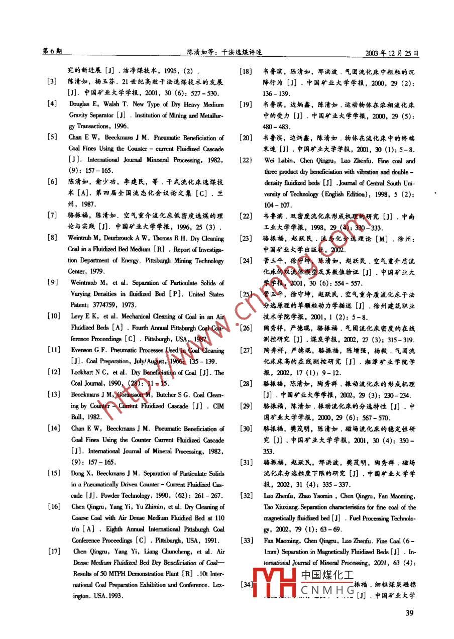 第6期選煤技術(shù)No.62003年12月COAL PREPARATION TECHNOLOCYDec. 2003文章編號(hào): 1001-3571 (2003) 06 -0034- 06干法選煤評(píng)述陳清如2,駱振福'(1.中國(guó)礦業(yè)大學(xué)化工學(xué)院,江蘇徐州221008;2.中國(guó)煤炭學(xué)會(huì)選煤專業(yè)委員會(huì),河北唐山063012)摘要:文章以大量詳實(shí)的資料,回顧了干法選煤技術(shù)的理論與實(shí)踐研究成果和取得的新進(jìn)展,指出了研究先進(jìn)高效的干法選煤技術(shù)對(duì)順應(yīng)我國(guó)煤炭工業(yè)戰(zhàn)略西移,促進(jìn)潔凈煤事業(yè)的全面發(fā)展的重要意義。關(guān)鍵詞:干法選煤;氣固流化床;風(fēng)力選煤;磁穩(wěn)定流化床;研究中圖分類號(hào): TD942文獻(xiàn)標(biāo)識(shí)碼: A為了順應(yīng)中國(guó)煤炭工業(yè)的戰(zhàn)略西移,促進(jìn)潔凈1前言煤事業(yè)的全面發(fā)展,就需要研究高效的千法選煤技選煤是合理利用煤炭資源、保護(hù)環(huán)境的最經(jīng)濟(jì)術(shù)。和最有效的技術(shù),是煤炭加工、轉(zhuǎn)化為潔凈煤基燃干法選煤主要是利用煤與矸石的物理性質(zhì)差別料必不可少的基礎(chǔ)和關(guān)鍵環(huán)節(jié);通過選煤可以優(yōu)化實(shí)現(xiàn)分選的,所謂物理性質(zhì)包括密度、粒度、形產(chǎn)品結(jié)構(gòu),提高利用效率。因此,國(guó)際上公認(rèn)選煤狀、光澤度、導(dǎo)磁性、導(dǎo)電性、輻射性、摩擦系數(shù)是實(shí)現(xiàn)煤炭高效、潔凈利用的首選方案。加快發(fā)展等。干法選煤主要包括風(fēng)選、揀選、摩擦選、磁選煤技術(shù)對(duì)于實(shí)現(xiàn)煤炭資源的綜合利用、節(jié)約能選、電選、X-射線選、微波選、空氣重介質(zhì)流化源、減少環(huán)境污染具有十分重要的意義。床選煤等,其中已實(shí)現(xiàn)工業(yè)應(yīng)用的有風(fēng)力選煤(風(fēng)中國(guó)煤炭的人選比例一直較低,2001 年只有力搖床、風(fēng)力跳汰)和空氣重介質(zhì)流化床選煤。30%,動(dòng)力煤的人選比例更低,僅為18%,資源2干 法選煤研究回顧浪費(fèi)和環(huán)境污染問題嚴(yán)重。造成這些問題的原因是多方面的,其中水資源短缺是造成煤炭入選比例低2.1流化床選煤的主要原因之- -。中國(guó)煤炭資源主要分布在干旱缺2.1.1基本原理水地區(qū),已探明的1萬(wàn)億t煤炭保有儲(chǔ)量中,晉、氣固流化床分離(選)礦物可分為兩類: -類陜、蒙三省區(qū)占60.3%,新、甘、寧、青等省區(qū)是根據(jù)兩種顆粒的粒度差別進(jìn)行分離。其原理是:占22.3%,東部4大缺煤區(qū)的19個(gè)省區(qū)只占粒度大的塊狀物不參與流化,而粒度小的粉狀物能17.4%。占全國(guó)煤炭保有儲(chǔ)量三分之二以上的千旱夠流態(tài)化,不參與流化的大顆粒沉在床底,能夠流缺水地區(qū)的煤炭難于采用耗水量大的濕法分選方法化的小顆粒流態(tài)化后不斷溢出床面,從而達(dá)到分離(就濕法跳汰選煤而言,人選1t原煤約需3~St循的目的;另一類即本文所述及研究的氣固流化床對(duì)環(huán)水,還需補(bǔ)加部分清水);其次,中國(guó)相當(dāng)數(shù)量礦物的分選。其原理是:以微細(xì)顆粒作為固相加重的年輕煤種遇水易泥化,不宜采用濕法分選;第質(zhì),形成具有一定密度的流化床層,不同密度組成三,濕法分選產(chǎn)品外水高達(dá)12%以上,嚴(yán)寒地區(qū)的被分離礦物(由有用礦物與無(wú)用礦物組成)進(jìn)入冬季凍結(jié),貯運(yùn)困難,導(dǎo)致部分選煤廠被迫停產(chǎn),流化床層后按床層密度分層,輕者上浮,重者下而且,采用濕法跳汰、重介和浮游選煤,耗水量沉,從而實(shí)現(xiàn)氣固流化床對(duì)礦物的分選。氣固流化大,投資及生產(chǎn)費(fèi)用高,噸煤投資達(dá)80元以上,床密度p可以表示為限制了部分地方小煤礦企業(yè)的發(fā)展。ρ = (1-e)p. = (W/A)Hg .式中:p為床層密度, kg/m2 ;e為空隙率,% ;p,為固.收稿日期: 2002-08- 12作者簡(jiǎn)介:陳清如(1926-), 男,浙江杭州人,中國(guó)工程相力中國(guó)煤化工床層質(zhì)量,kg;A為院院士,中國(guó)煤炭學(xué)會(huì)選煤專業(yè)委員會(huì)名譽(yù)主任委員,中HCN MH Gig為重力加速度,國(guó)礦業(yè)大學(xué)化工學(xué)院教授。電話: 0516 - 3885384。m/s"。第6期陳清如等:干法選煤評(píng)述2003年12月25且不同密度的礦物在均勻流體中因受到流體的凈小。因此在- -定范圍內(nèi)改變固相加重質(zhì)粒度組成可浮力作用而產(chǎn)生運(yùn)動(dòng),同時(shí)受到流體阻力的作用,最以調(diào)節(jié)流化床分選密度。但要形成高質(zhì)量流化床,終按流體密度分層分離。由于氣固流化床屬聚式流不同種類的固相加重質(zhì)各有其最佳的粒度范圍,陳化床,床層內(nèi)壓力及密度有一定的不均勻性,因此要清如等6)的研究結(jié)果表明了這一點(diǎn)。Weintaub實(shí)現(xiàn)被分選礦物按流化床密度分離,就要求被分選等V,)在中100mm圓簡(jiǎn)型流化床裝置上,以0.043 ~礦物的粒度足夠大于固相加重質(zhì)顆粒粒度,使得被0.074mm的磁鐵礦粉為固相加重質(zhì)被選礦物(煤選礦物受到流化床密度的凈浮力作用占主導(dǎo),并且炭)與固相加重質(zhì)的質(zhì)量比為1:100,分別對(duì)1.17~克服床層介質(zhì)阻力及固相加重質(zhì)顆粒返混產(chǎn)生的曳0.58 mm.3.33~2.36mm.9.53 ~ 6.35 mm的3個(gè)粒級(jí)力作用而分層。礦物在流化床的分離除決定于床層煤炭進(jìn)