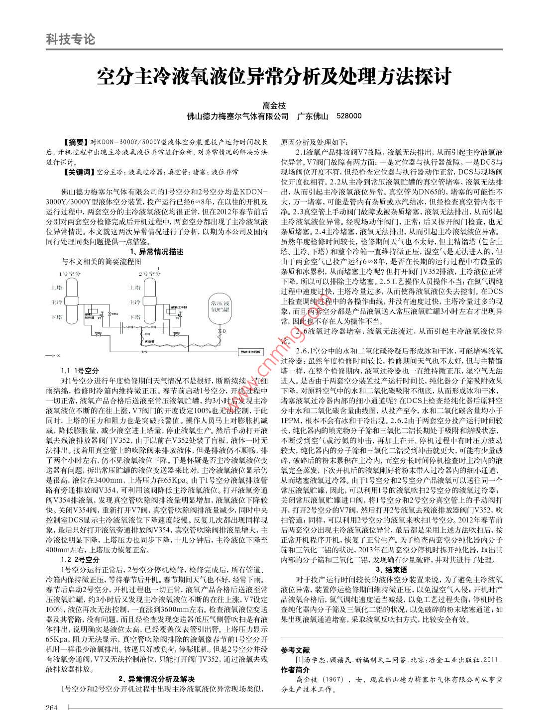 科技專論空分主冷液氧液位異常分析及處理方法探討高金枝佛山德力梅塞爾氣體有限公司廣東佛山528000【摘要】對KD0N-3000%300Y型液體空分裝置投產(chǎn)運行時間較長原因分析及處理如下:后,開機過程中出現(xiàn)主冷液氧液位異常進行分析,對異常情況的解決方法2.1液氧產(chǎn)品排放閥V7故障,液氧無法排出,從而引起主冷液氧液進行採討位異常。V7閥門敞障有兩方面:一是定位器與執(zhí)行器故障,一是DCS與【關鍵詞】空分主冷;液氧過冷器;真空管;堵塞;液位異?,F(xiàn)場閥位開度不符,但經(jīng)檢查定位器與執(zhí)行器動作正常,DCS與現(xiàn)場閥位開度也相符。2.2從主冷到常壓液氧貯罐的真空管堵塞,液氧無法排佛山德力梅塞爾氣體有限公司的1號空分和2號空分均是KDON-出,從而引起主冷液氡液位異常。真空管為DN65的,堵塞的可能性不300Y/3000Y型液體空分裝置,投產(chǎn)運行已經(jīng)6∽8年,在以往的開機及大,萬一堵塞,可能是管內有雜質或水汽結冰,但經(jīng)檢査真空管內很干運行過程中,兩套空分的主冷液氧液位均很正常,但在2012年春節(jié)前后凈。2.3真空管上手動閥門故障或被雜質堵塞,液氧無法排出,從而引起分別對兩套空分檢修完成后開機過程中,兩套空分都出現(xiàn)了主冷液氧液主冷液氧液位異常。經(jīng)現(xiàn)場動作閥門,正常;后又拆開閥門檢查,也無位異常情況。本文就這兩次異常情況進行了分析,以期為本公司及國內雜質堵塞。2.4主冷堵塞,液氧無法排出,從而引起主冷液氧液位異常。同行處理同類問題提供一點借鑒雖然年度檢修時間較長,檢修期間天氣也不太好,但主精餾塔(包含上1、異常情況描述塔、主冷、下塔)和整個冷箱一直維持微正壓,濕空氣是無法進入的,但與本文相關的簡要流程圖由于兩套空氣已投產(chǎn)運行6∽8年,是否在長期的運行過程中有微量的1號分2號空分雜質和冰累積,從而堵塞主冷呢?但打開閥門V352排液,主冷液位正常下降,所以可以排除主冷堵塞。2.5工藝操作人員操作不當:在氮氣調純上塔上塔過程中速度過快,主塔冷量過多,從而使得液氧液位失去控制。在DCS主冷上檢査調純過程中的各操作曲線,并沒有速度過快,主塔冷量過多的現(xiàn)象,而且兩套空分都是產(chǎn)品液氧送入常壓液氧貯罐3小時左右才出現(xiàn)異常,因此也不存在人為操作不當。2.6液氧過冷器堵塞,液氧無法流過,從而引起主冷液氧液位異常。2.6.l空分中的水和二氧化碳冷凝后形成冰和干冰,可能堵塞液氧過冷器:雖然年度檢修時間較長,檢修期間天氣也不太好,但與主精餾1.11號空分塔一樣,在整個檢修期內,液氧過冷器也一直維持微正壓,濕空氣無法對1號空分進行年度檢修期間天氣情況不是很好,斷斷續(xù)續(xù)一直細進入。是否由于兩套空分裝置投產(chǎn)運行時間長,純化器分子篩吸附效果雨綿綿,檢修時冷箱內維持微正壓。春節(jié)前啟動號室分,開機過程中下降,對原料空氣中的水和二氧化碳吸附不徹底,從而形成冰和干冰切正常,液氧產(chǎn)品合格后送液至常壓液氧貯罐,約3小時后發(fā)現(xiàn)主冷堵塞液氧過冷器內部的細小通道呢?在υcS上檢査經(jīng)純化器后原料空液氧液位不斷的在往上漲,V7閥門的開度設定100%也無法控制,于此分中水和二氧化碳含量曲線圖,從投產(chǎn)至今,水和二氧化碳含量均小于同時,上塔的壓力和阻力也是突破報警值。操作人員馬上對膨脹機減IPPM,根本不會有冰和干冷出現(xiàn)。2.6.2由于兩套空分投產(chǎn)運行時間較載,降低膨脹量,減少液空進上塔量,停止液氧生產(chǎn)。然后手動打開液長,純化器內的填充物分子篩和三氧化二鋁長期處于吸附和解吸狀態(tài),氧去殘液排放器閥門V352,由于以前在V352處裝了盲板,液體一時無不斷受到空氣或污氮的沖擊,再加上在開、停機過程中有時壓力波動法排出。接著用真空管上的吹除閥來排放液體,但是排液仍不順暢,排較大,純化器內的分子篩和三氧化二鋁受到?jīng)_擊就更大,可能冇少量破了兩個小時左右,仍不見液氧液位下降。于是懷疑是否主冷液氧液位變碎,破碎后的粉末累積在主冷內,而空分長時間停機檢查時主冷內的液送器有問題,拆岀常壓貯罐的液位變送器來比對,主冷液氧液位顯示仍氧完全蒸發(fā),下次開機后的液氧剛好將粉末帶入過冷器內的細小通道,是很高,液位在3400mm,上塔壓力在65Kpa。由于1號空分液氧排放管從而堵塞液氧過冷器。由于1號空分和2號空分產(chǎn)品液氧可以送往同一個路有旁通排放閥354,可利用該閥降低主冷液氧液位。打開液氧旁通常壓液氧貯罐,因此,可以利用1號的液氧吹掃2號空分的液氧過冷器:閥Ⅴ354排液氧,發(fā)現(xiàn)真空管吹除閥排液量明顯増加,液氧液位下降較關閉常壓液氧貯罐進口閥,將1號空分和2號空分真空管上的手動閥打快。關閉Ⅴ354閥,重新打開Ⅴ7閥,真空管吹除閥排液量減少,同時中央開,打開2號空分的V7閥,然后打開2號液氧去殘液排放器閥門V352,吹控制室DCS顯示主冷液氧液位下降速度較慢。反復幾次都岀現(xiàn)同樣現(xiàn)掃管道;同樣,可以利用2號空分的液氧來吹掃l號空分。2012年舂節(jié)前象,最后只好打開液氧旁通排放閥V354,真空管吹除閥排液量增大,主后兩套空分出現(xiàn)主冷液氧液位異常,最后都是采用上述方法吹掃后,按冷液位明顯下降,上塔壓力也同步下降,十幾分鐘后,主冷液位下降至正常開機程序開機,恢